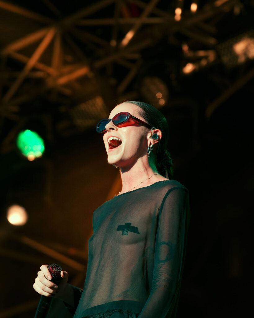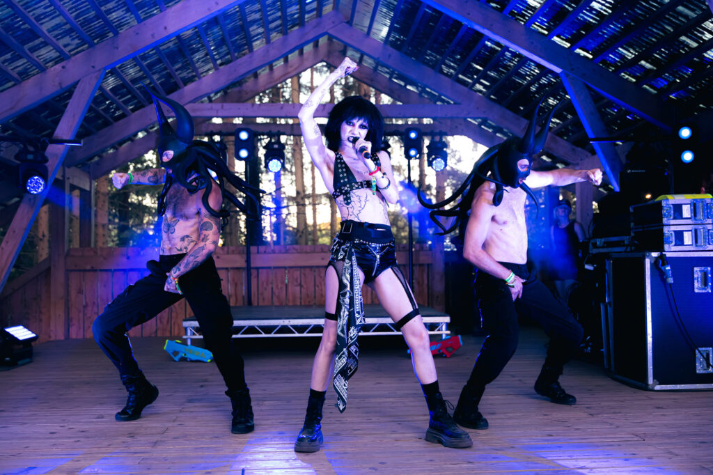 Whilst Irish rap rockers KNEECAP caused chaos at the Main Stage, deep in the forest, a coven of sultry LA-born musicians prepped to captivate. Cloaked in gothic allure, DEATHBYROMY‘s dark pop anthems oozed drama, so much so that the majority of the set was unfortunately riddled with technical issues. Undeterred, Romy sang a haunting acapella rendition of SEE U ON THE OTHER SIDEĀ proclaiming āthank God I know my songs!ā (a sly dig at some other artists, perhaps). Though the late-night slot sapped some energy,Ā she did not leave the audience disappointed and continued to perform a mesmerising curio of songs, leaving everyone craving another bite after the smoky atmospherics dissipated.