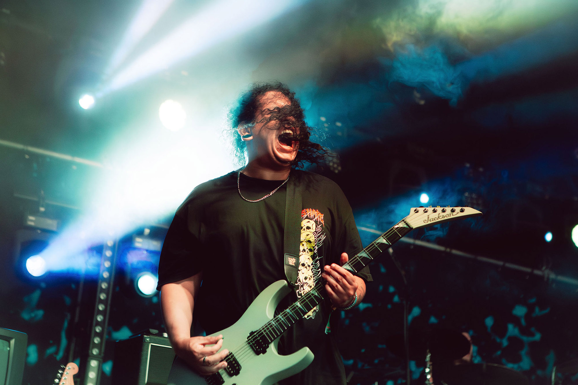 Philadelphiaās KAONASHI turned The Cave into a mathcore funhouse, that is, equal parts unhinged and frankly downright hilarious. Whilst the circle pit was certainly active throughout, vocalist Peter Ronoās high pitched shrieks were jarring over the bandās heavy sound. Randomly shouting “ALEXISONFIREā in the middle of a song, randomly revisiting a soundboard of incoherent noise effects (including samples of NELLY‘s Dilemma), and a messy pacing of the stage which often resulted in his back to the audience or hiding behind a metal column left the crowd confused over whether this was genius or gibberish. Not for the faint-hearted, KAONASHI were certainly memorable, at the very least…
