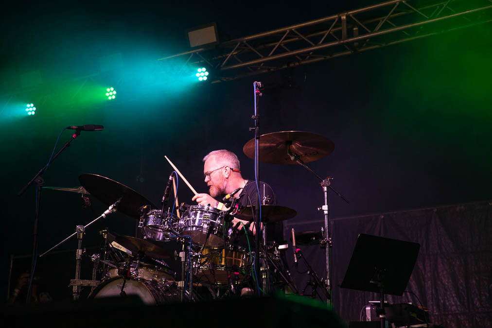 Drummer extraordinaire, Adam Betts is no stranger to a festival stage, having lent his rhythmic prowess to the likes of SQUAREPUSHER, THREE TRAPPED TIGERS, GOLDIE and PULP, but today he’s up there alone with just a drum kit and a sample pad, as his solo act COLOSSAL SQUID. His blistering display of virtuosity proves why he is so in demand. The musicality of the triggered backing tracks and the groove with which he plays makes this an event worth revelling in, as he seamlessly blends urban sounds with avante garde jazz, making jaws drop and booties shake in equal measure.