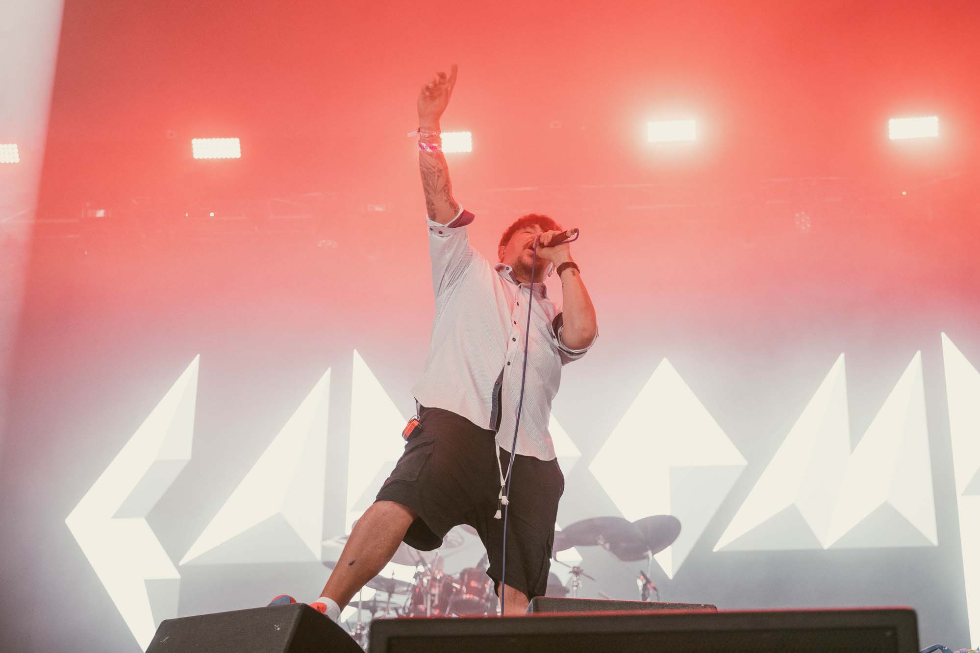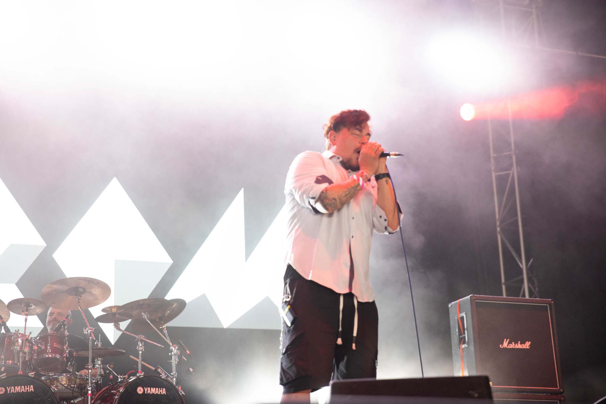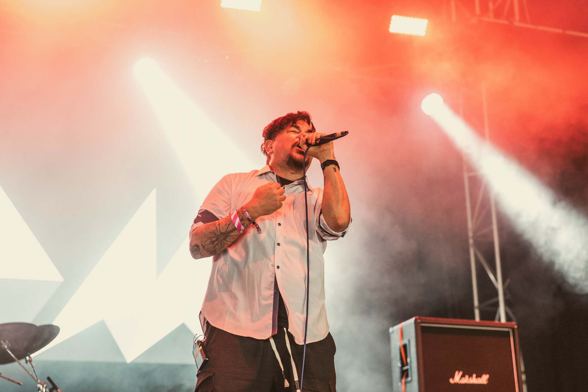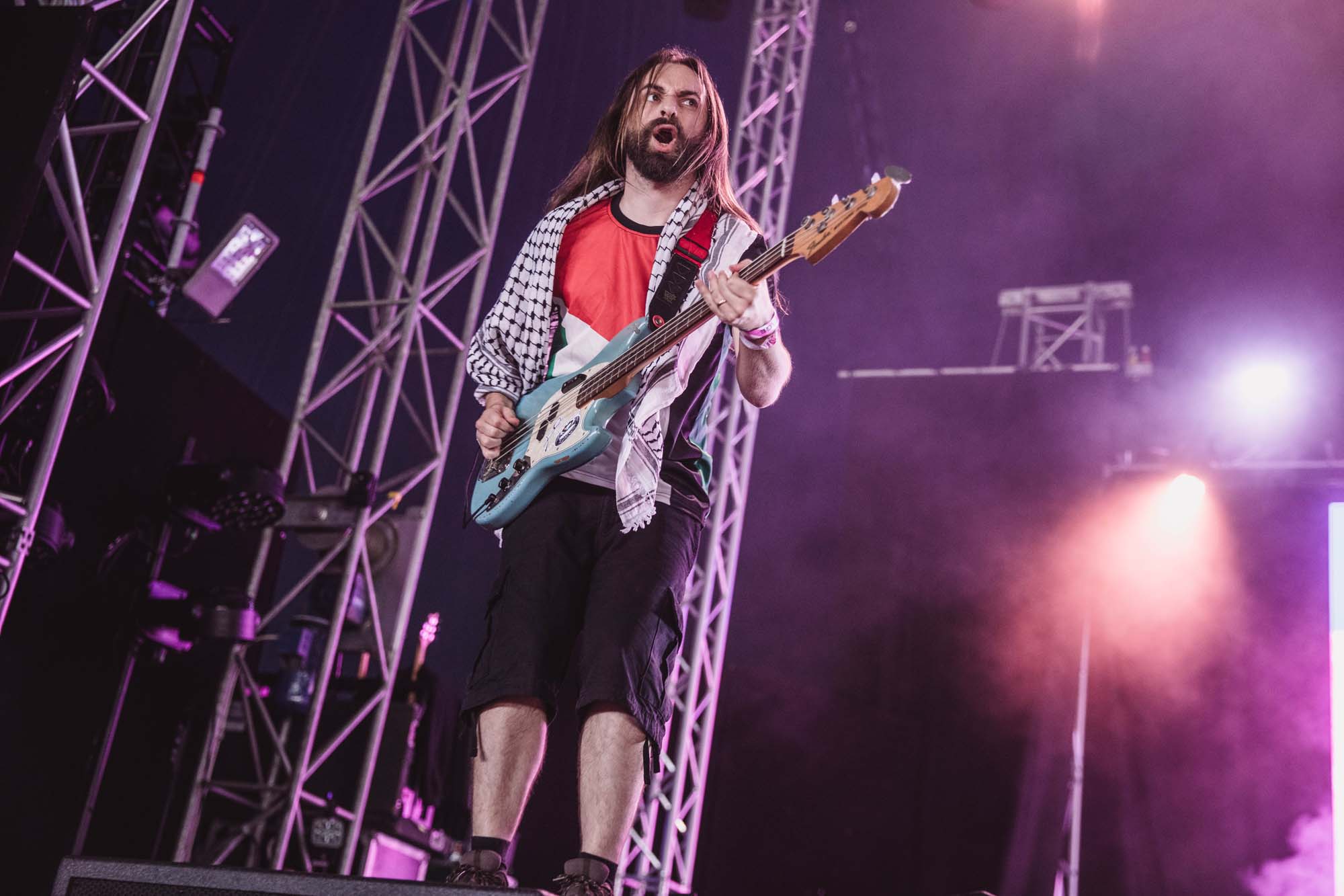 Fresh off the back of releasing one of the most exciting albums of 2025, Atlanta wrecking crew THE CALLOUS DAOBOYS return to Fernhill Farm to cause more havoc. Their previous appearance has become the stuff of legend due to levels of insanity and violence both on stage and in the audience, and while their step up to the main stage, replete with its huge screen showing snippets of skaters bailing, and 90s wrestlers, might not be as violent, it’s no less entertaining. There’s great stage chemistry from the self-declared “millennial math core money metal music” heroes, and in tracks like Lemon and Star Baby they’ve traded the mosh pit for the dance floor. That’s not to say they’ve softened as they’ve matured – “Make an enemy you nerds!” yells Carson Pace as they launch into the savagely batshit What Is Delicious? Who Swarms?. Always ones to surprise, they welcome HIDDEN MOTHERS own Liam Knowles to the stage for an inspired rendition of ENTER SHIKARI classic Sorry, You’re Not A Winner, which has the audience clapping along with glee.
