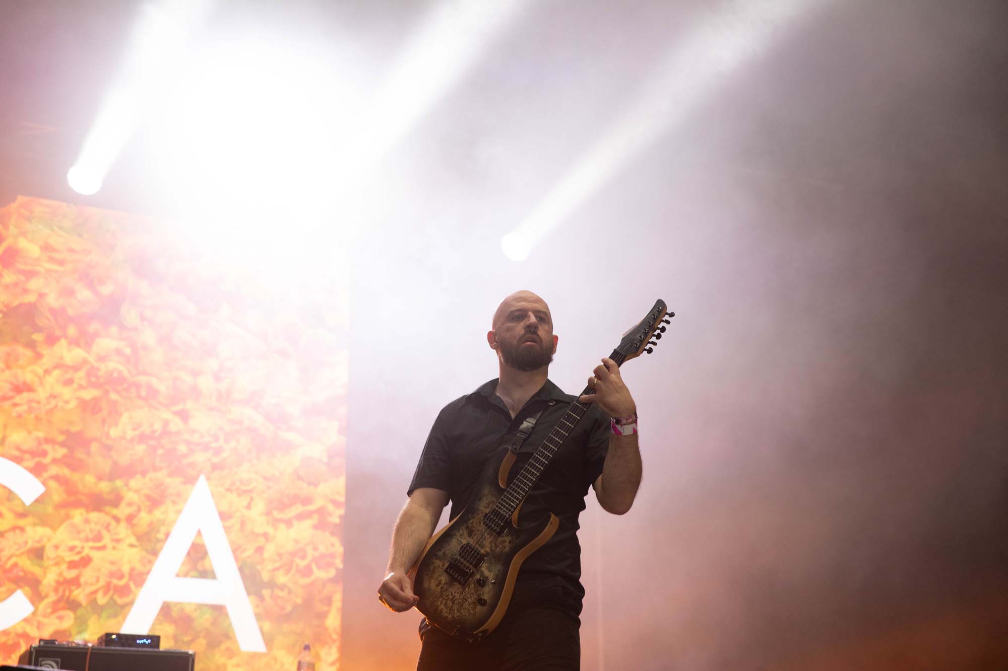 Quite the contrast to MCLUSKY‘s spit and sawdust attitude and DIY aesthetic, tesseract bring one of the best looking, polished and highly produced shows to the main stage of the entire weekend. That said, there are relatively few people here to see it; when MESHUGGAH played this stage last year, you couldn’t fit a rizla between the shoulders of the audience members, however while TESSERACT are on, you can breeze your way down to the front with ease. Those who are here, though are treated to a masterclass in modern metal.