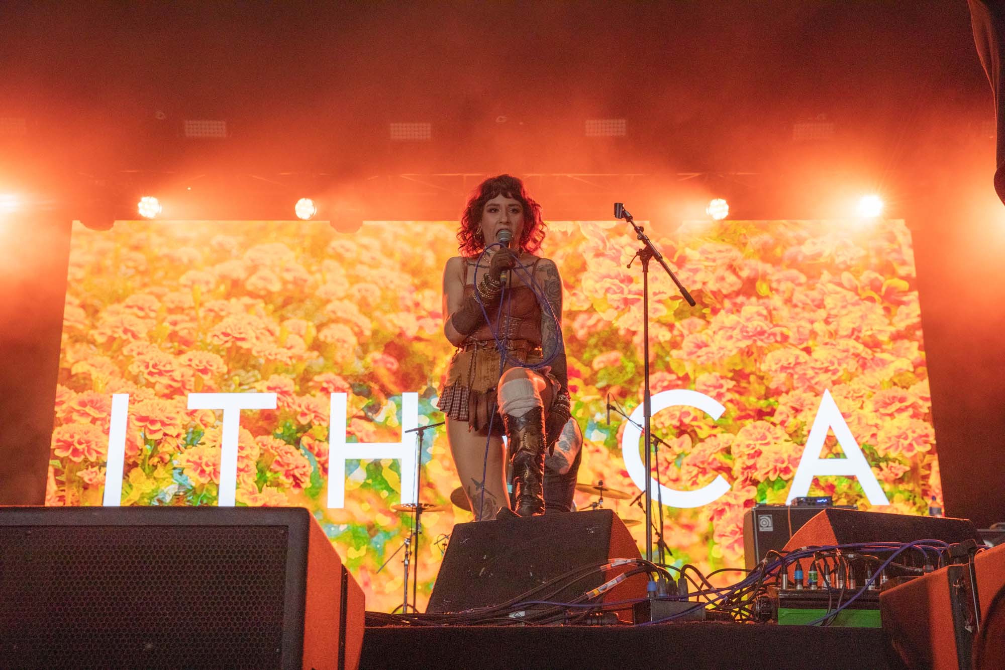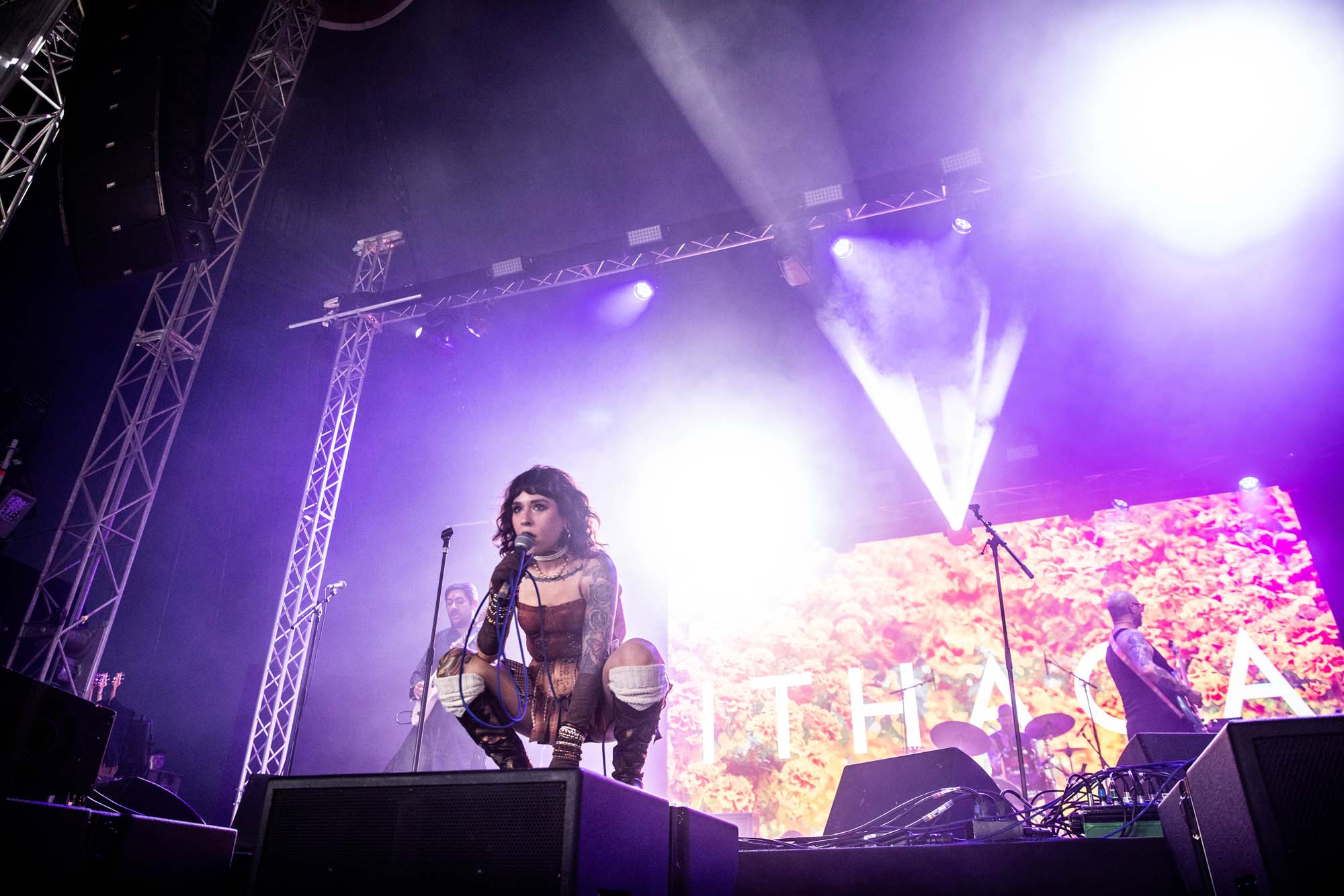 British metalcore boundary-pushers ITHACA illicit a singalong from the crowd before they even step on stage by blasting ROBBIE WILLIAMS’ Angels as their intro music, before blasting into a savage rendition of In The Way. It’s a bittersweet occasion given that it’s their final ever show and they make the most of every second, even bringing DEVIL SOLD HIS SOUL’s Ed Gibbs up for The Future Says Thank You, and PUPIL SLICER’s Kate Davies for Cremation Party. Vocalist Djamila Azzouz admits to not feeling her best having recently recovered from surgery, but she’s still clearly having loads of fun up there for one last time. The band leaves everything on the stage for the closer, Impulse Crush causing havoc in the pit and making sure that nobody will ever forget the impact this band has made on heavy music in the UK.
