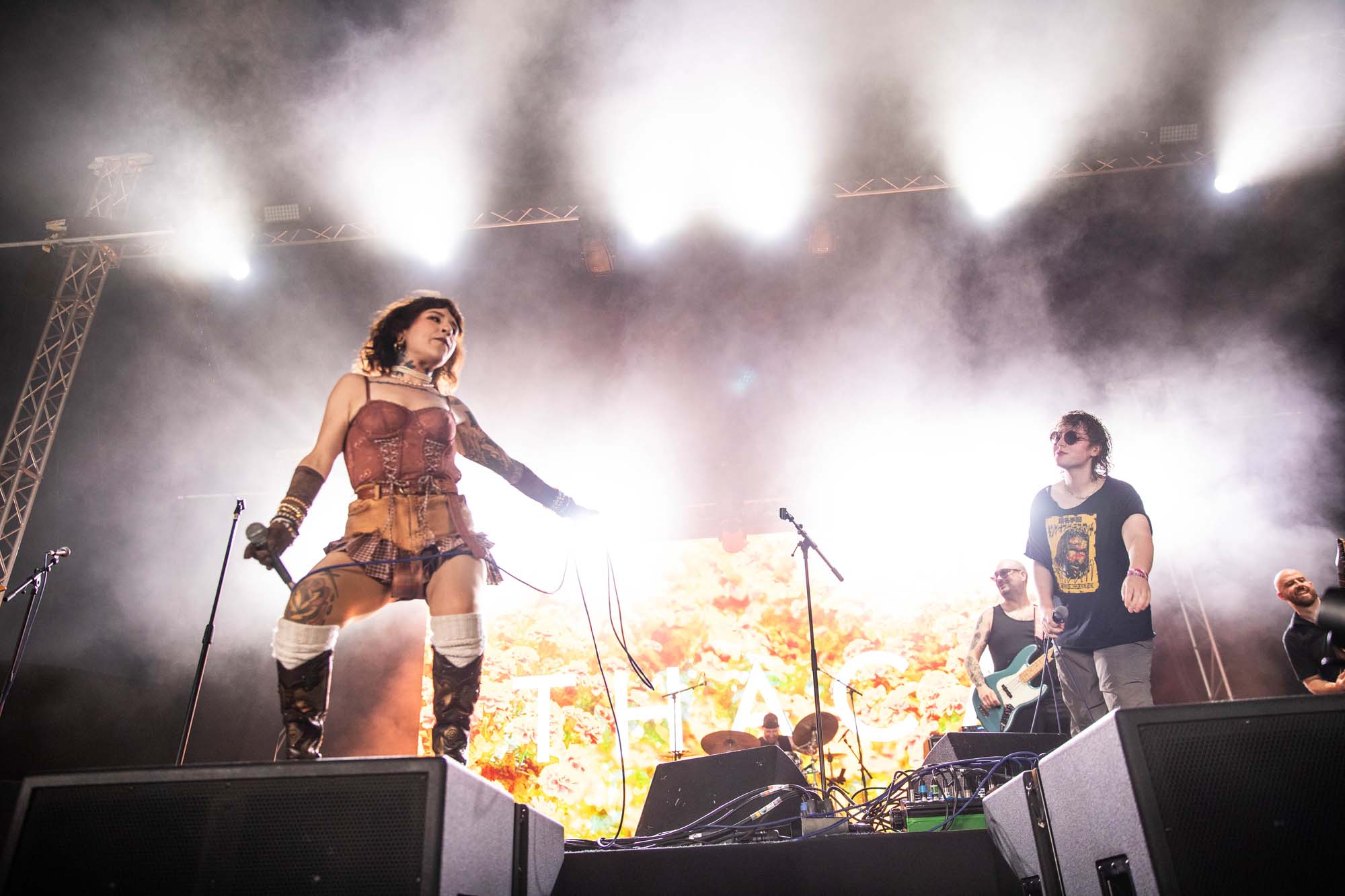 Mathcore darlings ROLO TOMASSI are celebrating 20 years as a band and what better way to do it than with a main stage slot at ArcTanGent. They’re even greeted with a chorus of ‘happy birthday’ by the crowd before they fire into Oh, Hello Ghost. They’ve pulled out all the stops for this set, bringing a string section with them that lends a grandiose beauty to tracks like Crystal Cascades. Singer Eva Spence delivers every line with utmost passion, be it in her soaring falsetto or guttural screams. It’s a set packed with drama, which is heightened by cinematic interludes that are worked into the song transitions, and songs like The Hollow Hour and A Flood Of Light contrast between tear jerking beauty and teeth gnashing savagery. Here’s to the next 20 years of this utterly essential band.