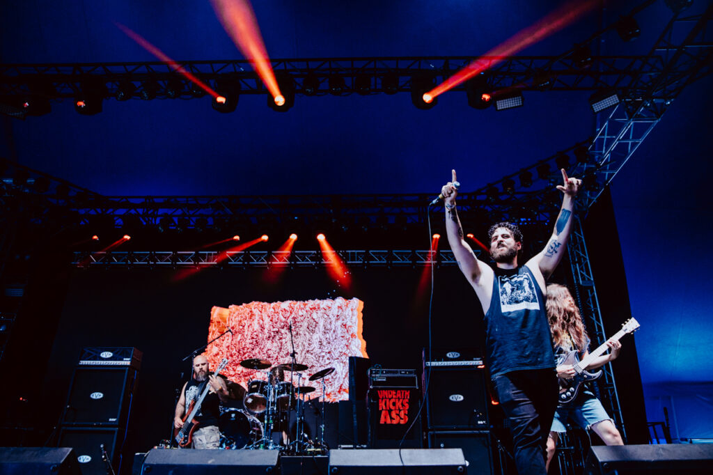If tonight’s Sophie Lancaster Stage headliners STATIC-X stumbled upon UNDEATH’s set today, they’re leaving it pale knowing the bar’s been well and set high. The New Yorkers are met with a hero’s welcome, as if it wasn’t their first time at Bloodstock, but their fifth. They return the favour with a hat-trick of goals in the first 10 minutes as Dead From Beyond, Rise From The Grave, and Necrobionics lay waste to the tent. Circle pits and crowd surfers are in abundance, but it’s the self-prophetic More Insane that sees the first sight of a Spider-Man-cosplaying toddler crowdsurfing their Wonder Woman-themed mum that really highlights the ensuing chaos. The security on shift are put through their paces, as repeat offenders crowd surf multiple times during the same songs, as vocalist Alex Sason acts as a gruesome master of ceremonies basking in the guts and glory of their zombie-adoring bangers. By the time Lesions Of A Different Kind and Brandish The Blade bring their set to a close, you can’t help but think UNDEATH have loftier slots in their sights.