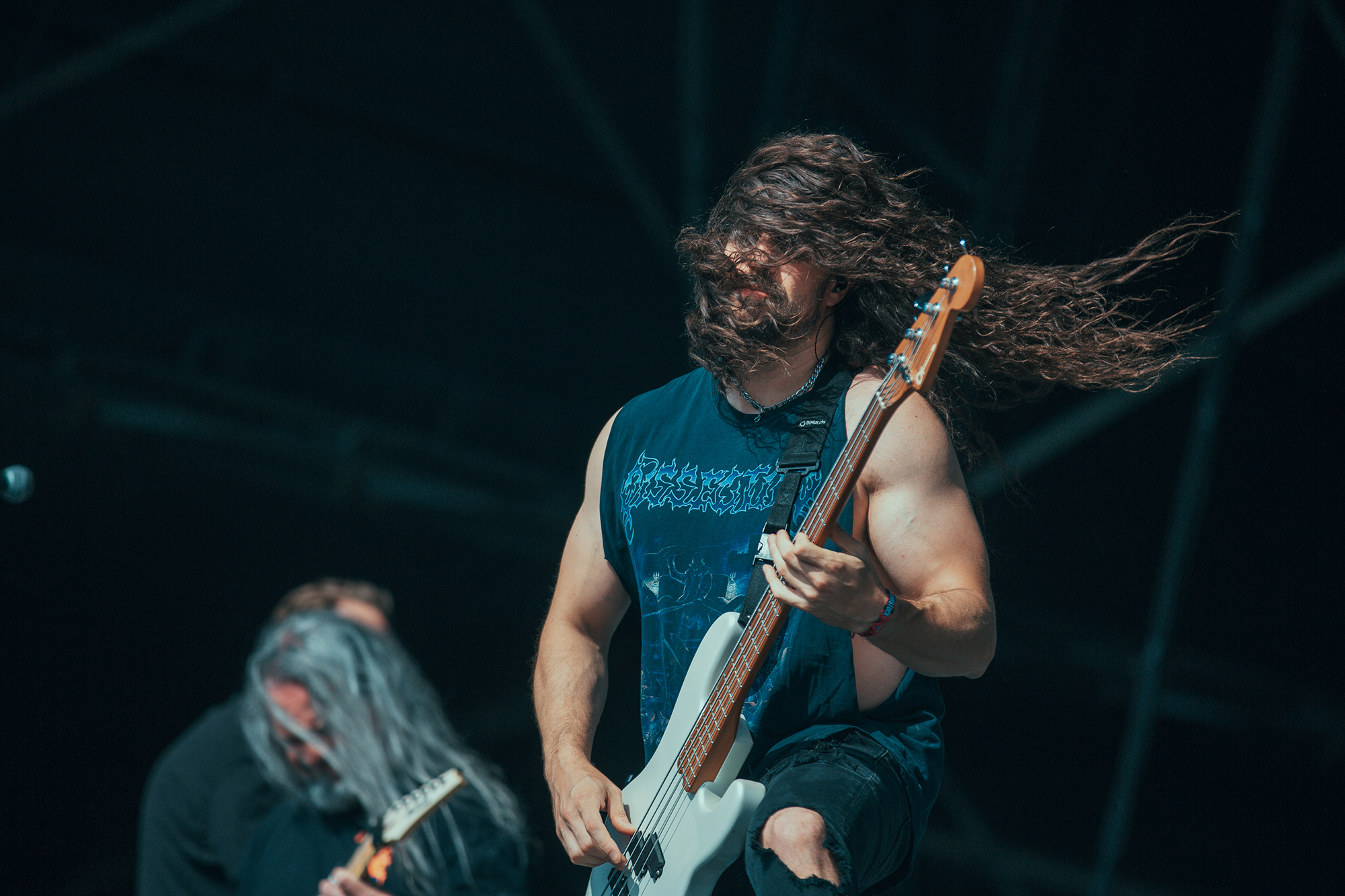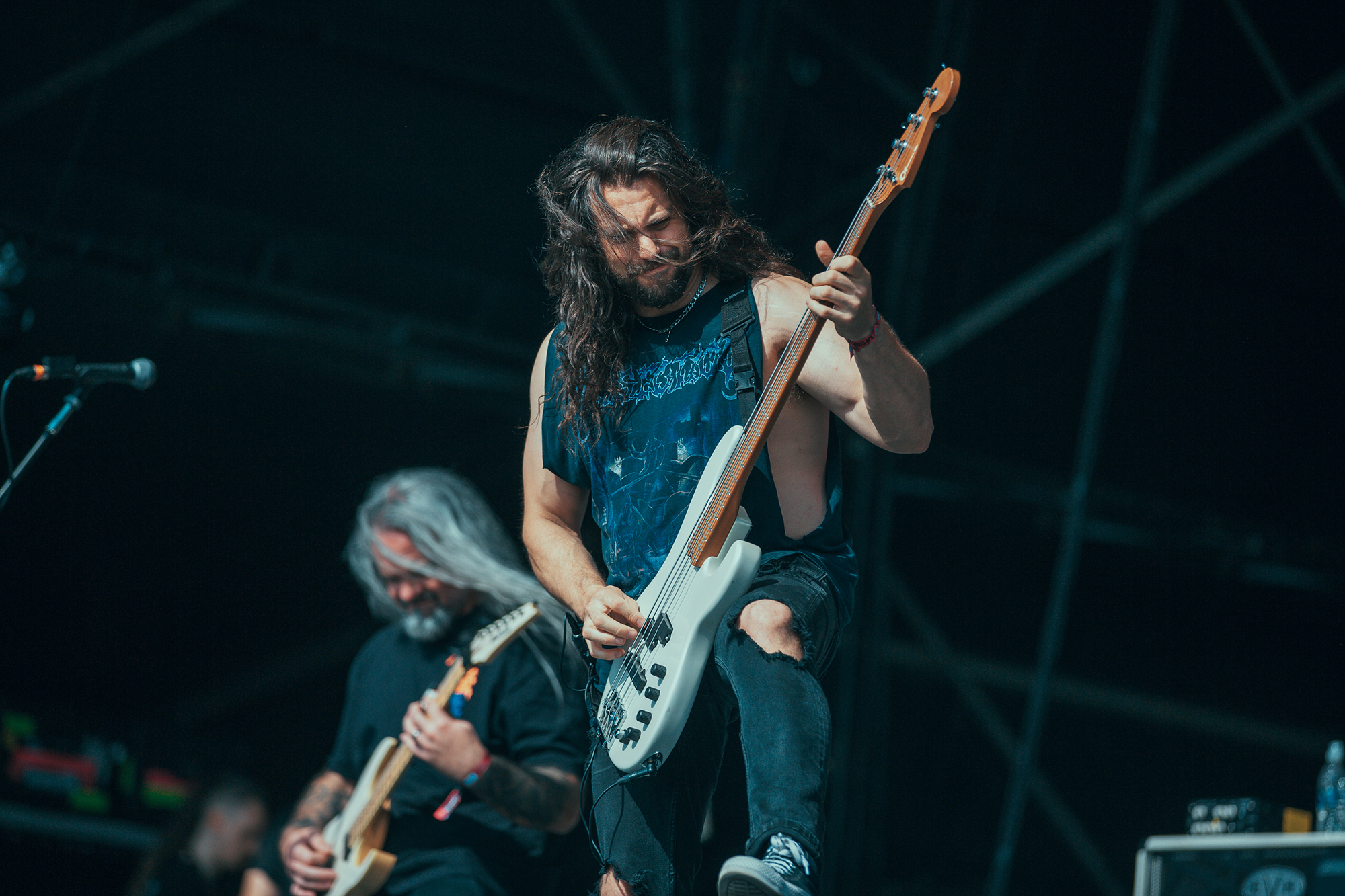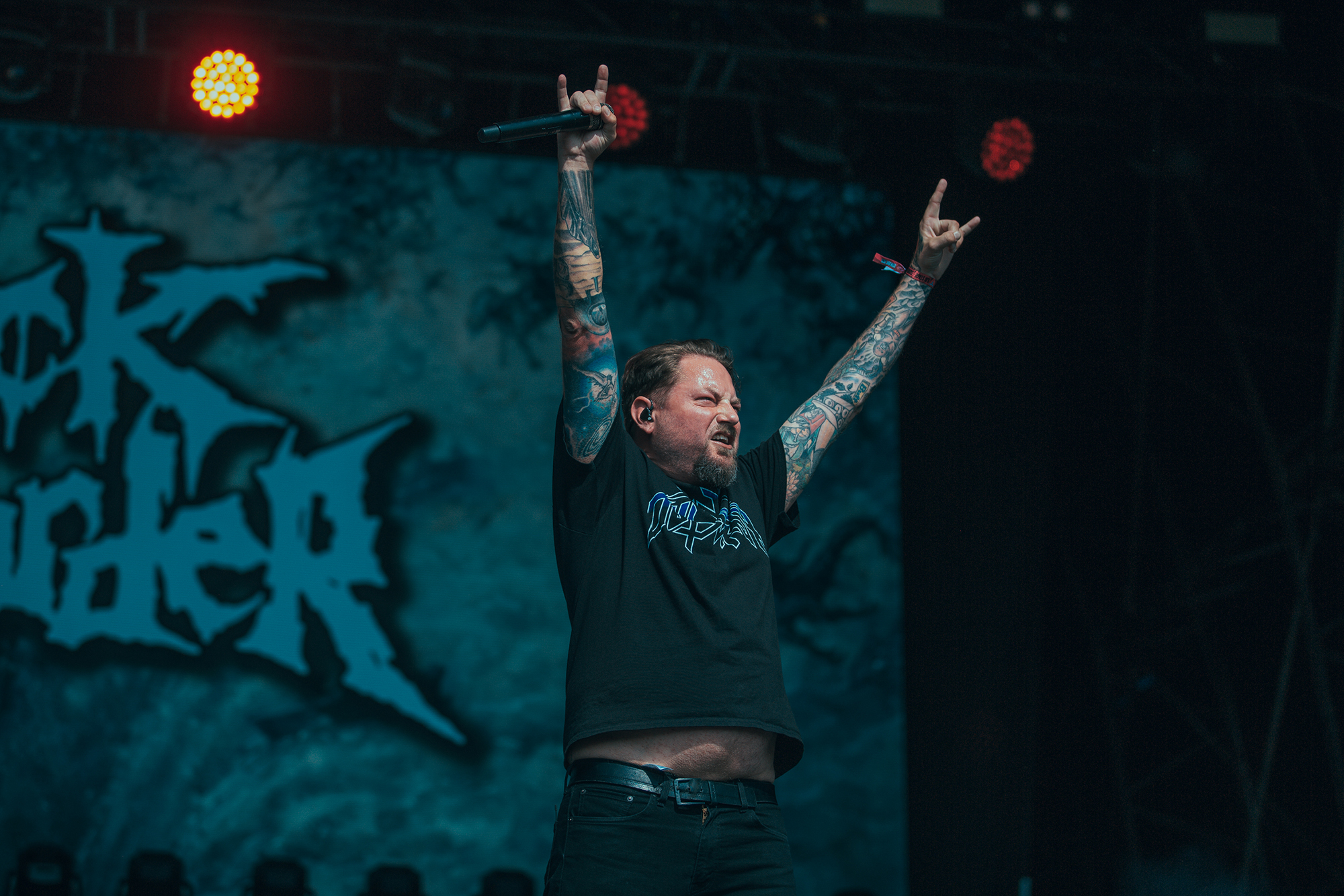 If tonight’s Sophie Lancaster Stage headliners STATIC-X stumbled upon UNDEATH’s set today, they’re leaving it pale knowing the bar’s been well and set high. The New Yorkers are met with a hero’s welcome, as if it wasn’t their first time at Bloodstock, but their fifth. They return the favour with a hat-trick of goals in the first 10 minutes as Dead From Beyond, Rise From The Grave, and Necrobionics lay waste to the tent. Circle pits and crowd surfers are in abundance, but it’s the self-prophetic More Insane that sees the first sight of a Spider-Man-cosplaying toddler crowdsurfing their Wonder Woman-themed mum that really highlights the ensuing chaos. The security on shift are put through their paces, as repeat offenders crowd surf multiple times during the same songs, as vocalist Alex Sason acts as a gruesome master of ceremonies basking in the guts and glory of their zombie-adoring bangers. By the time Lesions Of A Different Kind and Brandish The Blade bring their set to a close, you can’t help but think UNDEATH have loftier slots in their sights.