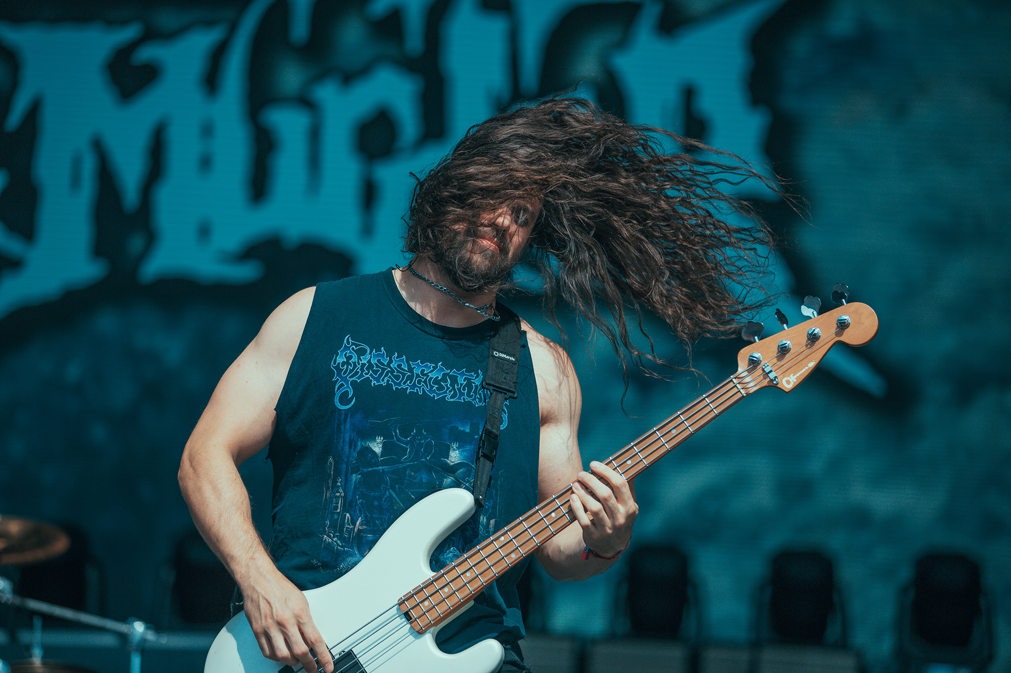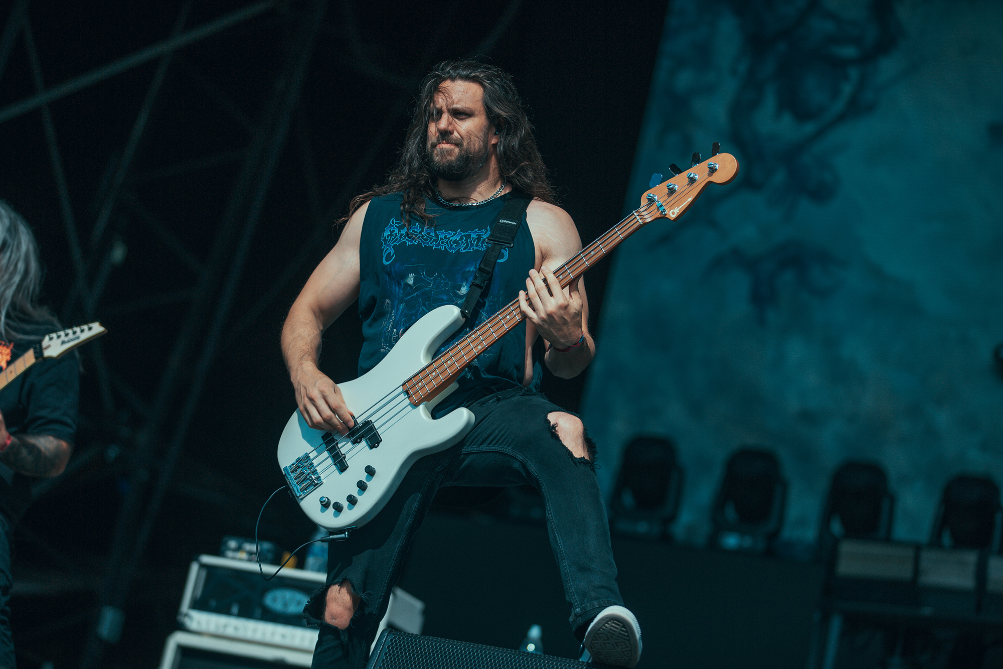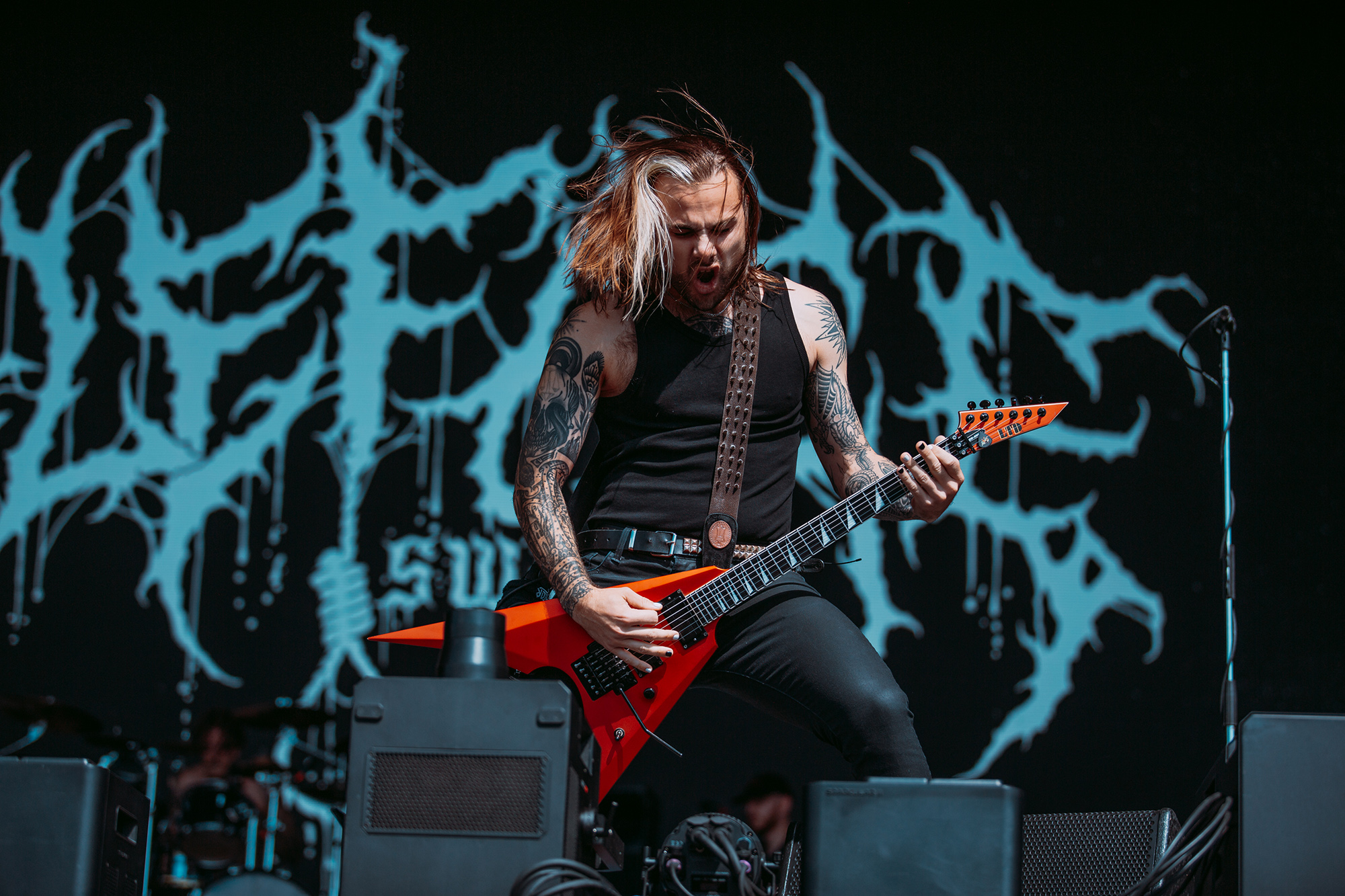 If tonight’s Sophie Lancaster Stage headliners STATIC-X stumbled upon UNDEATH’s set today, they’re leaving it pale knowing the bar’s been well and set high. The New Yorkers are met with a hero’s welcome, as if it wasn’t their first time at Bloodstock, but their fifth. They return the favour with a hat-trick of goals in the first 10 minutes as Dead From Beyond, Rise From The Grave, and Necrobionics lay waste to the tent. Circle pits and crowd surfers are in abundance, but it’s the self-prophetic More Insane that sees the first sight of a Spider-Man-cosplaying toddler crowdsurfing their Wonder Woman-themed mum that really highlights the ensuing chaos. The security on shift are put through their paces, as repeat offenders crowd surf multiple times during the same songs, as vocalist Alex Sason acts as a gruesome master of ceremonies basking in the guts and glory of their zombie-adoring bangers. By the time Lesions Of A Different Kind and Brandish The Blade bring their set to a close, you can’t help but think UNDEATH have loftier slots in their sights.
