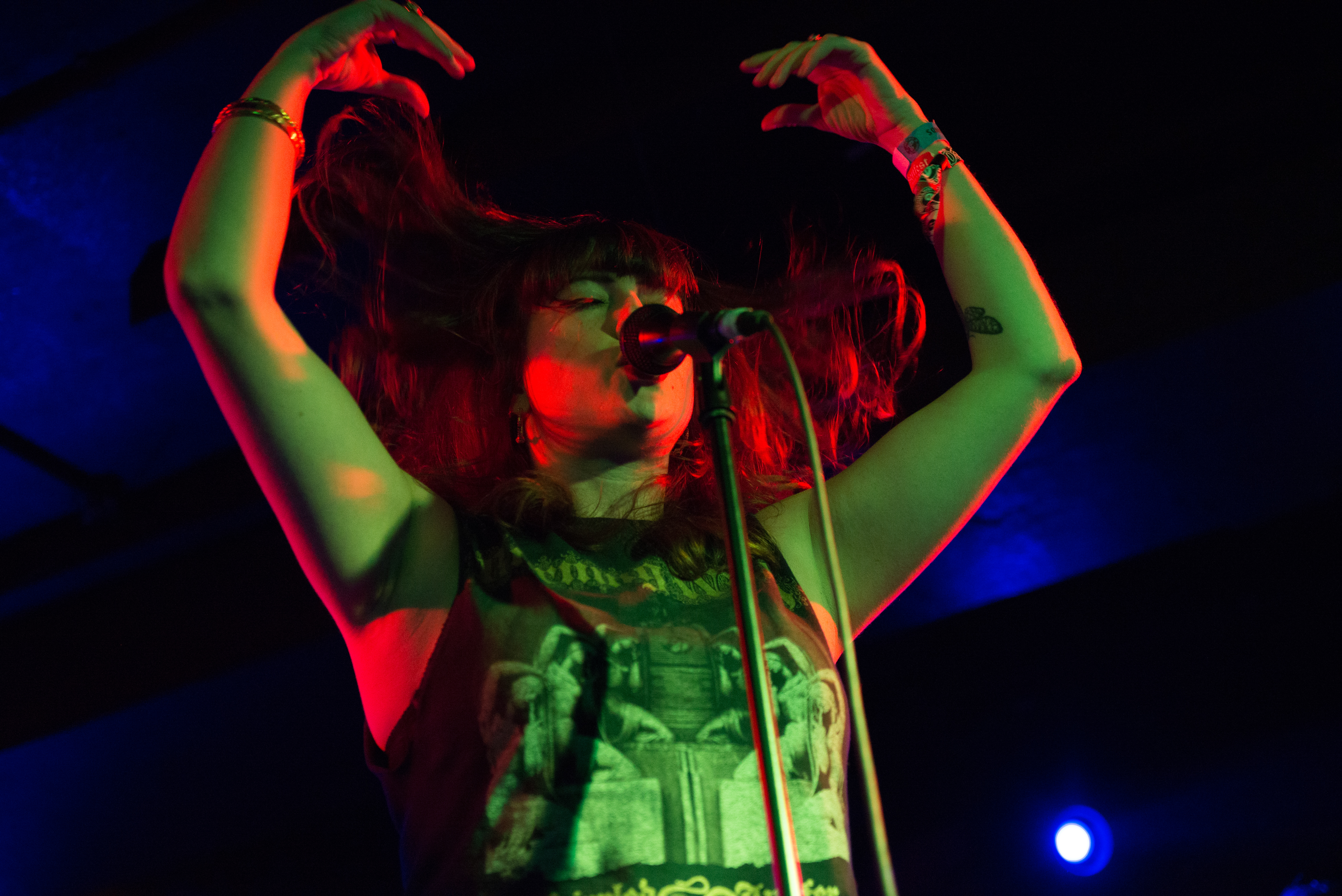 JEX THOTH are steeped in a little bit of mystery, and this translates to their live performances as well. Suffering from a slight delay in the beginning of their set, JEX THOTH is at once the band, the voice, and the experience. The dark underground venue of The Underworld was the perfect setting for the eerie performance of this band, in which the set begins with the groups frontwoman faced away from the crowd on her knees in a huge, hooded cape. JEX THOTH’s voice is strong and clear through the heavy yet ethereal instrumental sounds of the set, but also possessed a sense of feminine occultism that was hard to ignore – it was difficult to not just focus on the almost unhuman body movements of the singer during the songs. Watching JEX THOTH felt like passing through an intimate experience of a spiritual woman, and left the crowd feeling like they had just witnessed something really special. The hour-long performance of JEX THOTH was dark, eerie, and held onto a psychedelic atmosphere that was a perfect interlude between other more upbeat bands of the day.