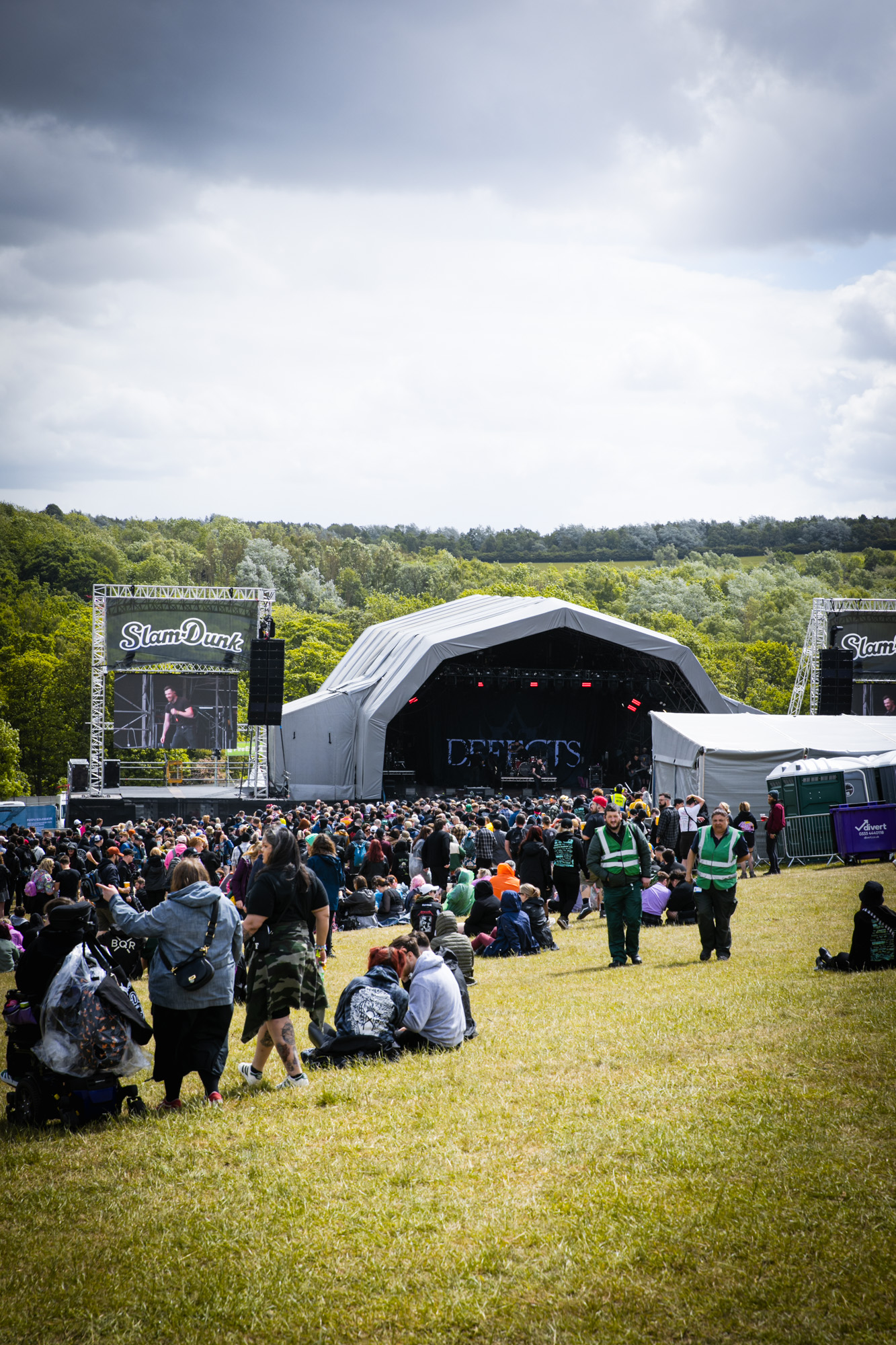 An eclectic lineup ensured there was something for just about everyone, but as is common with festivals, difficult choices were required for many fans with clashes aplenty throughout the day. We arrived at Slam Dunk bang-on-time for gates to open – forgetting perhaps that the village was open for a whole two hours before the main arena was made available to all. The queue for merch filled rapidly, with Slam Dunk-branded hoodies selling exceedingly quickly. At this point, those waiting patiently were doused with a short shower of rain. Communal groans, ponchos on, hoods up – you get the idea. That said, it was short lived, but there would be more precipitation as the day went on.