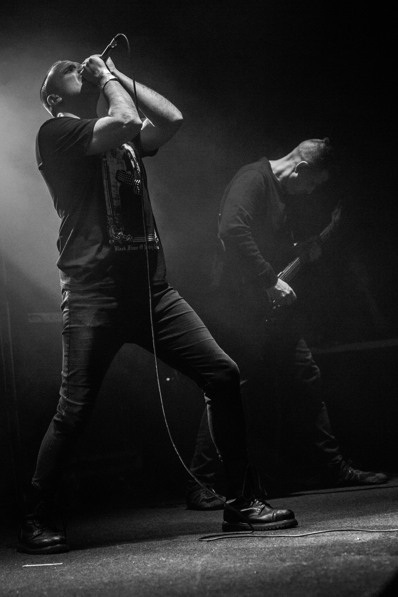 Local squad ATONEMENT blast away the cobwebs and kick off day two at Winds of Agony with a high-energy display of black/thrash metal. They began life in 2010 but only released their debut full-length Tiranos del Paramo last year. Rebellious and unaccountable, this punk-strewn metal is the ideal accompaniment to any alcohol binge. Skilfully, the Spaniards draw influences from classic 80s American thrash and crossover. With dirty riffs and bludgeoning percussion, their style resembles the likes of CHILDREN OF TECHNOLOGY and, similarly, their anthems are well-suited for post-apocalyptic sojourns. Being locals, there is a loyal collective of fans headbanging and singing along to the odd line. Their stage presence is lively and fun, well-suited to the live venue. Their set remains engaging as it goes on, and it’s highly likely they’ve converted some new fans.
