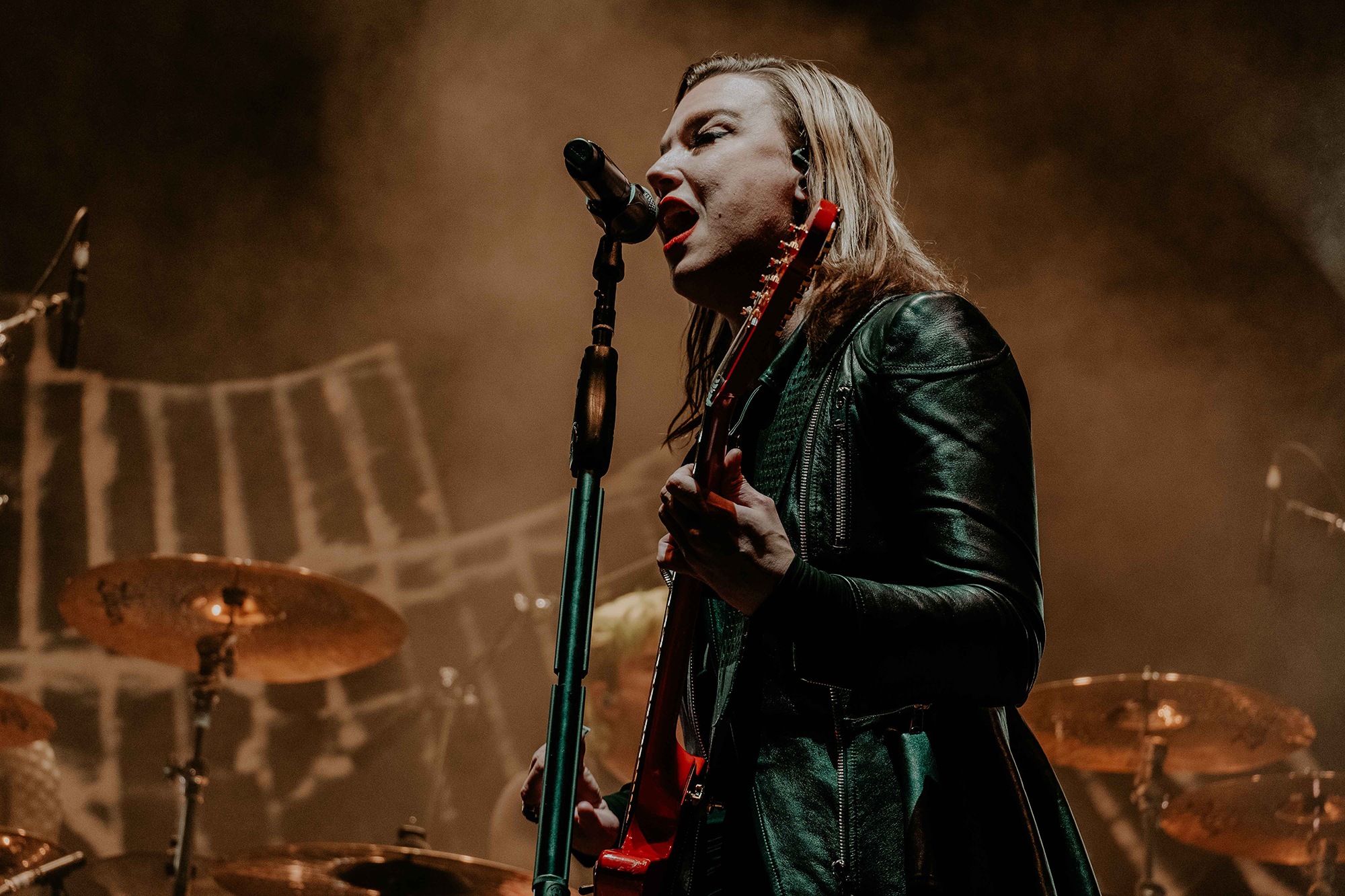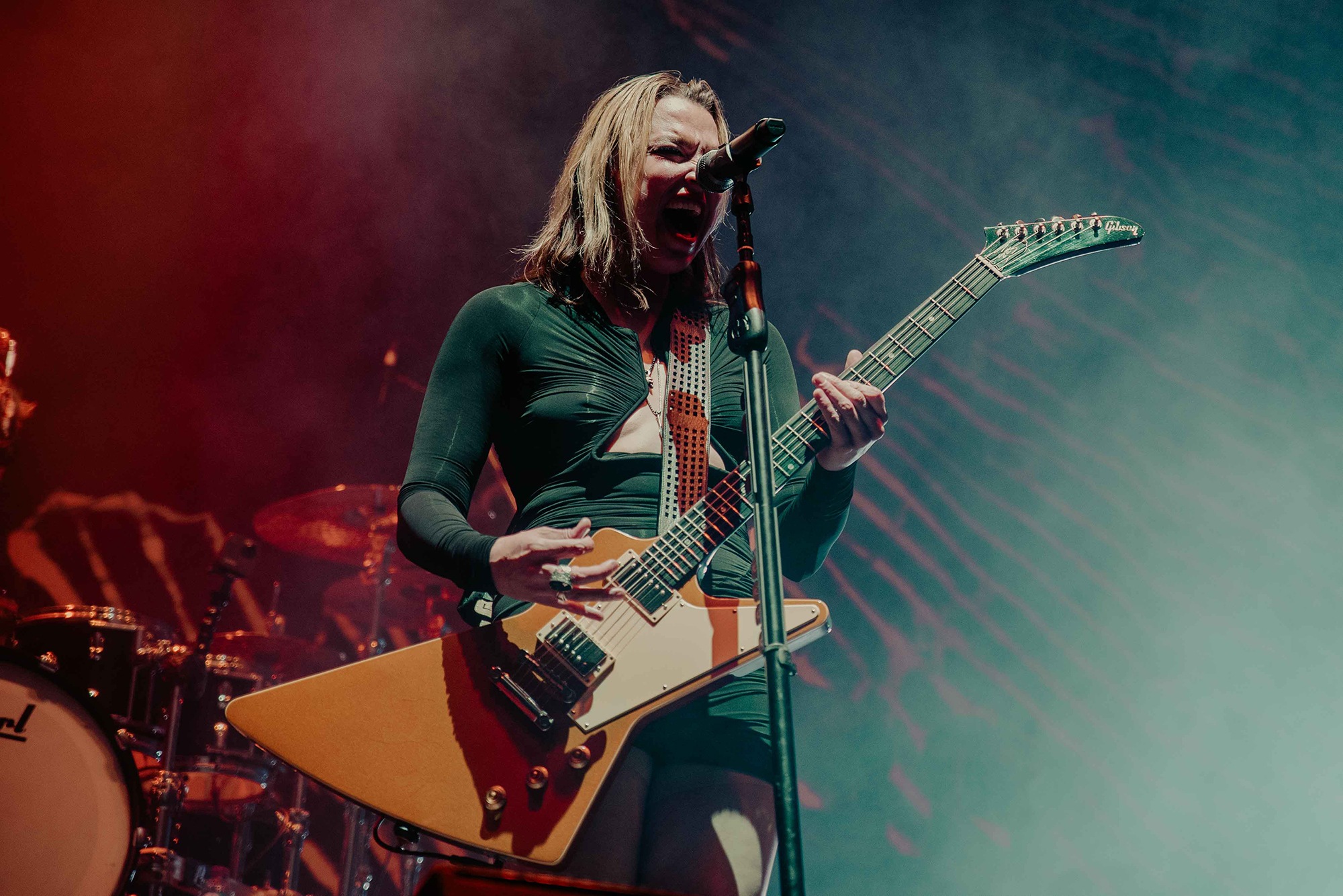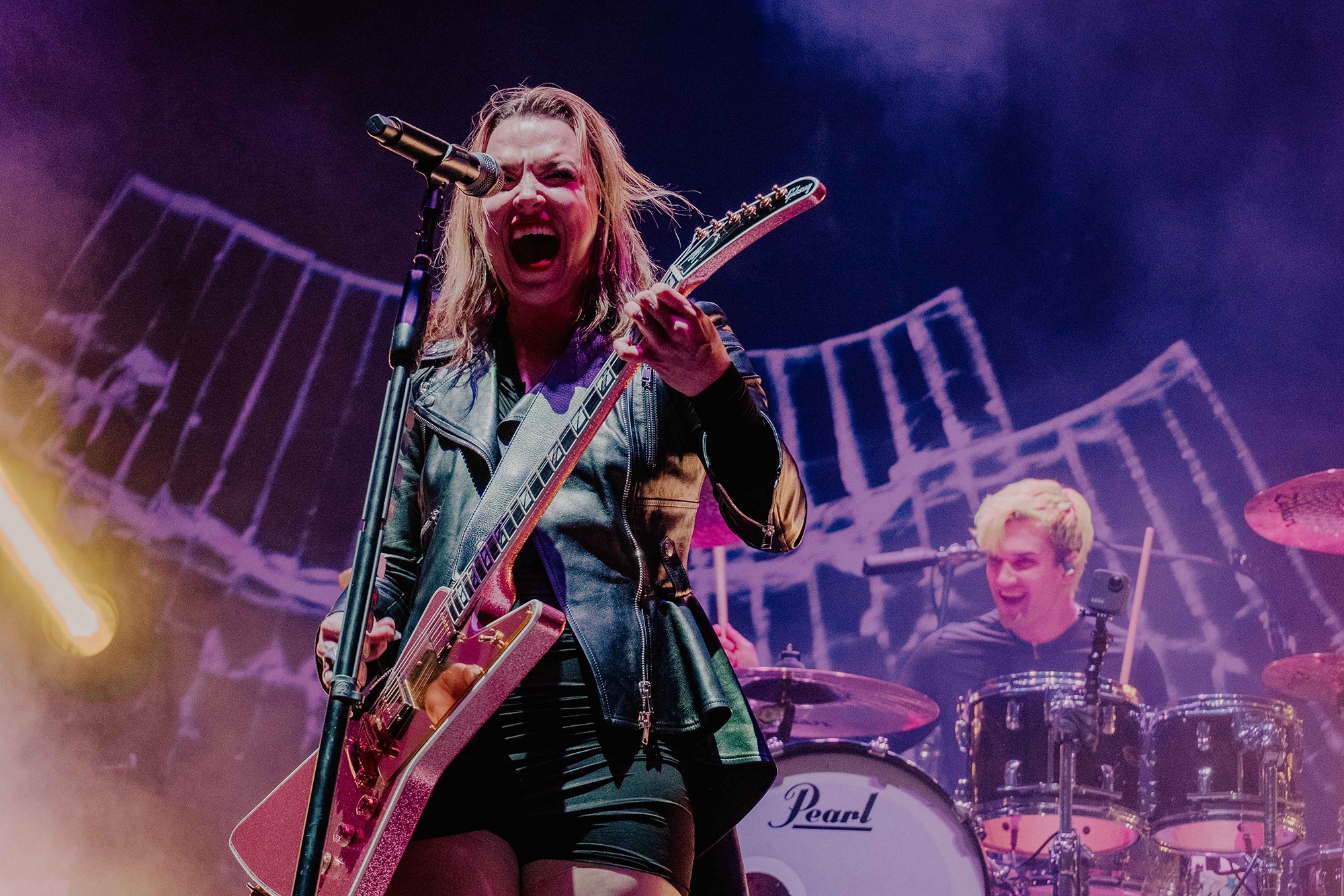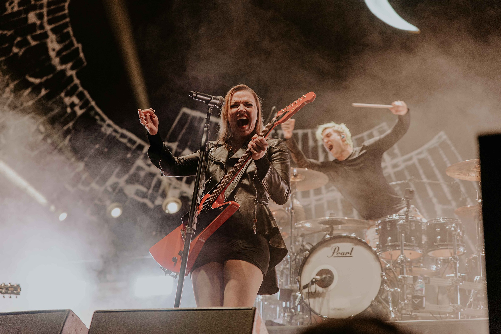 Resurrecting tour lineups of the past, Nashville based HALESTORM’s entrance to the stage certainly made people pay attention. Lzzy Hale’s characteristic voice teased the crowd with the opening of The Steeple. The growl residing in Hale’s vocals pricked the ears. Screams from the crowd punctuated each line. Hale stood armed with a striking red guitar and the full band kicked in to usher their congregation forward. We were indeed among HALESTORM’s people as the crowd drowned Hale’s voice out quickly, singing every word with increasing vigor.