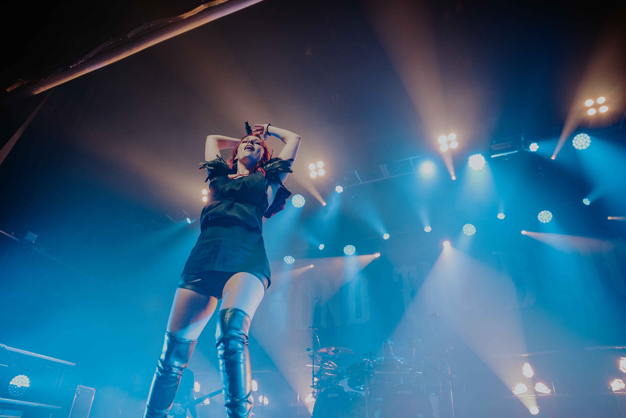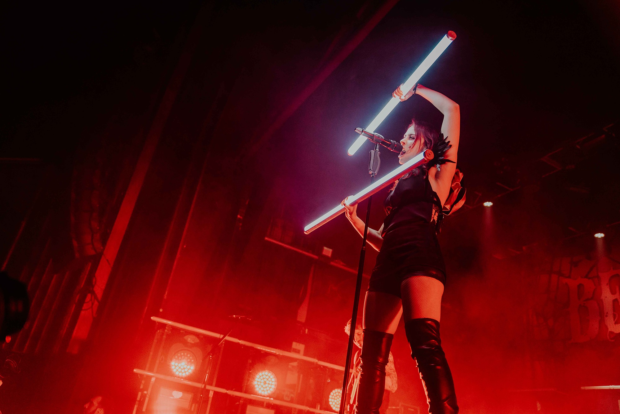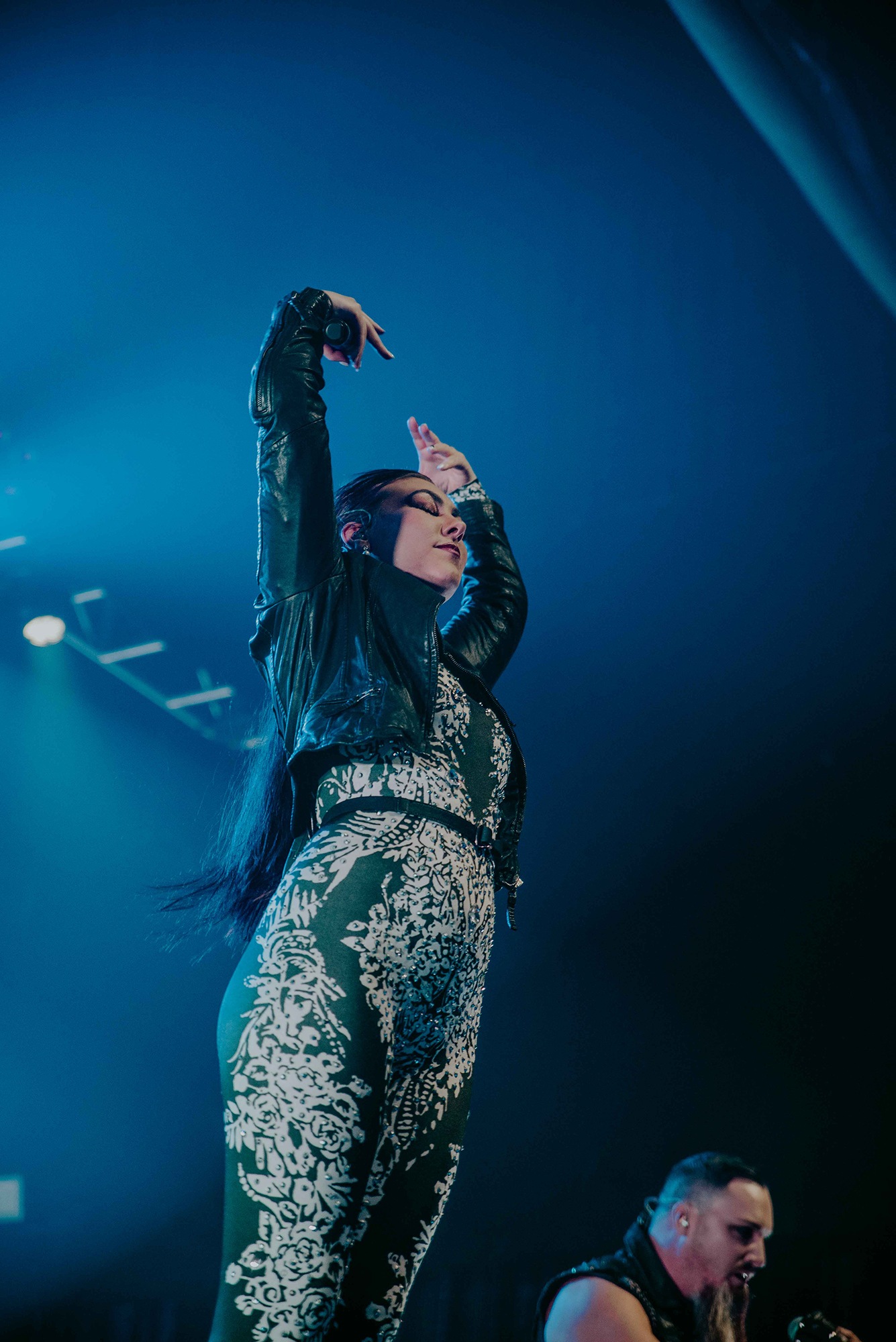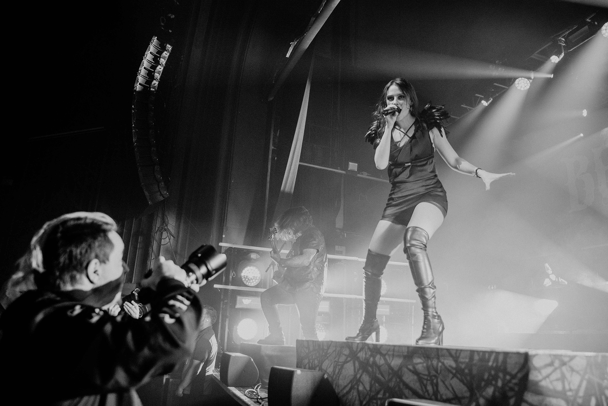 BEYOND THE BLACK waste no time in bringing the evening back on track; the anthemic Is There Anybody Out There? roars out the gates replete with extravagant lighting (including vocalist Jennifer Haben dual wielding a pair of lightsabers herself). Blinding the audience at the soft opening to third song Songs Of Love And Death is certainly a choice but it doesn’t dissuade the singalongs or the bouncing pit. The mix is also considerably better, giving Haben‘s voice ample breathing room without stifling the searing guitar solos, nor do the drums drown out the band or their backing symphonics.