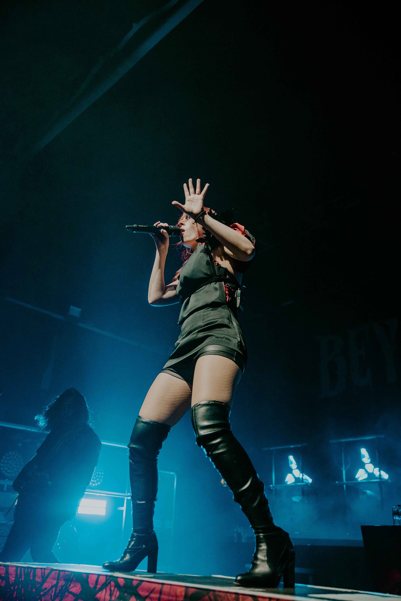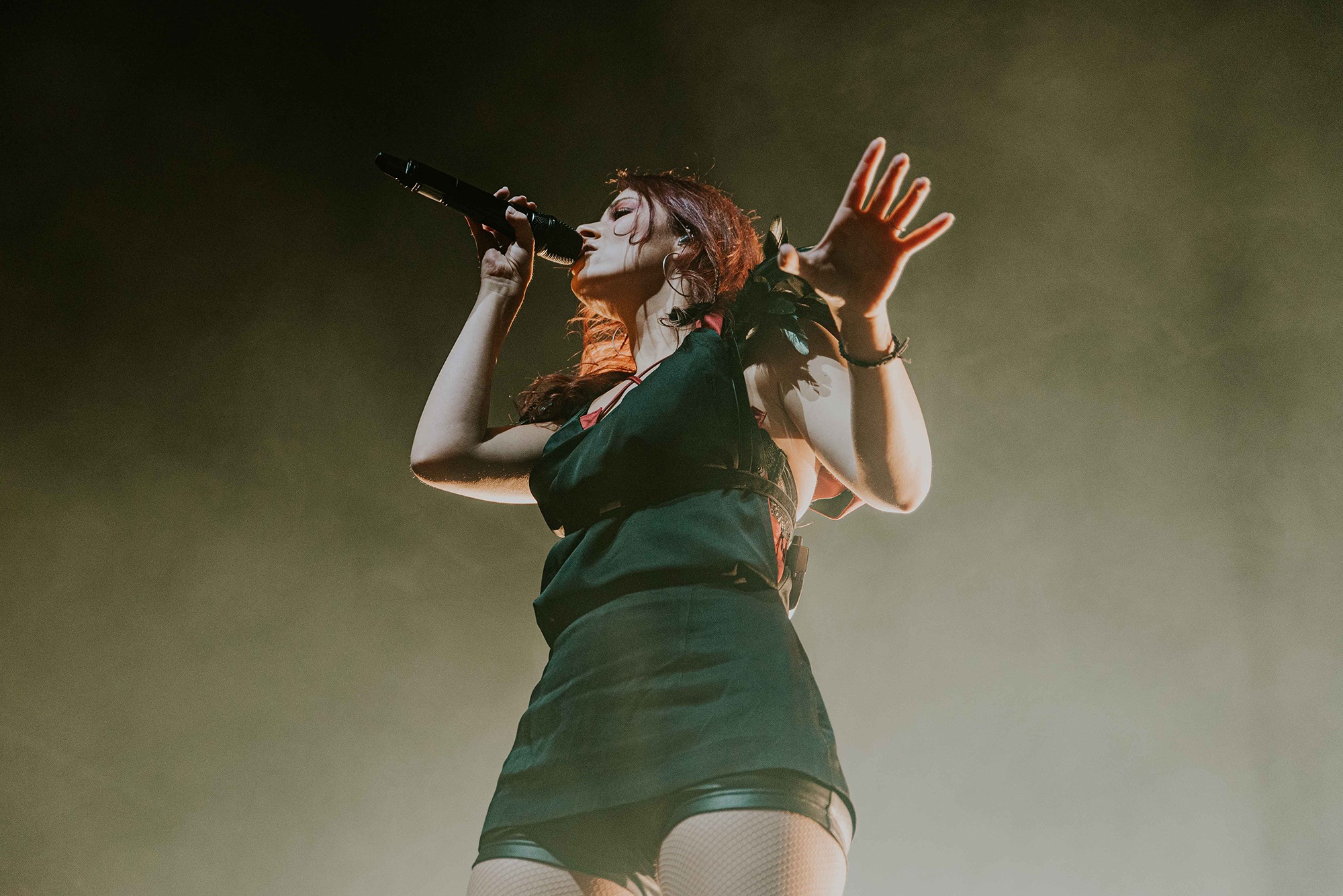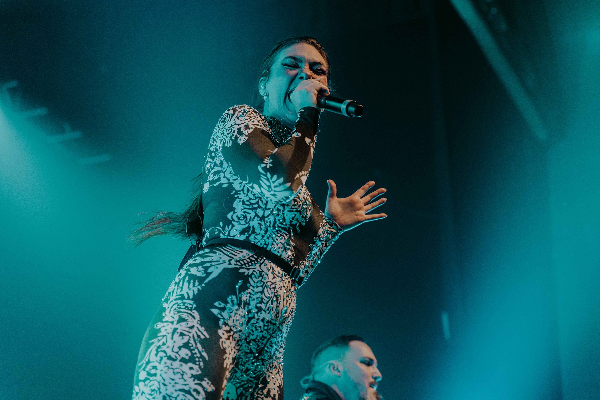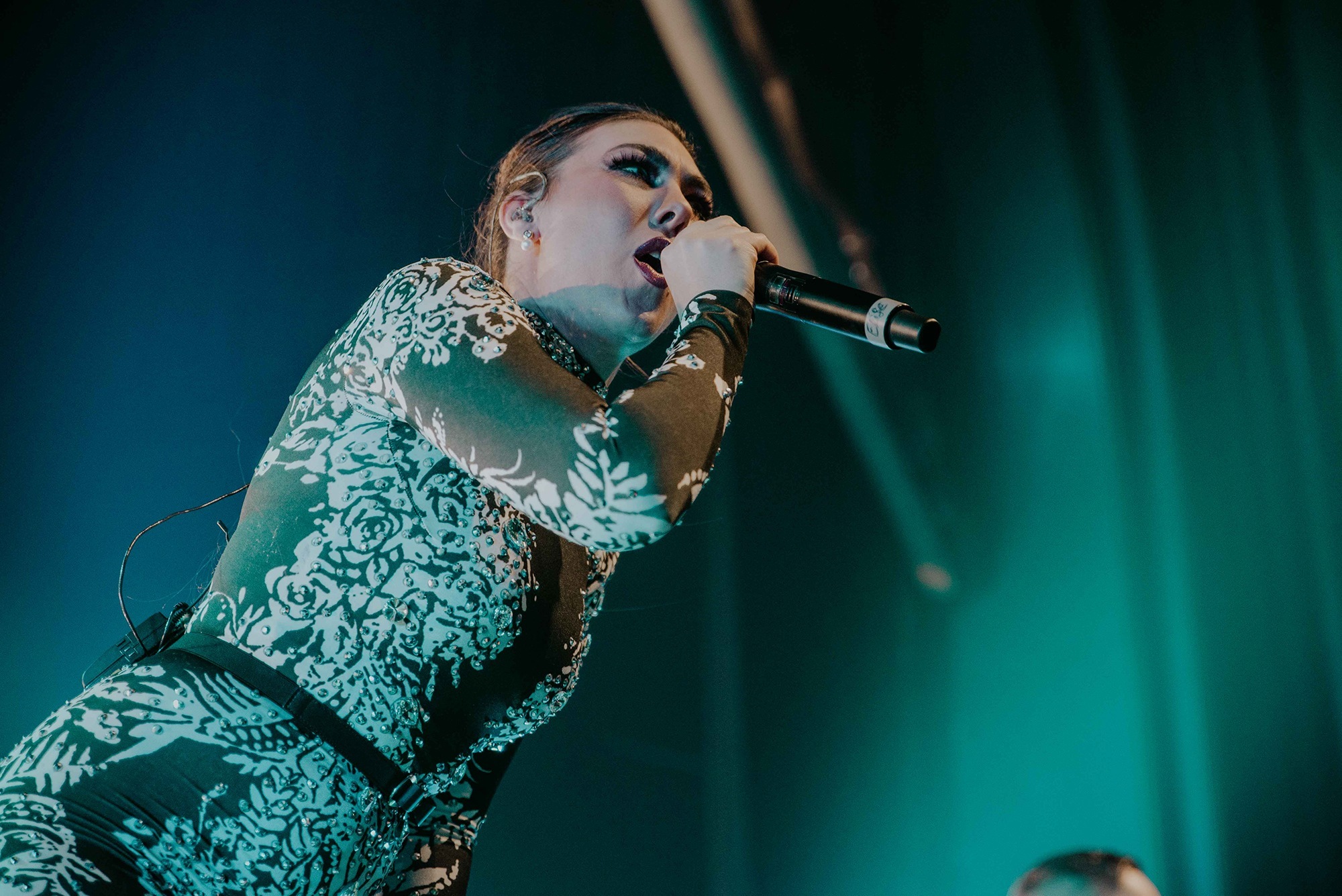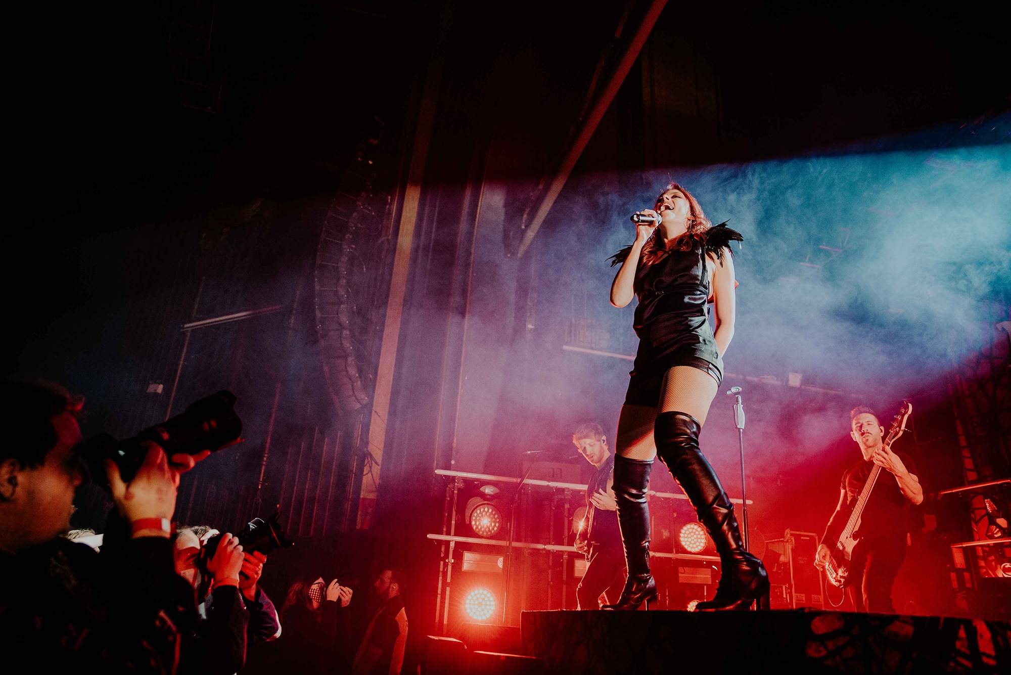 BEYOND THE BLACK waste no time in bringing the evening back on track; the anthemic Is There Anybody Out There? roars out the gates replete with extravagant lighting (including vocalist Jennifer Haben dual wielding a pair of lightsabers herself). Blinding the audience at the soft opening to third song Songs Of Love And Death is certainly a choice but it doesn’t dissuade the singalongs or the bouncing pit. The mix is also considerably better, giving Haben‘s voice ample breathing room without stifling the searing guitar solos, nor do the drums drown out the band or their backing symphonics.