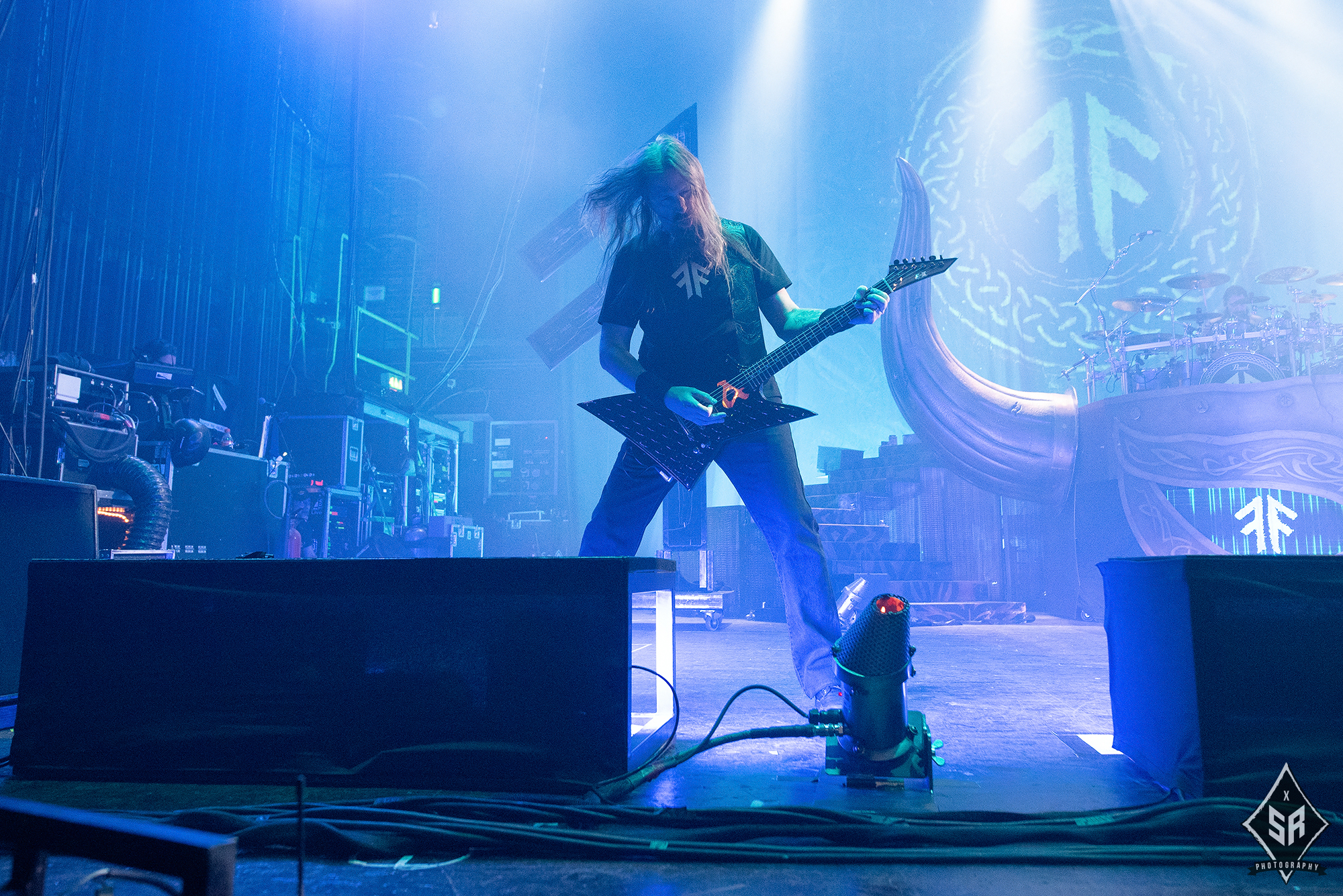 The genuinely breathtaking level of theatrics, stage dressing, and pyrotechnics gave the whole show the feeling of a condensed arena show. Over the course of the band’s set, the staging evolved and changed with each passing song. After the first few tracks the backdrop fell to reveal a Viking berserker like that of the one on the cover of the band’s new album, and further into the set, before the band played Guardians of Asgaard, floor-to-ceiling curtains dropped to reveal two giant statues of Norse warriors ominously flanking the stage. Aside from the stage props, the set was also punctuated by actors clad in costumes from Viking mythology and beyond. During the track Deceiver of the Gods the Norse god of mischief, Loki joined the band on stage complete with glowing eyes and a vest strapped with pyro that exploded upon his arrival. In addition to this, there was also the appearance of two Viking warriors during one of the band’s newer tracks Shield Wall, who went on to battle with sword and shield throughout the track until one was the victor and the other was ‘dead’.
