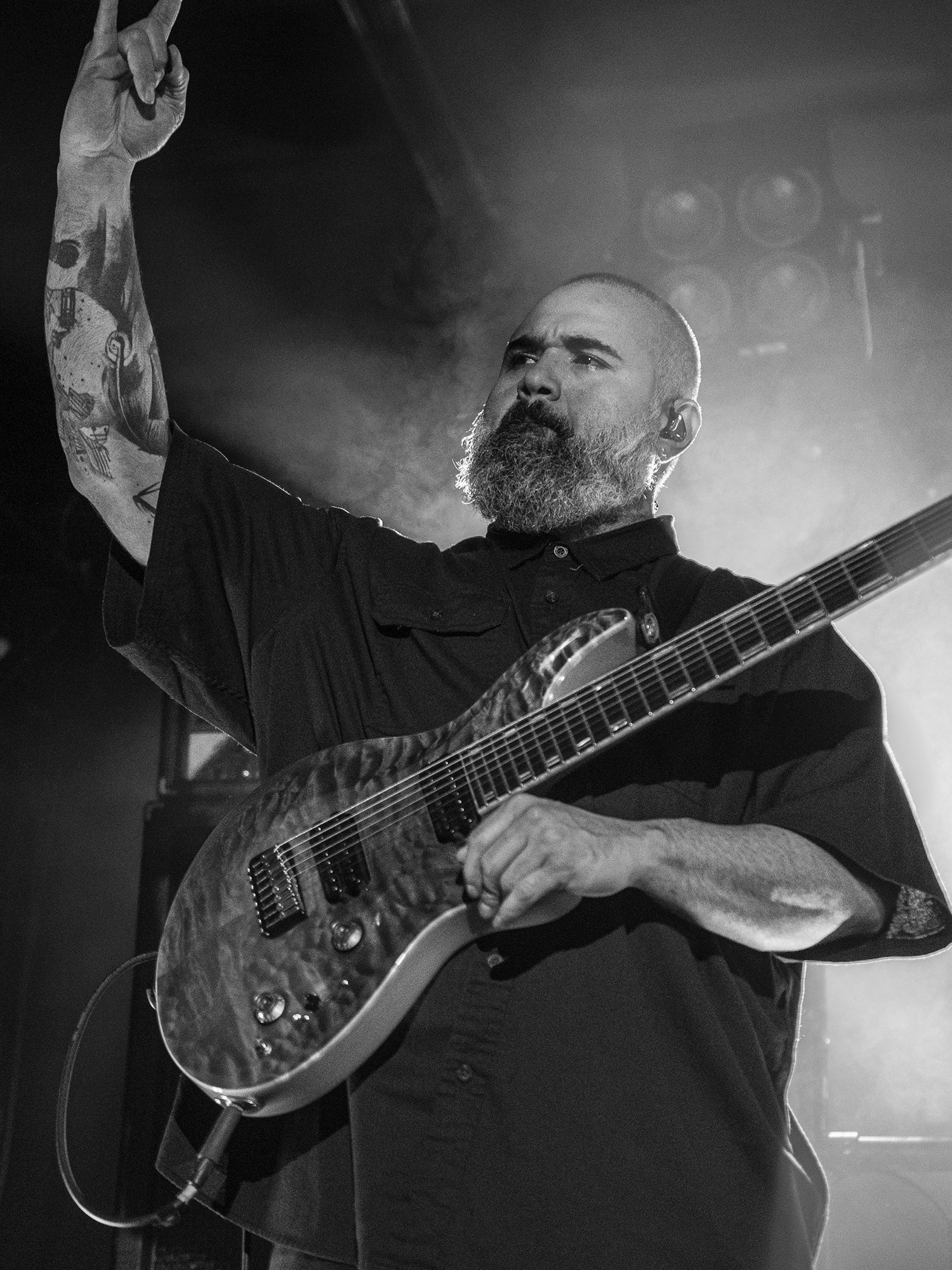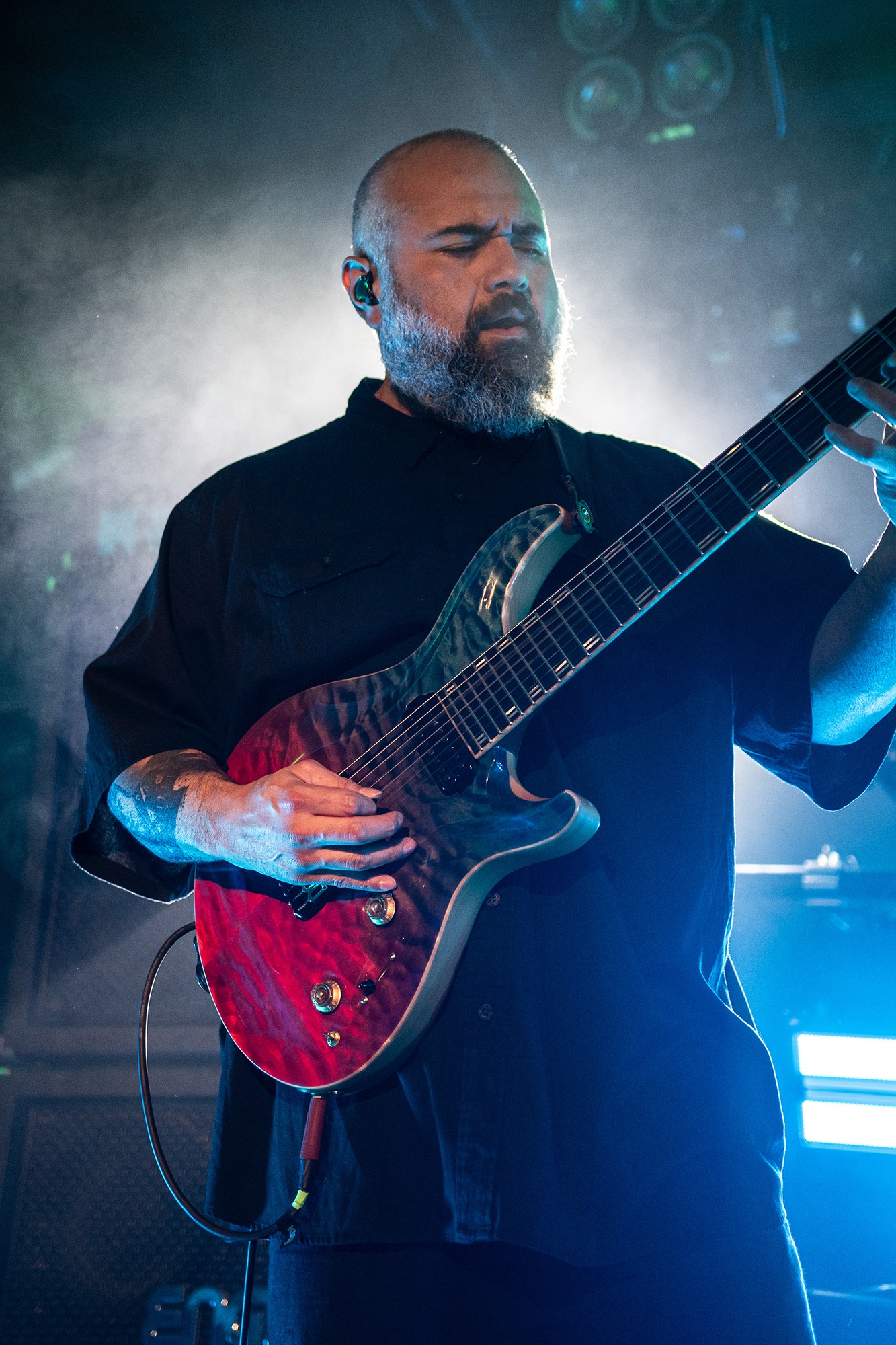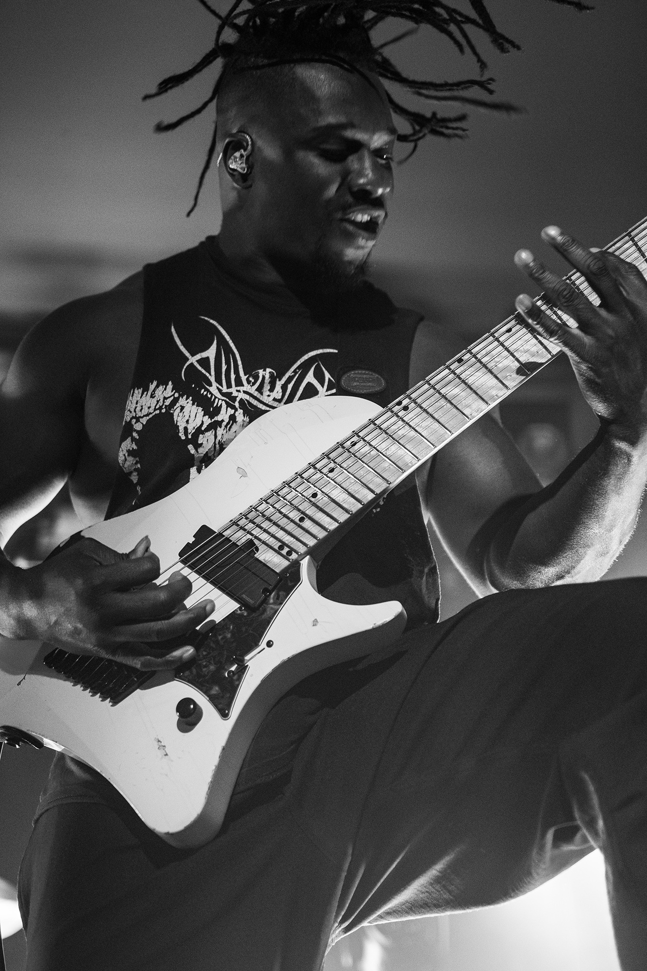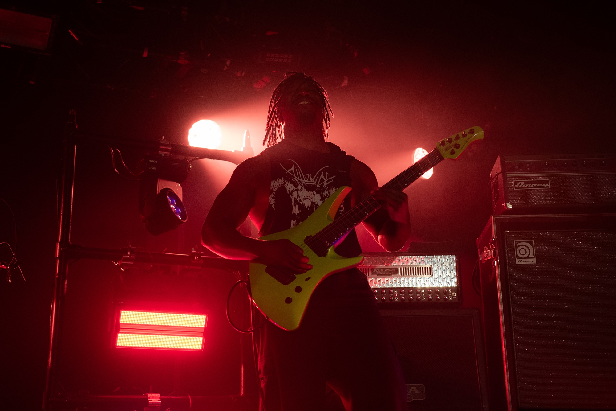 This opening song puts the stunning ability of the three musicians on full display, as frontman Tosin Abasi and fellow guitarist Javier Reyes trade delightfully unpredictable licks. The precision of their playing is all the more impressive given they are playing to pre-recorded bass and synth tracks. Not a note is out of place and the audience is in awe from the very start and throughout the 14-song set. As the tour is in support of their fourth studio album, Parrhesia, there are plenty of new tracks for fans to enjoy, starting with Conflict Cartography. This rhythmic odyssey laced with confounding melodies is stunning to watch unfold in a live setting, with the accompanying light show helping to sell the science fiction vibes given off by the trio’s impeccable playing.