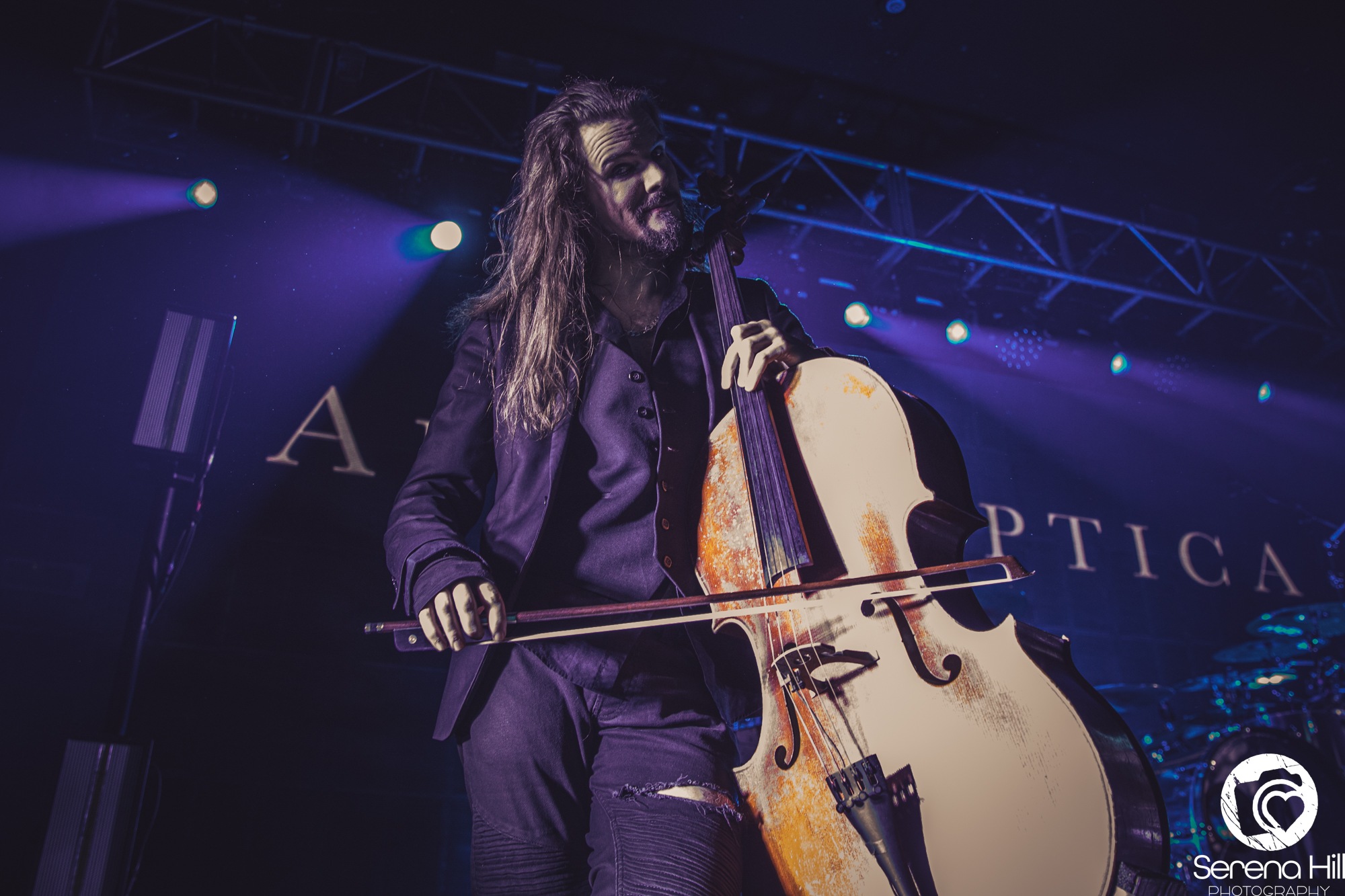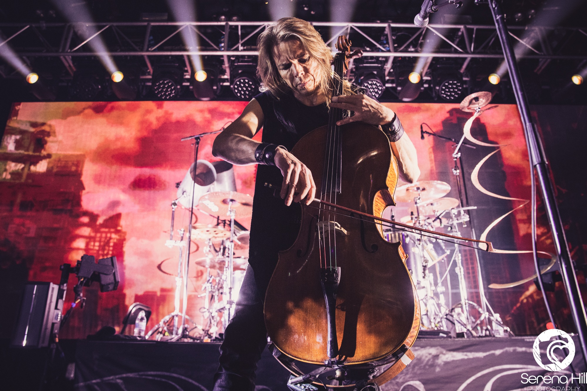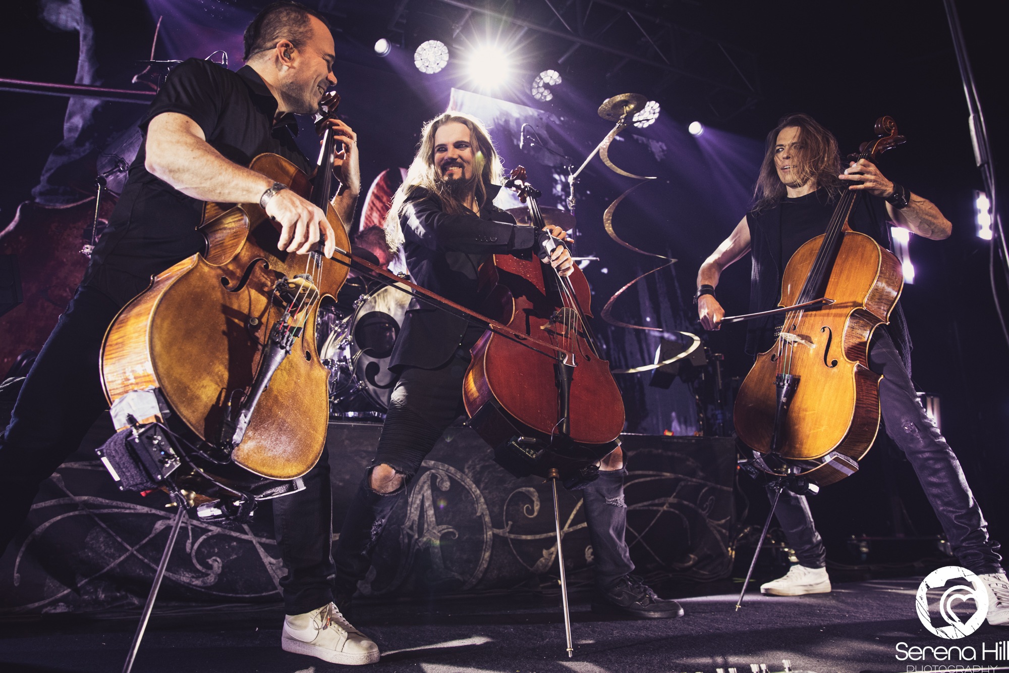 The final act to perform on the Epic Apocalypse Tour is, well, APOCALYPTICA. Their entry onto stage is accompanied by the ambient sounds of a forest that is quickly disrupted as it crescendos into a turbulent storm. Their set begins as a trio of cellos comprised of Perttu Kivilaakso, Eicca Toppinen, and Paavo Lötjönen, forgoing the more traditional metal elements to perform Ashes Of The Modern World. It is the perfect way to open their set, giving the audience a taste of each little thing that makes APOCALYPCTICA great; it has everything from the classical string trio harmonies, to blast beats that sit comfortably underneath a cello wah solo that wouldn’t sound out of place in a GUNS N’ ROSES track. They make the effort to move around the stage, despite the usual grounded nature of their instruments, showing the audience how greatly they are appreciated in this moment.