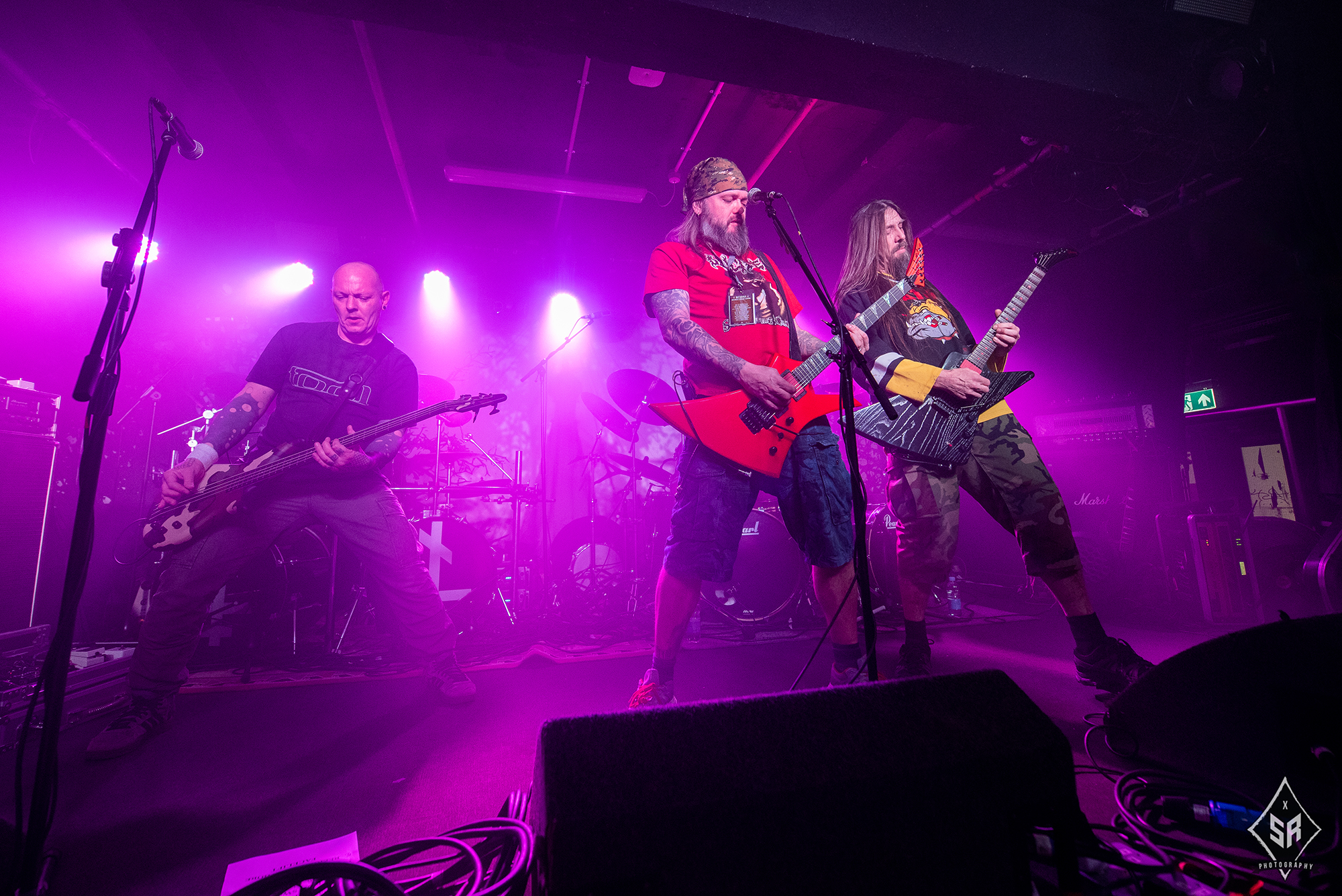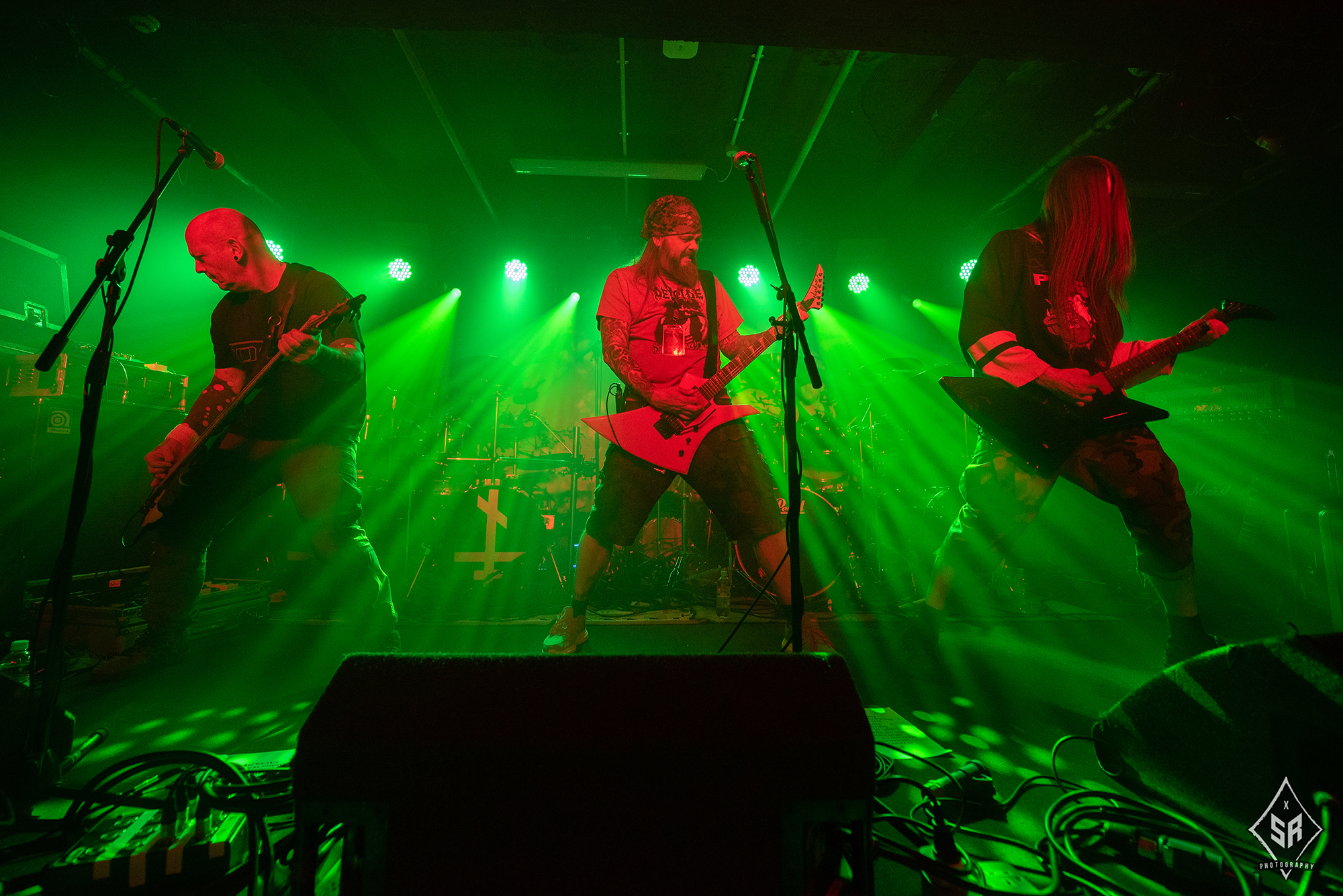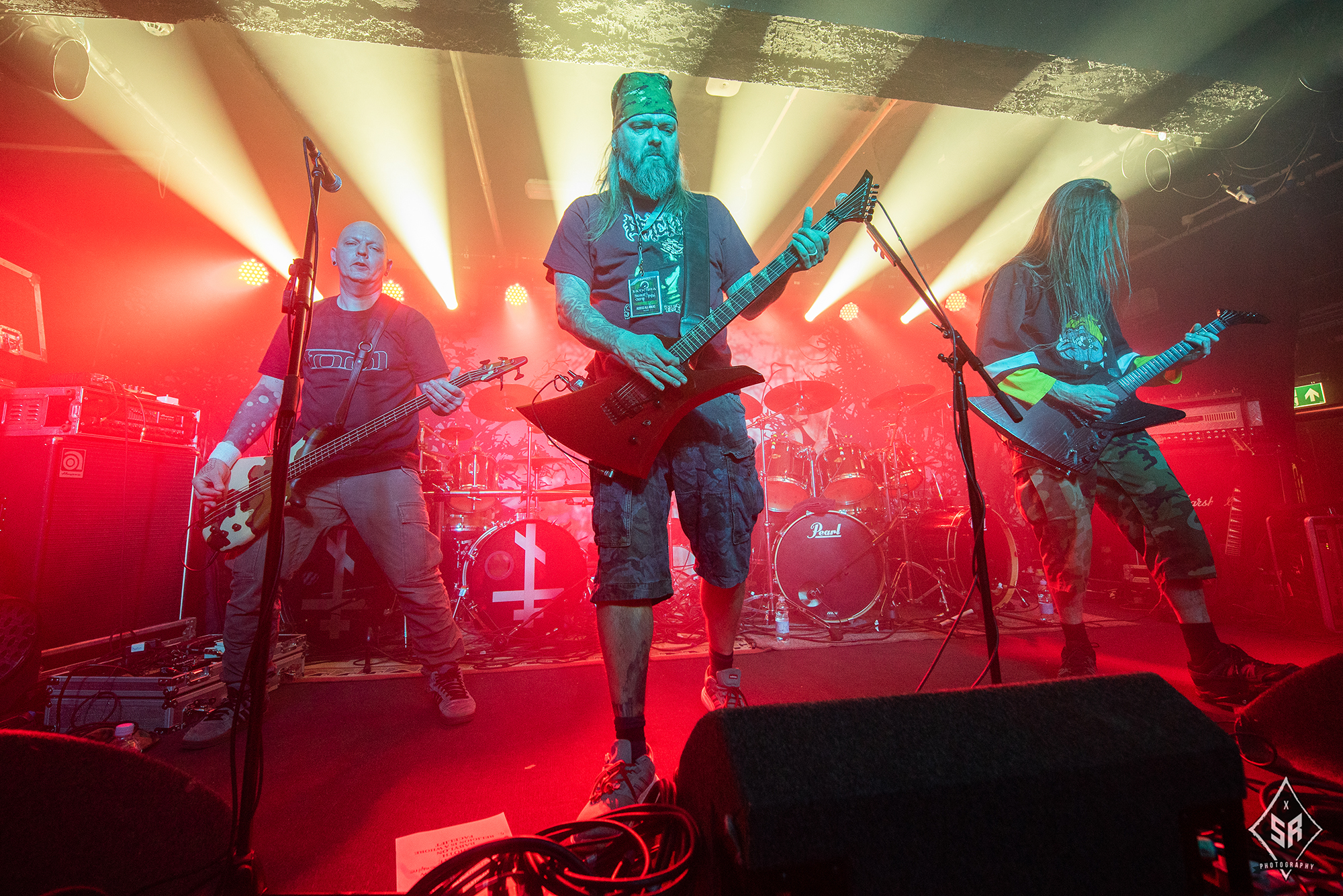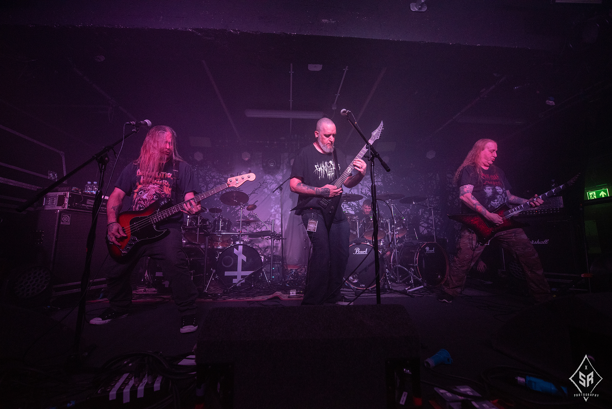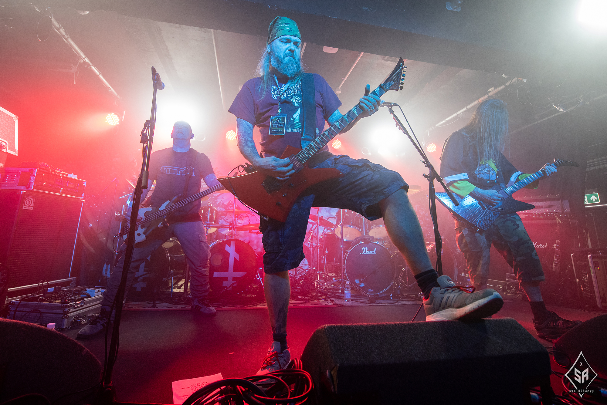 Given the occasion, a nicely packed crowd greets Danish quartet KONKHRA and thanks to their three plus decade experience, the band provide a suitable and punishing opening salvo to proceedings. Their trash meets death metal hybrid of a sound is warmly received by those in attendance at Manchester’s Academy 3 with Anders Lundemark‘s roaring vocals sounding clear as day and the neat interchanges with fellow guitarist Hakim enables the band’s riffing to cause many heads to bang along. And yet, for all the band do well, and there are numerous moments of quality, there are times where KONKHRA just sound formulaic. This might be down to the band’s lengthy time on stage, allowing a sense of rinse and repeat to establish a foothold and it beckons the question as to whether a shock and awe approach would have reaped greater rewards. However, despite the moments where they falter, on the whole, the Danes provide enough to kick off proceedings in a suitably strong manner.