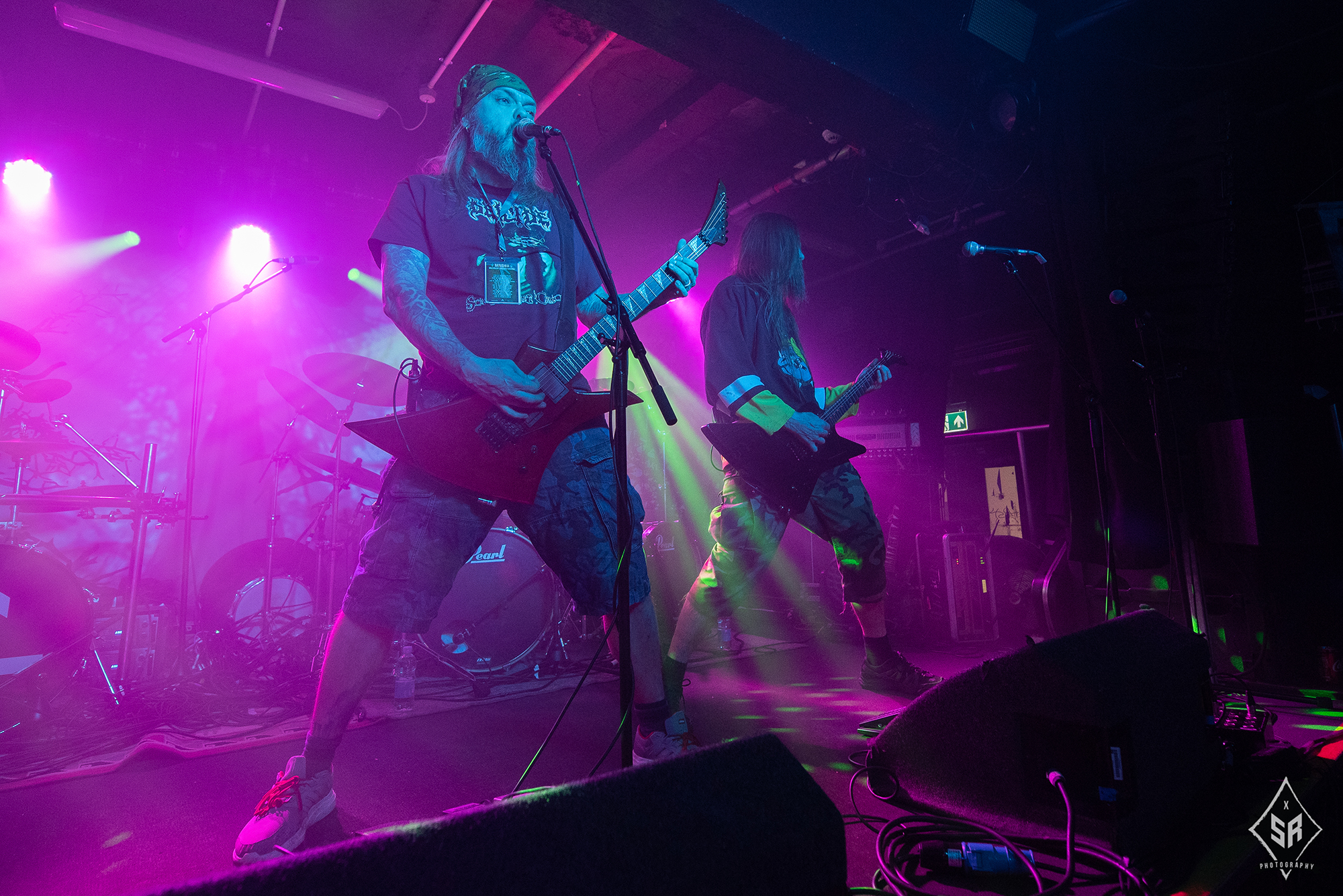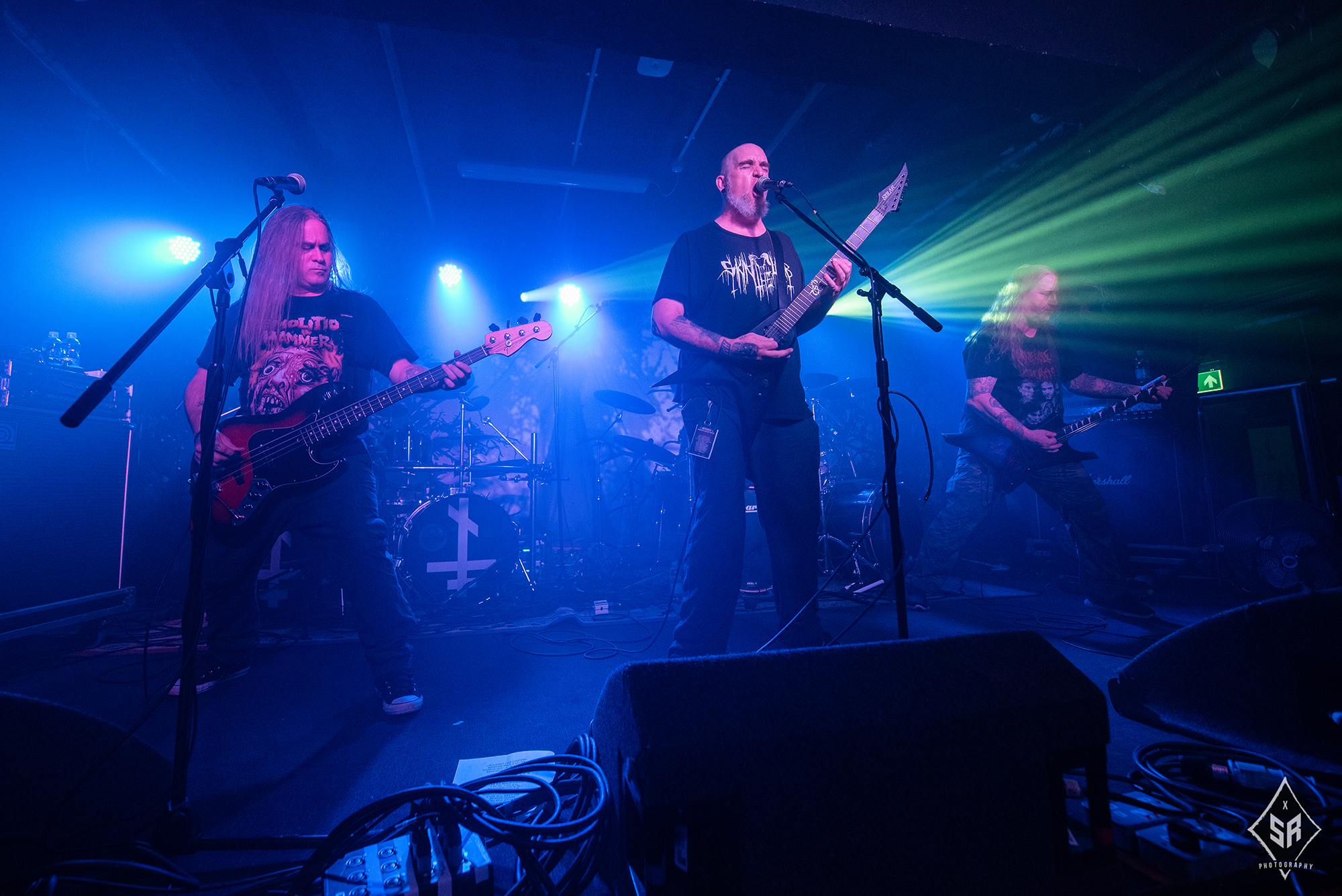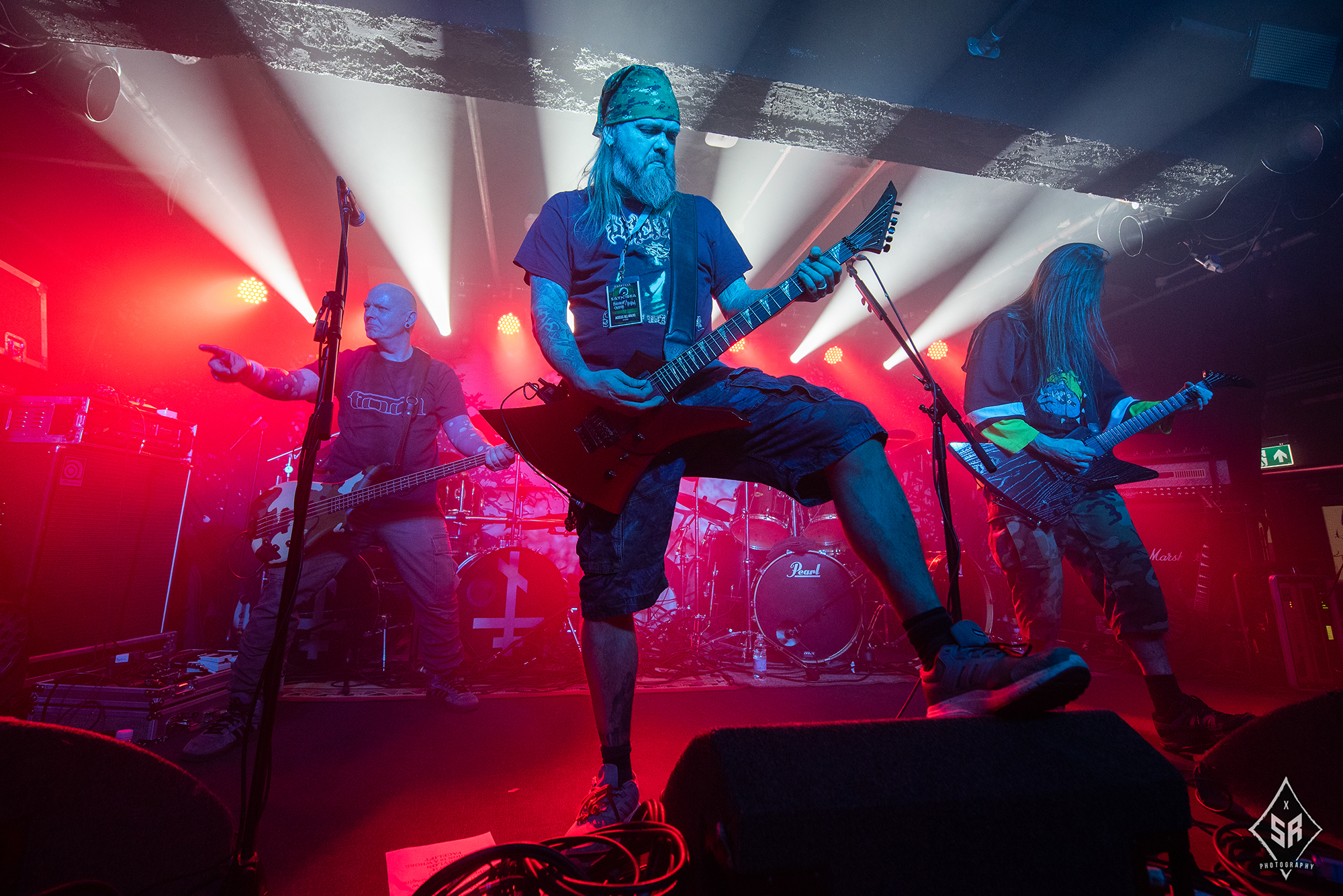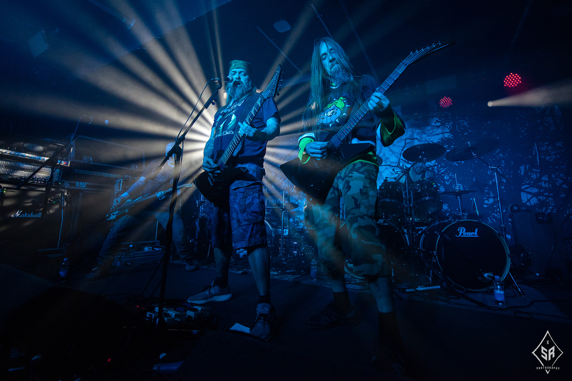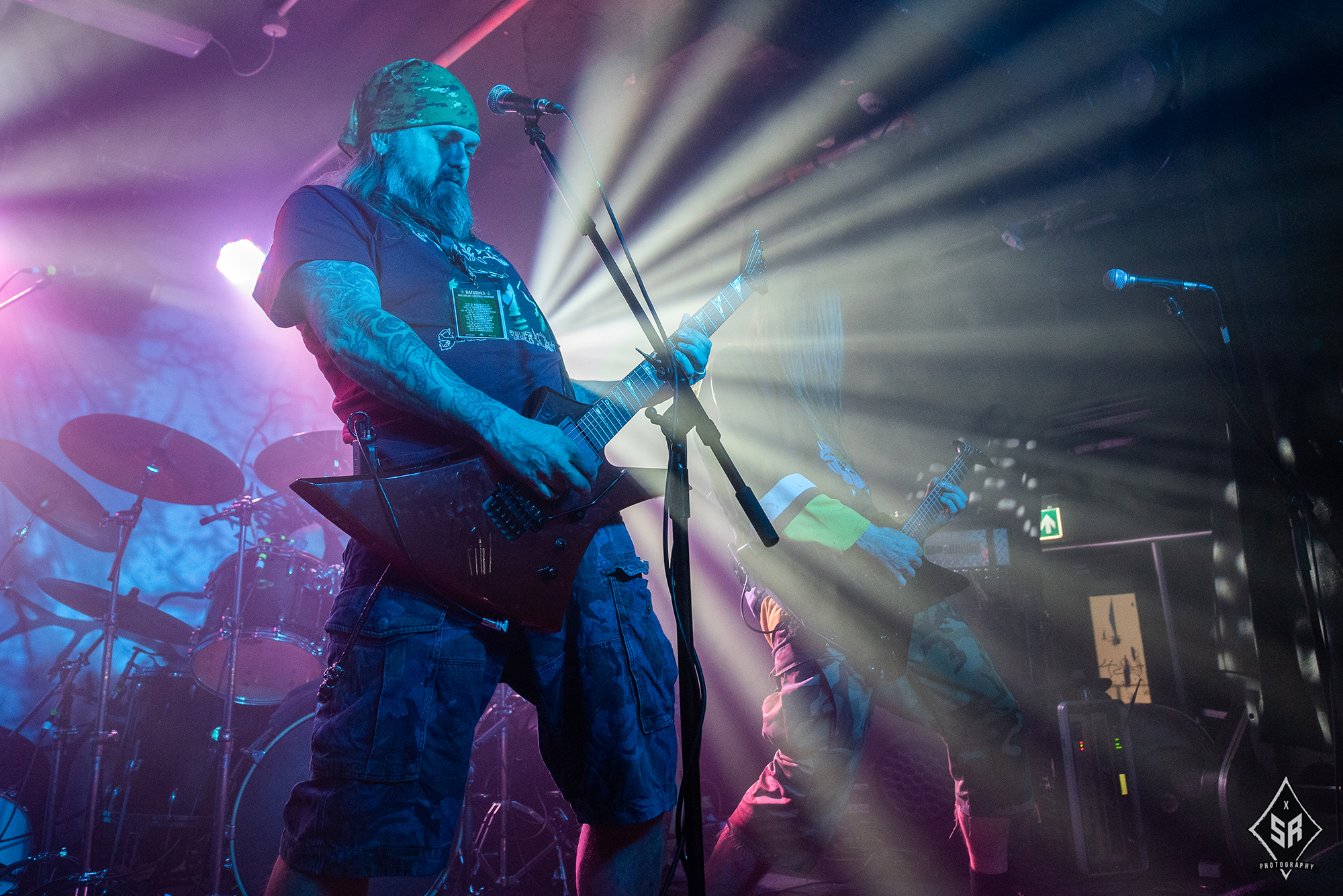 Given the occasion, a nicely packed crowd greets Danish quartet KONKHRA and thanks to their three plus decade experience, the band provide a suitable and punishing opening salvo to proceedings. Their trash meets death metal hybrid of a sound is warmly received by those in attendance at Manchester’s Academy 3 with Anders Lundemark‘s roaring vocals sounding clear as day and the neat interchanges with fellow guitarist Hakim enables the band’s riffing to cause many heads to bang along. And yet, for all the band do well, and there are numerous moments of quality, there are times where KONKHRA just sound formulaic. This might be down to the band’s lengthy time on stage, allowing a sense of rinse and repeat to establish a foothold and it beckons the question as to whether a shock and awe approach would have reaped greater rewards. However, despite the moments where they falter, on the whole, the Danes provide enough to kick off proceedings in a suitably strong manner.