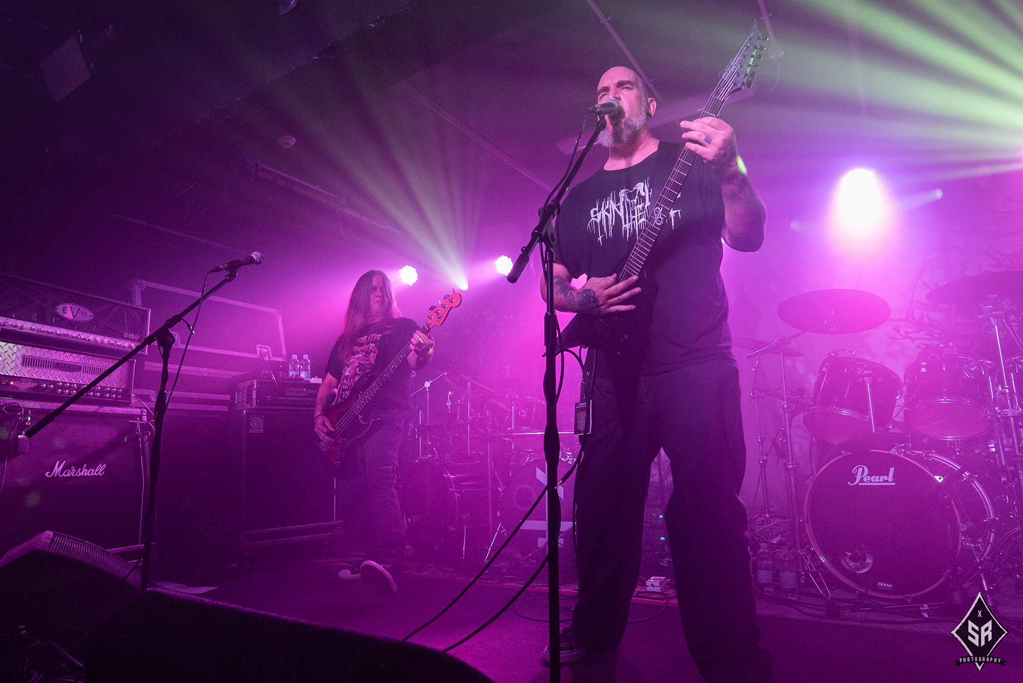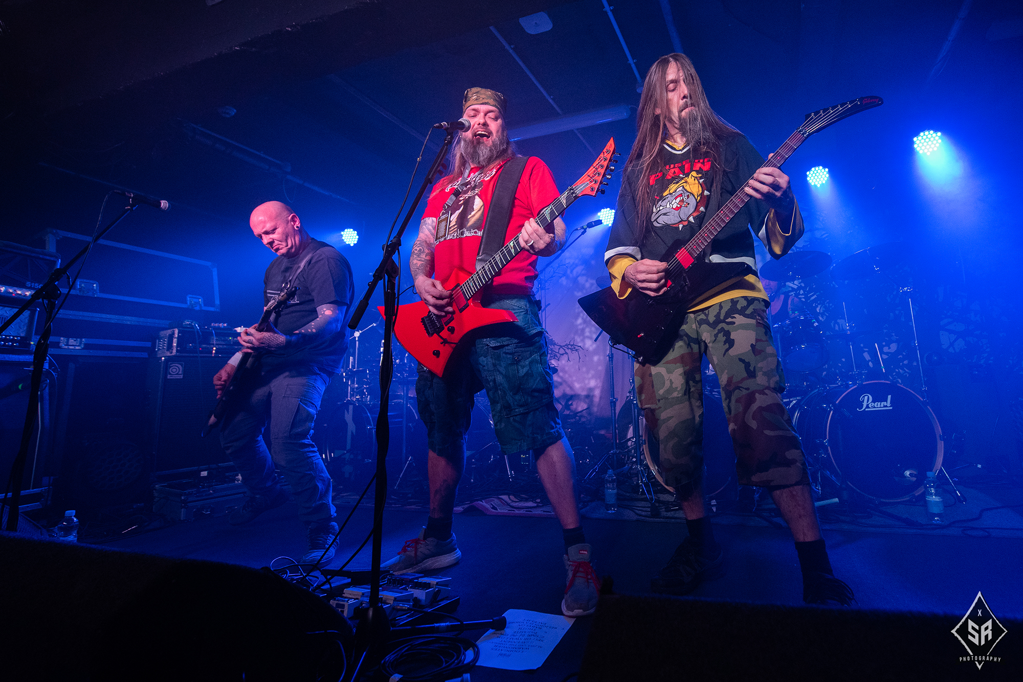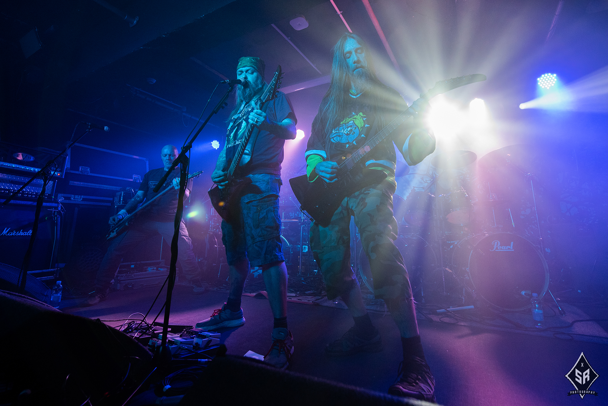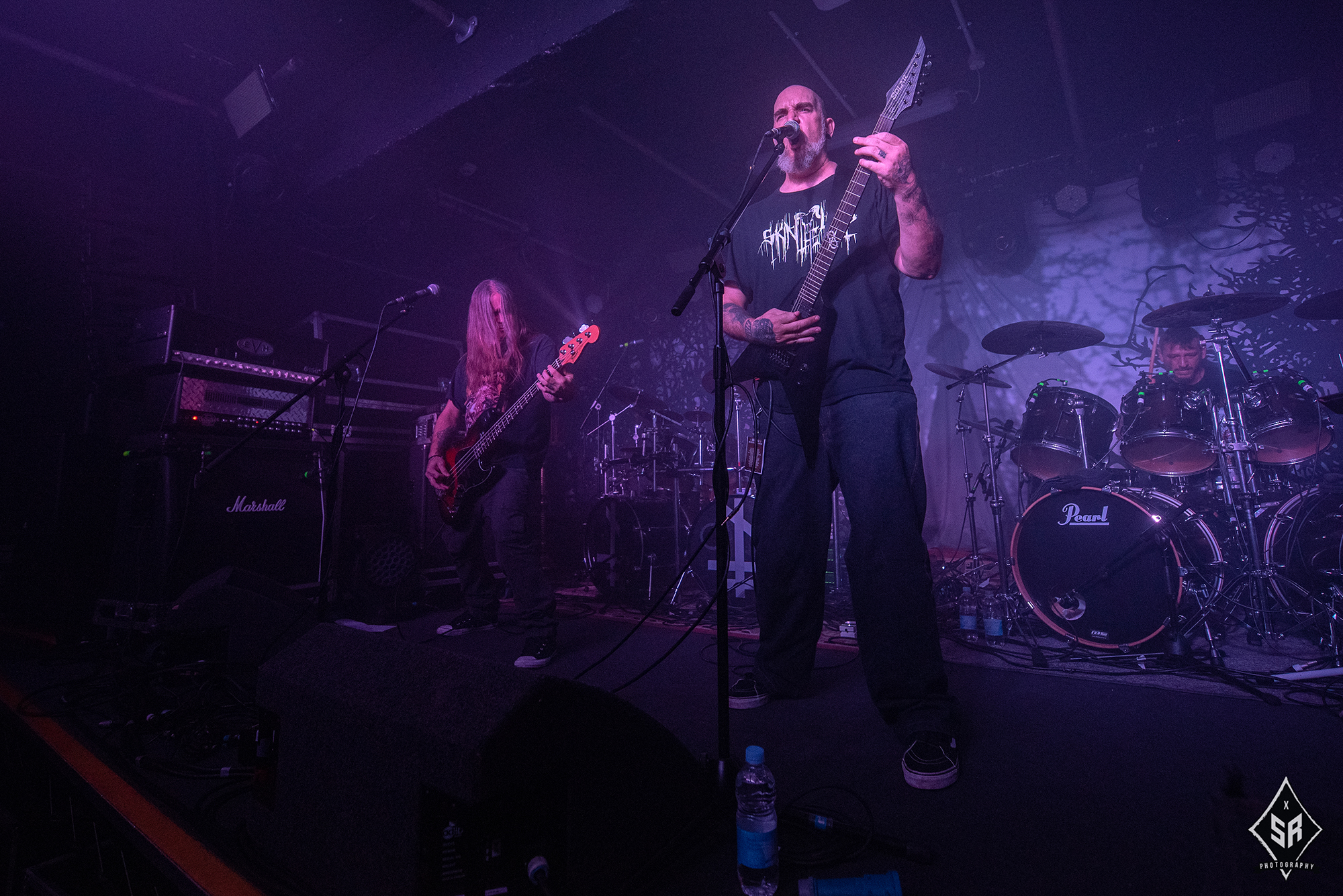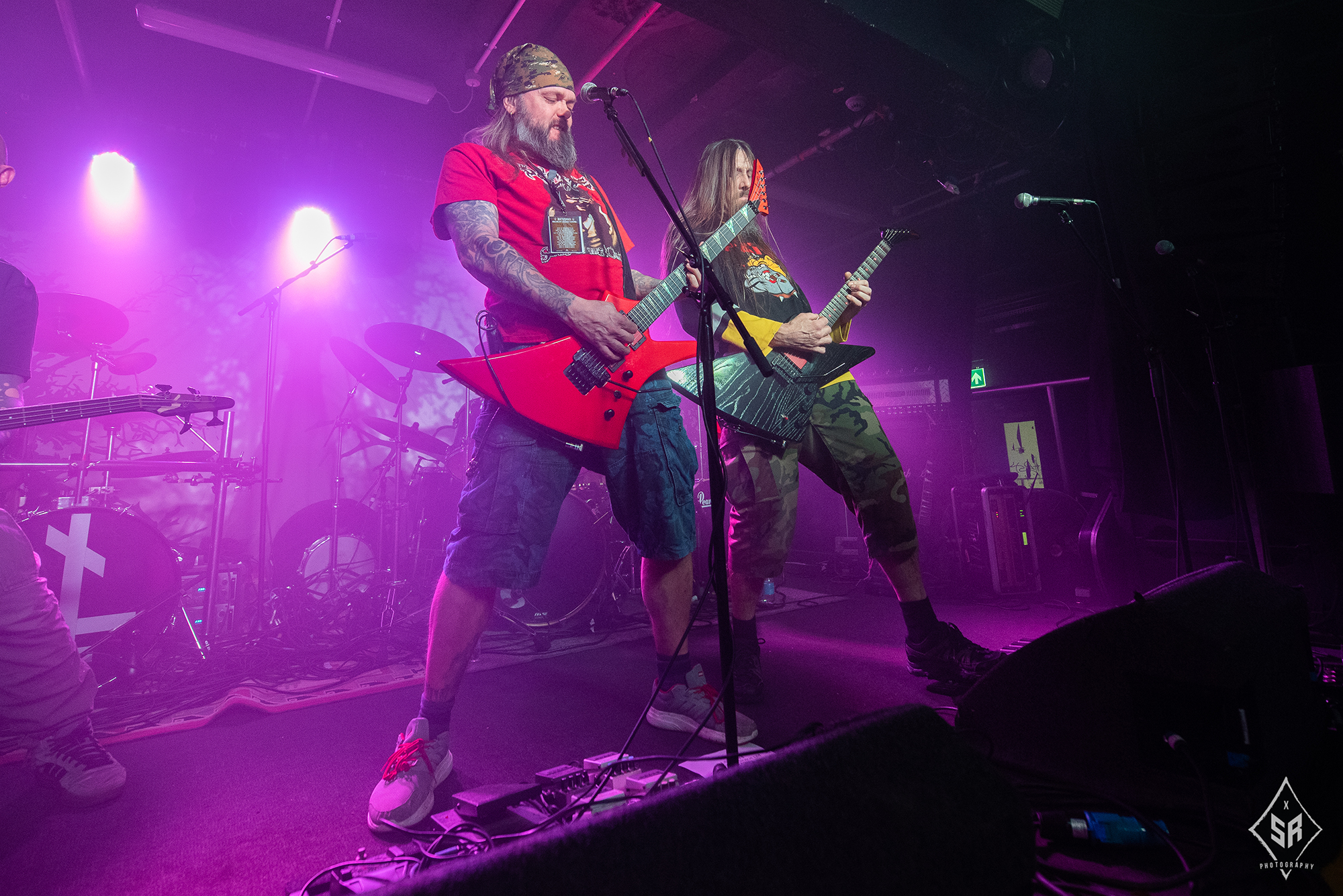 Given the occasion, a nicely packed crowd greets Danish quartet KONKHRA and thanks to their three plus decade experience, the band provide a suitable and punishing opening salvo to proceedings. Their trash meets death metal hybrid of a sound is warmly received by those in attendance at Manchester’s Academy 3 with Anders Lundemark‘s roaring vocals sounding clear as day and the neat interchanges with fellow guitarist Hakim enables the band’s riffing to cause many heads to bang along. And yet, for all the band do well, and there are numerous moments of quality, there are times where KONKHRA just sound formulaic. This might be down to the band’s lengthy time on stage, allowing a sense of rinse and repeat to establish a foothold and it beckons the question as to whether a shock and awe approach would have reaped greater rewards. However, despite the moments where they falter, on the whole, the Danes provide enough to kick off proceedings in a suitably strong manner.