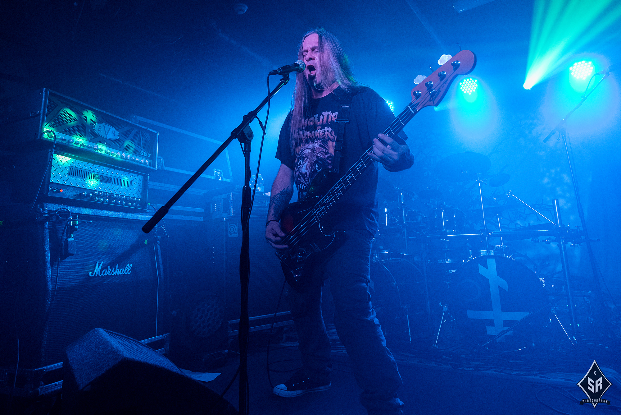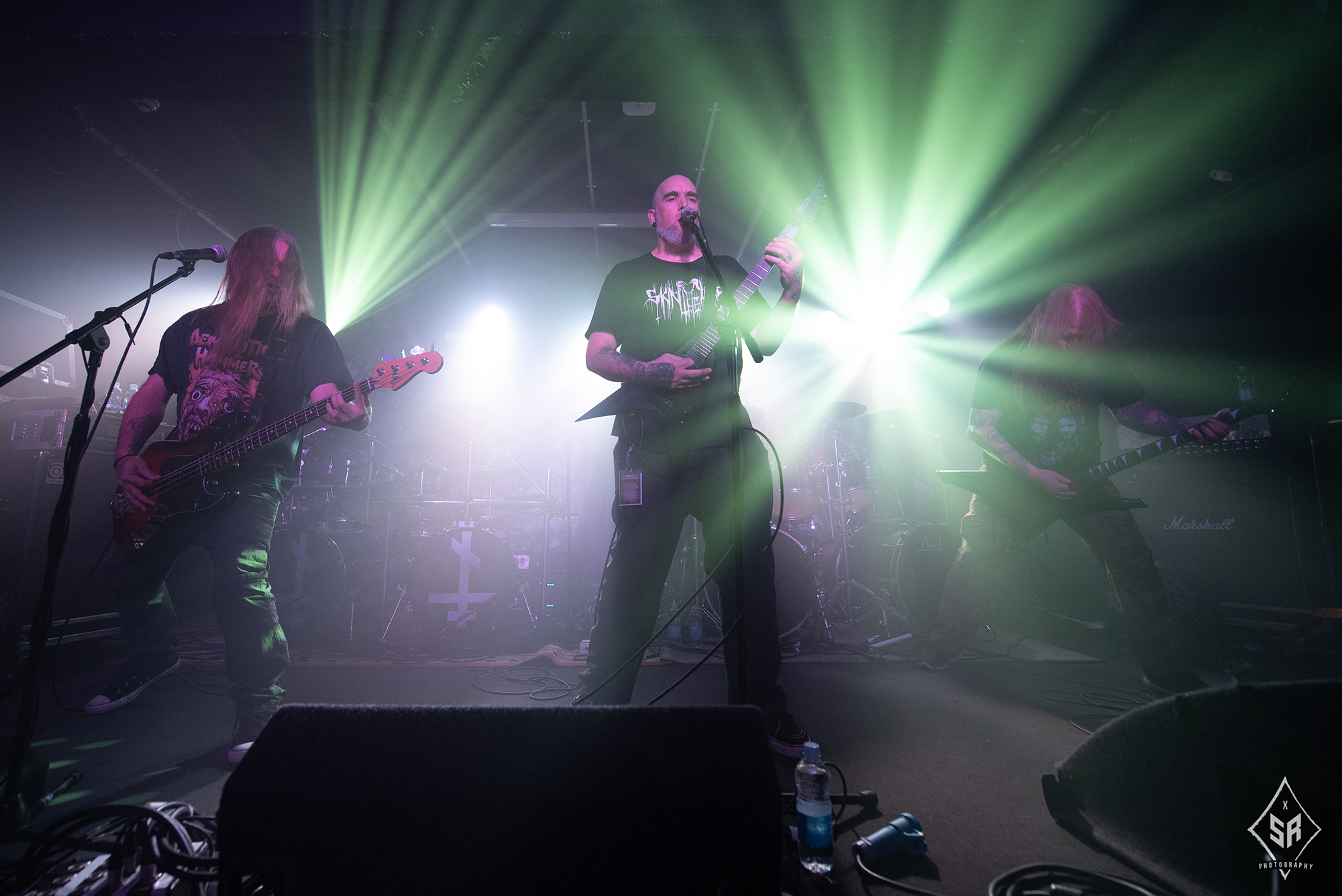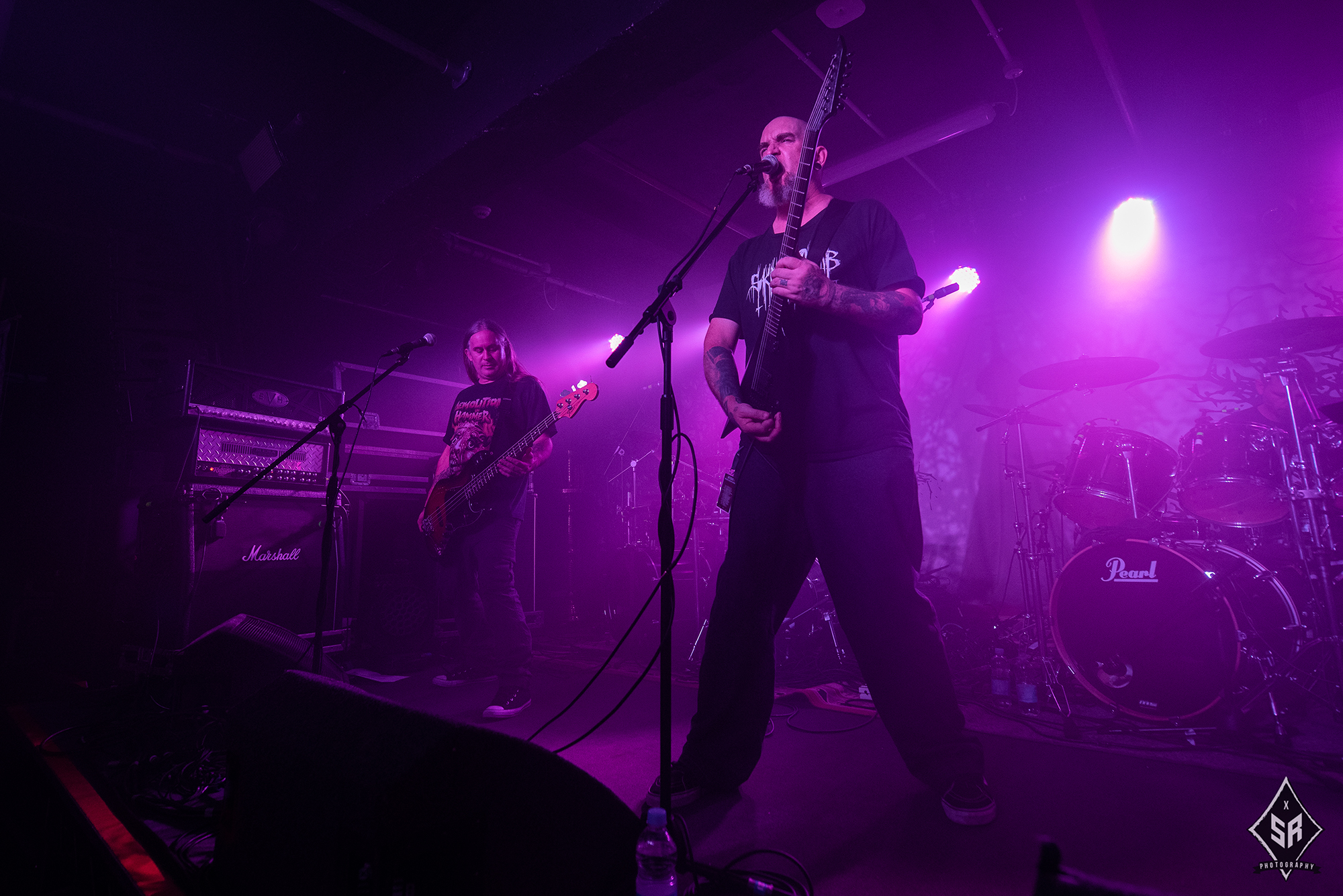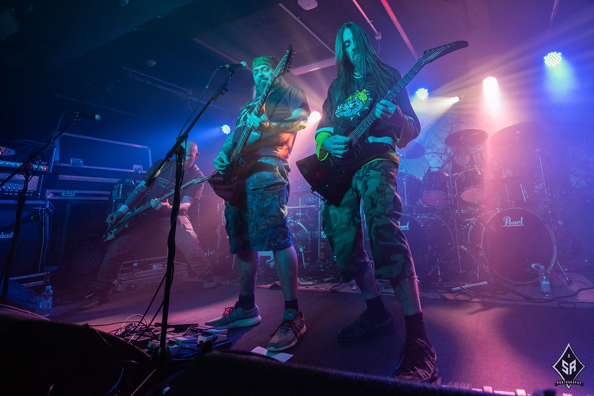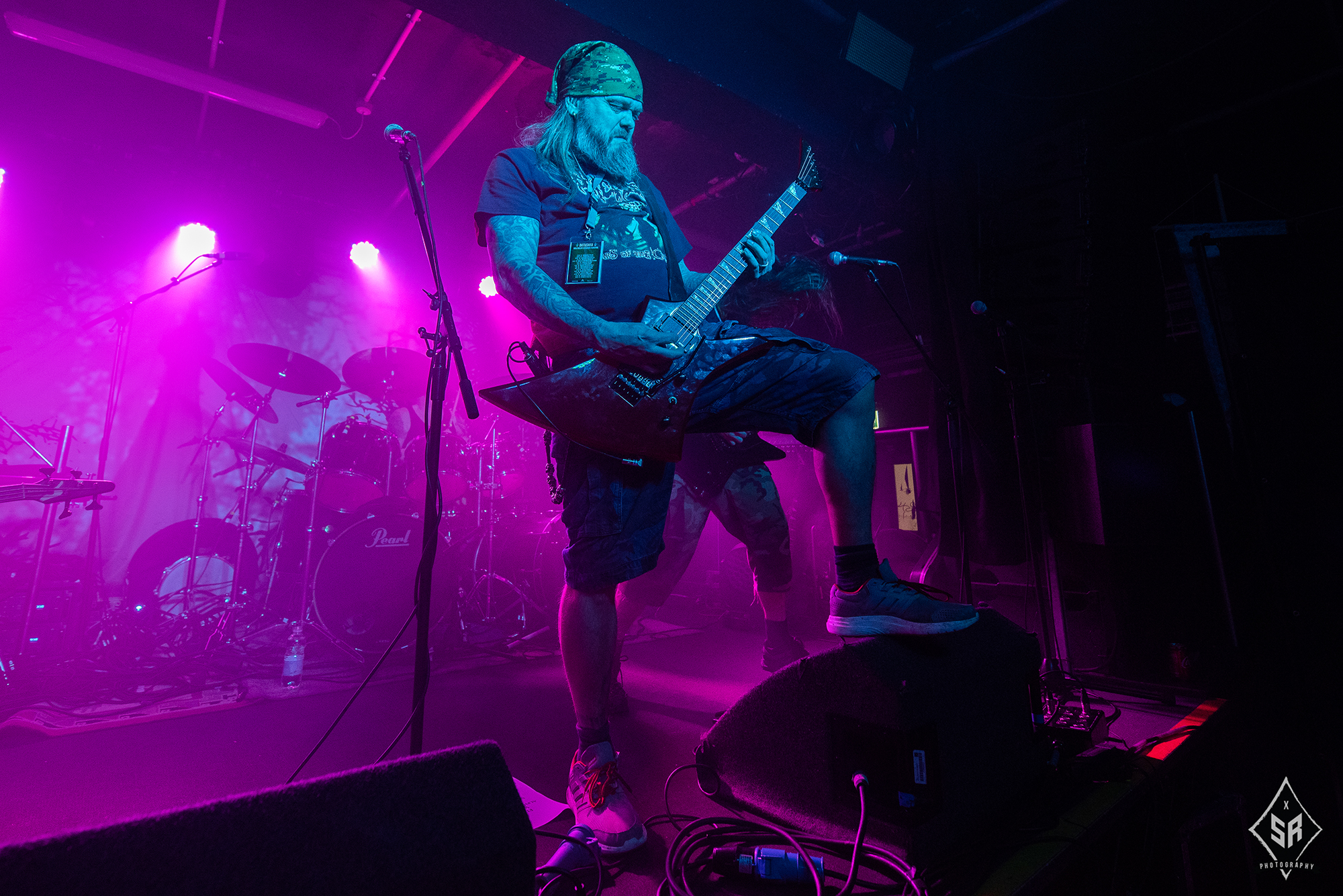Given the occasion, a nicely packed crowd greets Danish quartet KONKHRA and thanks to their three plus decade experience, the band provide a suitable and punishing opening salvo to proceedings. Their trash meets death metal hybrid of a sound is warmly received by those in attendance at Manchester’s Academy 3 with Anders Lundemark‘s roaring vocals sounding clear as day and the neat interchanges with fellow guitarist Hakim enables the band’s riffing to cause many heads to bang along. And yet, for all the band do well, and there are numerous moments of quality, there are times where KONKHRA just sound formulaic. This might be down to the band’s lengthy time on stage, allowing a sense of rinse and repeat to establish a foothold and it beckons the question as to whether a shock and awe approach would have reaped greater rewards. However, despite the moments where they falter, on the whole, the Danes provide enough to kick off proceedings in a suitably strong manner.