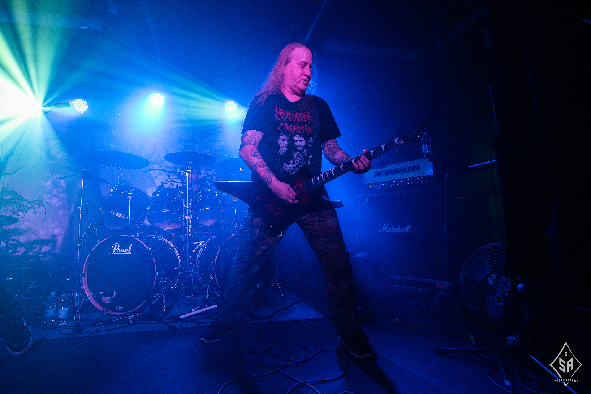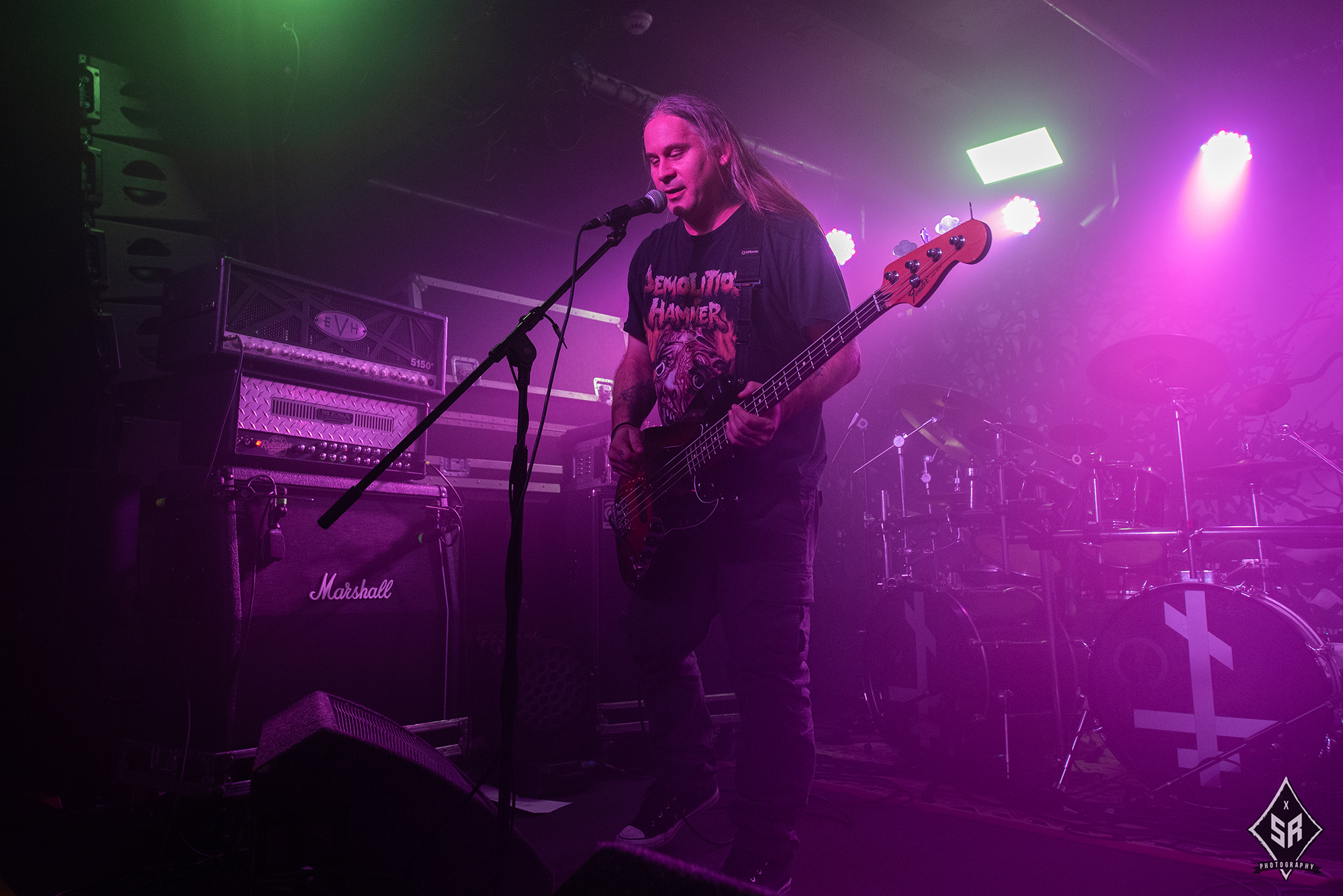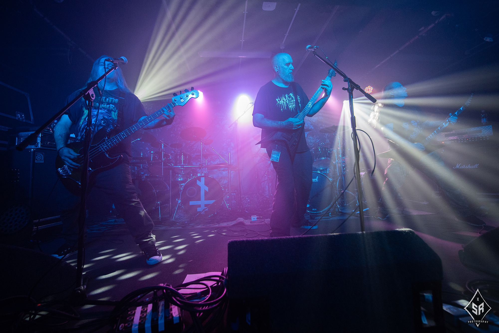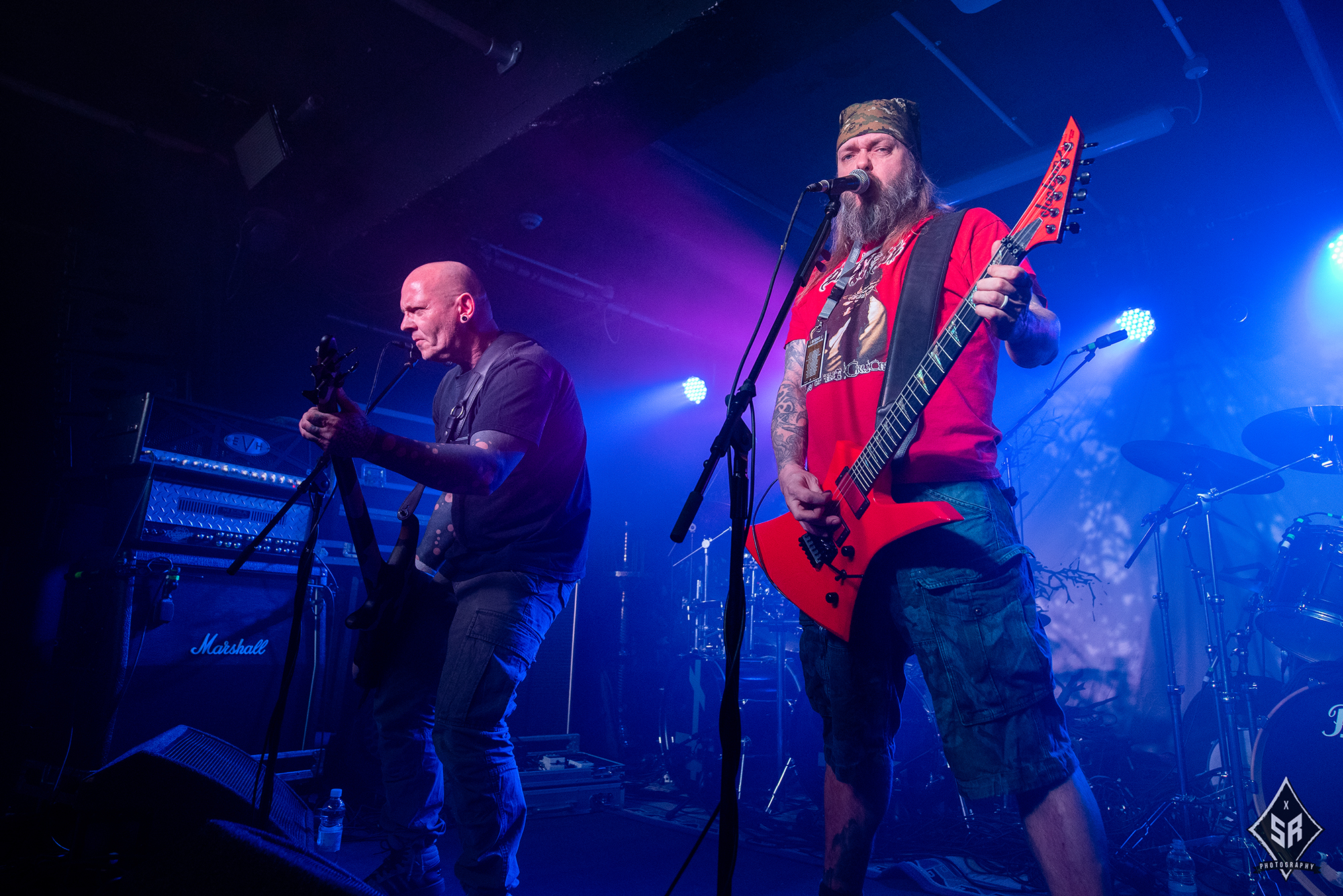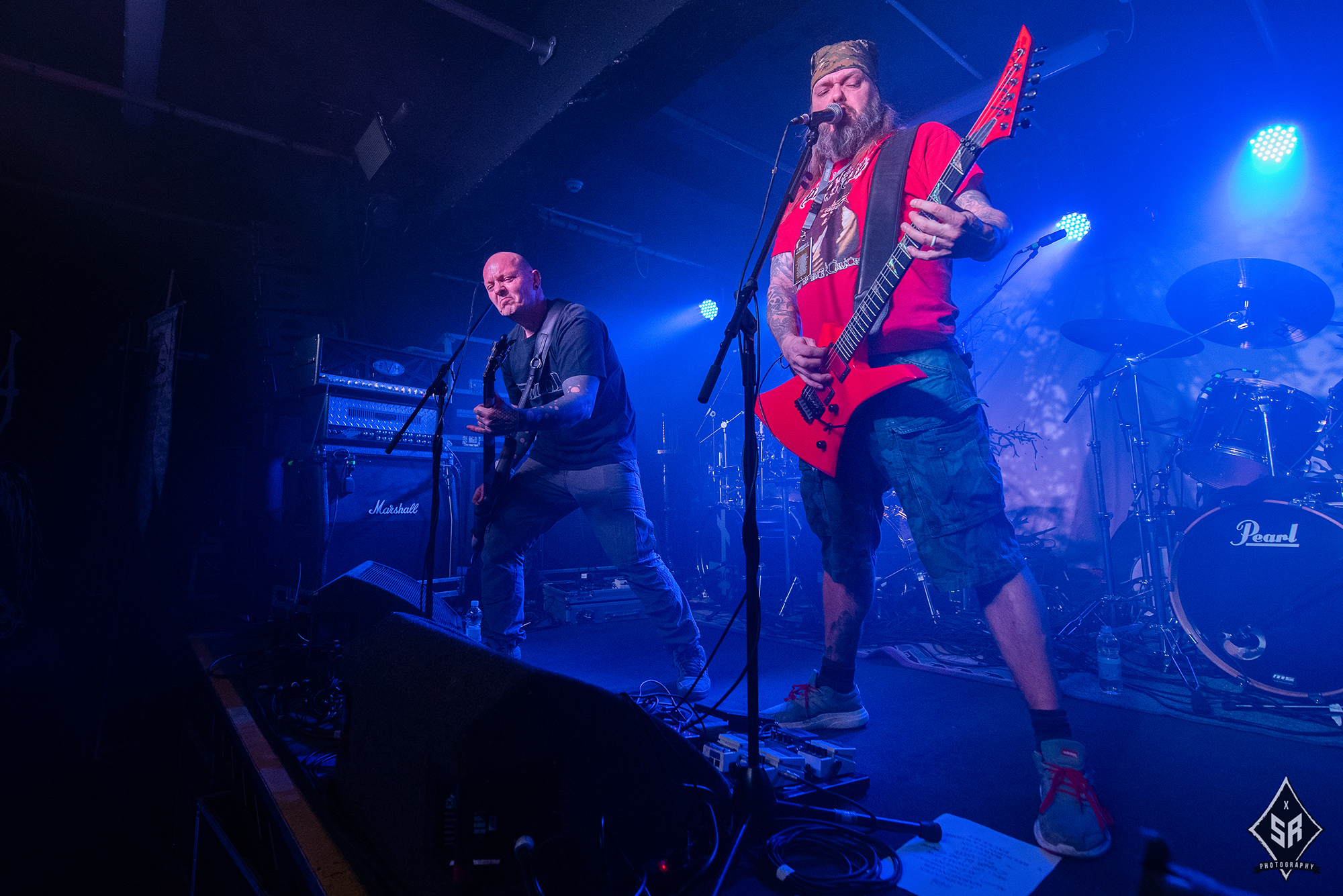 Given the occasion, a nicely packed crowd greets Danish quartet KONKHRA and thanks to their three plus decade experience, the band provide a suitable and punishing opening salvo to proceedings. Their trash meets death metal hybrid of a sound is warmly received by those in attendance at Manchester’s Academy 3 with Anders Lundemark‘s roaring vocals sounding clear as day and the neat interchanges with fellow guitarist Hakim enables the band’s riffing to cause many heads to bang along. And yet, for all the band do well, and there are numerous moments of quality, there are times where KONKHRA just sound formulaic. This might be down to the band’s lengthy time on stage, allowing a sense of rinse and repeat to establish a foothold and it beckons the question as to whether a shock and awe approach would have reaped greater rewards. However, despite the moments where they falter, on the whole, the Danes provide enough to kick off proceedings in a suitably strong manner.