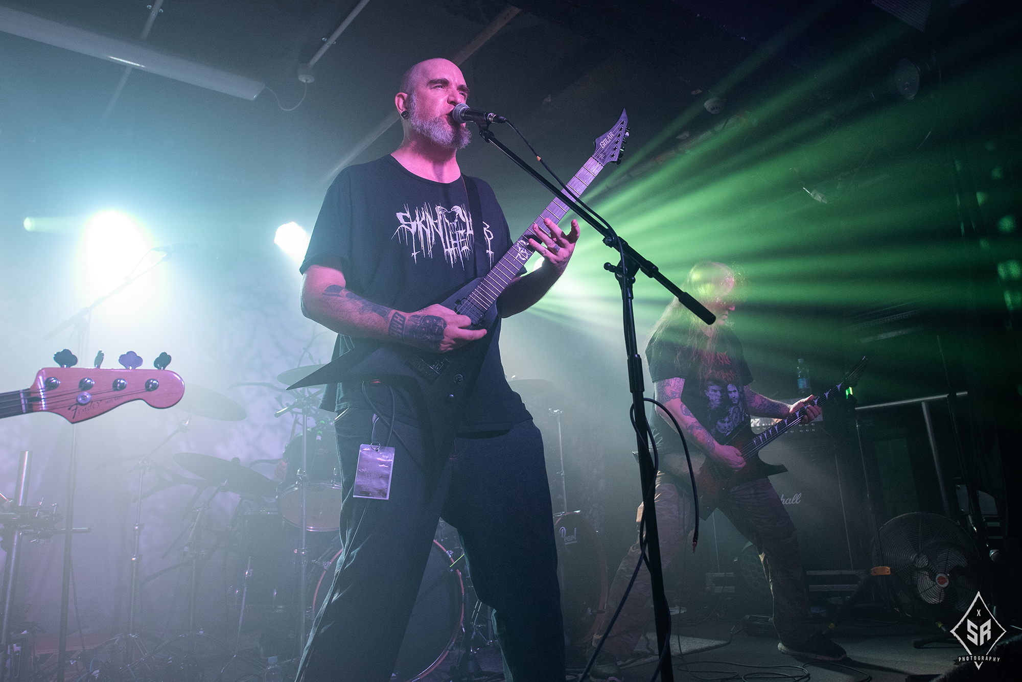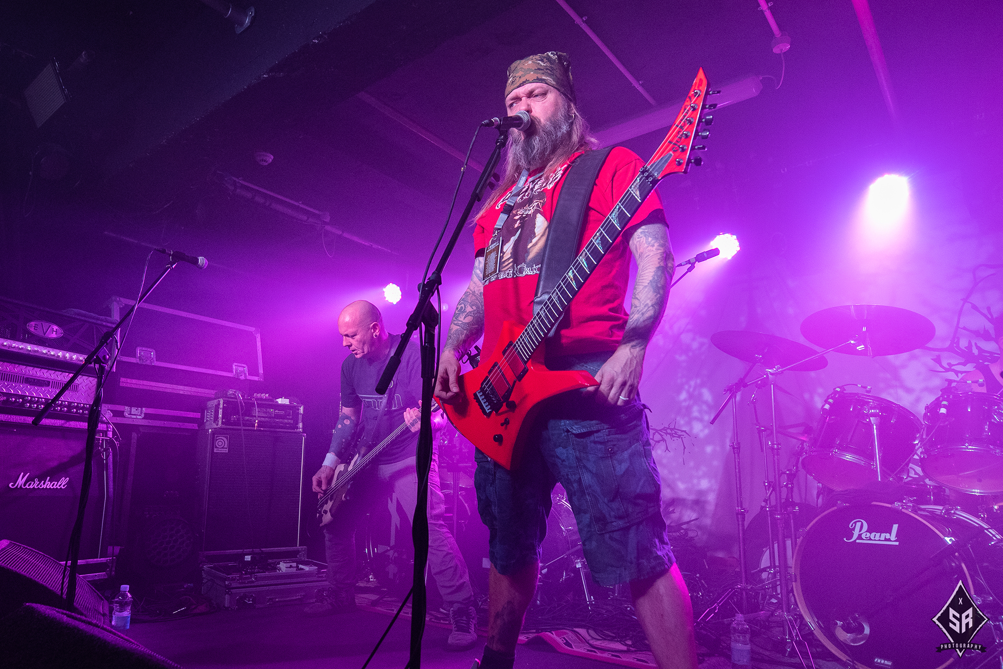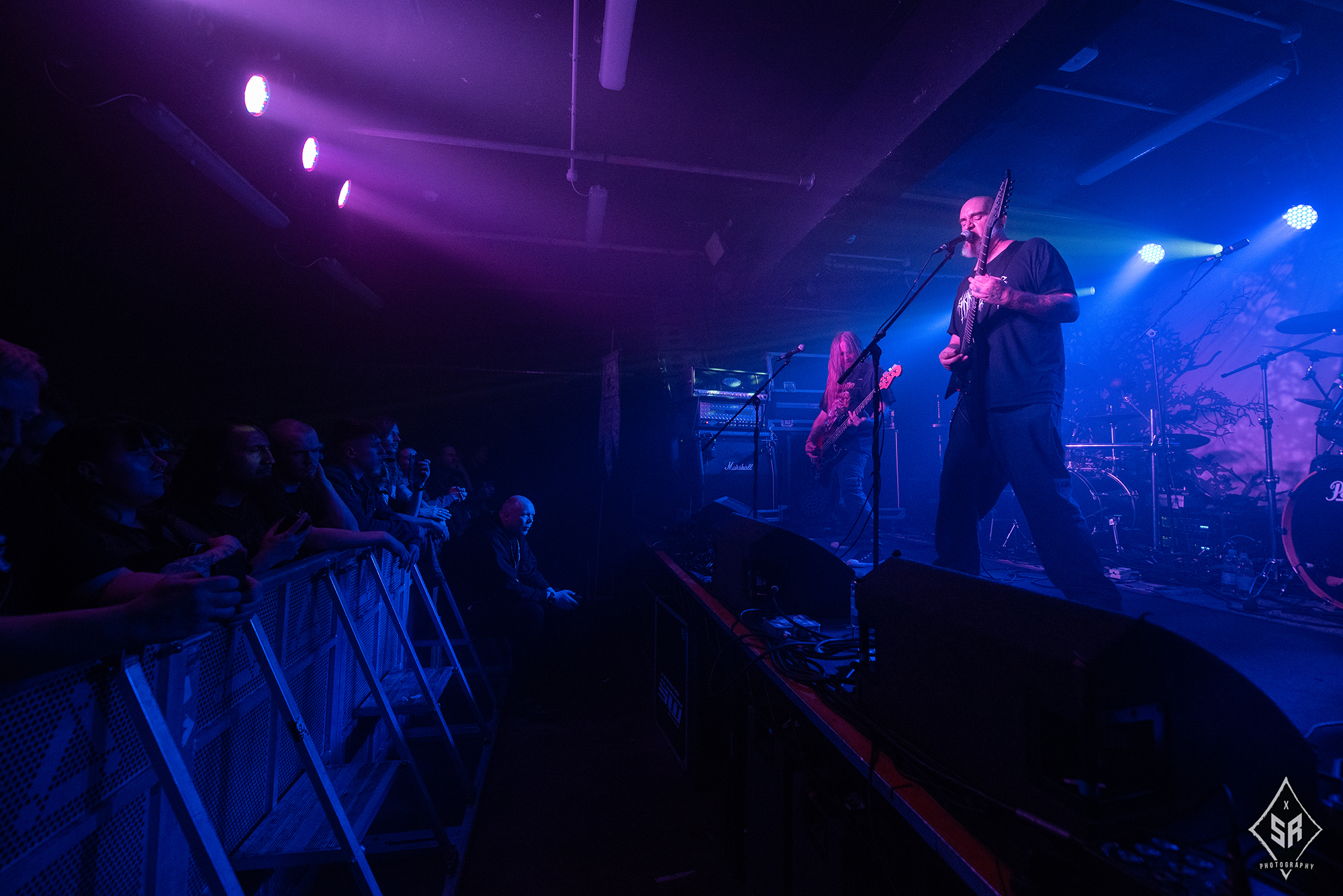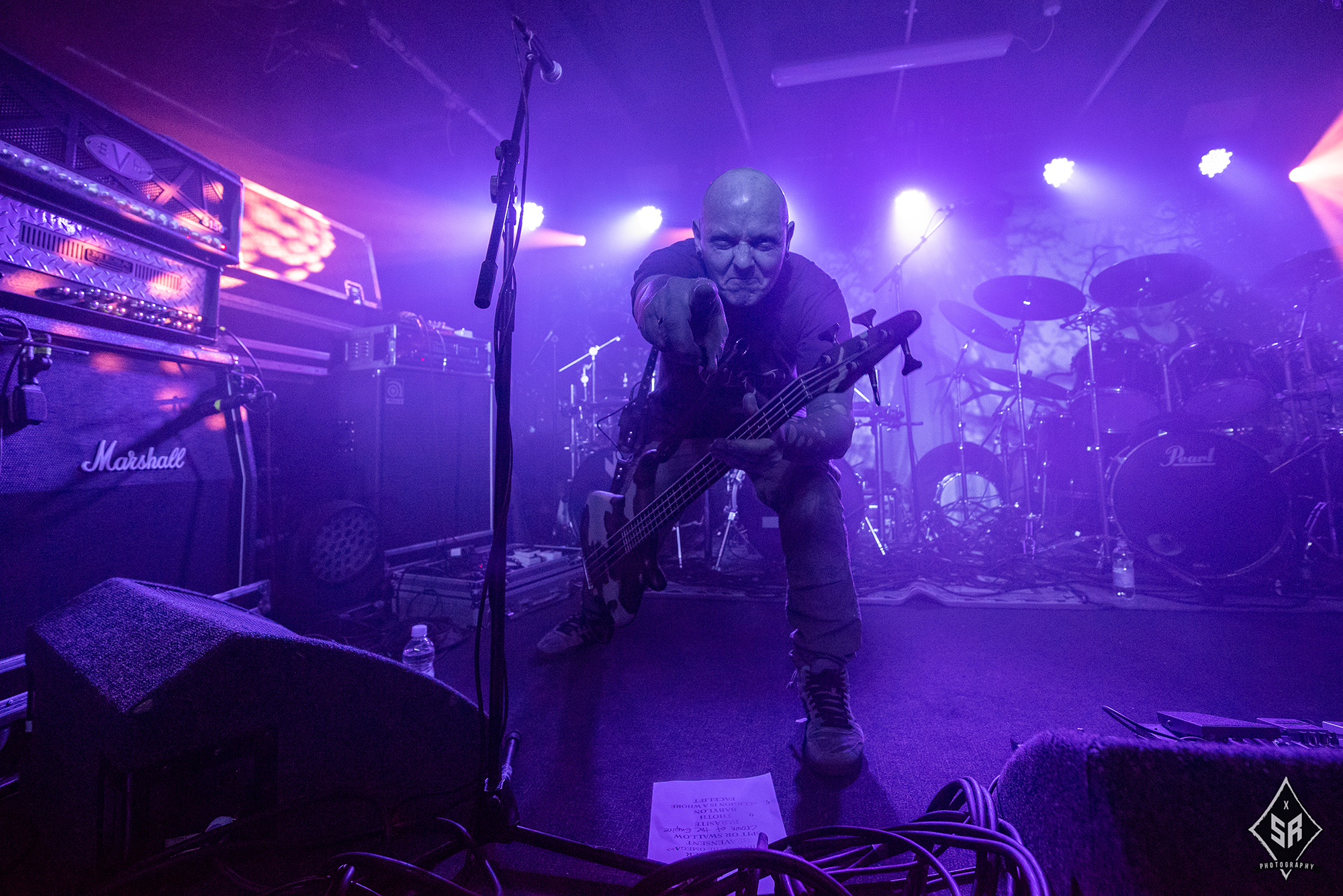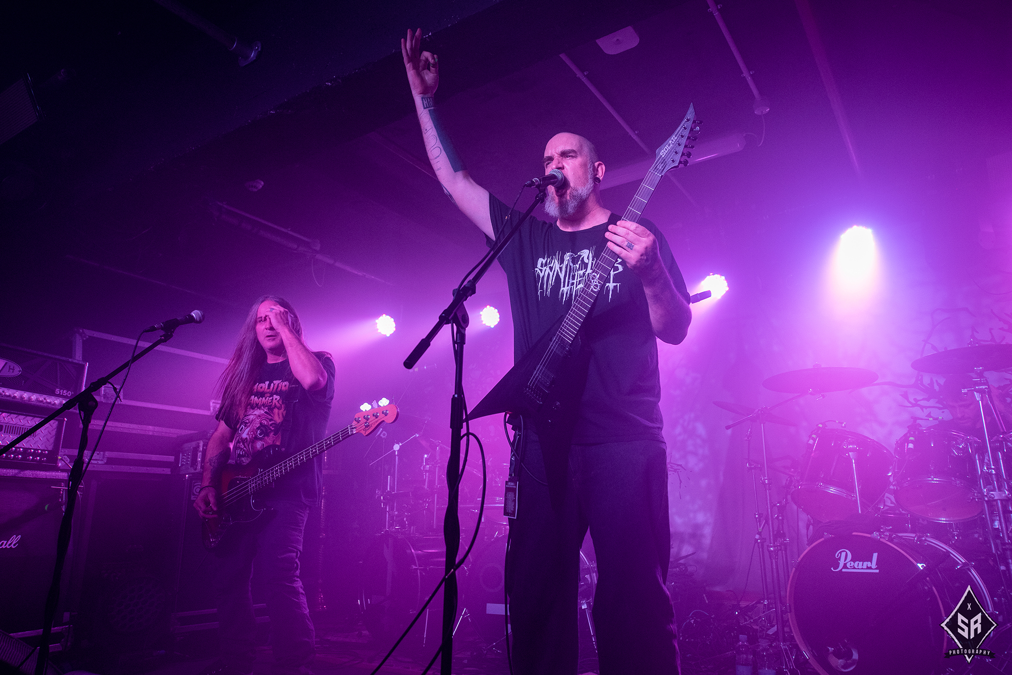 Given the occasion, a nicely packed crowd greets Danish quartet KONKHRA and thanks to their three plus decade experience, the band provide a suitable and punishing opening salvo to proceedings. Their trash meets death metal hybrid of a sound is warmly received by those in attendance at Manchester’s Academy 3 with Anders Lundemark‘s roaring vocals sounding clear as day and the neat interchanges with fellow guitarist Hakim enables the band’s riffing to cause many heads to bang along. And yet, for all the band do well, and there are numerous moments of quality, there are times where KONKHRA just sound formulaic. This might be down to the band’s lengthy time on stage, allowing a sense of rinse and repeat to establish a foothold and it beckons the question as to whether a shock and awe approach would have reaped greater rewards. However, despite the moments where they falter, on the whole, the Danes provide enough to kick off proceedings in a suitably strong manner.