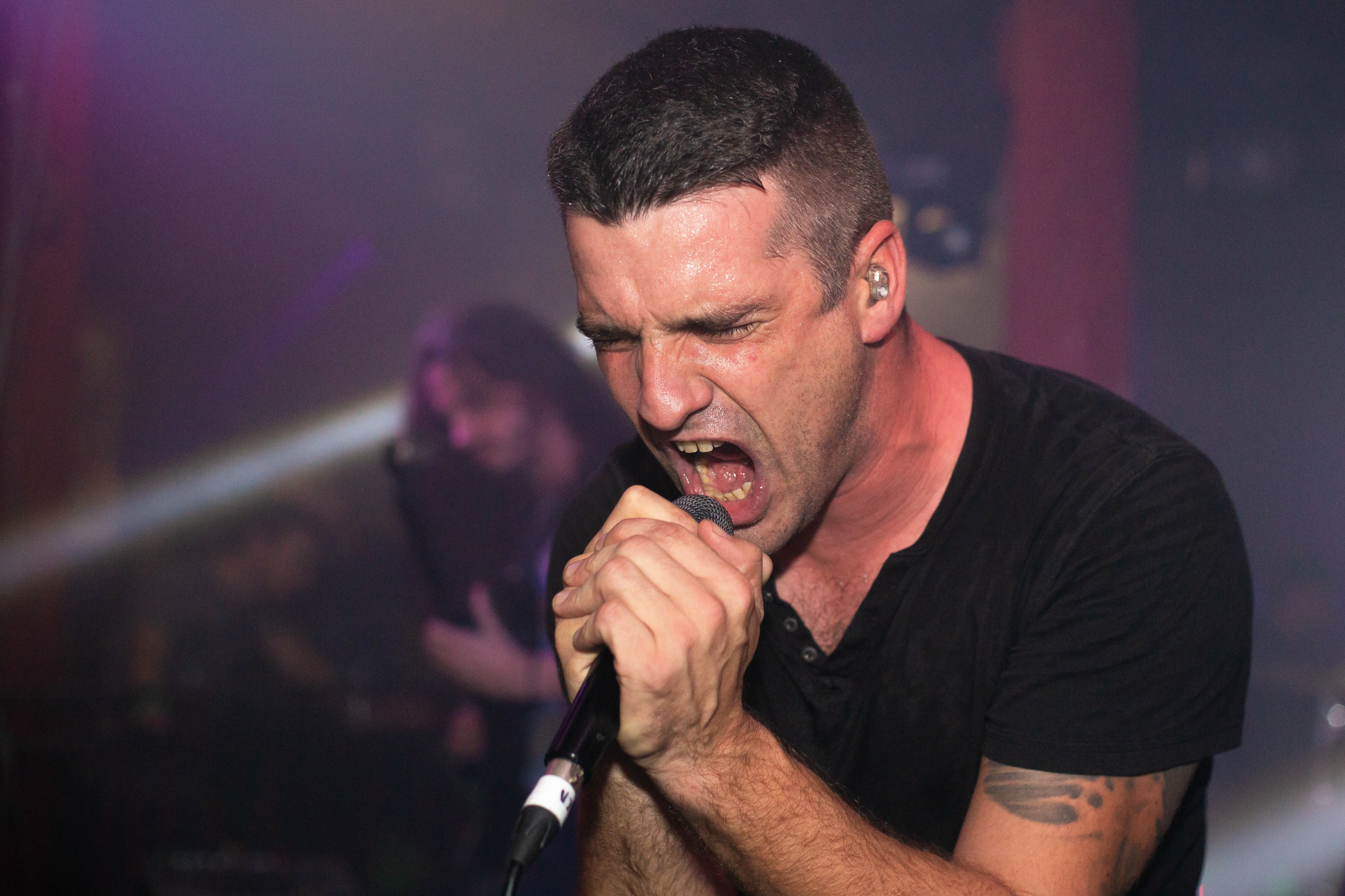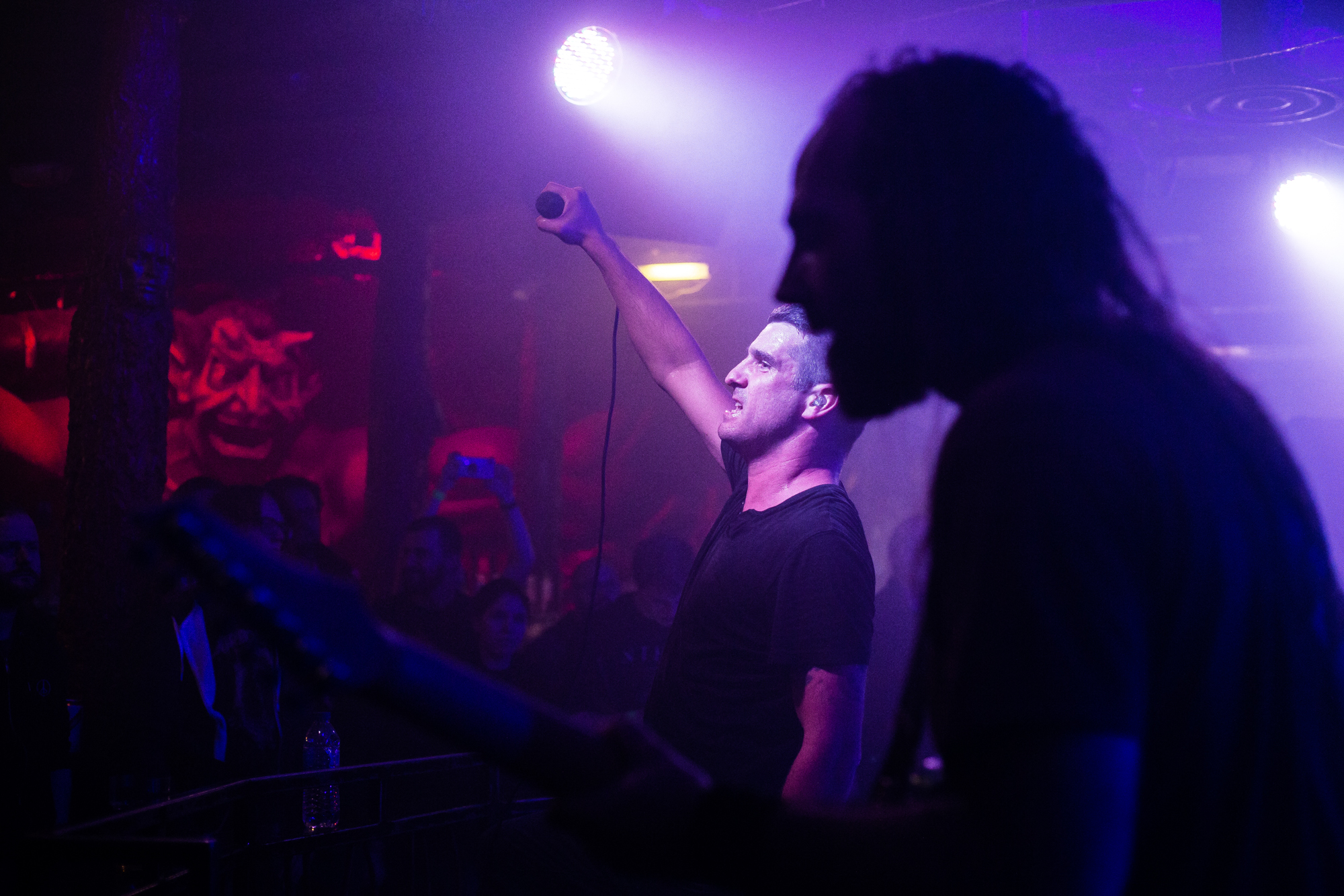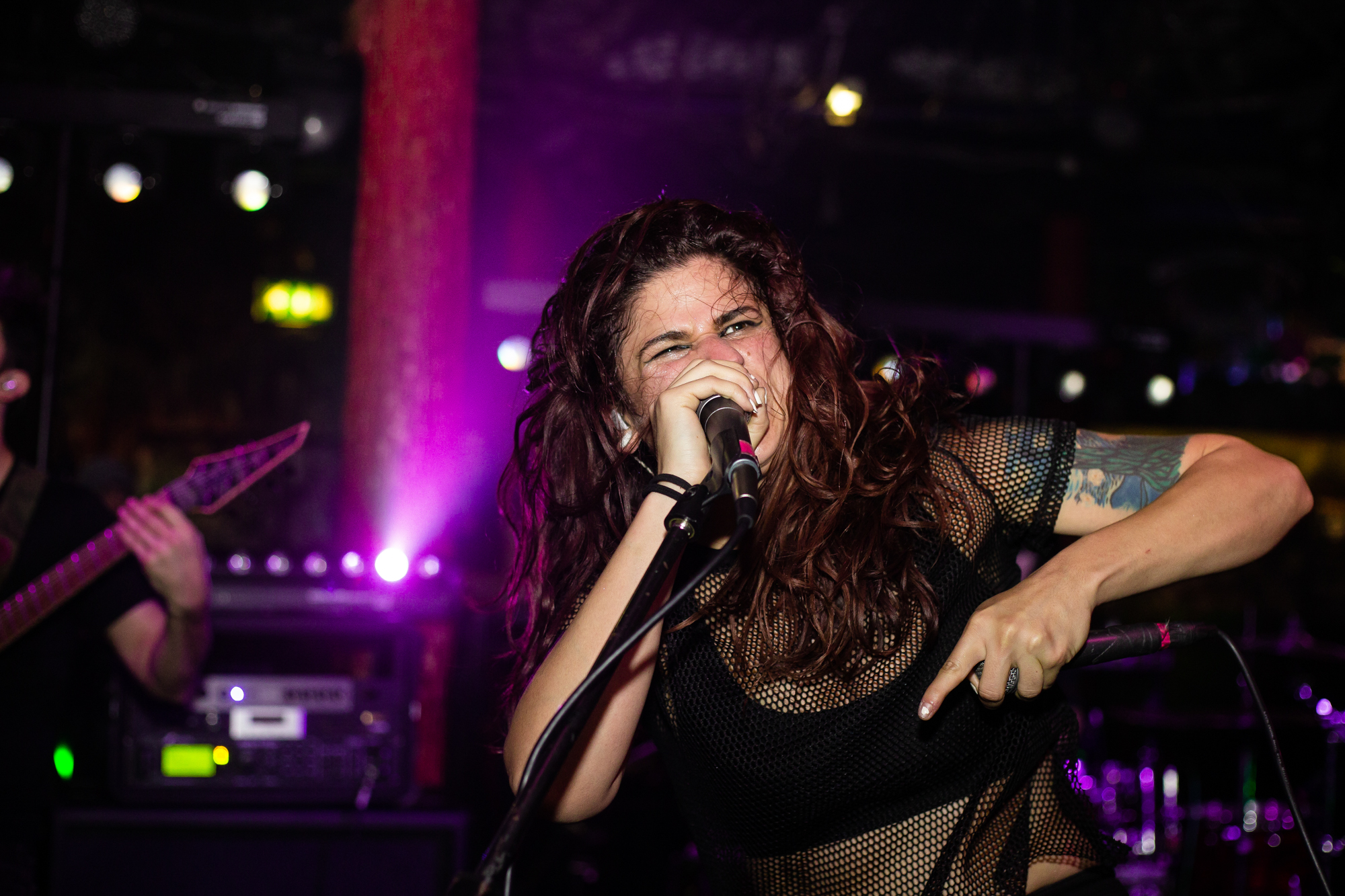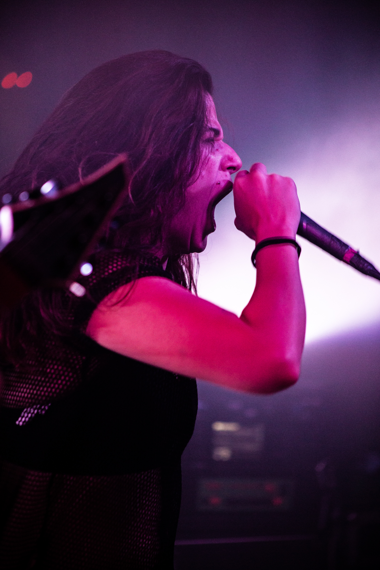 Sadly, the same can’t be said for ENTHEOS whose brand of technical death metal is plagued by an awful sound mix, perhaps enhanced by the central location of the stage that left those not stood front and centre to the band being hit full-on. What follows is a performance that is completely awash with noise from Navene Koperweis‘ drumming and muddy riffs that are completely overbearing. Charney Crabb tries to make the best of a bad situation by displaying an energetic stage presence, regularly climbing the barricade to unleash her vocals and interacting with the crowd (generating laughs as she comments on the venue’s decor), but all too often, her guttural snarls are lost in the mix. When the technical issues ease in moments throughout the set, ENTHEOS show glimpses of their quality with The World Without Us proving to be the highlight in the performance as the execution is pin-point precise. Regardless of these moments though, it did little to render the situation and instead unfortunately, the performance left a lot to be desired.