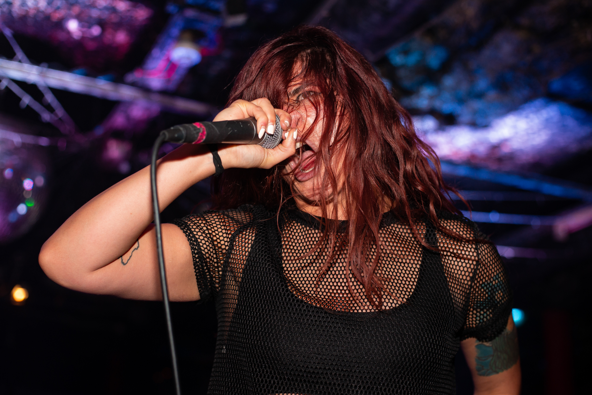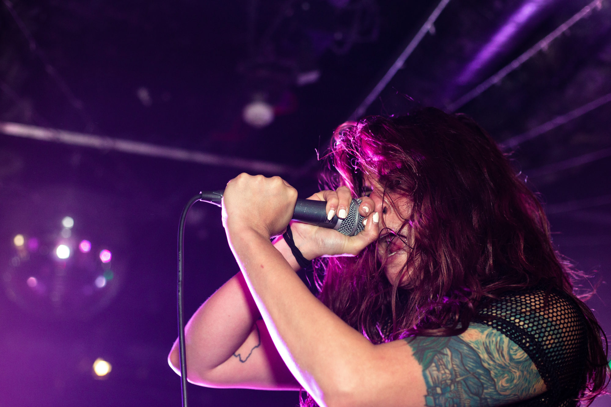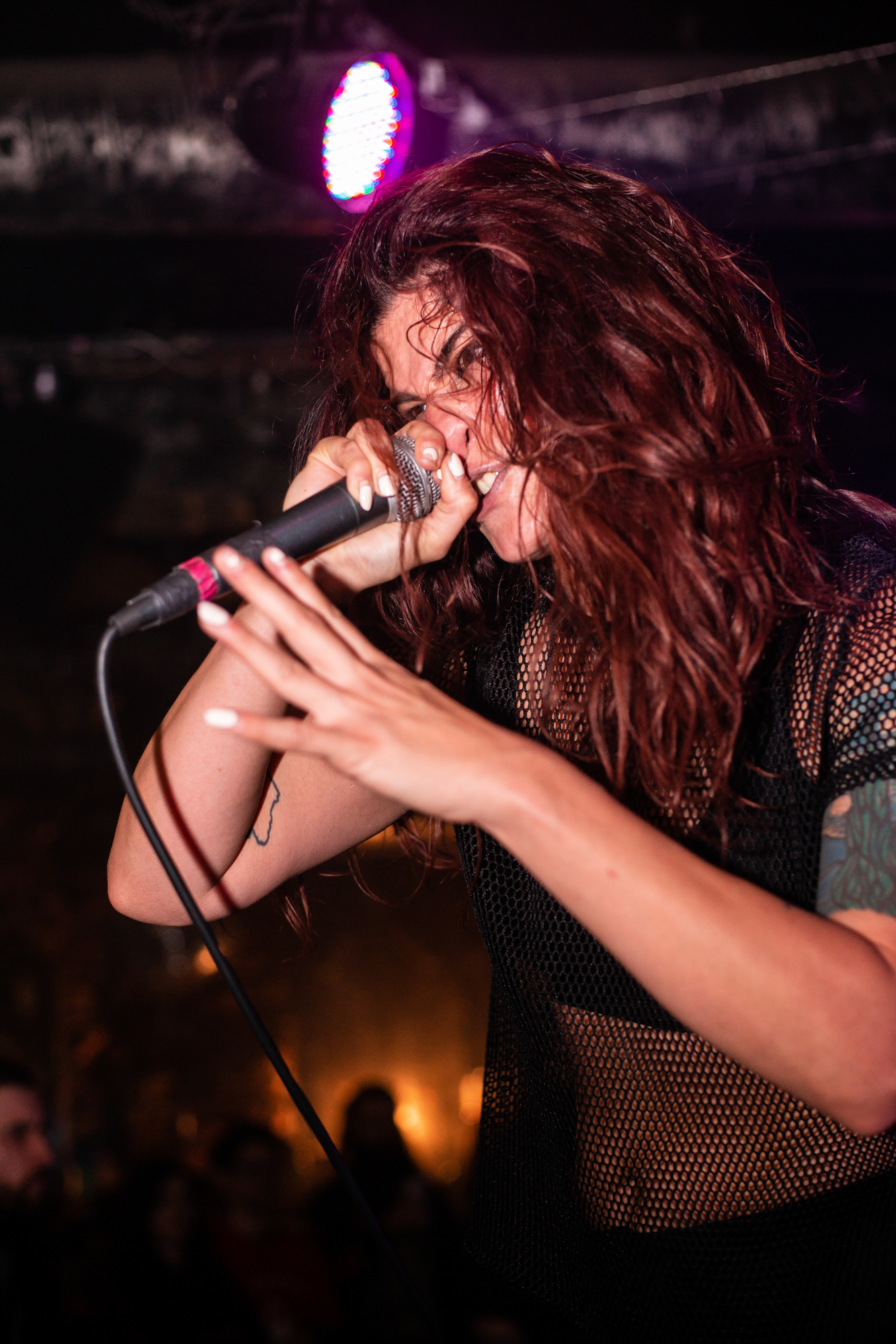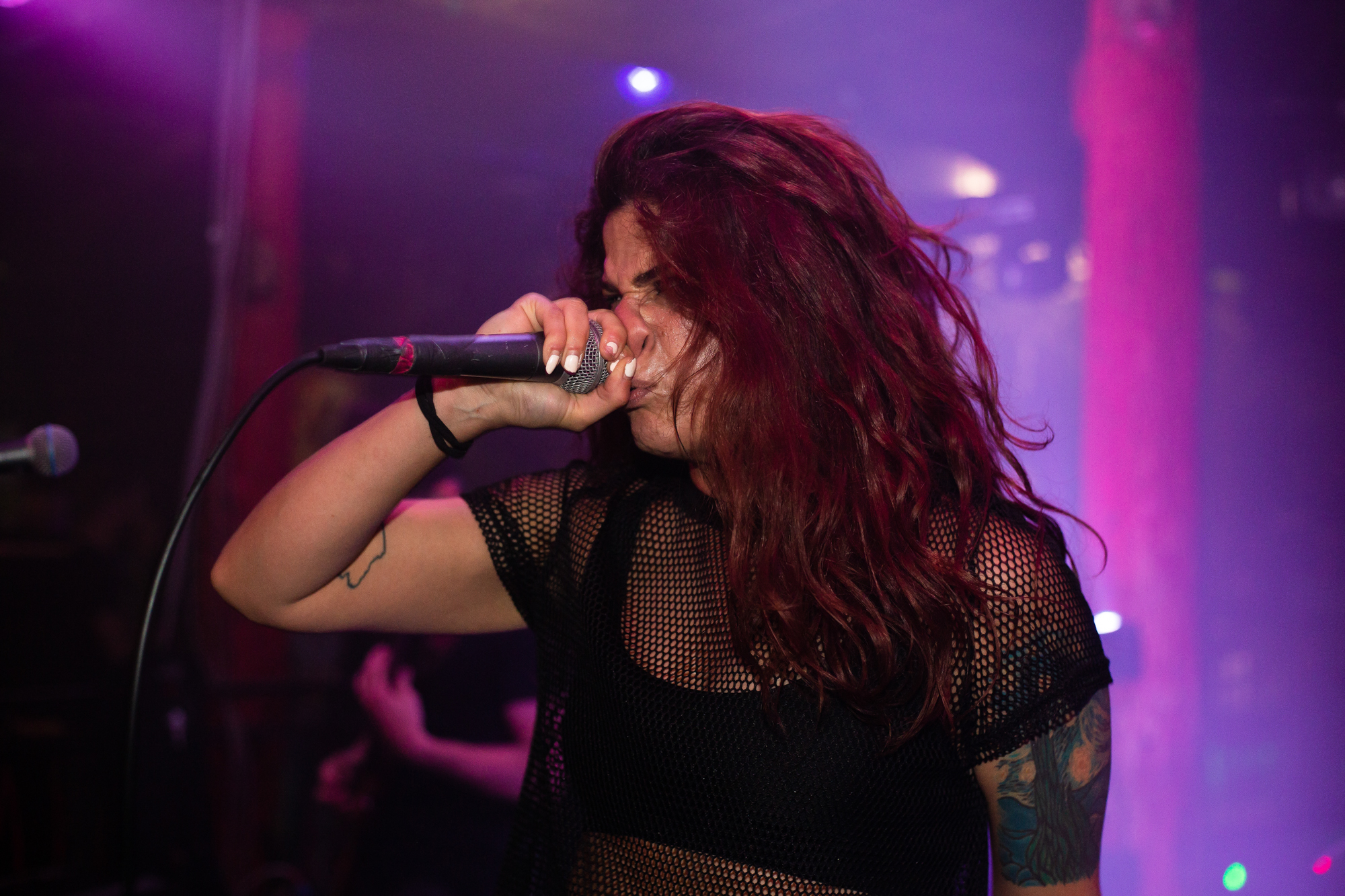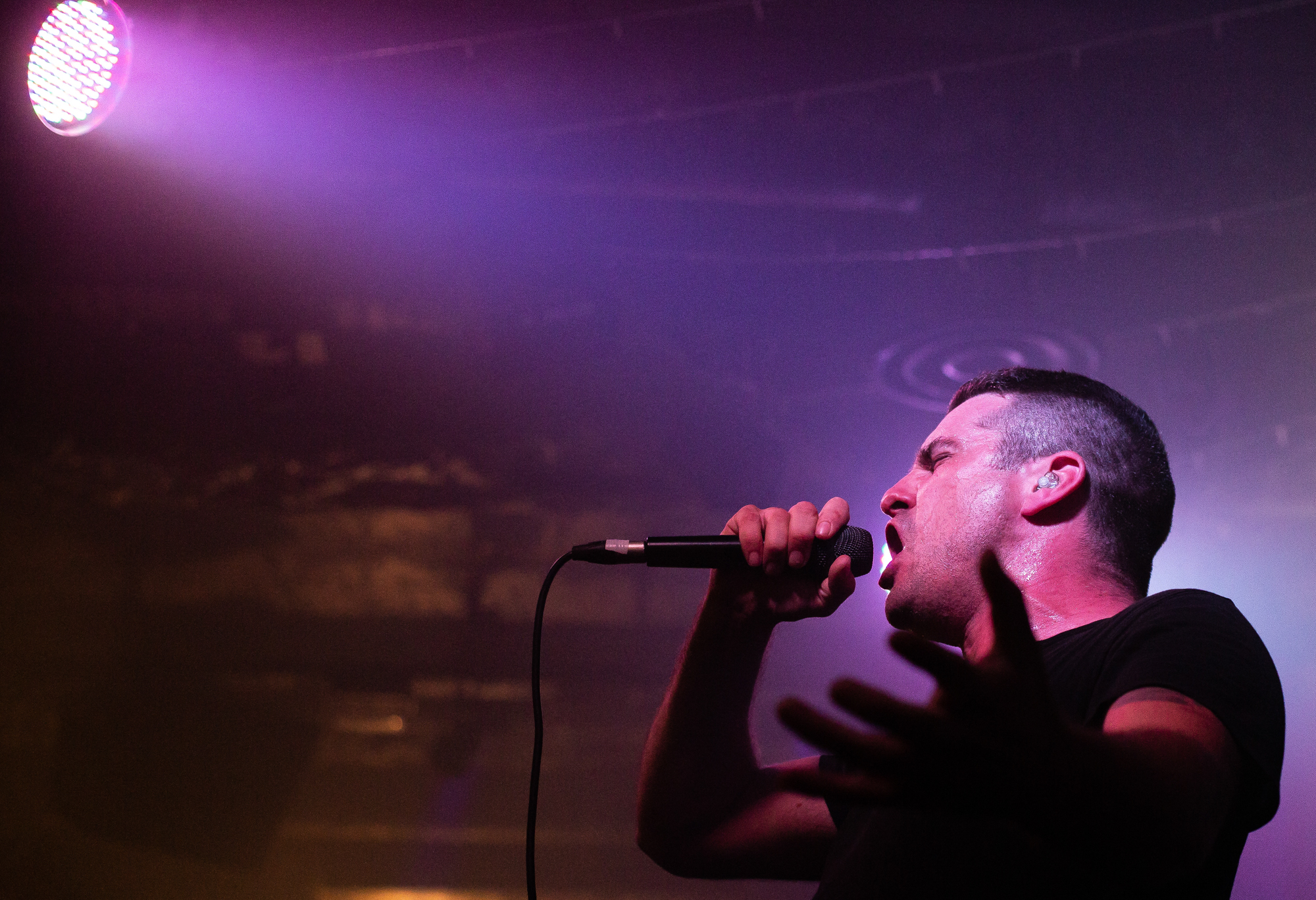 Sadly, the same can’t be said for ENTHEOS whose brand of technical death metal is plagued by an awful sound mix, perhaps enhanced by the central location of the stage that left those not stood front and centre to the band being hit full-on. What follows is a performance that is completely awash with noise from Navene Koperweis‘ drumming and muddy riffs that are completely overbearing. Charney Crabb tries to make the best of a bad situation by displaying an energetic stage presence, regularly climbing the barricade to unleash her vocals and interacting with the crowd (generating laughs as she comments on the venue’s decor), but all too often, her guttural snarls are lost in the mix. When the technical issues ease in moments throughout the set, ENTHEOS show glimpses of their quality with The World Without Us proving to be the highlight in the performance as the execution is pin-point precise. Regardless of these moments though, it did little to render the situation and instead unfortunately, the performance left a lot to be desired.