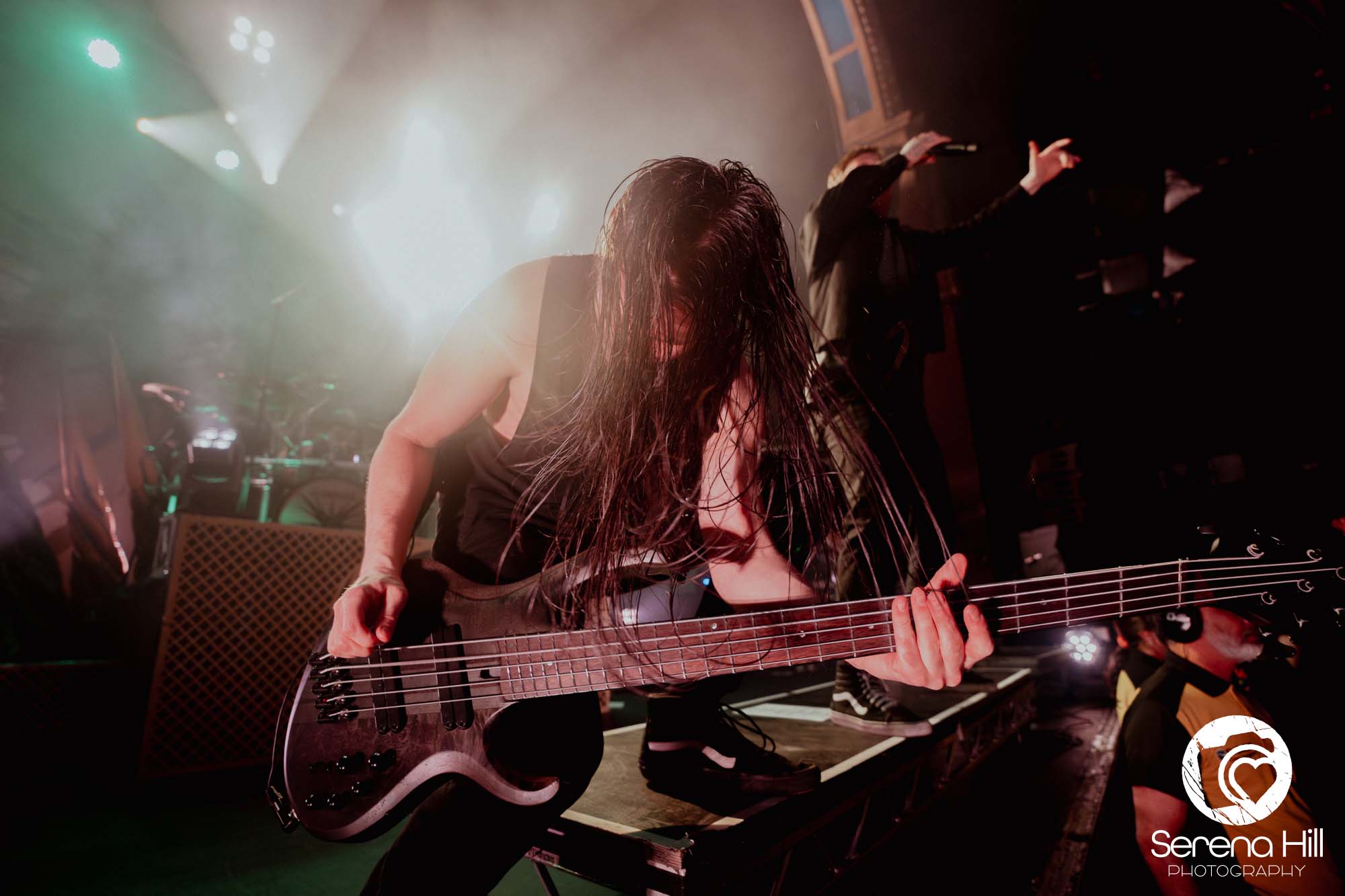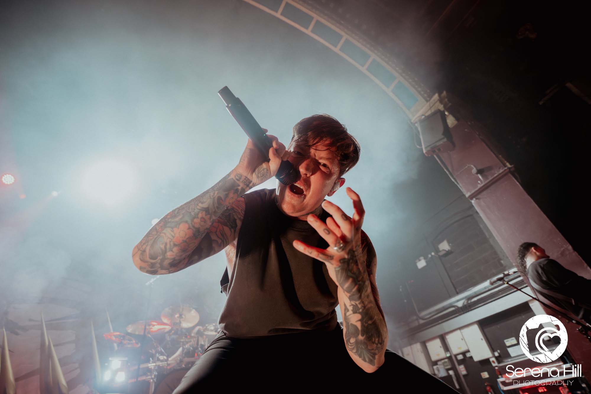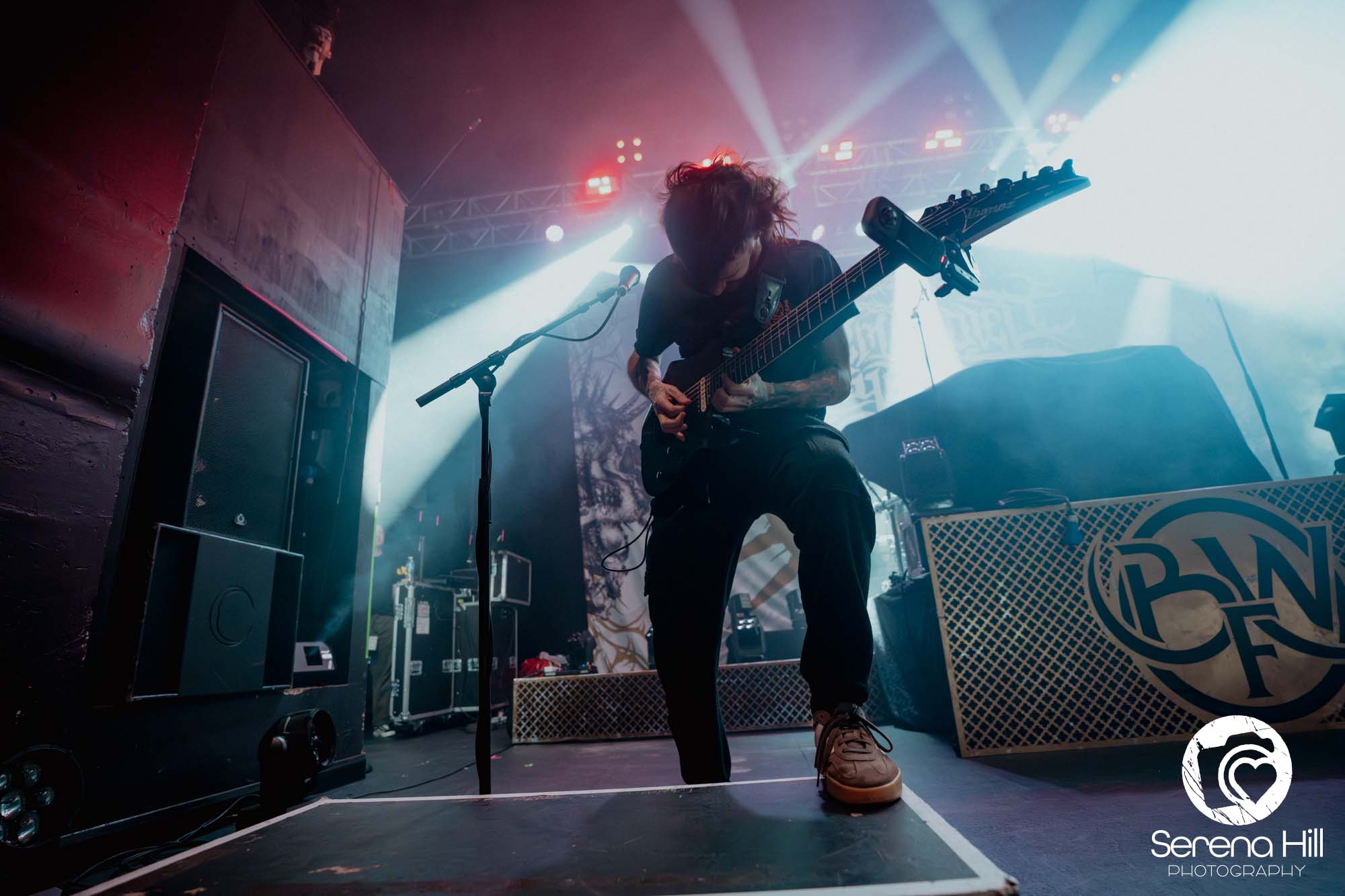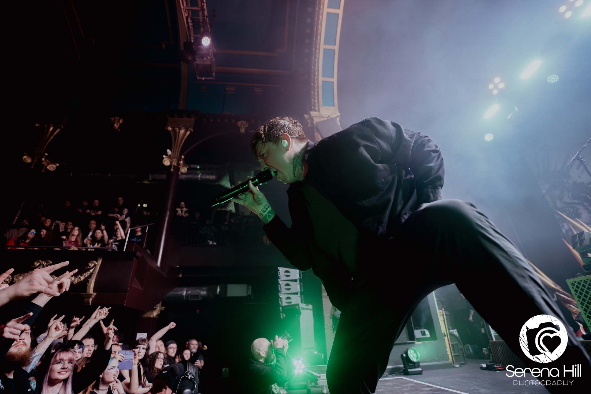 The drumming from Ali Richardson drives it all forward with a near-marching precision: relentless, pounding, impossible to ignore. It’s the backbone of the set, and it keeps the pit moving from start to finish. Midway through, there’s a rare pause. A moment to breathe and to acknowledge the people behind the scenes. The crew gets their due, including a Birmingham local who steps up for a quick word, proudly representing the city. It’s a small touch, but it adds to the sense that tonight isn’t just a show, it’s a shared moment amongst every single person in the room.