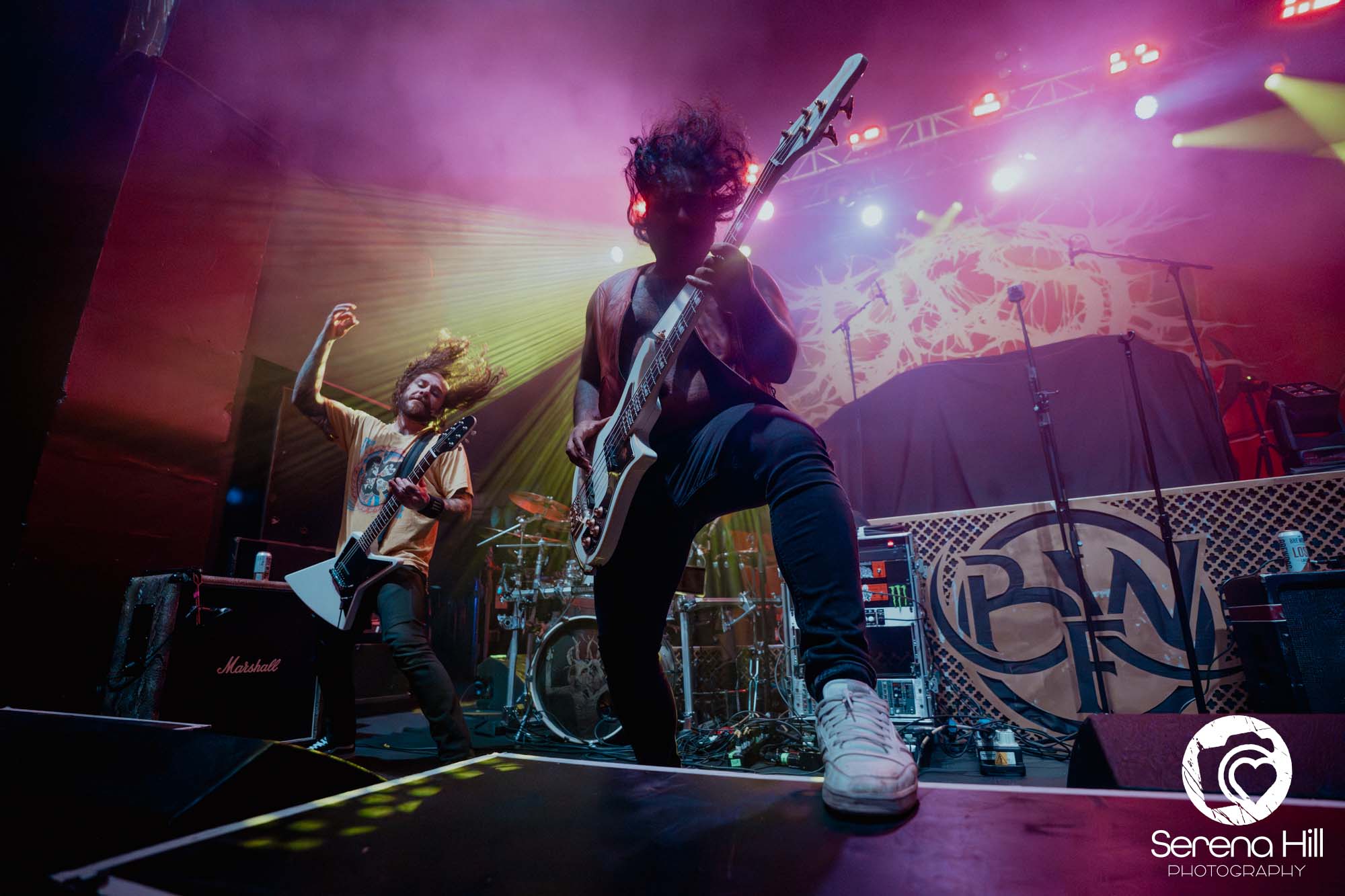 Vocally, Blake Mullens dials things up to full nightmare fuel. Where BAEST brought a more classic edge to their brand of death metal, this is pure deathcore savagery: unrelenting harshness, gutturals that sound dragged up from somewhere subterranean, and those signature pig squeals that ripple through the room like a shockwave. And yet, amidst all that brutality, there’s personality. There’s humour. Mullens drops a perfectly timed “Do I just suck at guitar, or what?” while Petrocelli is busy absolutely annihilating his fretboard, creating that contrast between chaos and charisma that keeps the set engaging.