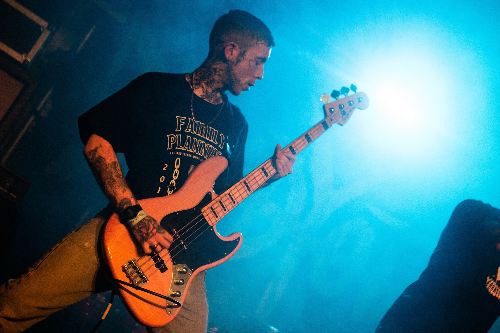 DEATH BLOOMS take to the stage and kick things off with Shut Up which is aggressive, expletive-riddled and disturbing enough to make you consider denying them a bed at your Airbnb. The band sees the audience begin to get more lively now, with people jumping around for the majority of the set. Paul Barrow has a voice that lends itself to this ‘nu-metal revival’ sound very well, sounding very unhinged at moments. Songs like Fuck Everything have electronics and vocal melodies that wouldn’t be out of place in a MOTIONLESS IN WHITE song but have been blended with some very bouncy nu-metal riffs to boot and as the band wrap things up with Life Is Pain, this is nothing short of a strong performance.