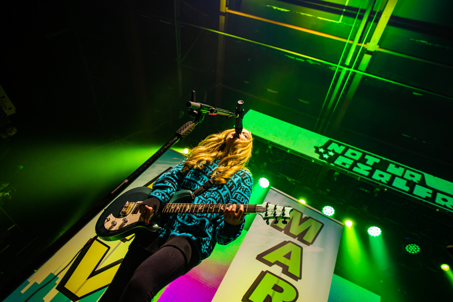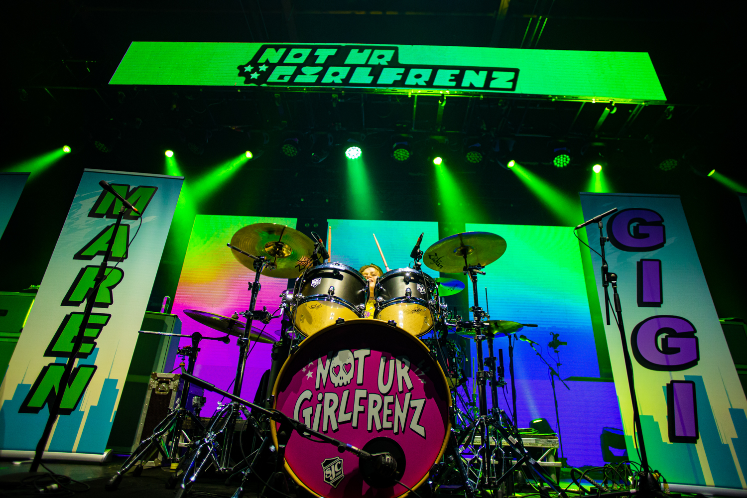 As a towering trio of screen pillars flicker to live, a familiar but different cartoon intro begins to play. Tonight, teenage openers NOT UR GIRLFRENZ are invoking the Powerpuff Girls, as a voiceover jokingly explains the creation of the teenage trio in the same way as the superhero team, before Liv Haynes, Gigi Haynes and Maren Alford themselves appear and launch into the opening notes of power-pop banger Warped. Having already been over to the UK alongside BOWLING FOR SOUP back at the end of 2018, it takes very little time before the girls are settled back in with the already-densely-packed UK crowd, deftly cranking out jokes at almost the same pace as great cuts from their finely-crafted pop-punk arsenal, including at one point a tongue-in-cheek Wonderwall snippet that throws things entirely off course for a few gloriously-silly moments.