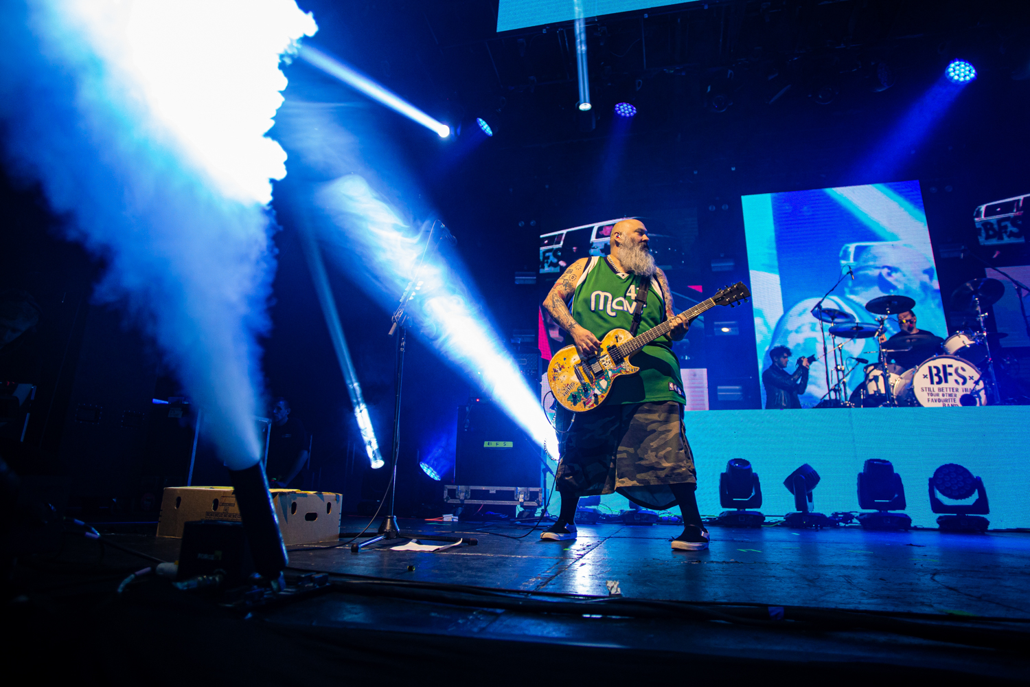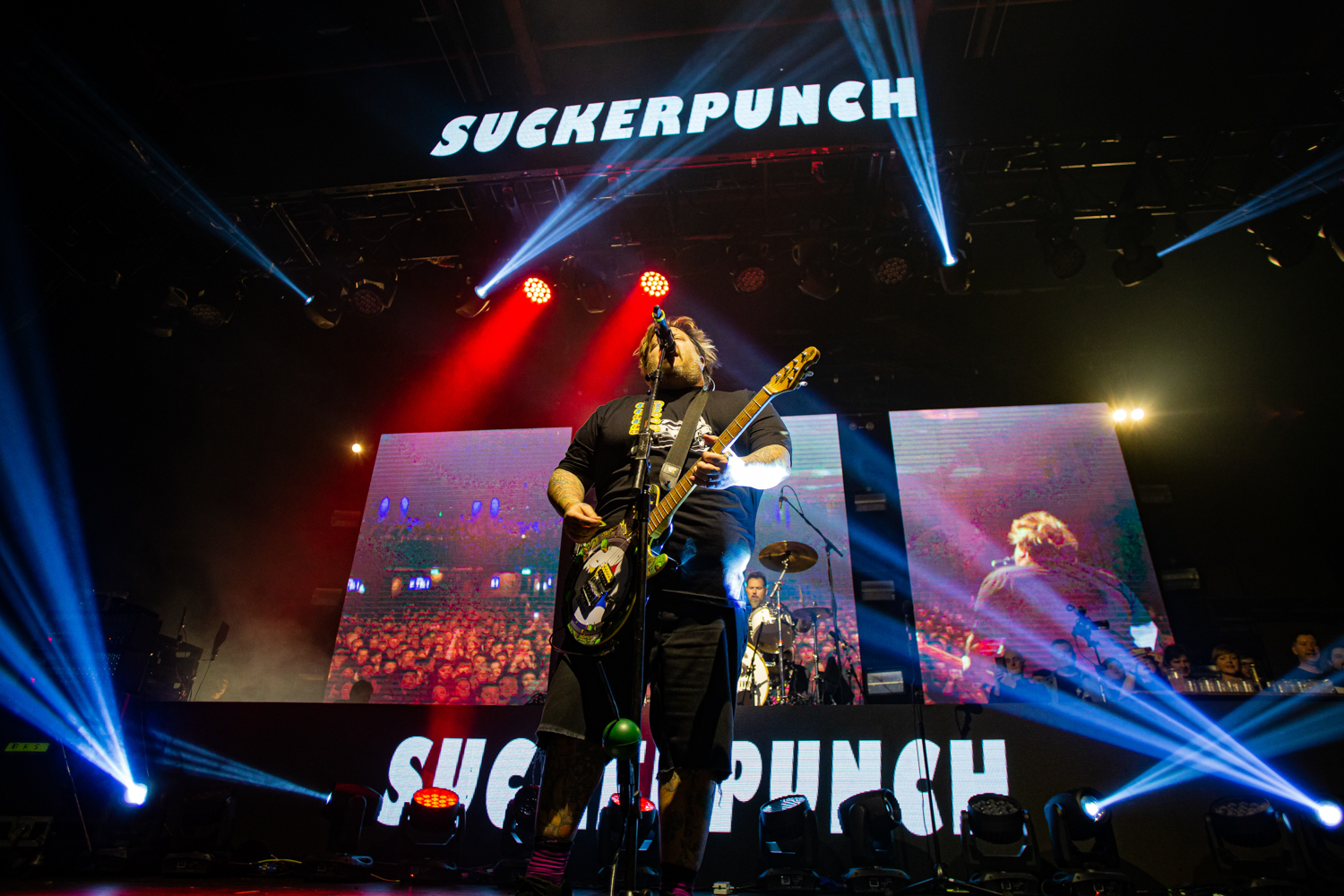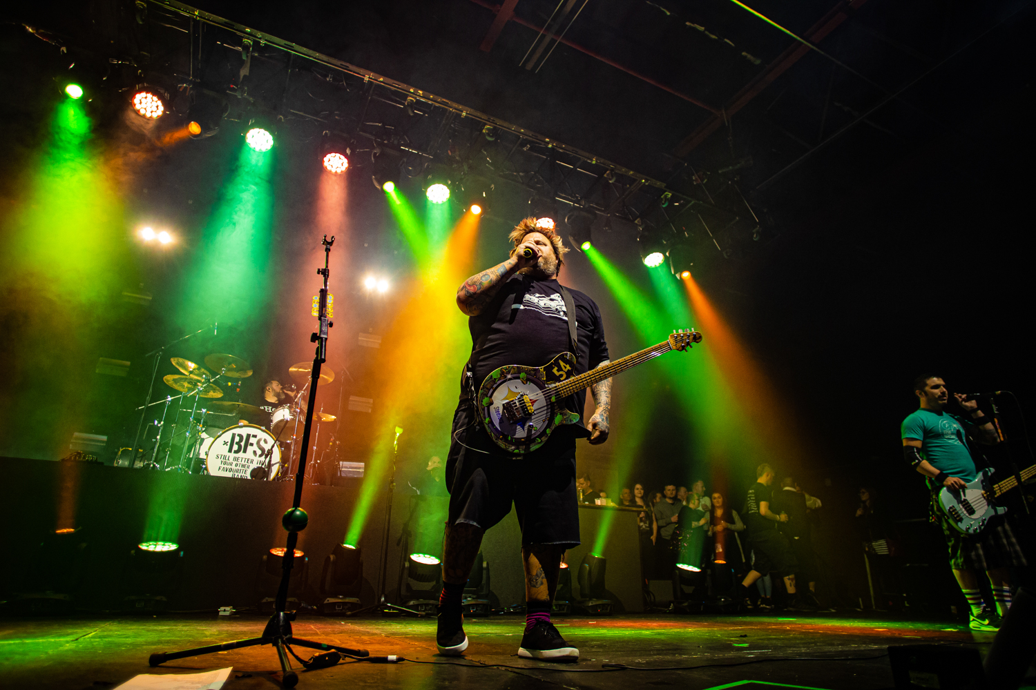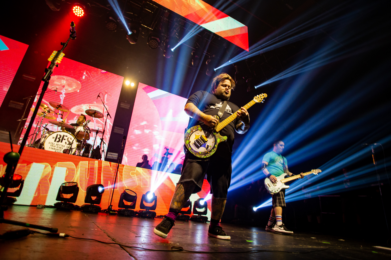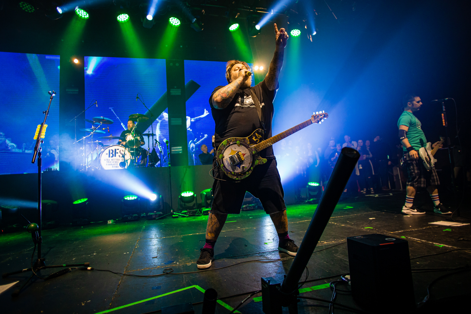 Brand new single Alexa Bliss, penned in tribute to the WWE Superstar of the same name and released just a week prior to this evening’s show, already has multitudes of fans singing every single lyric too, as the band are flanked by enormous images of Bliss herself during the song’s emphatic chorus. From here on out, the evening becomes pretty much a wall-to-wall greatest hits performance, with everything from anthemic heavyweights The Bitch Song and Smoothie King, to tear-jerker ballad When We Die and the “theme song to the greatest cartoon in the world”, Today Is Gonna Be A Great Day (of Phineas & Ferb fame), getting an airing across a set that seems to be packing limitless amounts of pop-punk bangers.