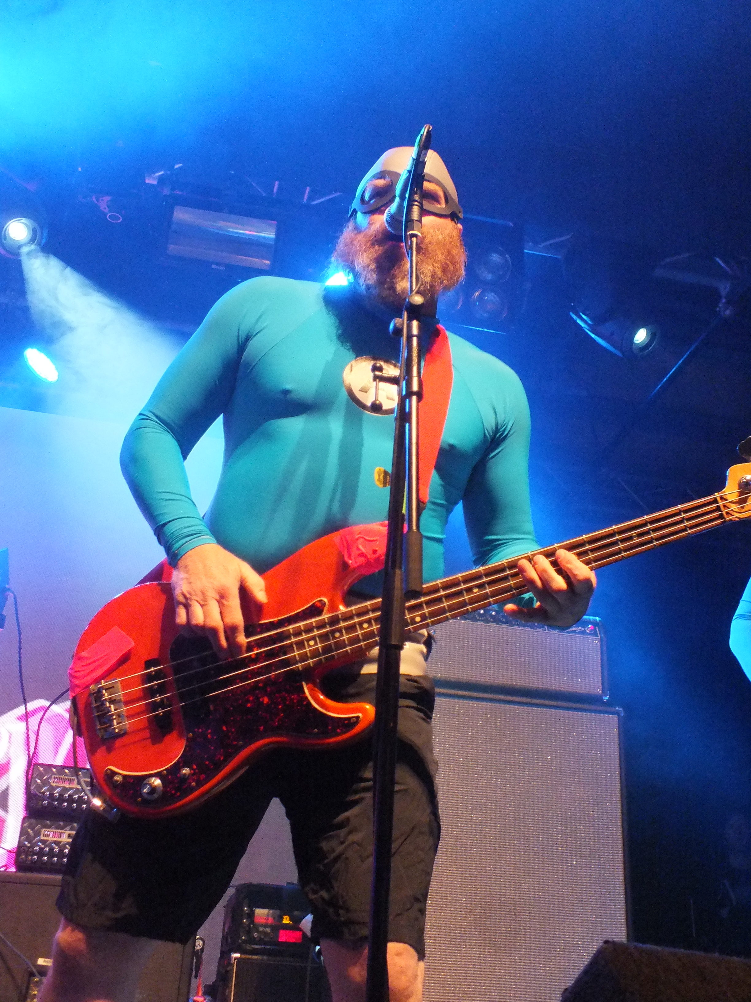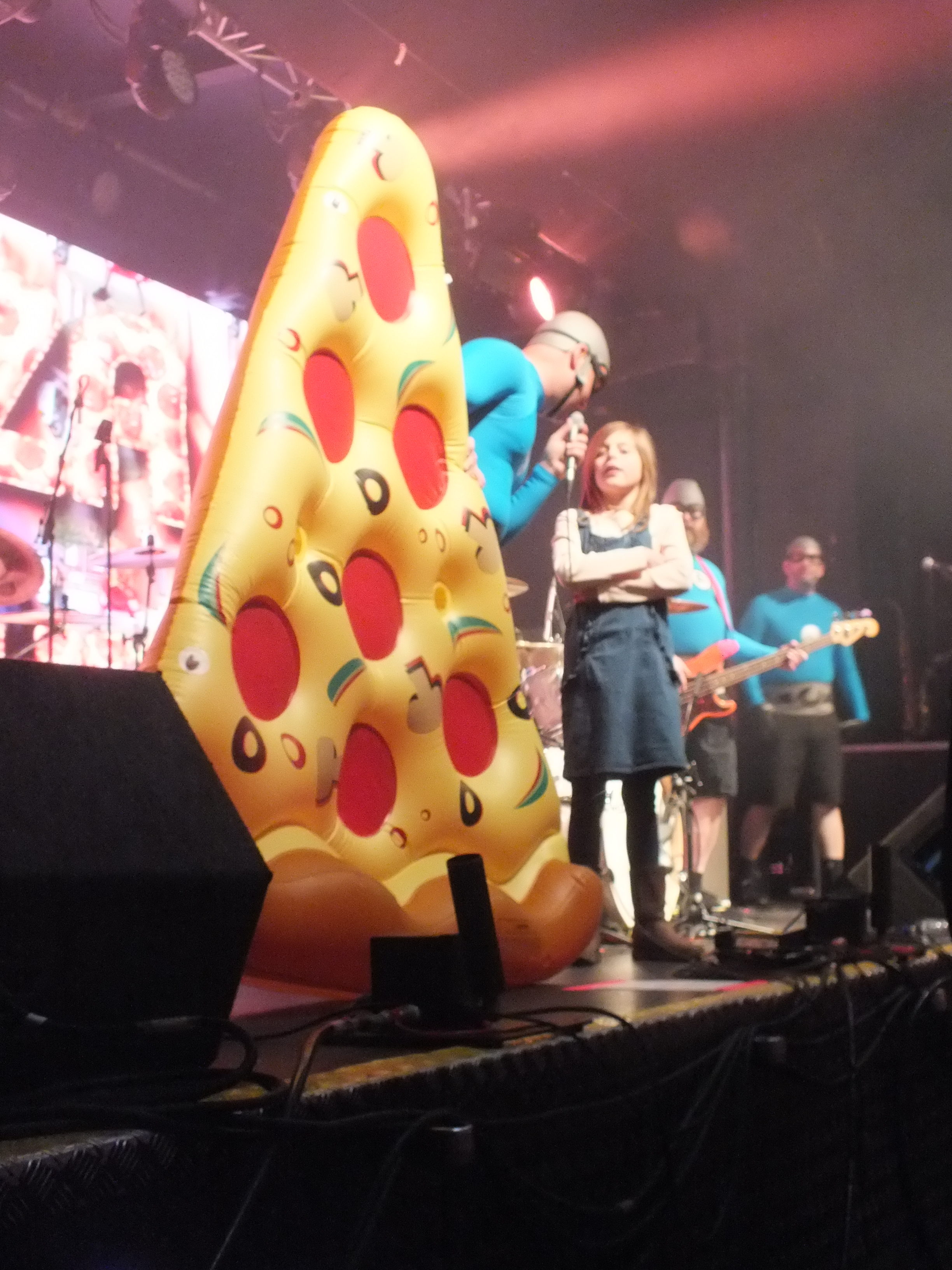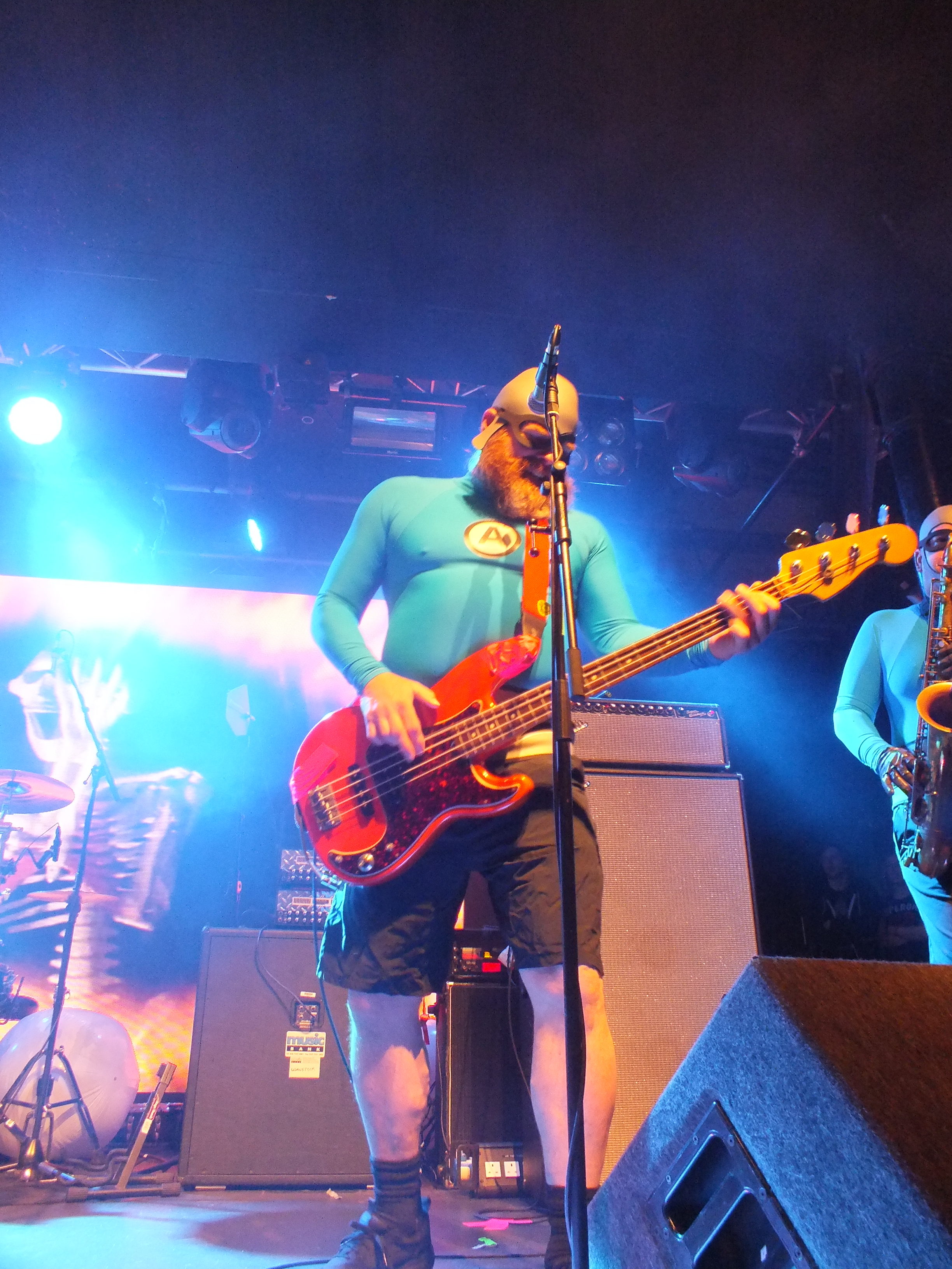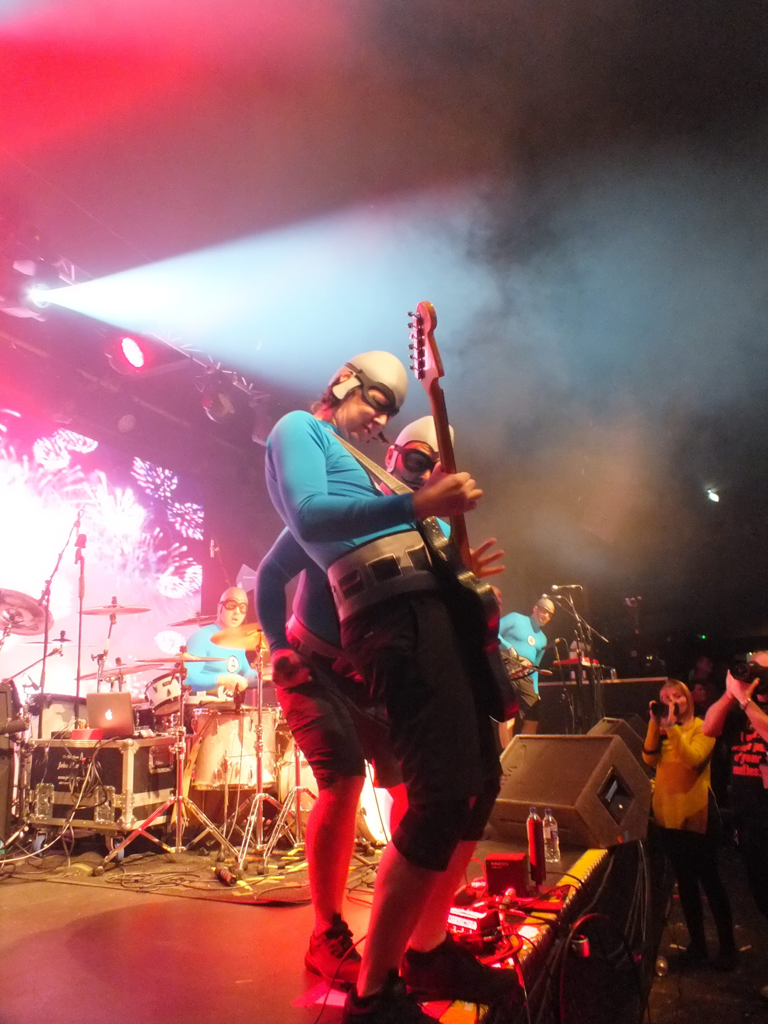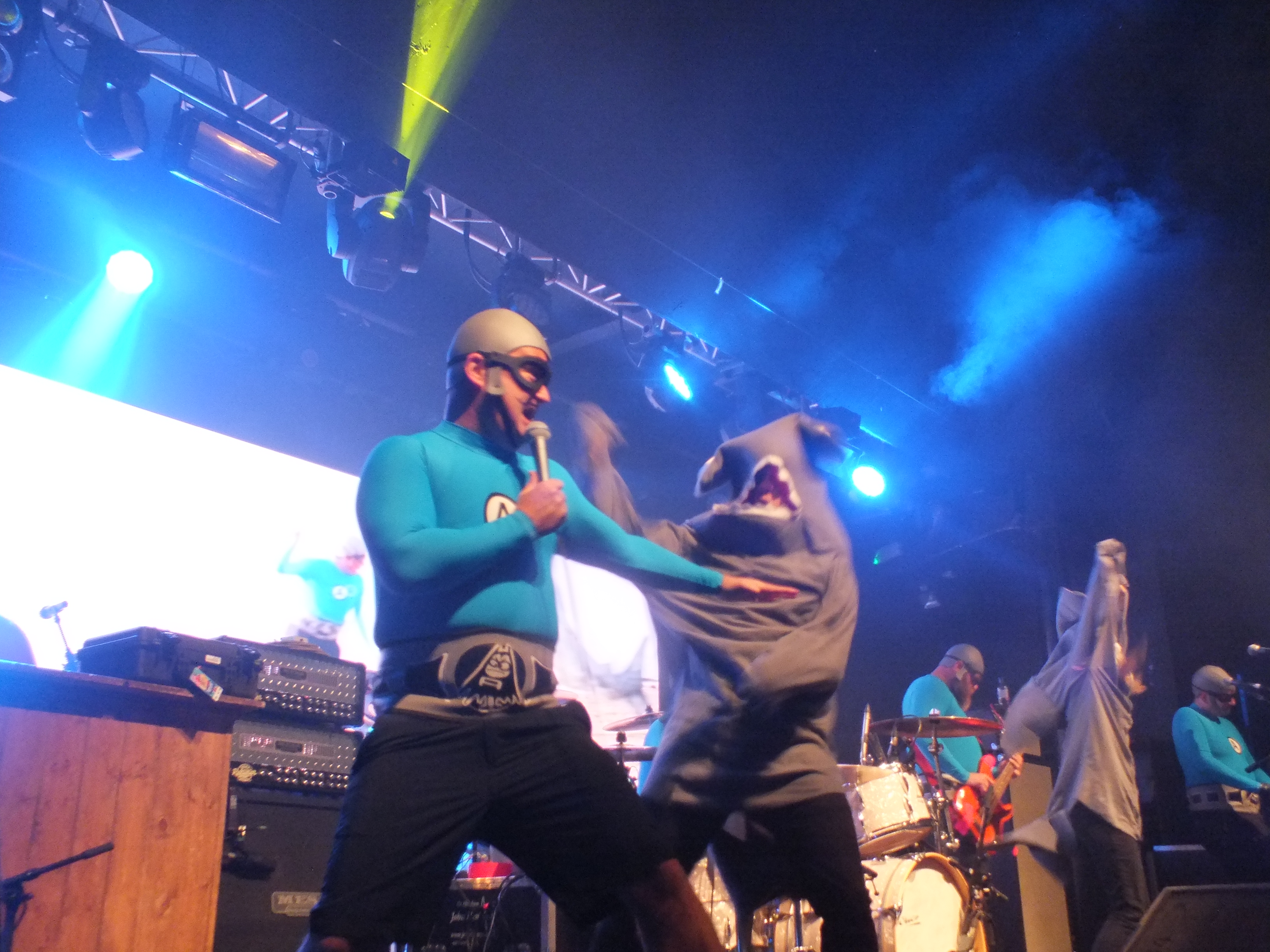 Where can you go from there? Well to the crime-fighting musical superheroes THE AQUABATS! who are complete with costumes and masks of course! LED screens on the back of the stage opened the set with a cartoon style introduction, including photos of each band member. If you’re unaware of the THE AQUABATS! they may be a bit of a surprise, but the humorous pop-punk group quickly win over the crowd with their scheme to entertain and amuse. Their weapons of choice are inflatables, of every variety, accompanying their set Shark fighter saw inflatable sharks thrown into the crowd and two sharks appear on stage to fight the band. THE AQUABATS! fought bravely and ultimately come out victorious. Pizza Day!, Burger Rain, and Pool Party all had accompanying inflatables.
