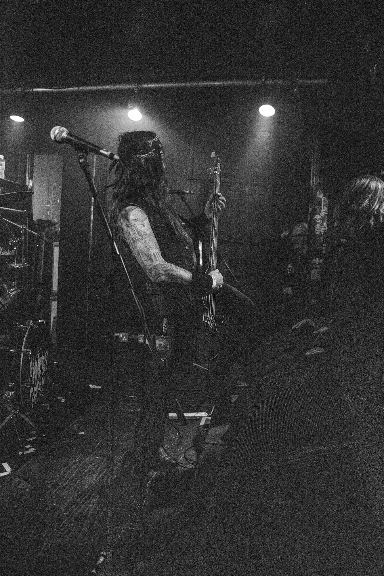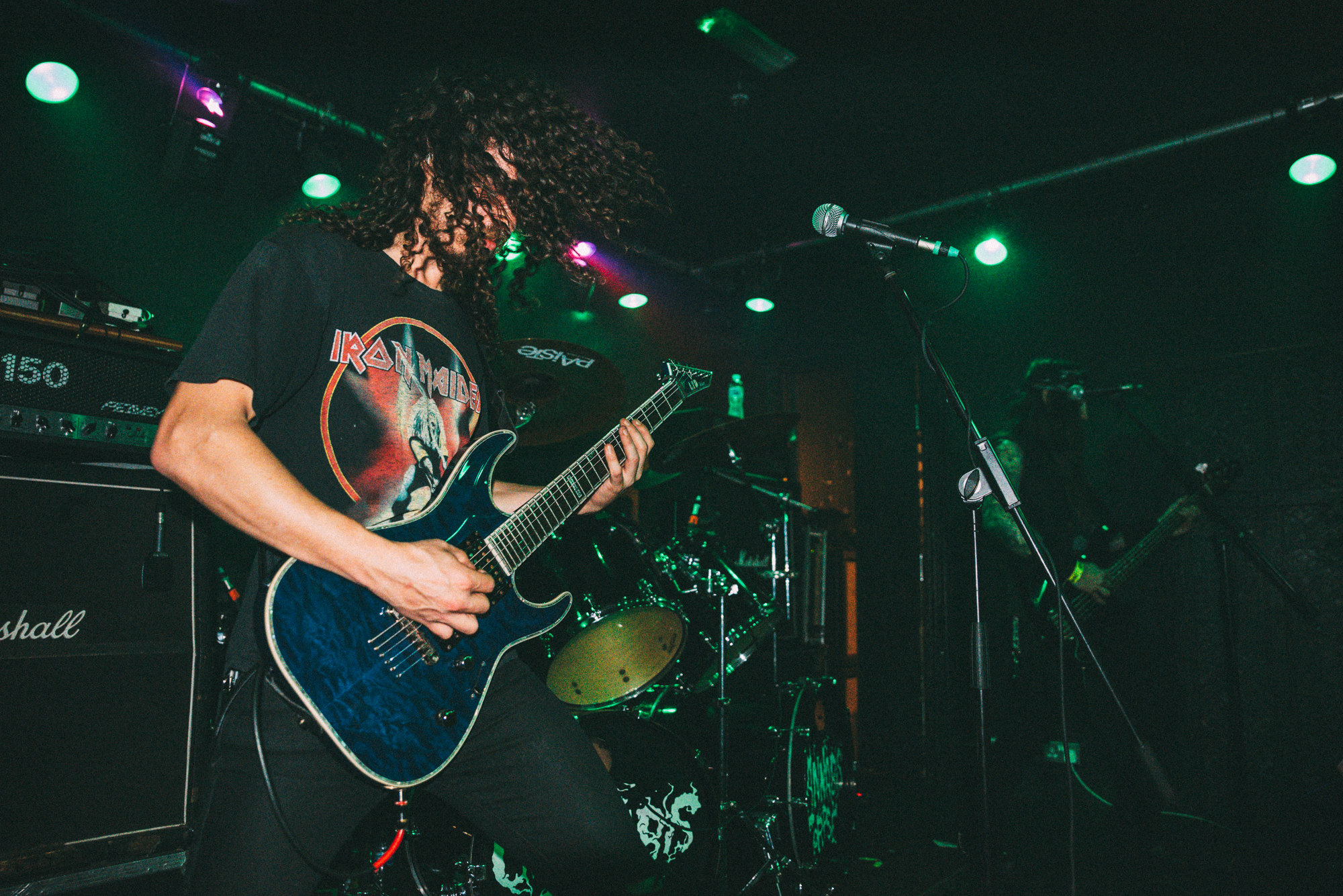 The crew of “phenomenal technicological astrodeath” outfit CRYPTIC SHIFT, have arrived from the outer reaches (Yorkshire) and descend upon The Black Heart’s stage to deliver a message of cosmic horror. Their moniker, possibly an allusion to the perils of night work, is evocative of a progressive sci-fi themed thrash metal sound in the vein of VOIVOD and VEKTOR but, make no mistake: CRYPTIC SHIFT performs with the mechanical ferocity of many of the most accomplished death metal acts. The band have developed some rather intricate arrangements on the Beyond the Celestial Realms EP, which they translate effectively in a live setting. A dash more reverb for atmosphere, a longform approach to song writing, and who knows; we could have the UK’s answer to BLOOD INCANTATION here.