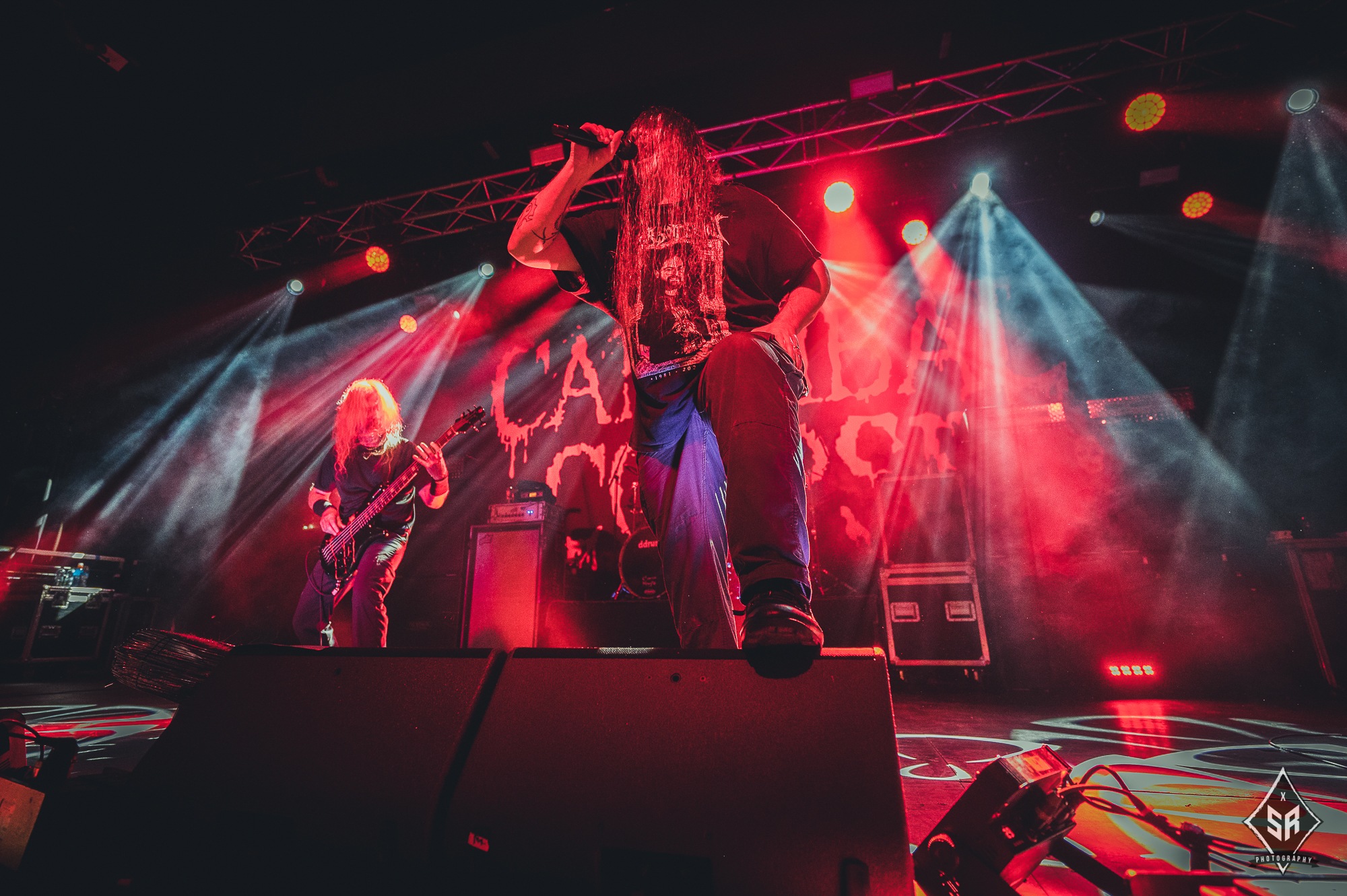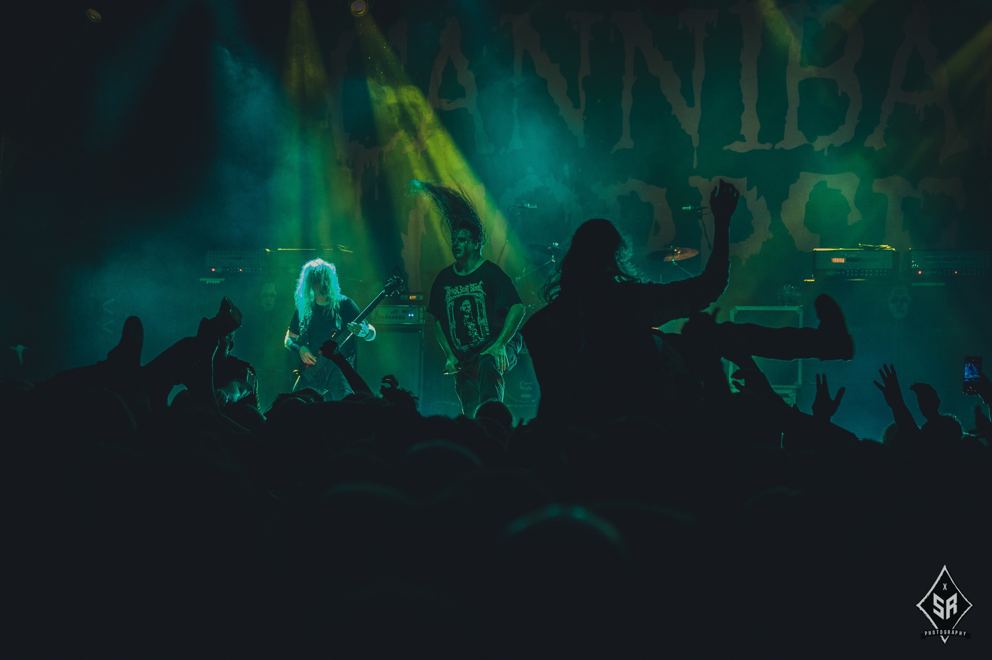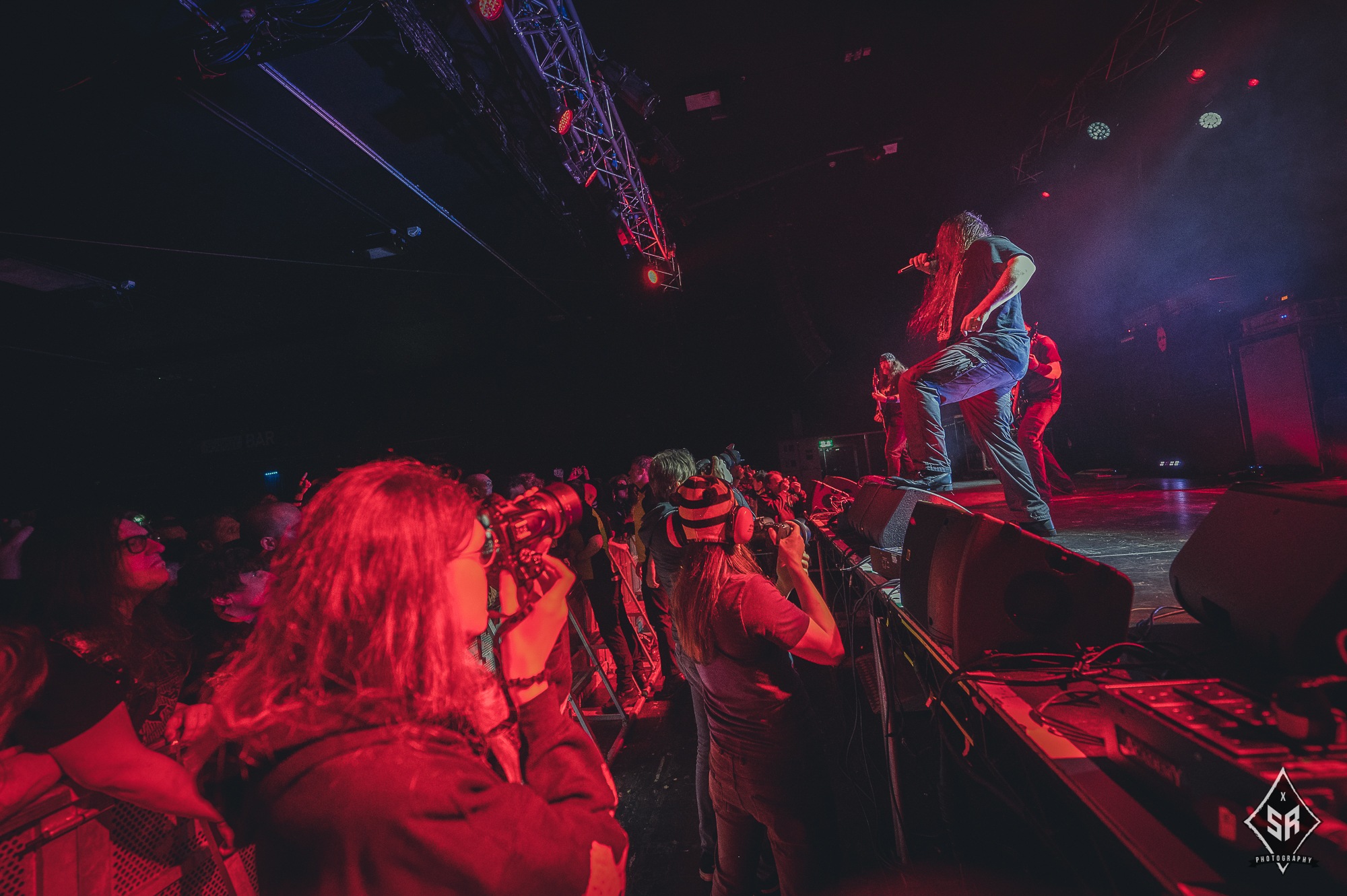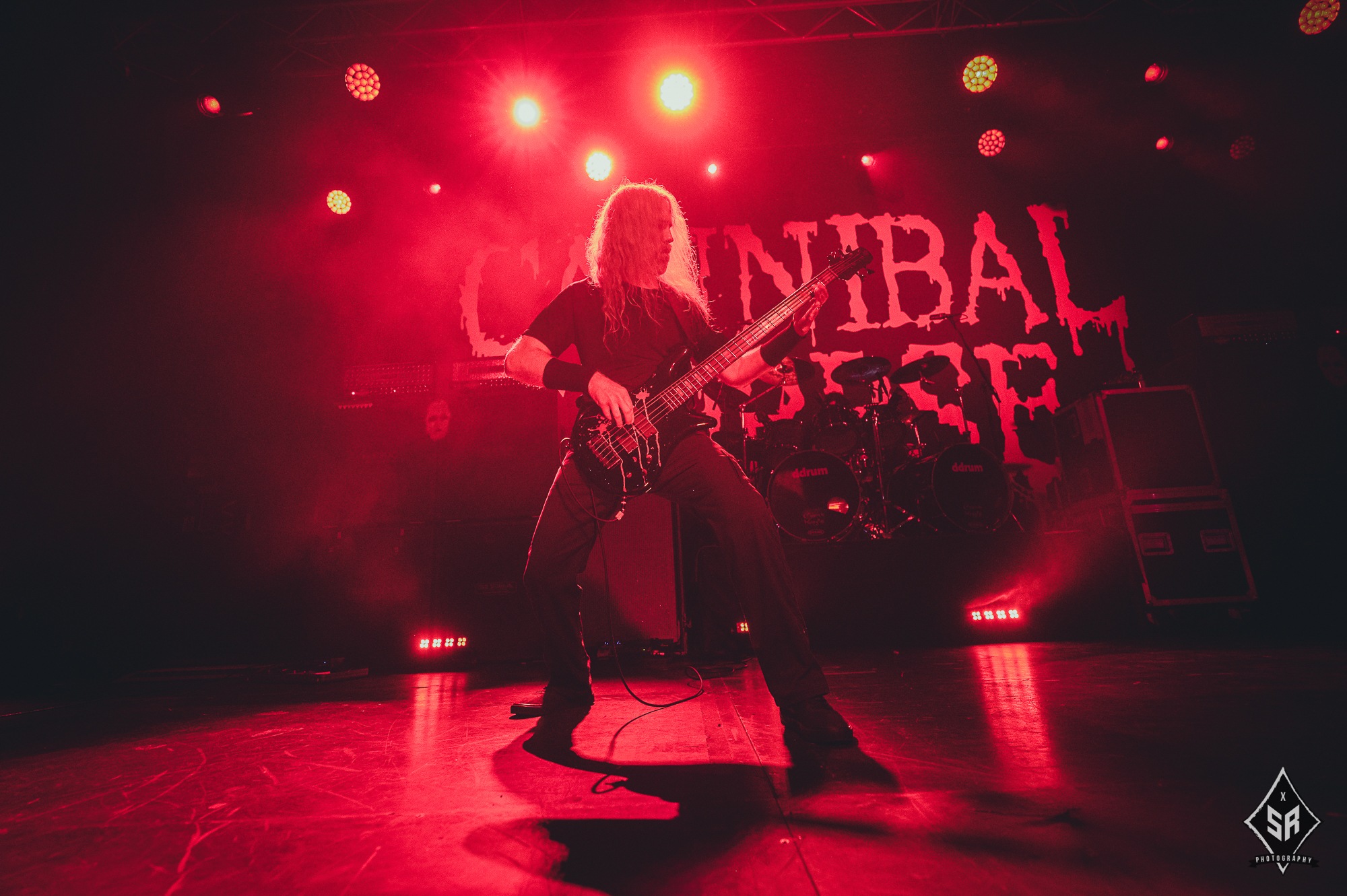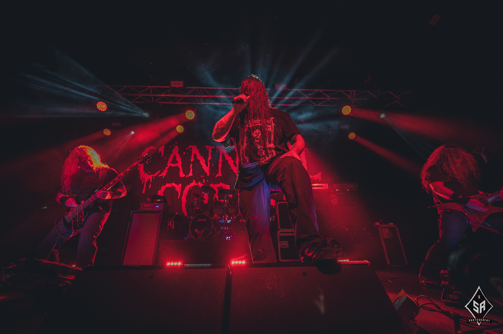 Death metal has undergone significant evolutions since its unholy inception forty years ago. What was once a small pocketed collection of bands pushing heavy music to unfathomable new depths, today, the scene is enormous with a large quota of killer bands deploying a host of varying soundscapes from death metal’s diverse sub-genres. For all the exciting new blood that is keeping the genre healthy, for CANNIBAL CORPSE, they remain one of death metal’s heaviest hitters. For all their sonic brutality, they sit in a unique position of being insanely popular, and as such, tonight’s sold-out show at the Academy in Manchester reflects just how much of a cultural phenomenon CANNIBAL CORPSE stand 32 years after Eaten Back To Life shook the foundations of our world to its rotten core.