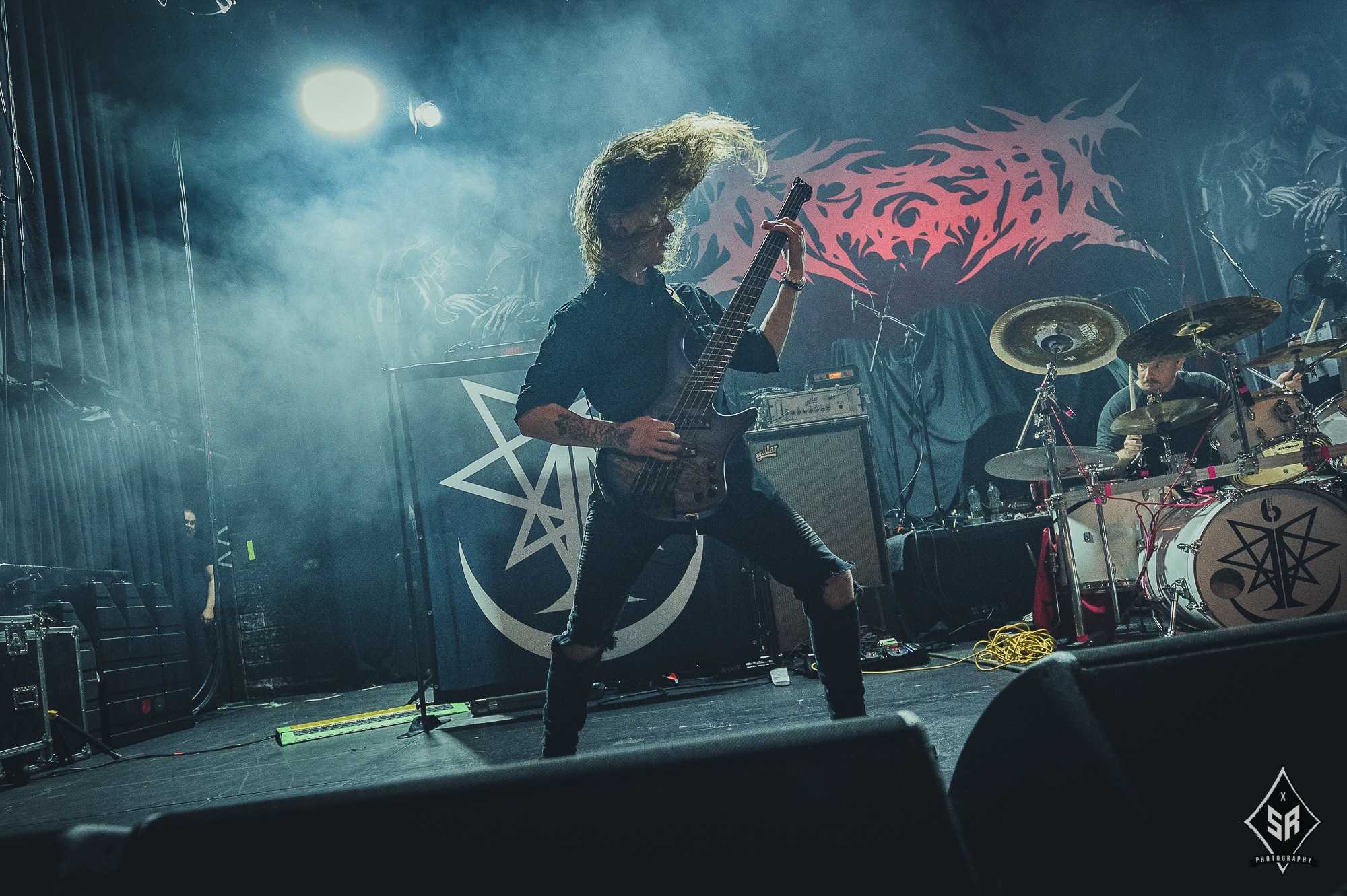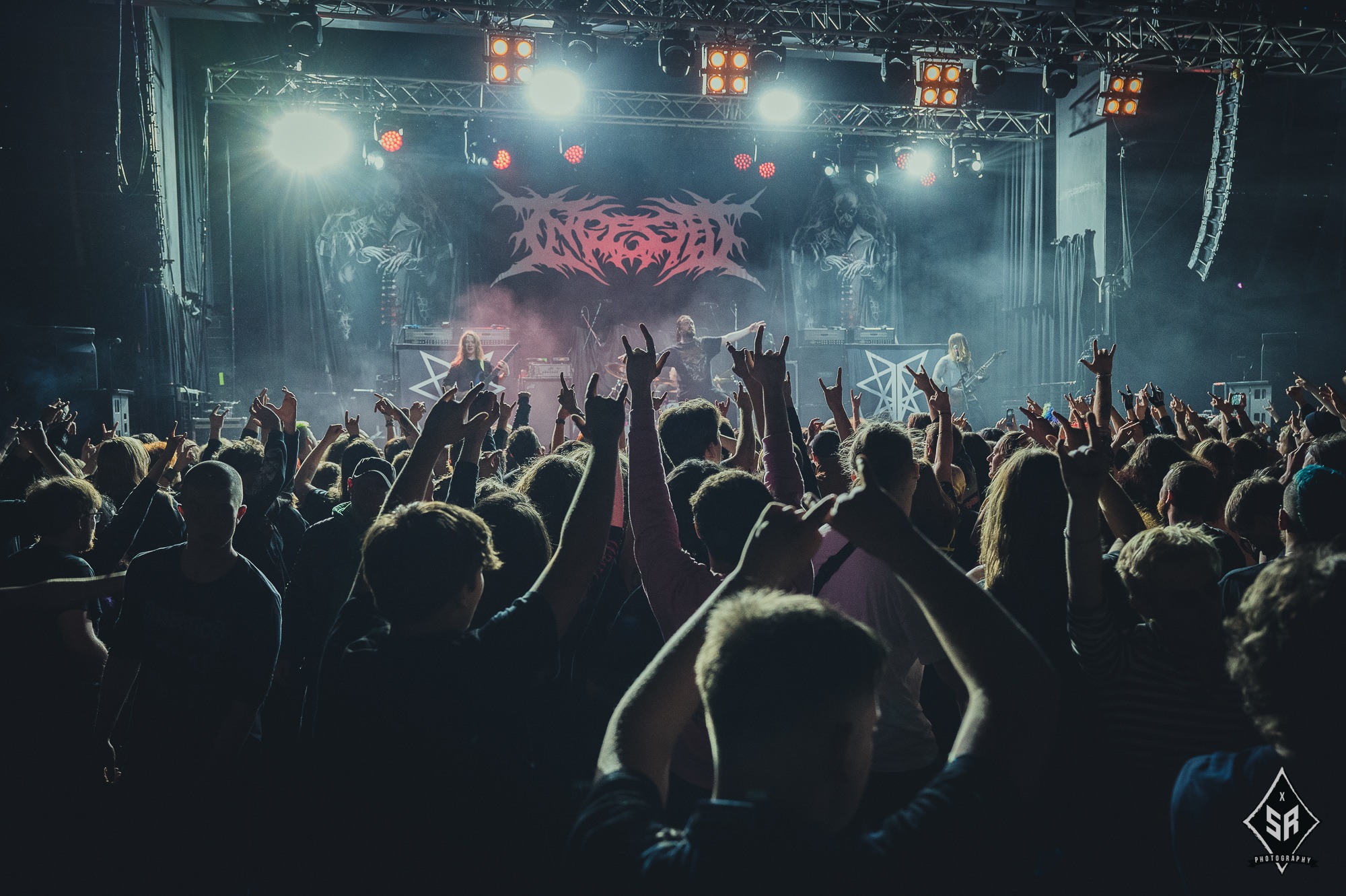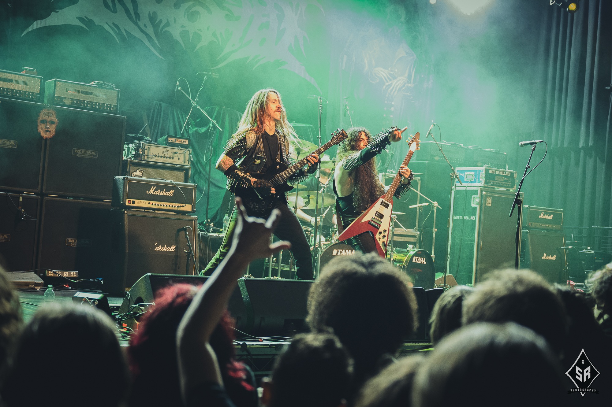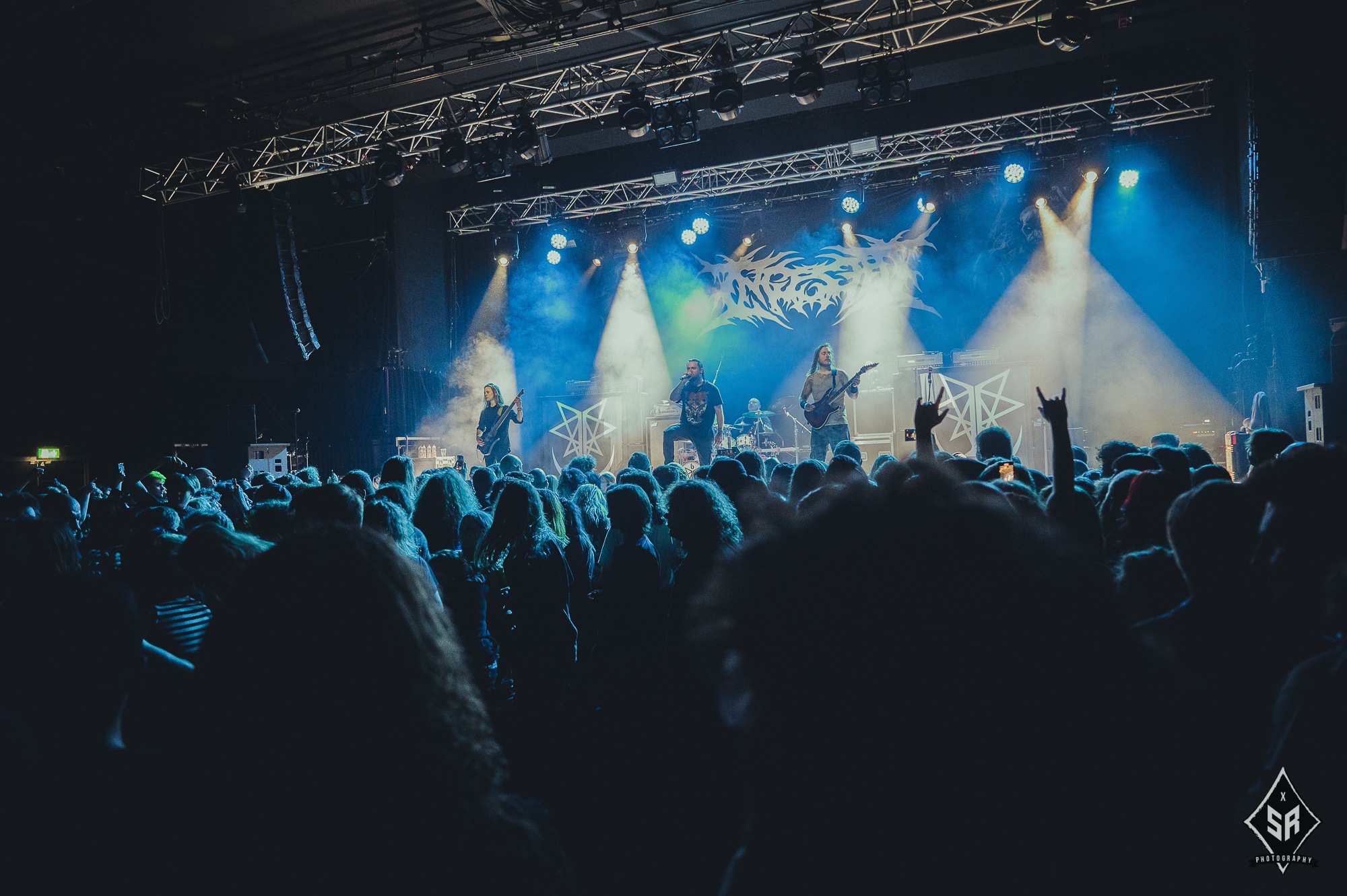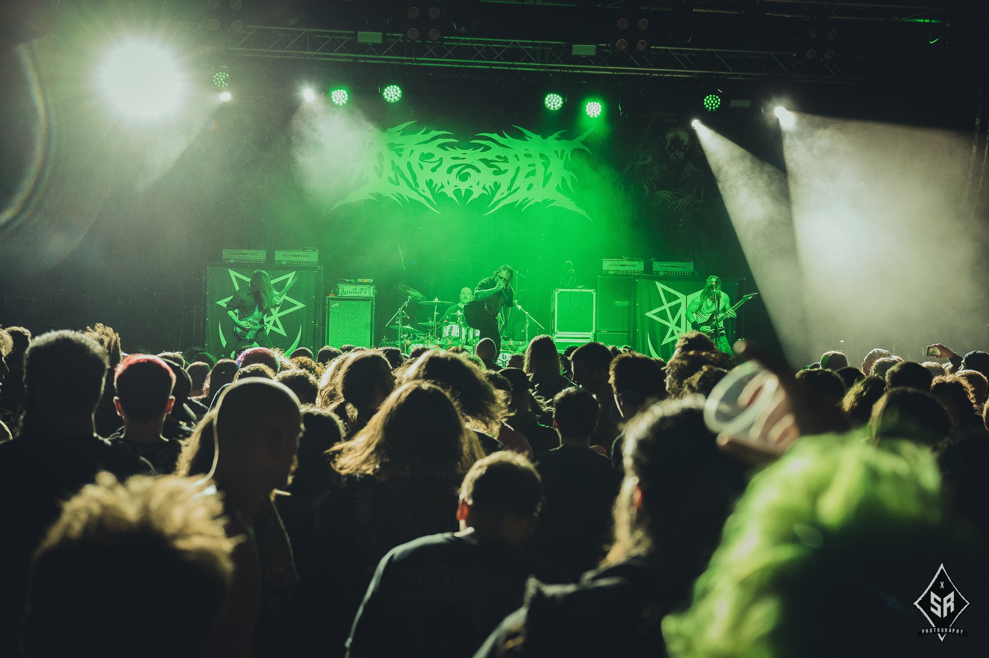 Death metal has undergone significant evolutions since its unholy inception forty years ago. What was once a small pocketed collection of bands pushing heavy music to unfathomable new depths, today, the scene is enormous with a large quota of killer bands deploying a host of varying soundscapes from death metal’s diverse sub-genres. For all the exciting new blood that is keeping the genre healthy, for CANNIBAL CORPSE, they remain one of death metal’s heaviest hitters. For all their sonic brutality, they sit in a unique position of being insanely popular, and as such, tonight’s sold-out show at the Academy in Manchester reflects just how much of a cultural phenomenon CANNIBAL CORPSE stand 32 years after Eaten Back To Life shook the foundations of our world to its rotten core.