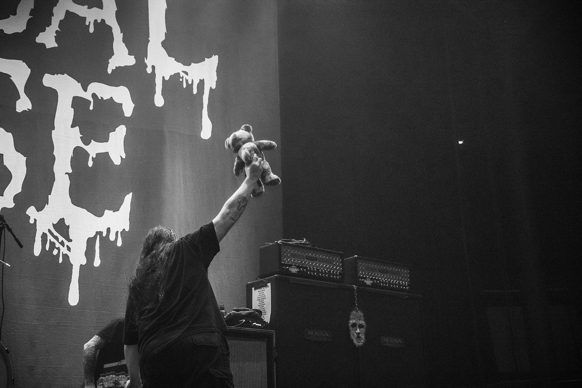 Whatever threatening/eerie image you have in your head of vocalist Corpsegrinder aka George Fisher, it is immediately gone because as the band came on to the stage, a fan from the front row hands a stuffed toy bear to George. Cheers came from the fans as he held it up with a smile as he placed it on the back of the stage.
