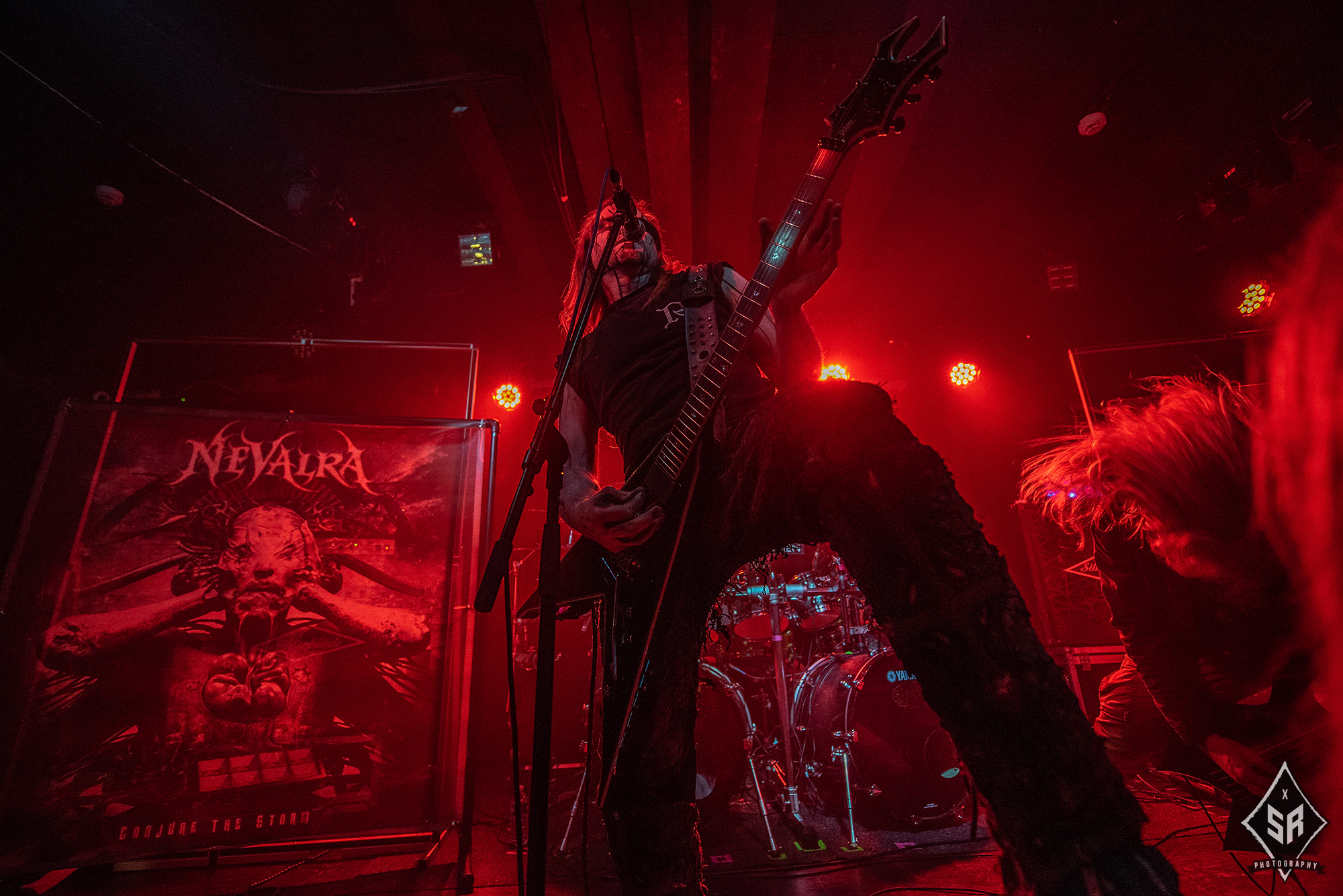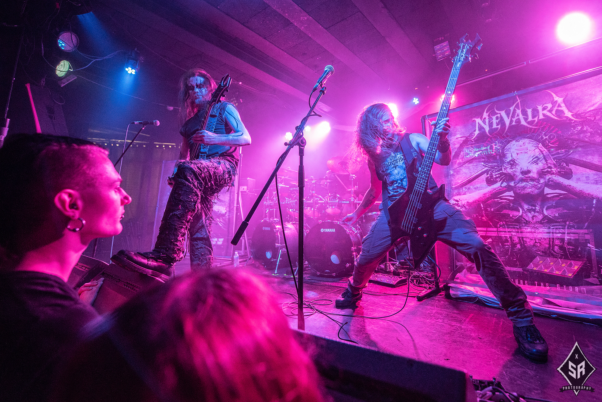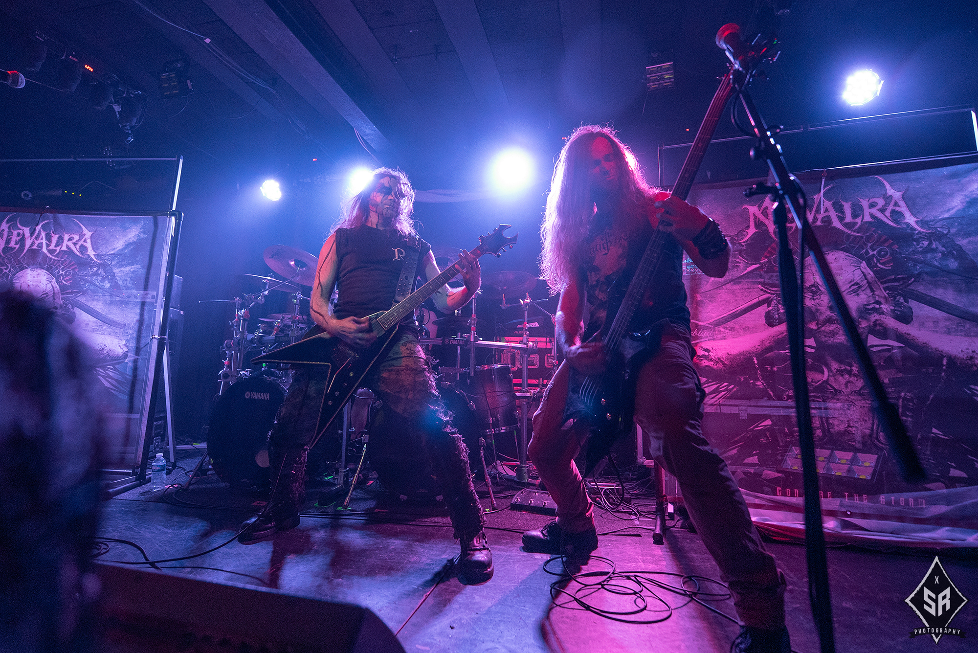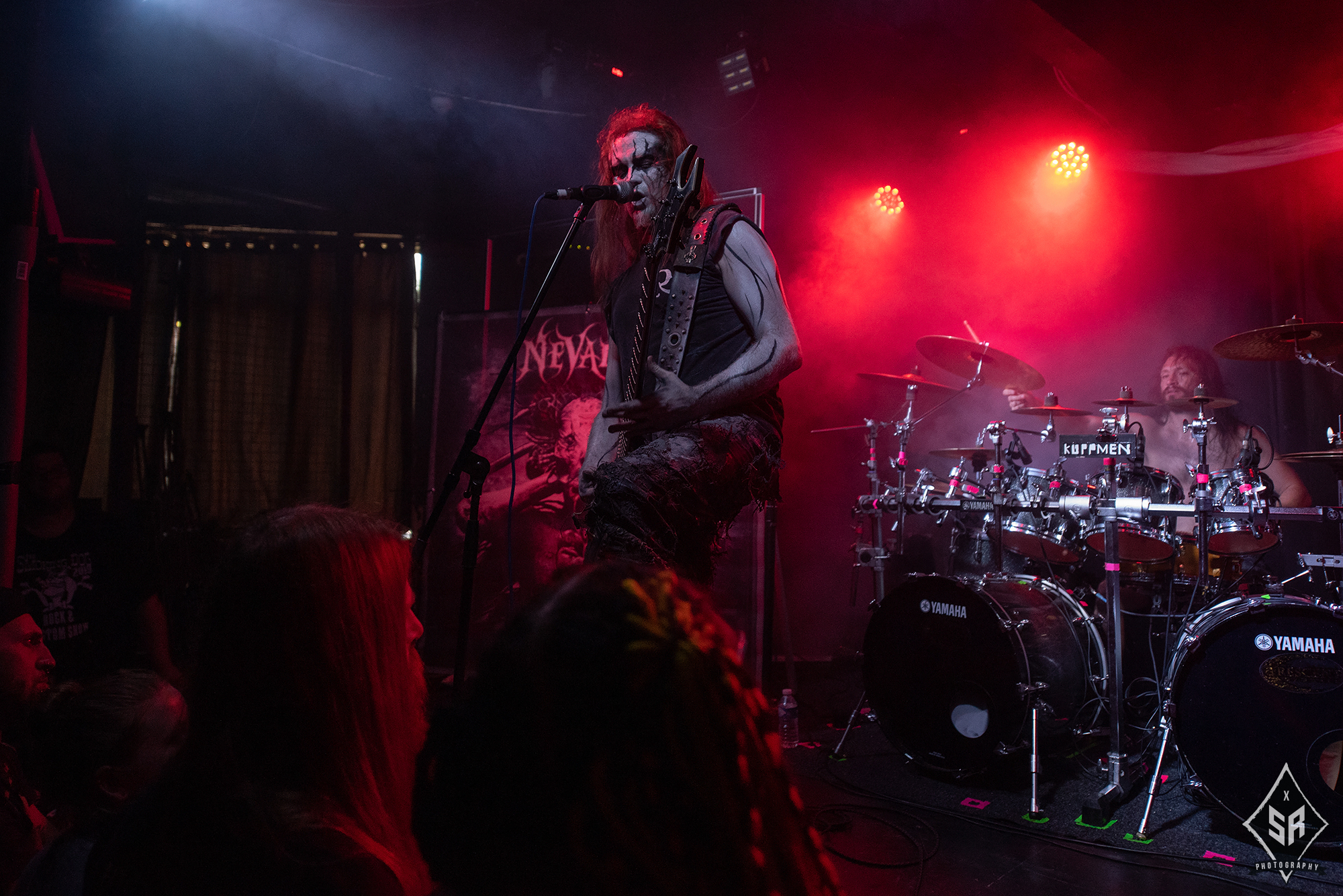 NEVALRA have the task to kick off proceedings and despite hitting the stage an hour and a half after doors opening, the pitiful attendance isn’t a pretty sight for the US blackened melodic death metallers. However, this doesn’t phase the band in the slightest as they proceed to hurtle through their set at breakneck pace. With the bulk of their set comprised of material from this year’s debut full-length, Conjure The Storm, the trio display enough to keep the crowd entertained in their short time on stage. Zach Lindsey‘s drumming is utterly relentless and the splashes of melodic guitar-play from Scott Eames demonstrates the skill within their repertoire. However, Eames‘ vocals are often lost in the mix, making his growled vocals sound flat and difficult to hear clearly in the sonic maelstrom. Things do improve as the set continues but it dampens any overall lasting impact.