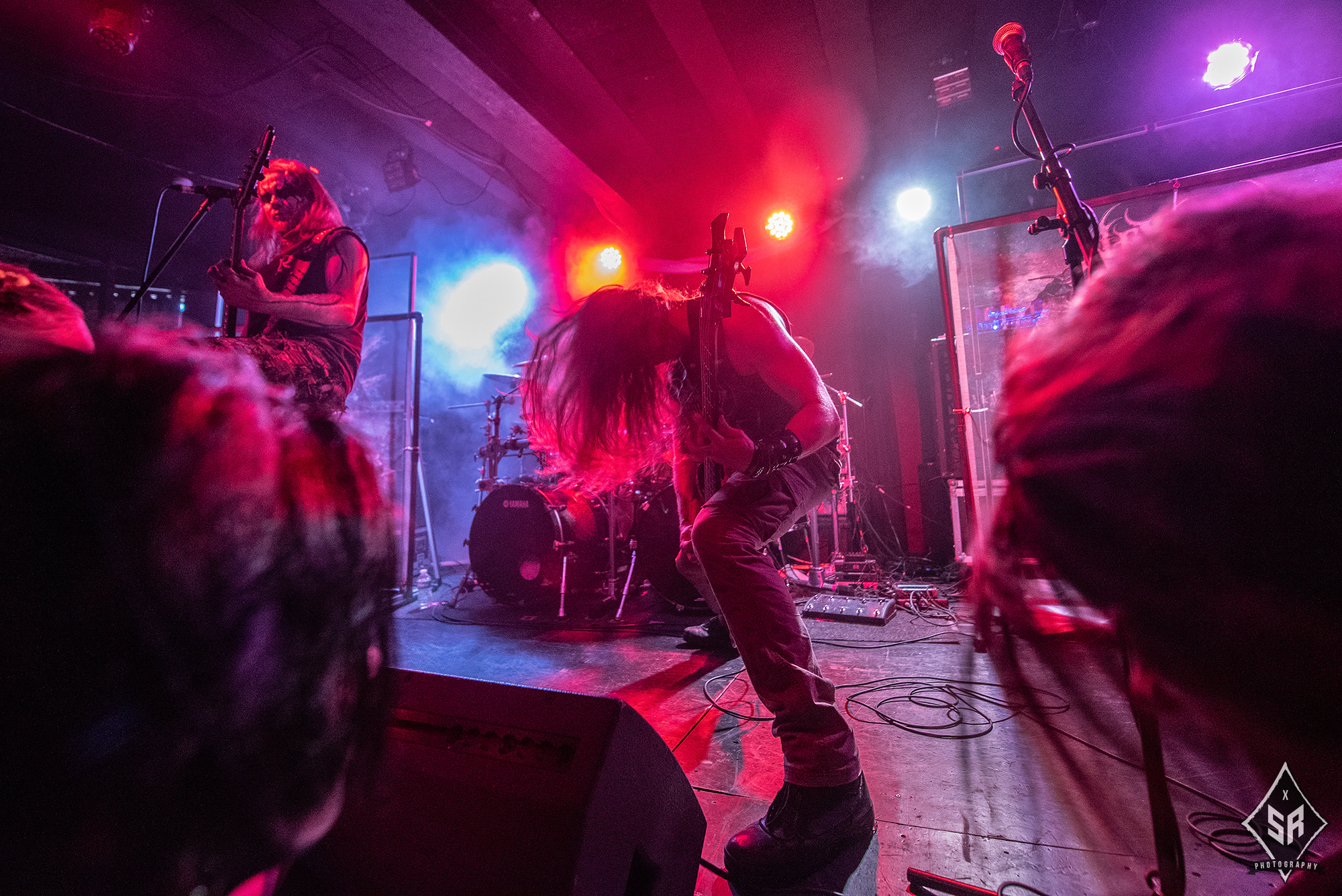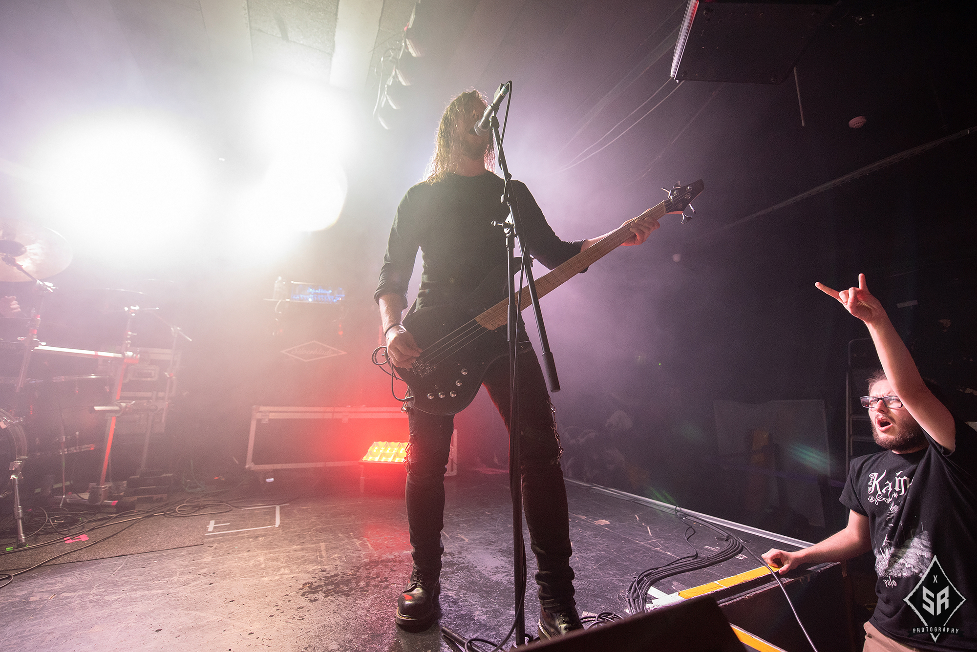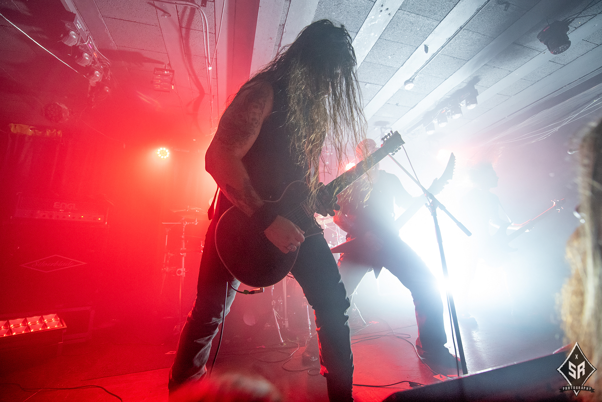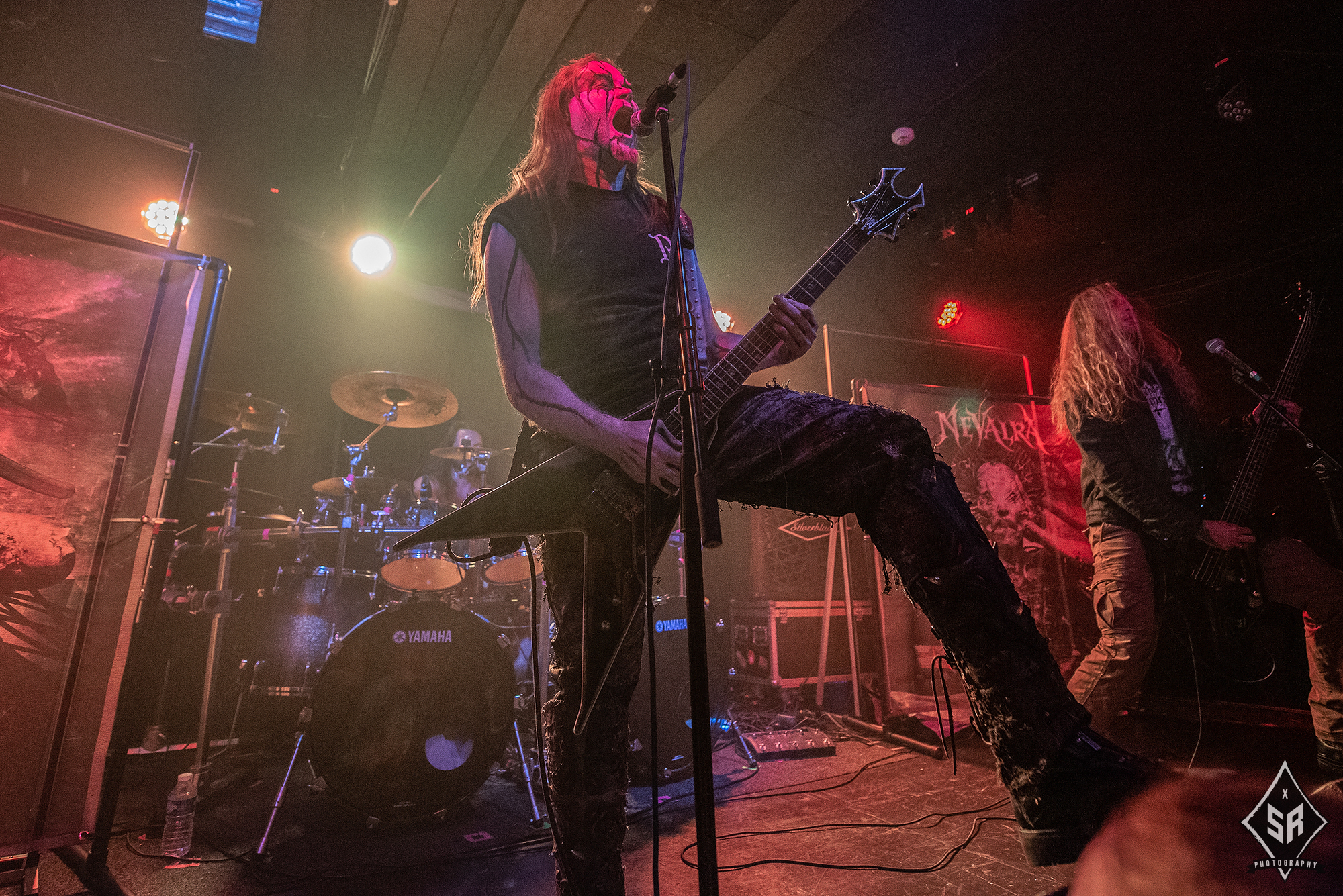 NEVALRA have the task to kick off proceedings and despite hitting the stage an hour and a half after doors opening, the pitiful attendance isn’t a pretty sight for the US blackened melodic death metallers. However, this doesn’t phase the band in the slightest as they proceed to hurtle through their set at breakneck pace. With the bulk of their set comprised of material from this year’s debut full-length, Conjure The Storm, the trio display enough to keep the crowd entertained in their short time on stage. Zach Lindsey‘s drumming is utterly relentless and the splashes of melodic guitar-play from Scott Eames demonstrates the skill within their repertoire. However, Eames‘ vocals are often lost in the mix, making his growled vocals sound flat and difficult to hear clearly in the sonic maelstrom. Things do improve as the set continues but it dampens any overall lasting impact.