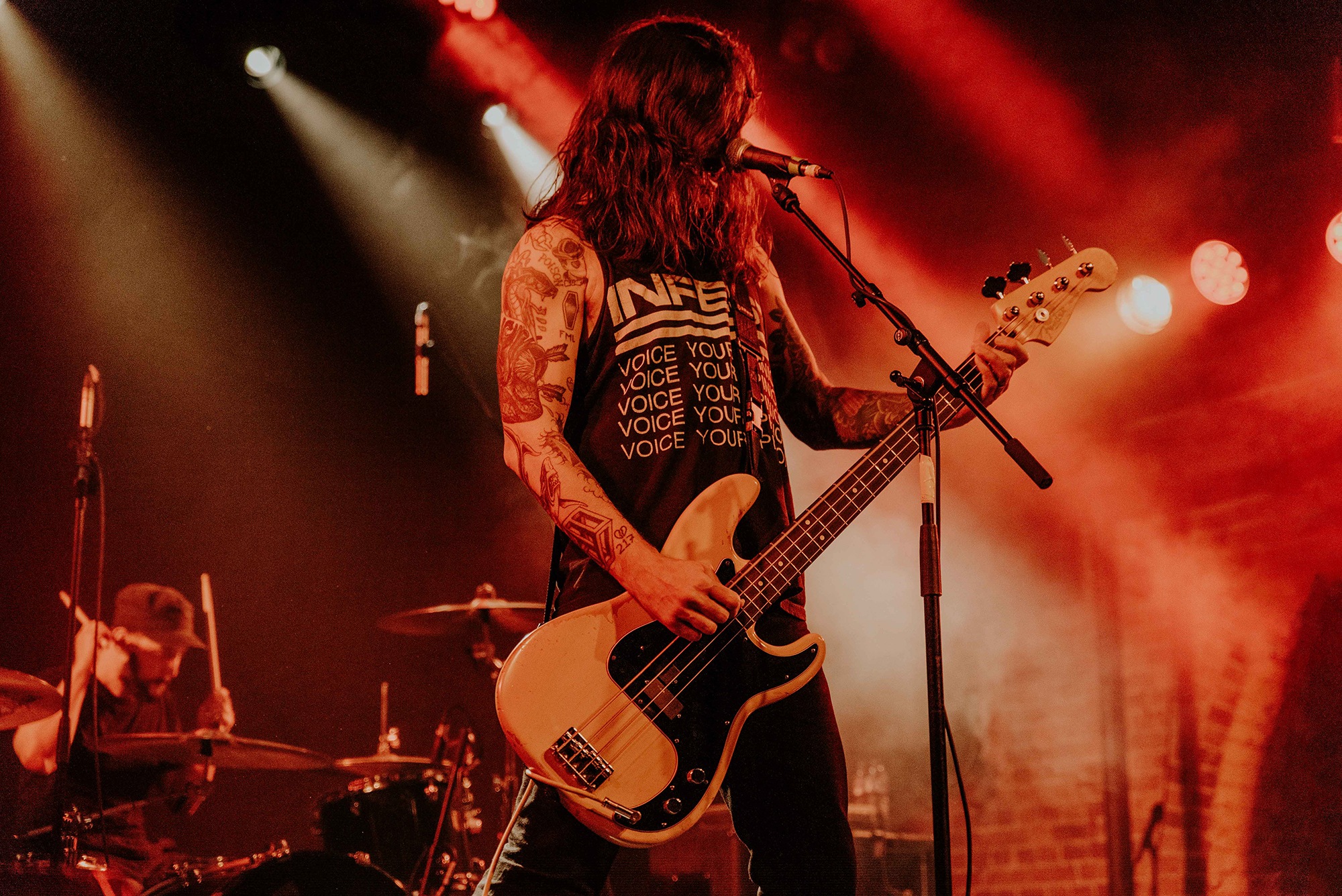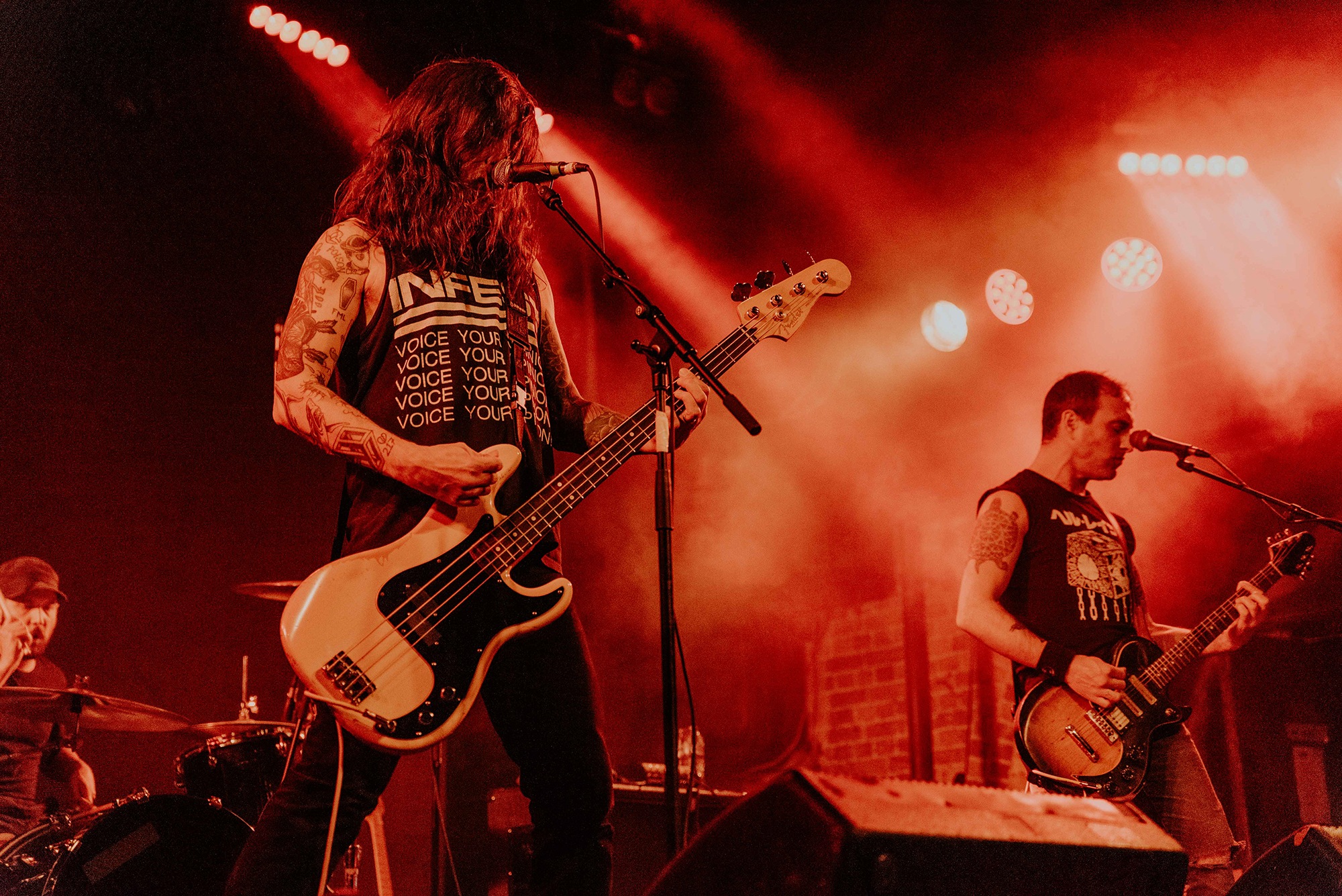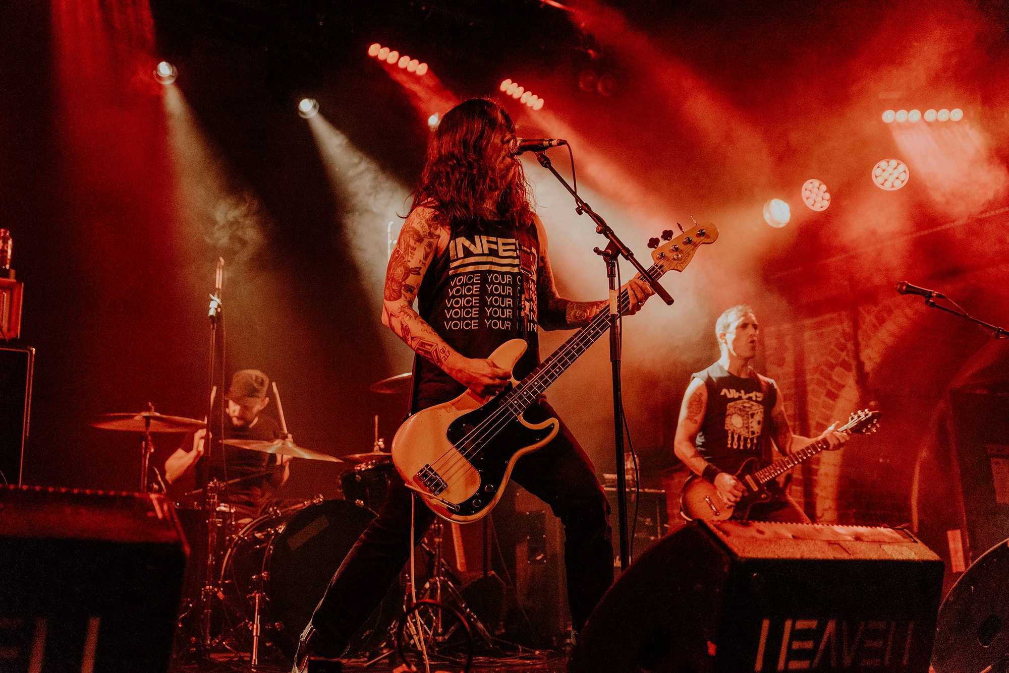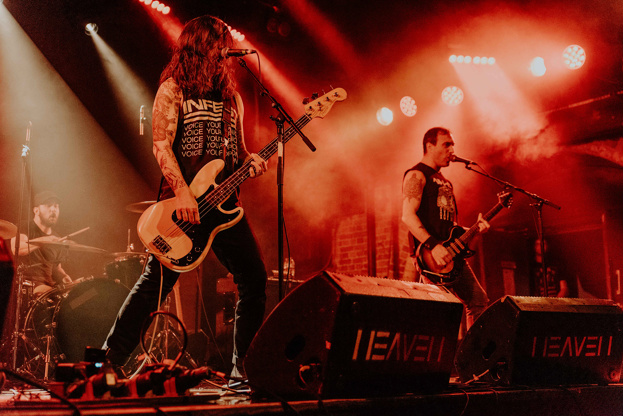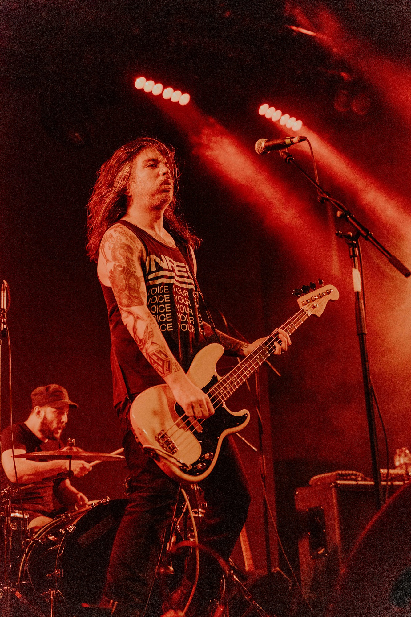 If there’s one band that could follow that display though, it’s CAVE IN. From the moment they kick into New Reality and follow it with the serpentine Blood Spiller, the crowd are putty in the quartet’s hands. They complete the opening trio with the sludge-laden Searchers Of Hell, playing with the biggest grins and the kind of consummate ease borne of decades in each other’s company. “I see you dusty old fucks,” laughs bassist Nate Newton, gleefully taunting, daring their older fans to mosh (“but you won’t, because you’re old”) before older number The End Of Our Rope Is A Noose rumbles forth. Its bluesy swagger is simply undeniable and thanks to those accusations of people not moshing – no matter how unserious – there’s more than a little neck movement when the titanic groove hits. They slow things down with the bluesy, almost country Reckoning but it’s no less intense; the four exude a magnetic charisma and love of performing that even with a fairly sparse lightshow they can be sure that all eyes are on them.