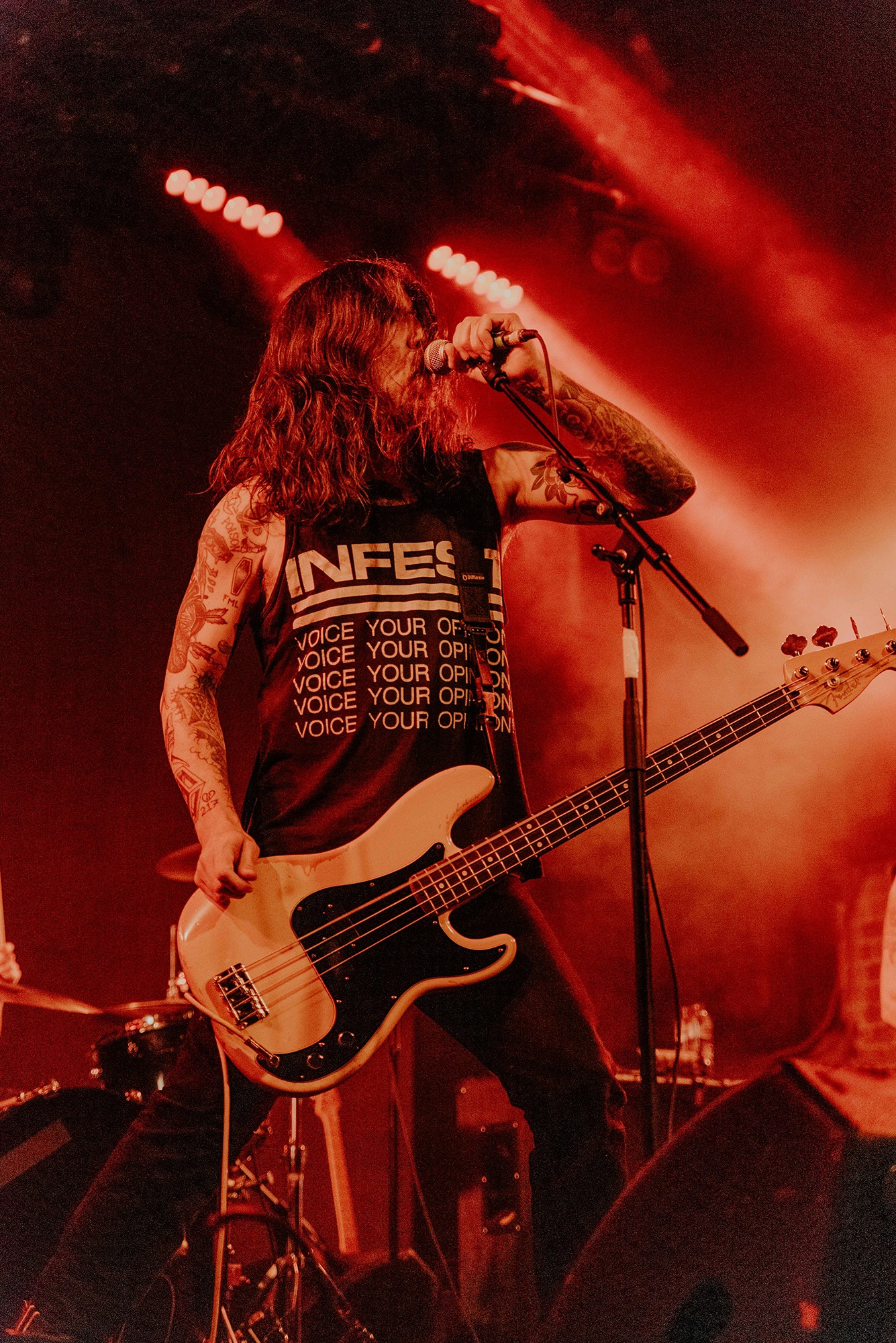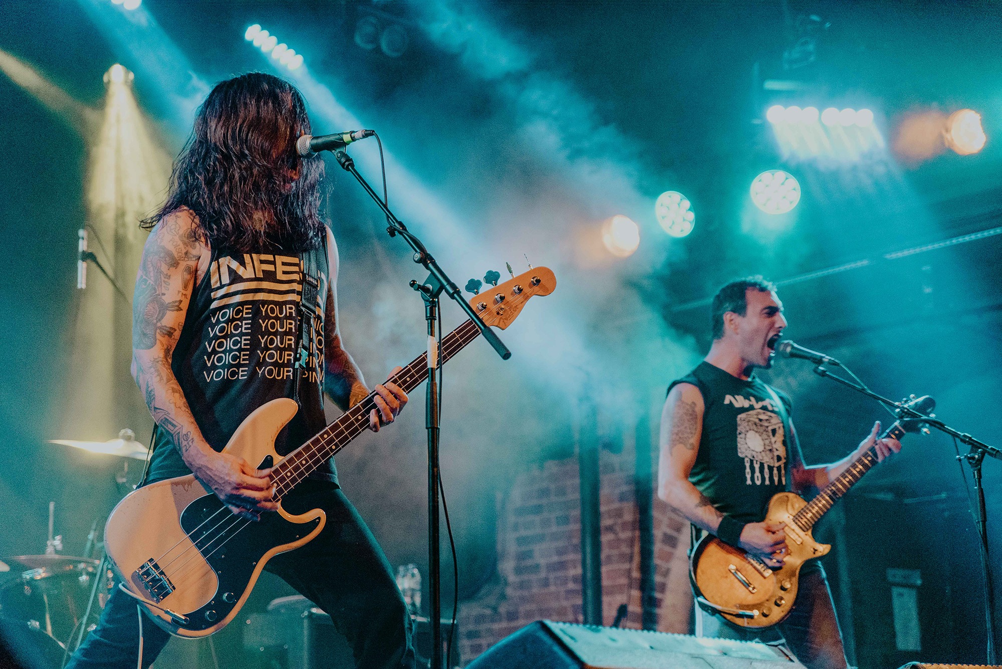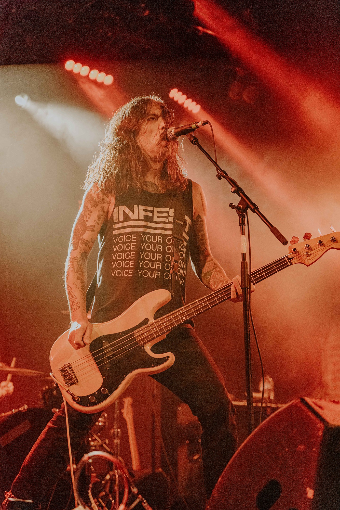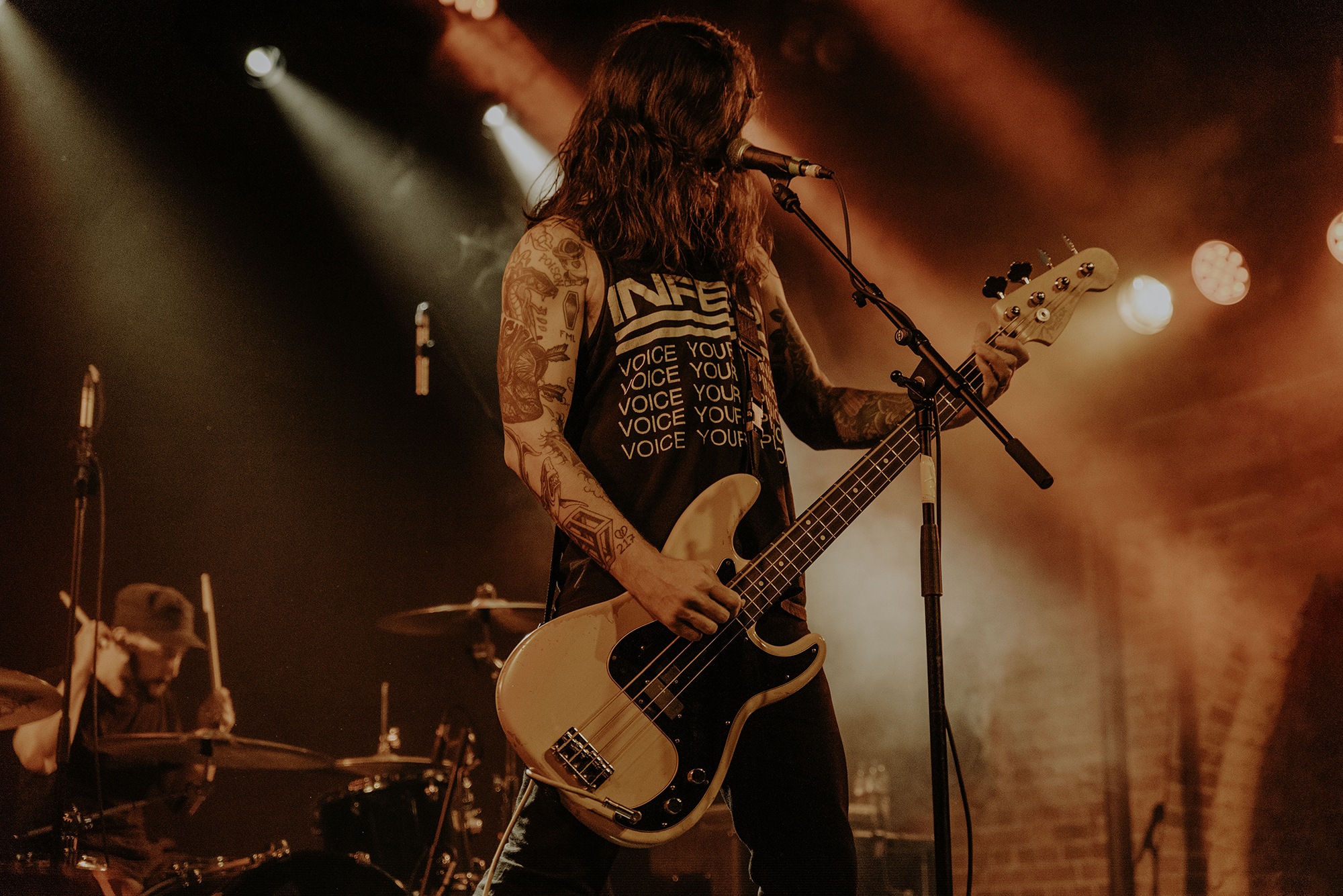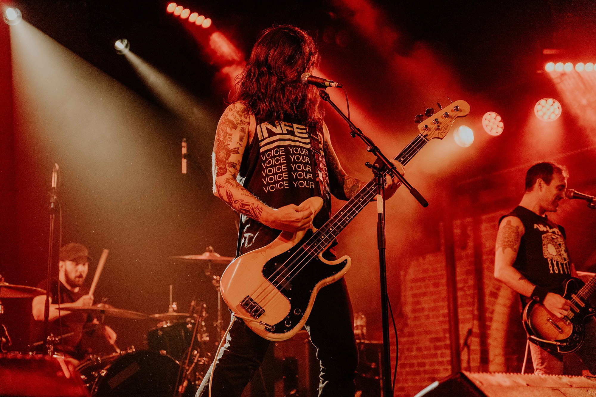 If there’s one band that could follow that display though, it’s CAVE IN. From the moment they kick into New Reality and follow it with the serpentine Blood Spiller, the crowd are putty in the quartet’s hands. They complete the opening trio with the sludge-laden Searchers Of Hell, playing with the biggest grins and the kind of consummate ease borne of decades in each other’s company. “I see you dusty old fucks,” laughs bassist Nate Newton, gleefully taunting, daring their older fans to mosh (“but you won’t, because you’re old”) before older number The End Of Our Rope Is A Noose rumbles forth. Its bluesy swagger is simply undeniable and thanks to those accusations of people not moshing – no matter how unserious – there’s more than a little neck movement when the titanic groove hits. They slow things down with the bluesy, almost country Reckoning but it’s no less intense; the four exude a magnetic charisma and love of performing that even with a fairly sparse lightshow they can be sure that all eyes are on them.