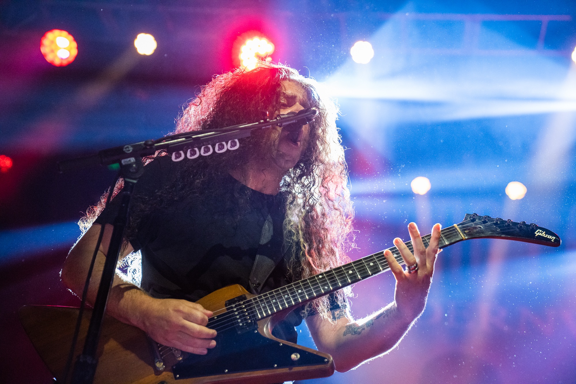 The biggest cheers and whistles are, of course, reserved for COHEED AND CAMBRIA. Roving orange spotlights herald their arrival, anticipation and the crowd building to a fever pitch before red lights pulse over the drums and Claudio Sanchez steps out to begin The Reaping. He’s almost outdone by the crowd but that’s nothing compared to the singing along to the title track of No World For Tomorrow. The atmosphere is electrifying, the mix is perfect and COHEED AND CAMBRIA themselves are utterly mesmerising; they’ve not even said a word for the first portion of their set but they don’t need to; the album is simply so good. Watching the crowd bounce to Feathers is a wonderful moment, as is hearing them be as loud as Claudio for the entire duration of the first portion of the set. On the explosive Gravemakers and Gunslingers the band seemingly find yet another gear, Claudio barrelling round the stage even during squealing solos and dancing with an infectious glee it’s impossible not to be swept up in as he loses himself to the music.Â