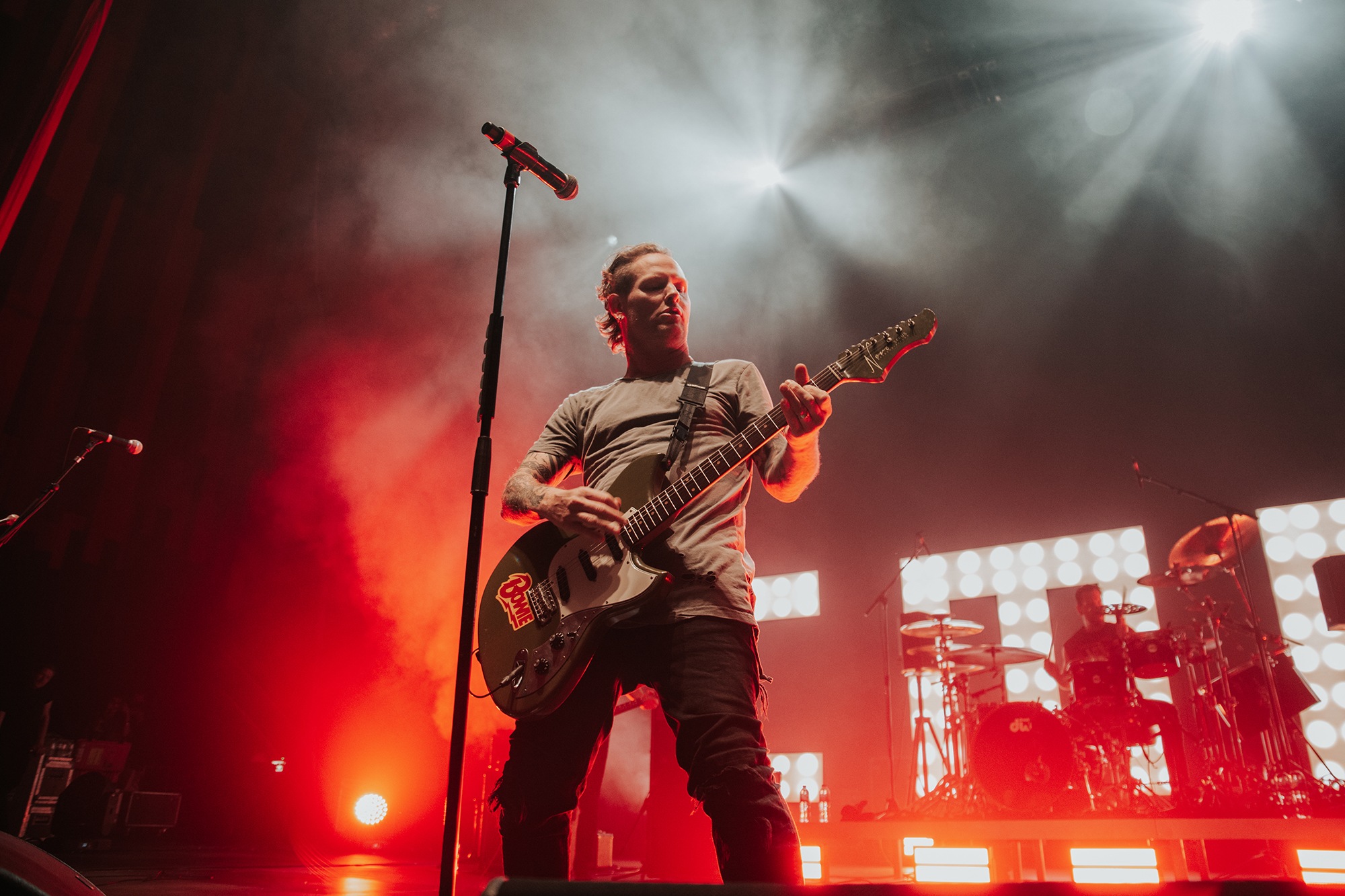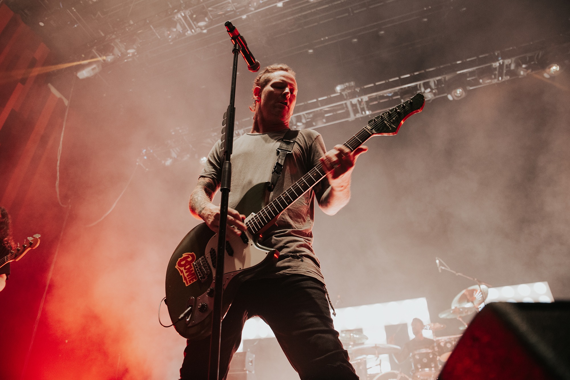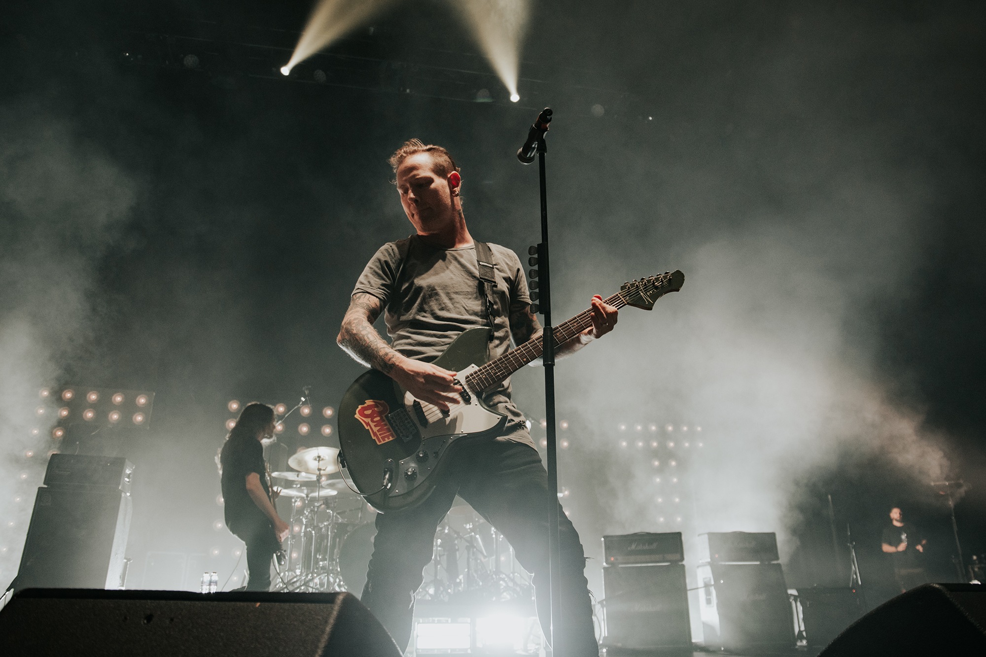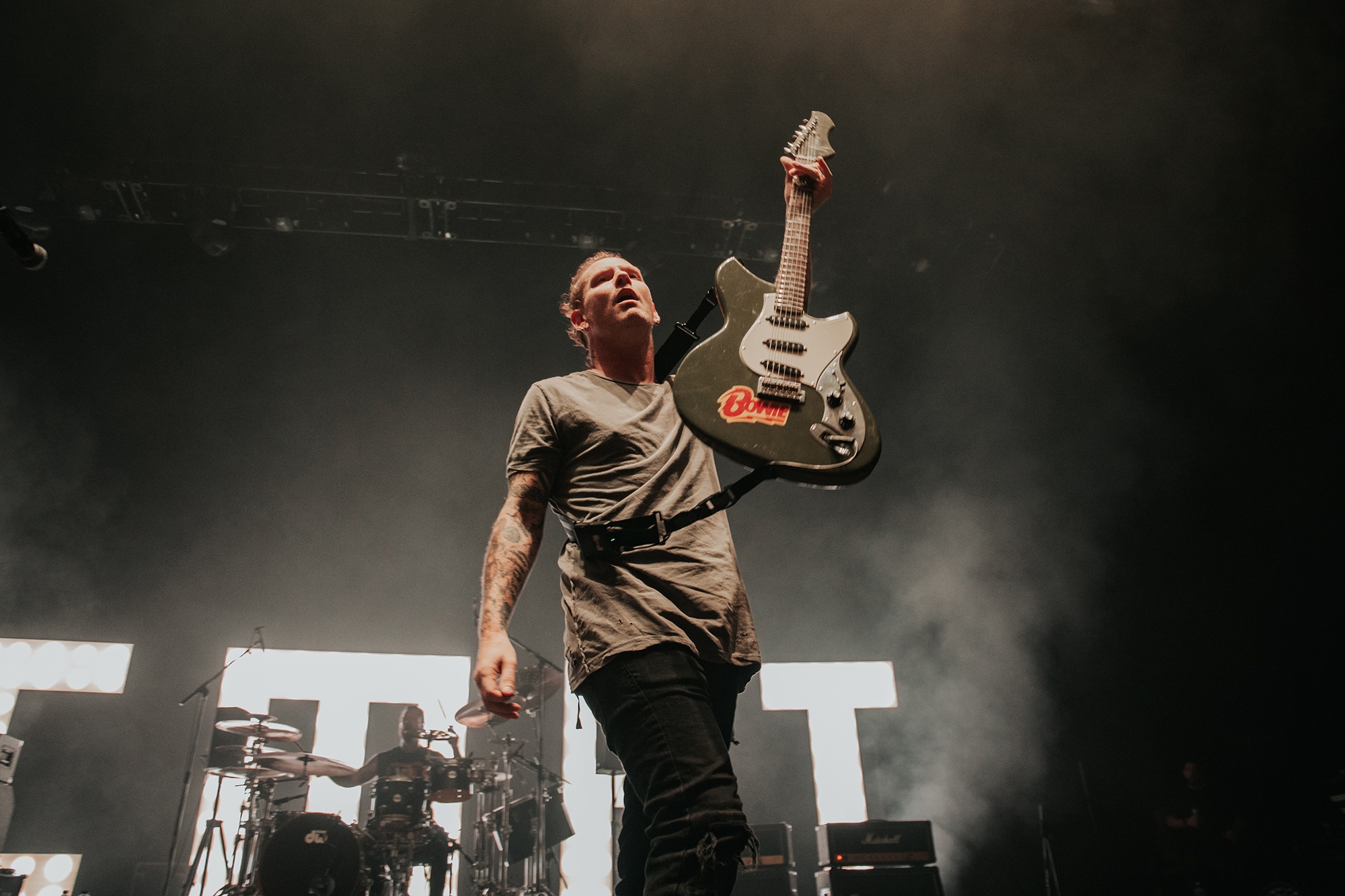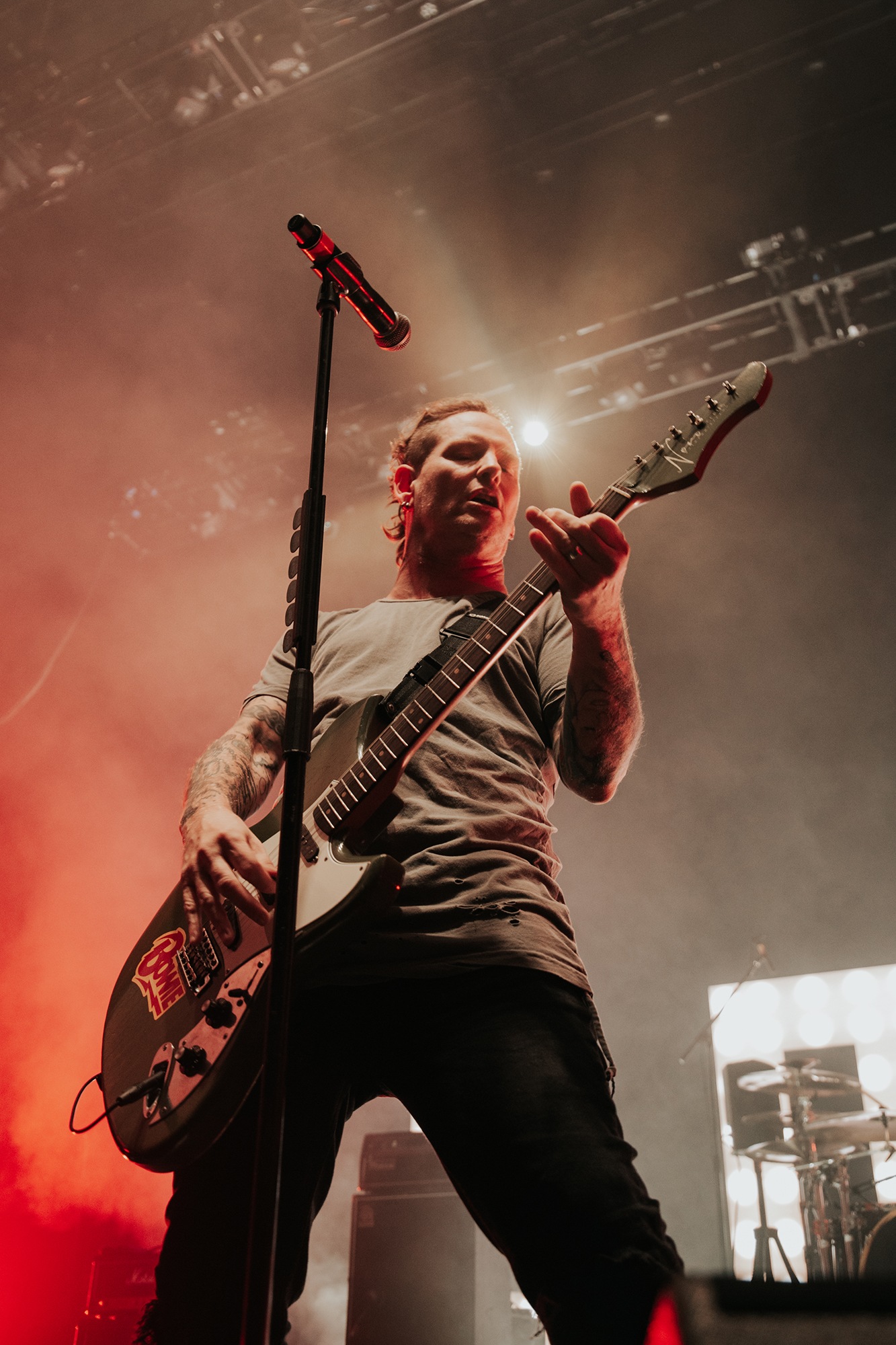 Though he may be somewhat tethered to the spot by a microphone, he uses his spare time to skulk around the stage as he plays and shout encouragement at the audience that aren’t moving anywhere near enough. In a change of pace from the fast tempo of much of his discography, Taylor pulls up a stool to sing the few ballads in his set – but not before a short rendition of the Spongebob Squarepants theme tune. It’s at this point that he finally satisfies the SLIPKNOT fans in the audience and plays an acoustic rendition of Snuff, arguably one of the more emotional and moving of their songs. In a complete 180 in mood, he throws the stool away and ditches the guitar so he can move around the stage, all while singing STONE SOUR’s Absolute Zero, which the audience are very much on board with. Taylor encourages a singalong, and the audience are more than happy to oblige, the entire arena echoing with the instantly recognisable vocal hook.