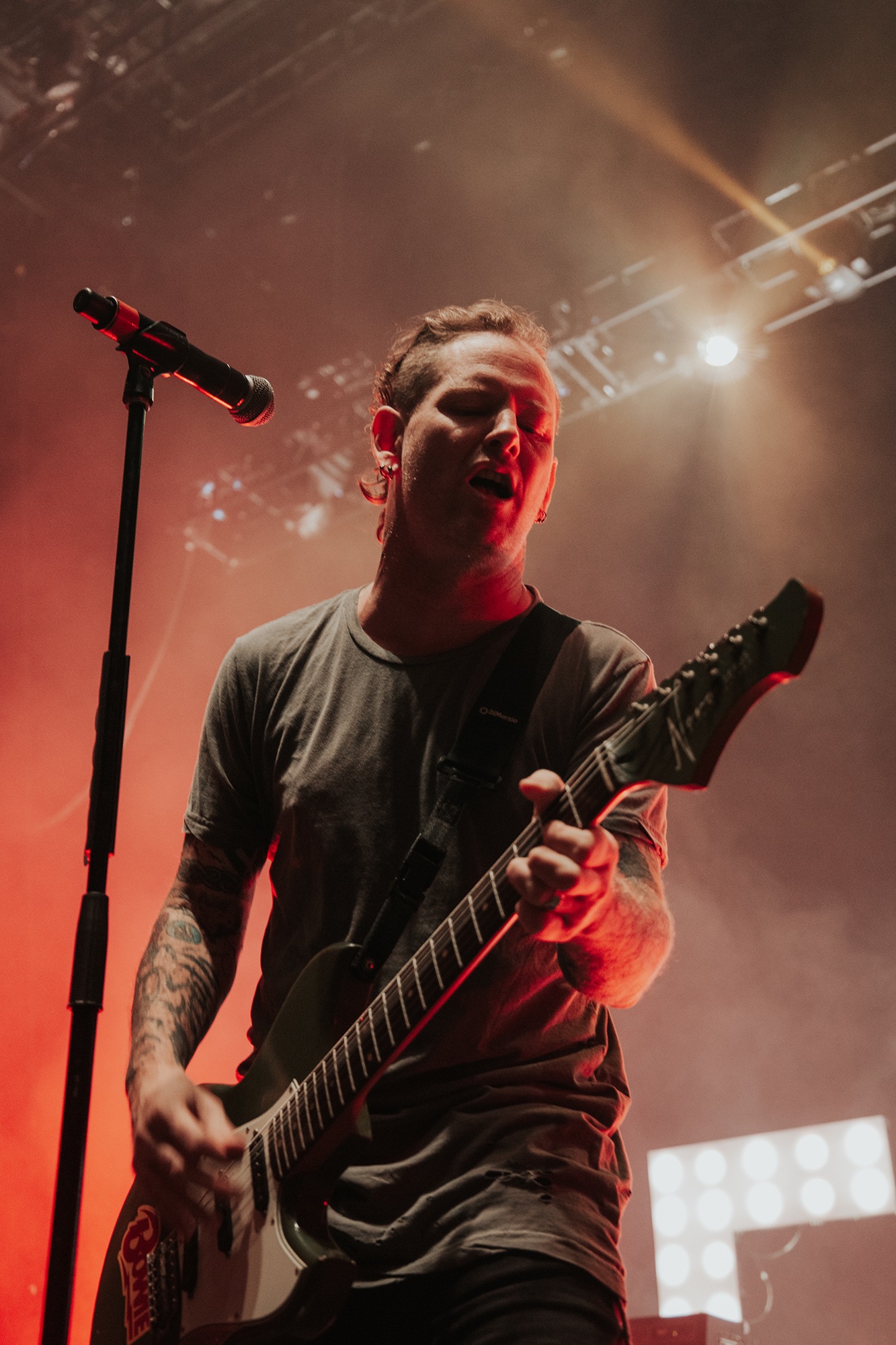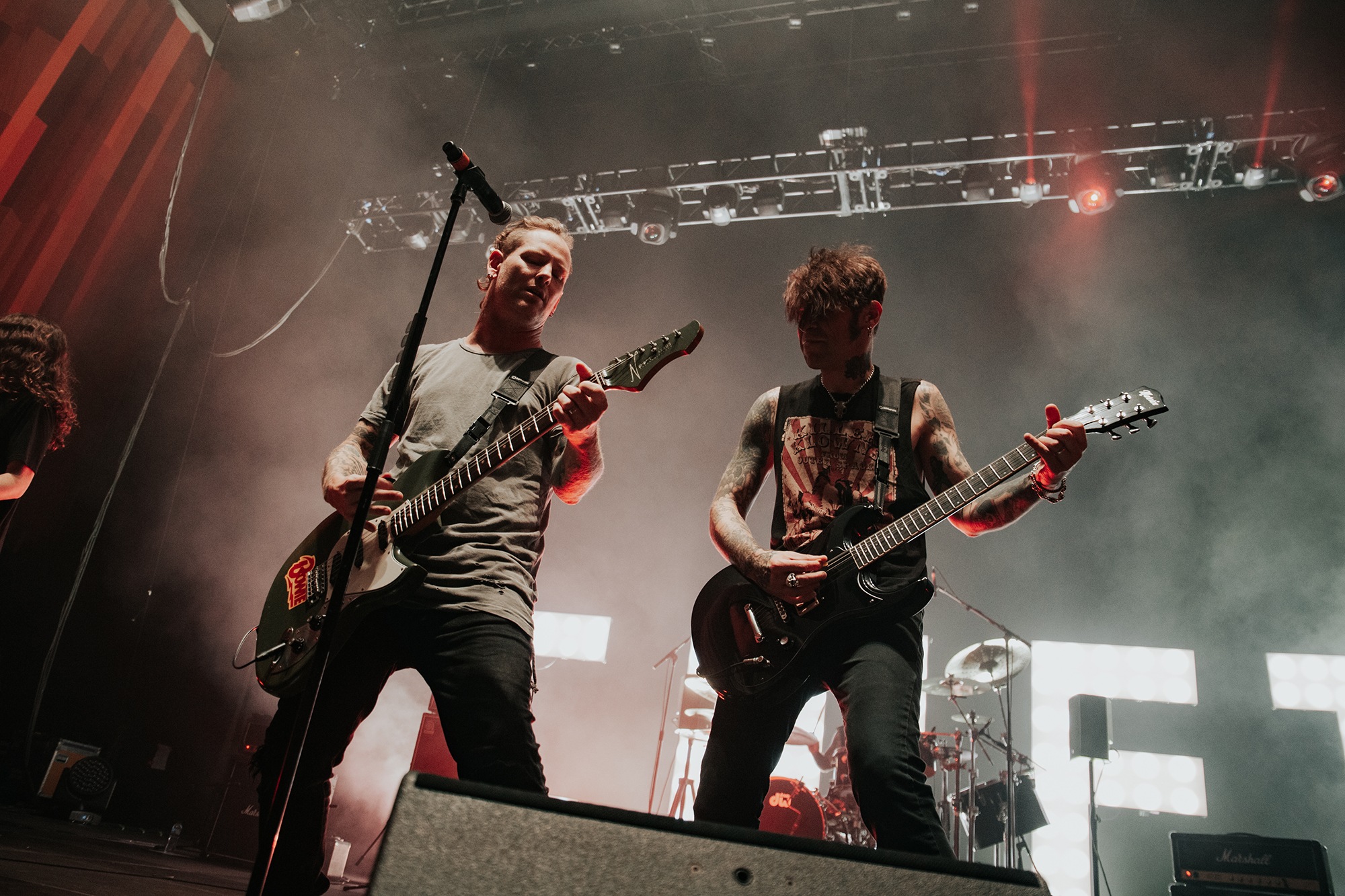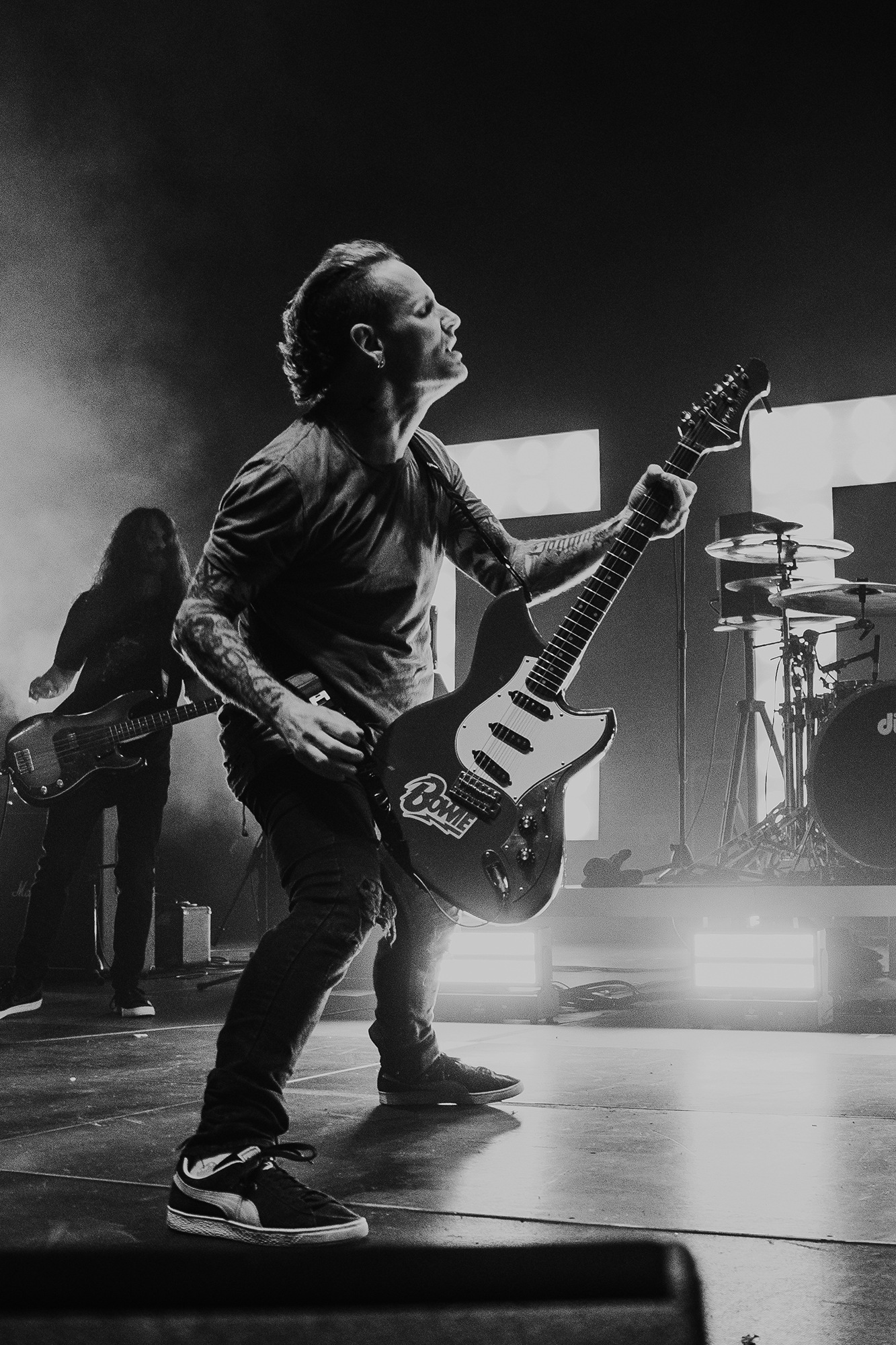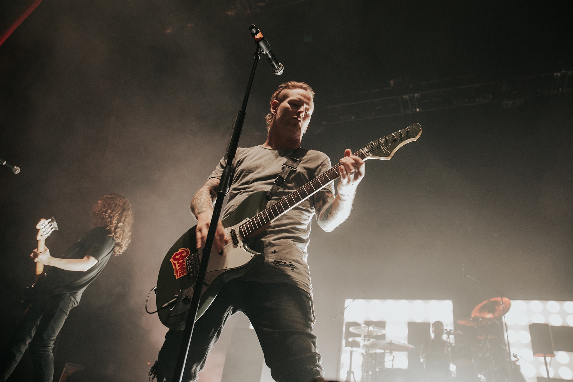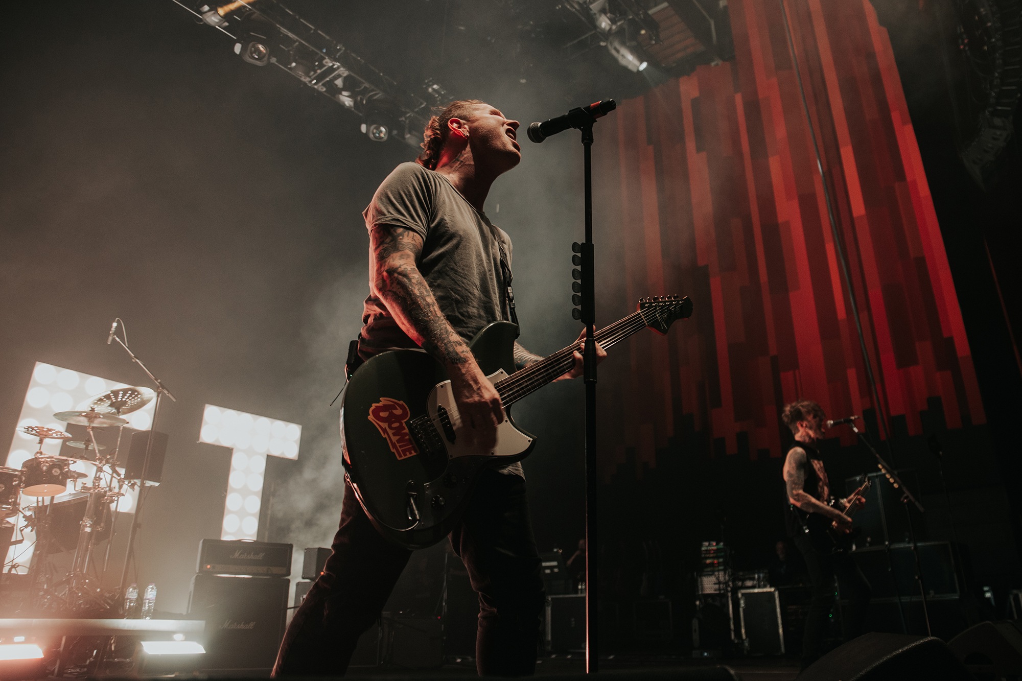 Though he may be somewhat tethered to the spot by a microphone, he uses his spare time to skulk around the stage as he plays and shout encouragement at the audience that aren’t moving anywhere near enough. In a change of pace from the fast tempo of much of his discography, Taylor pulls up a stool to sing the few ballads in his set – but not before a short rendition of the Spongebob Squarepants theme tune. It’s at this point that he finally satisfies the SLIPKNOT fans in the audience and plays an acoustic rendition of Snuff, arguably one of the more emotional and moving of their songs. In a complete 180 in mood, he throws the stool away and ditches the guitar so he can move around the stage, all while singing STONE SOUR’s Absolute Zero, which the audience are very much on board with. Taylor encourages a singalong, and the audience are more than happy to oblige, the entire arena echoing with the instantly recognisable vocal hook.