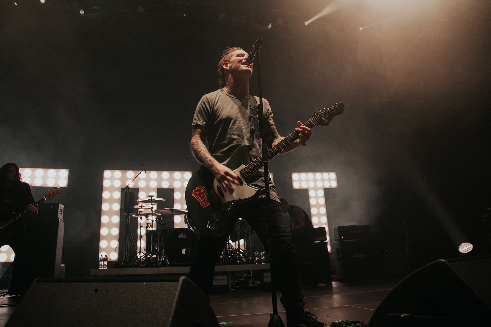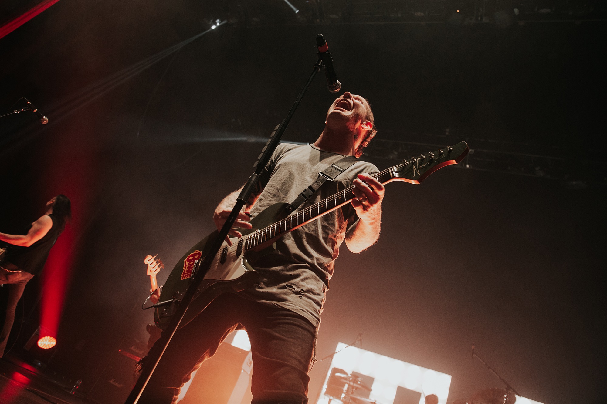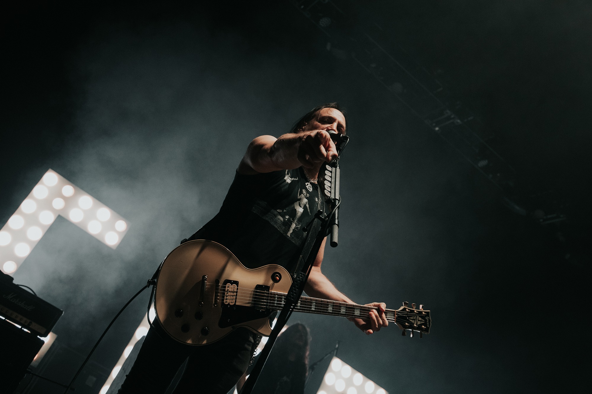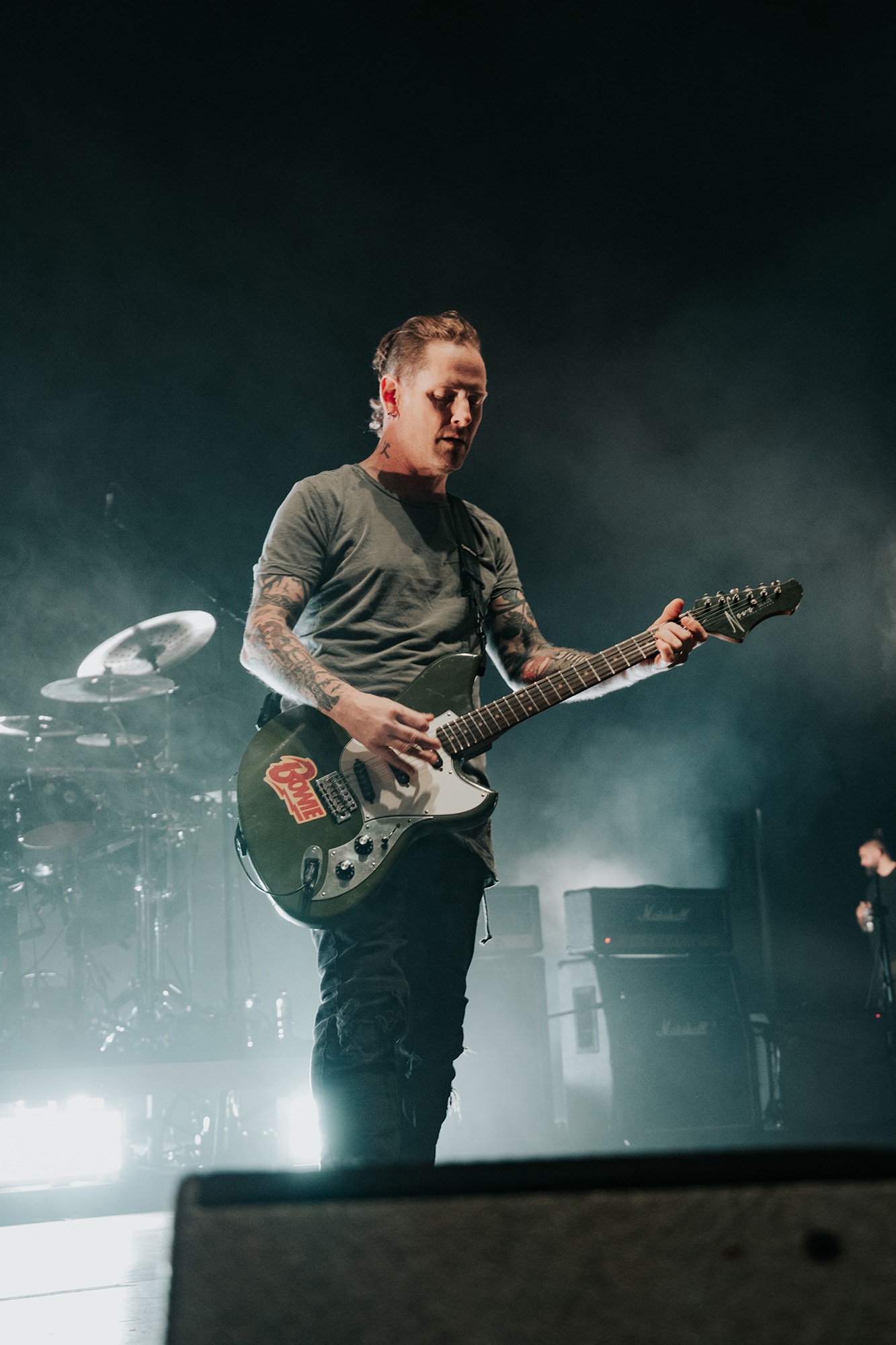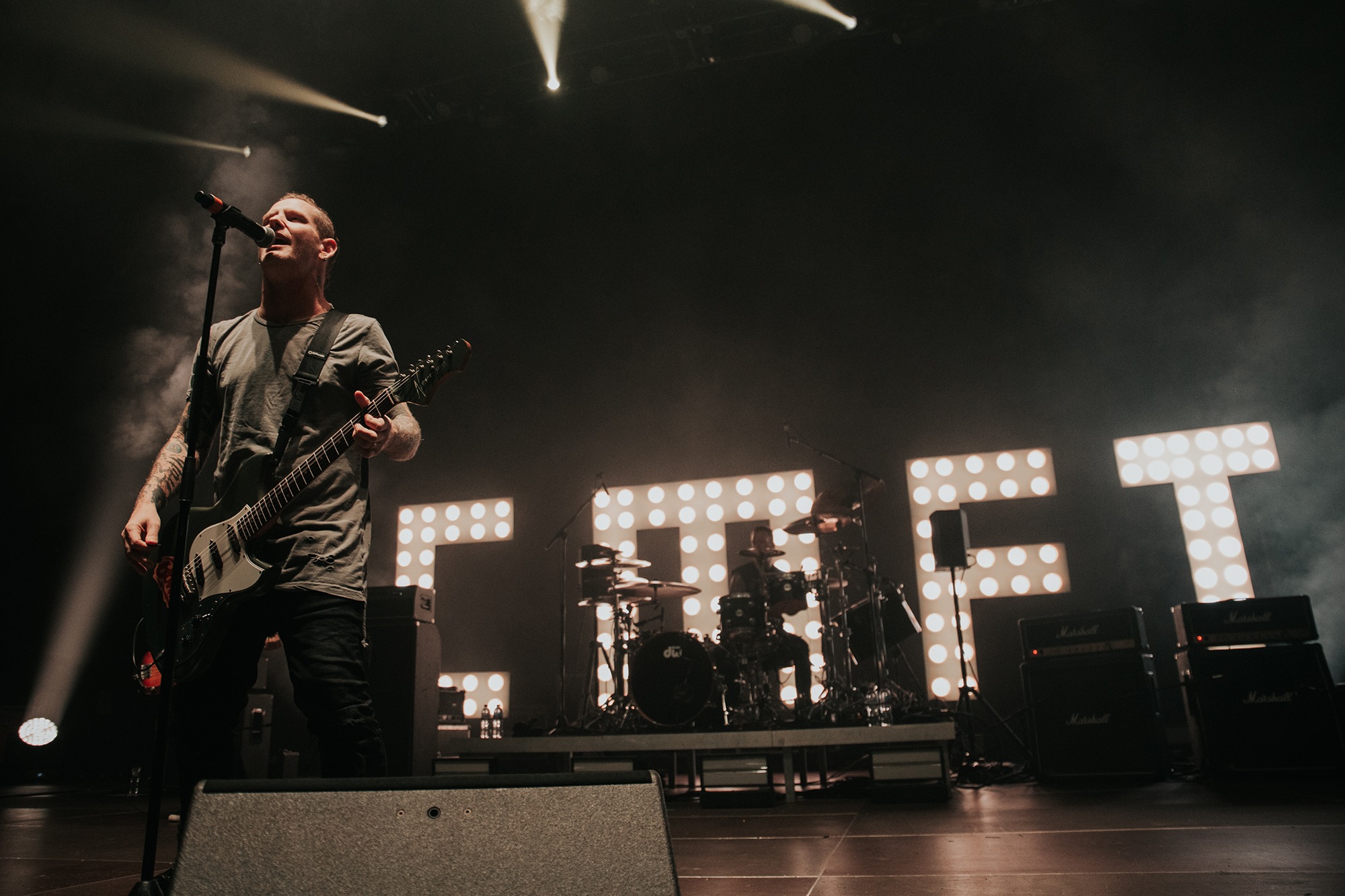 Though he may be somewhat tethered to the spot by a microphone, he uses his spare time to skulk around the stage as he plays and shout encouragement at the audience that aren’t moving anywhere near enough. In a change of pace from the fast tempo of much of his discography, Taylor pulls up a stool to sing the few ballads in his set – but not before a short rendition of the Spongebob Squarepants theme tune. It’s at this point that he finally satisfies the SLIPKNOT fans in the audience and plays an acoustic rendition of Snuff, arguably one of the more emotional and moving of their songs. In a complete 180 in mood, he throws the stool away and ditches the guitar so he can move around the stage, all while singing STONE SOUR’s Absolute Zero, which the audience are very much on board with. Taylor encourages a singalong, and the audience are more than happy to oblige, the entire arena echoing with the instantly recognisable vocal hook.