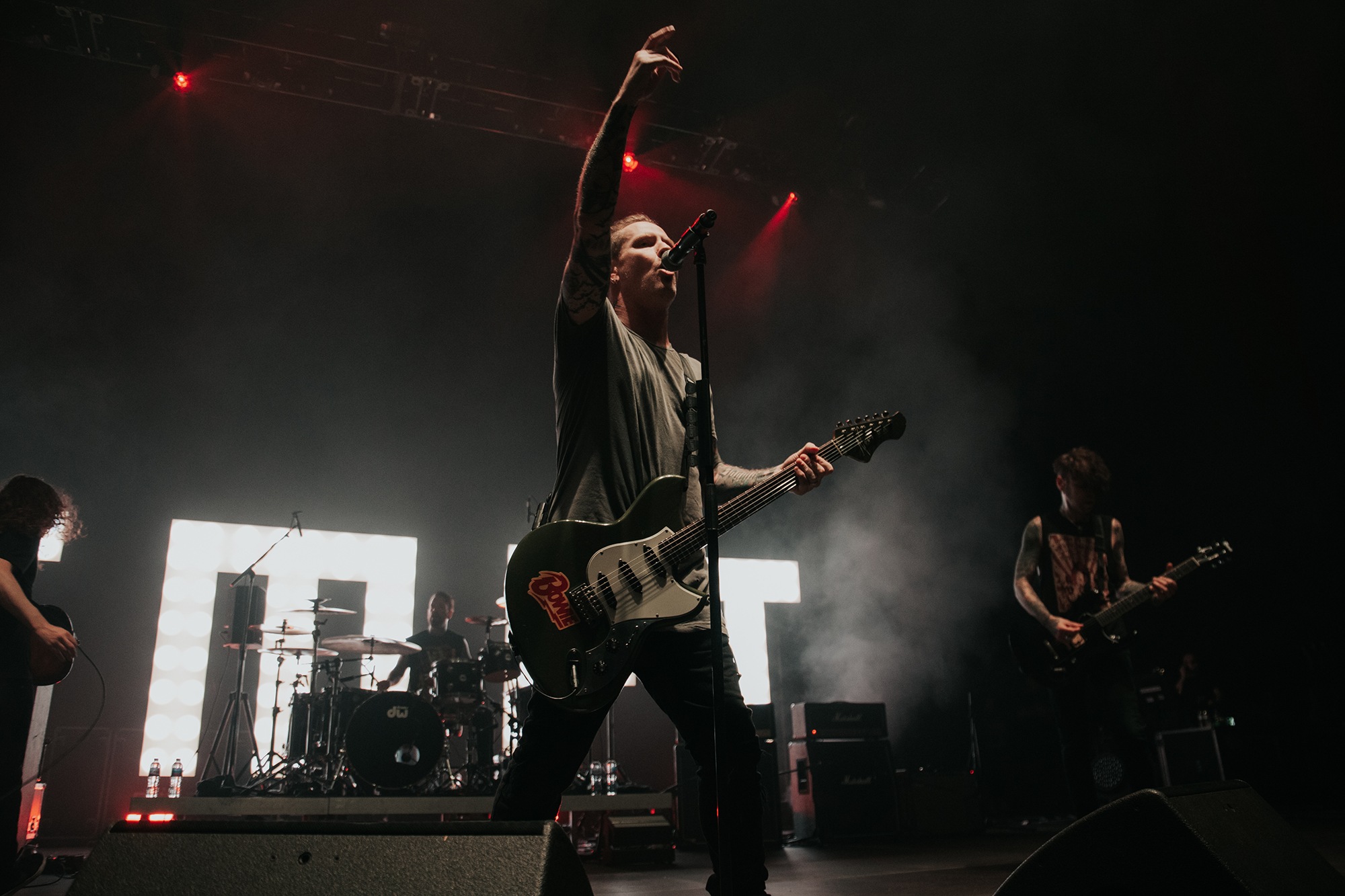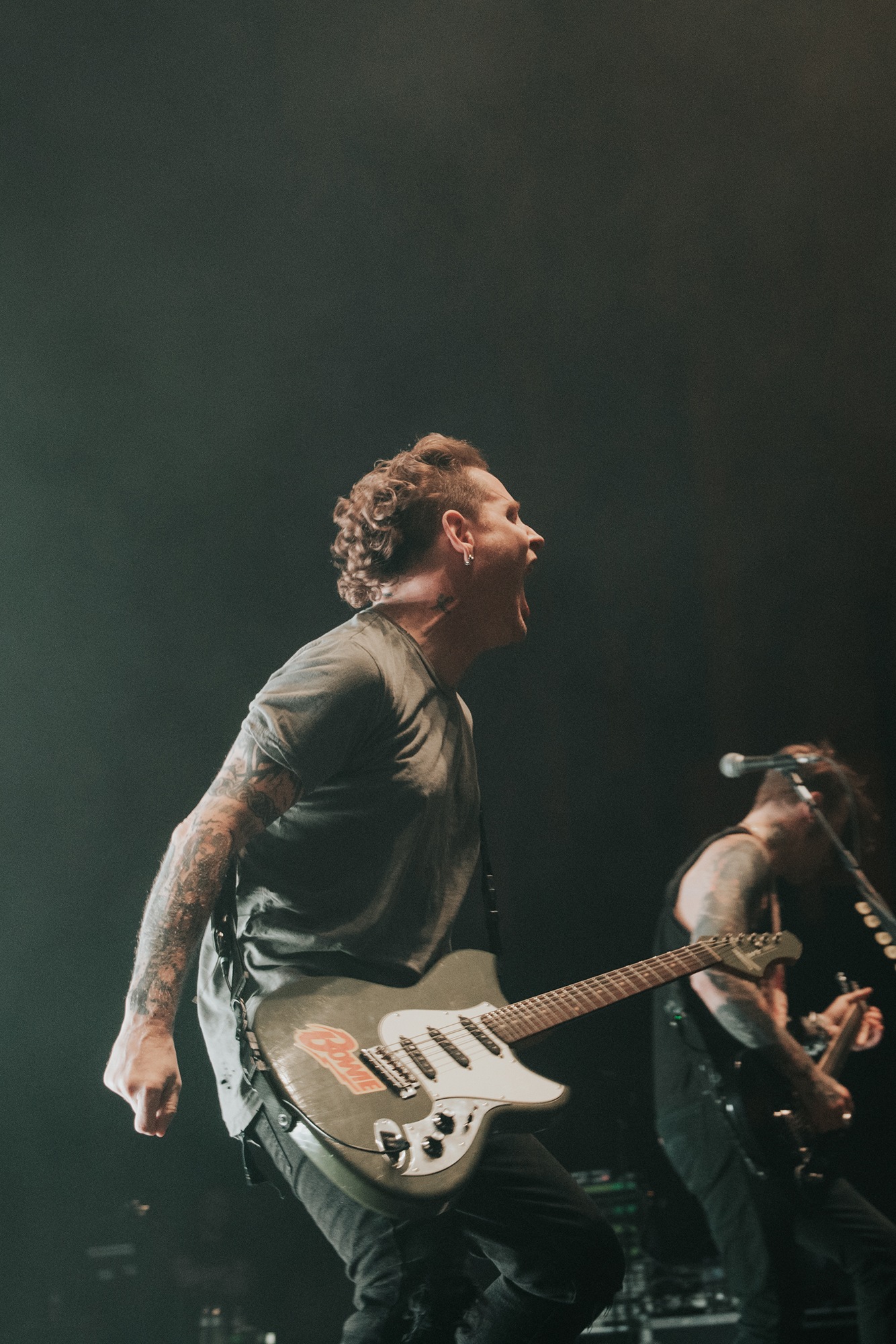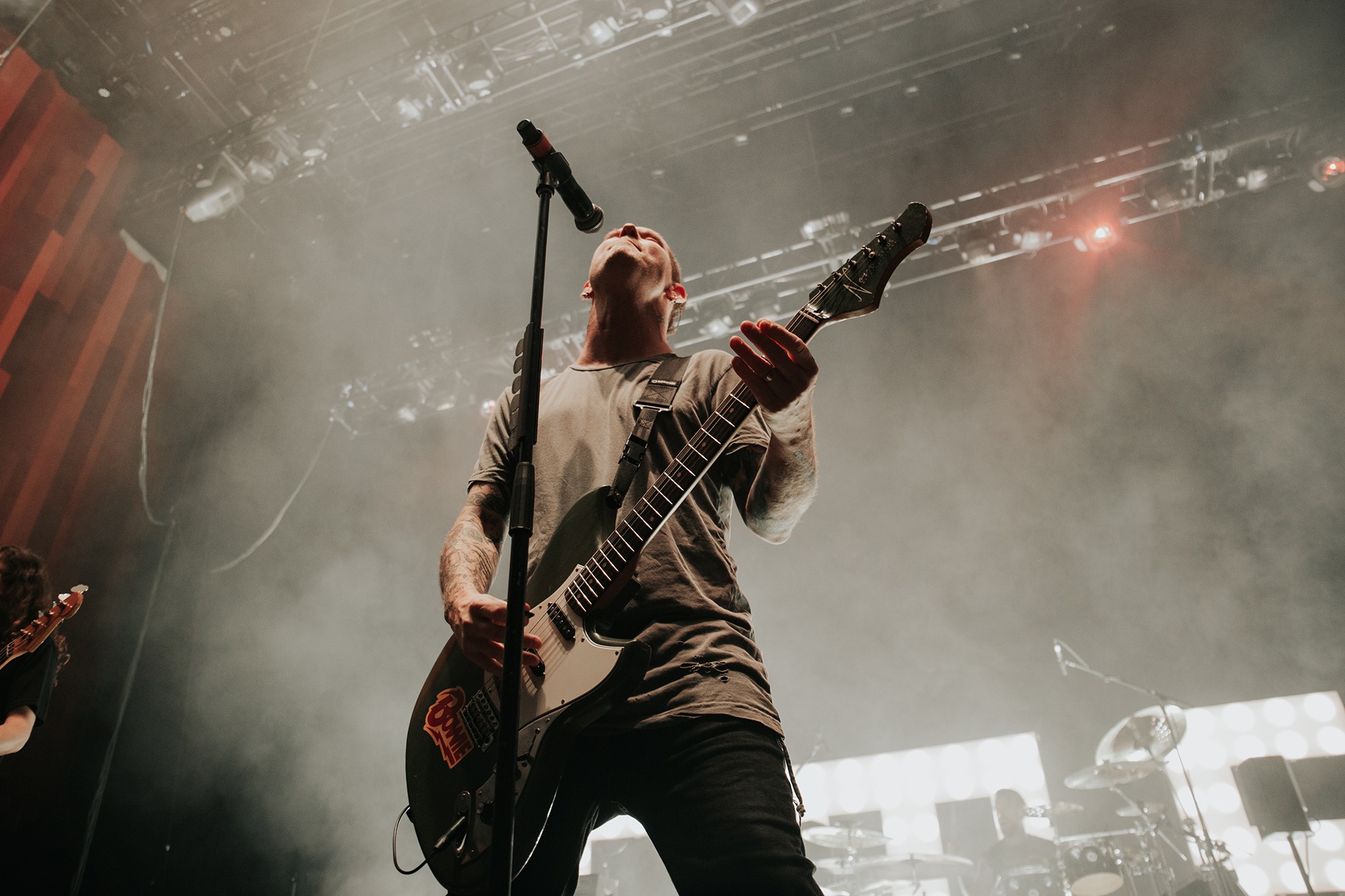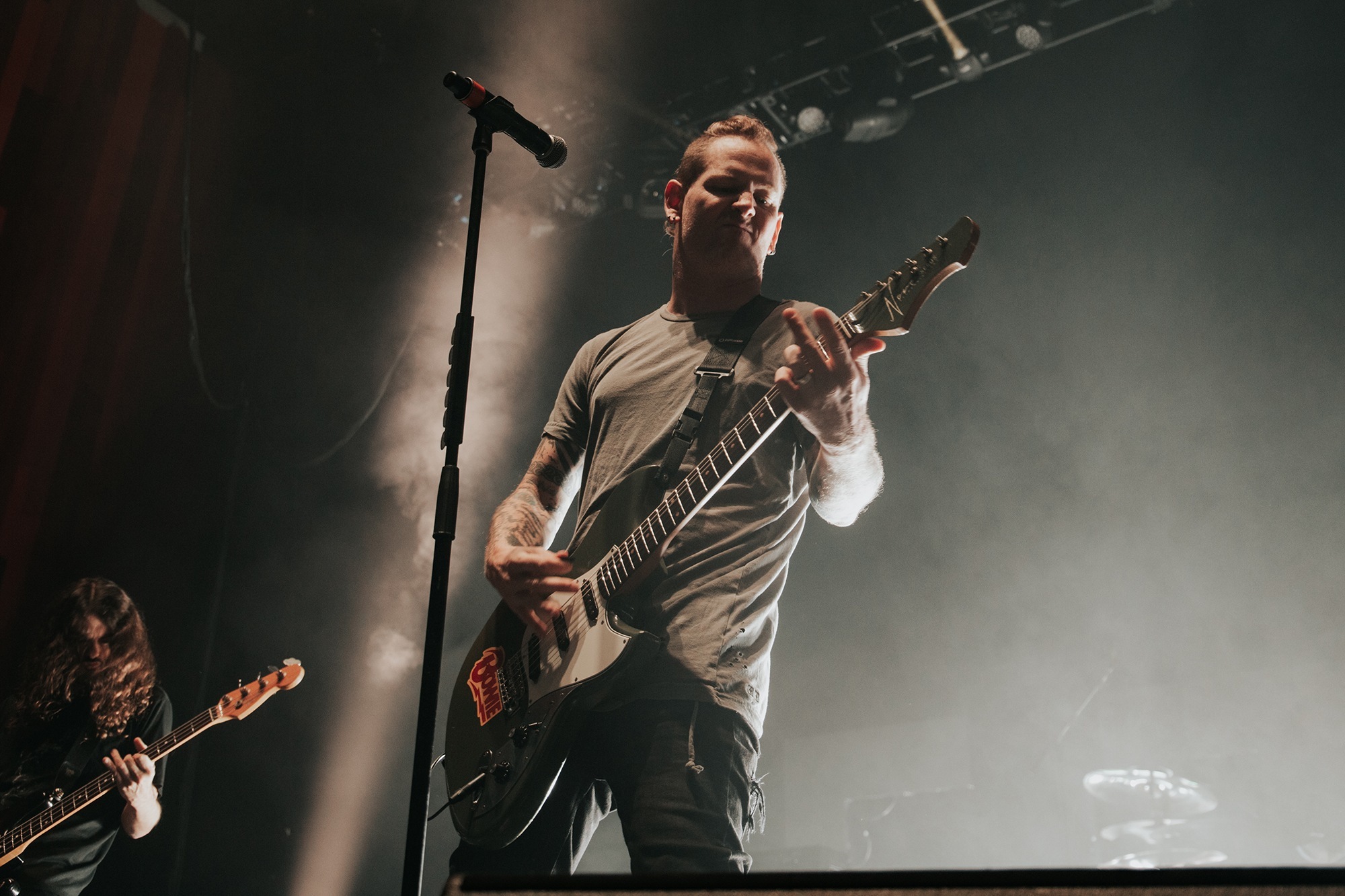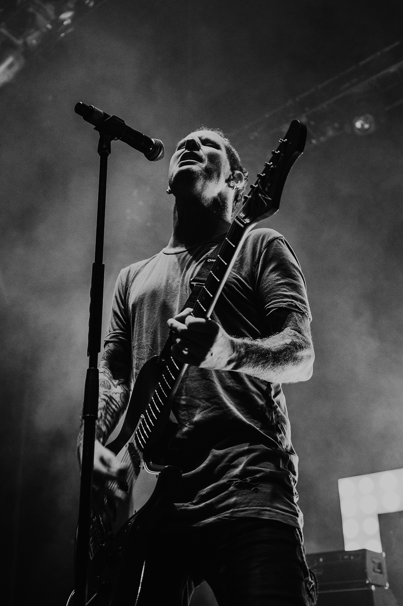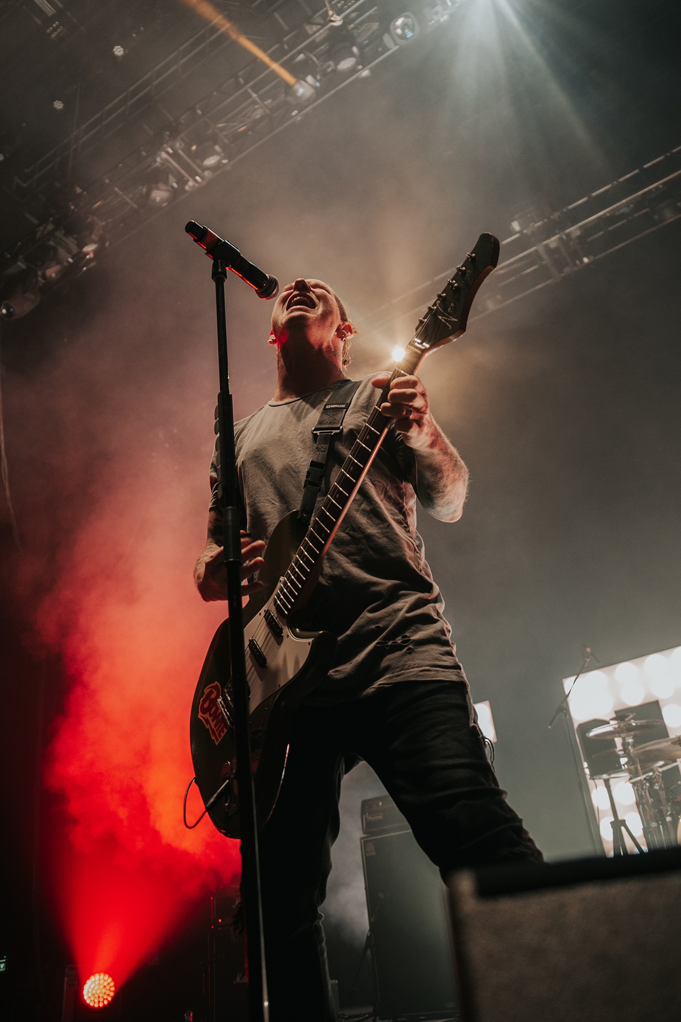 Though he may be somewhat tethered to the spot by a microphone, he uses his spare time to skulk around the stage as he plays and shout encouragement at the audience that aren’t moving anywhere near enough. In a change of pace from the fast tempo of much of his discography, Taylor pulls up a stool to sing the few ballads in his set – but not before a short rendition of the Spongebob Squarepants theme tune. It’s at this point that he finally satisfies the SLIPKNOT fans in the audience and plays an acoustic rendition of Snuff, arguably one of the more emotional and moving of their songs. In a complete 180 in mood, he throws the stool away and ditches the guitar so he can move around the stage, all while singing STONE SOUR’s Absolute Zero, which the audience are very much on board with. Taylor encourages a singalong, and the audience are more than happy to oblige, the entire arena echoing with the instantly recognisable vocal hook.