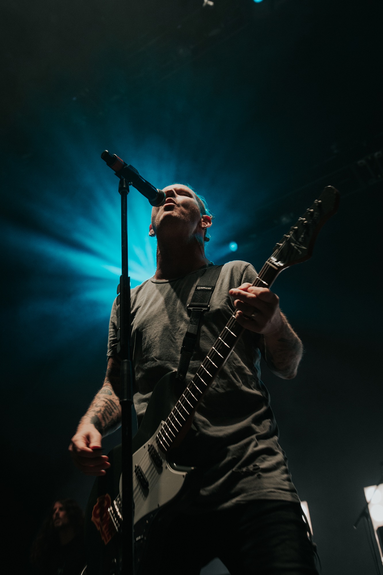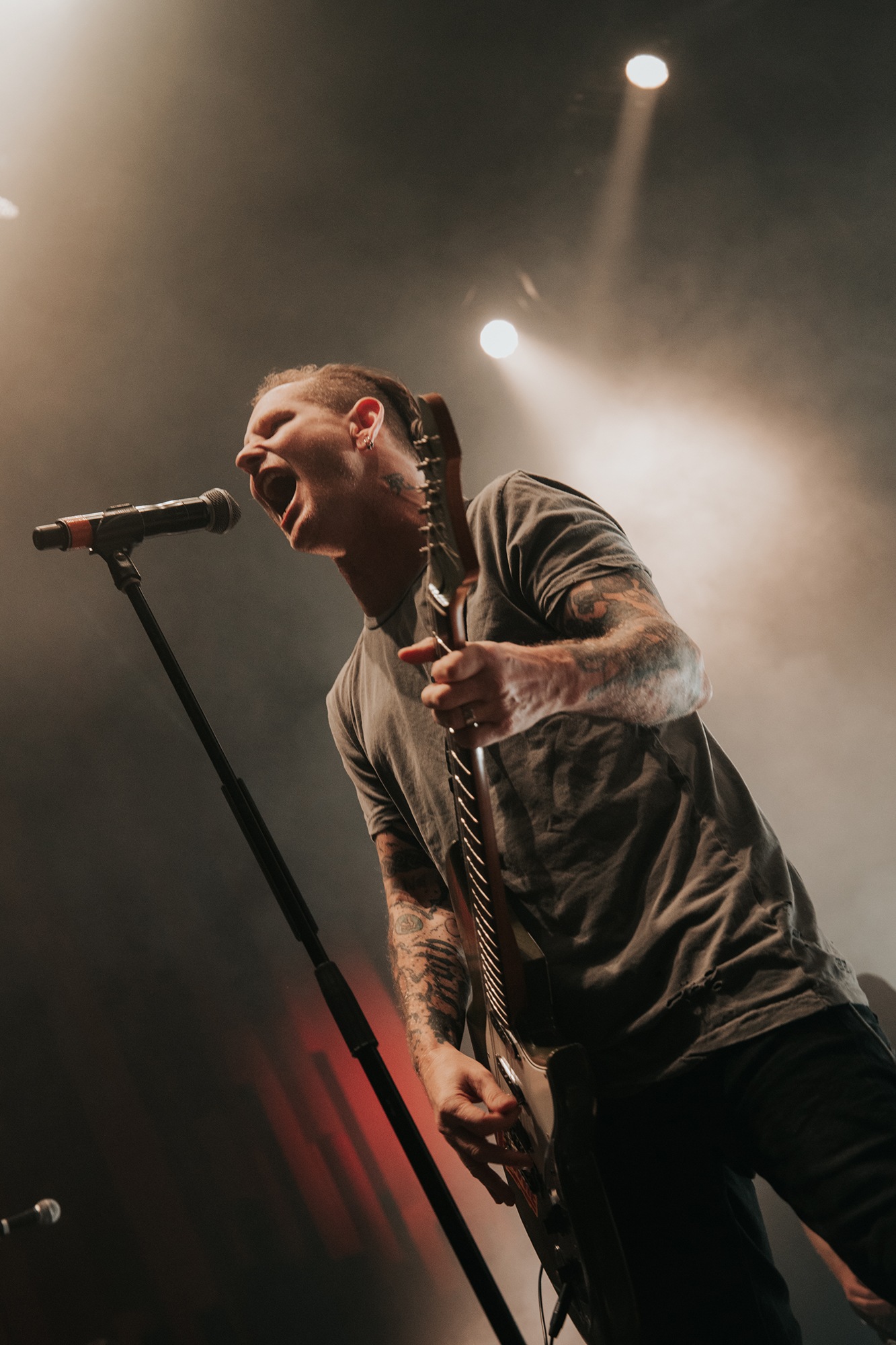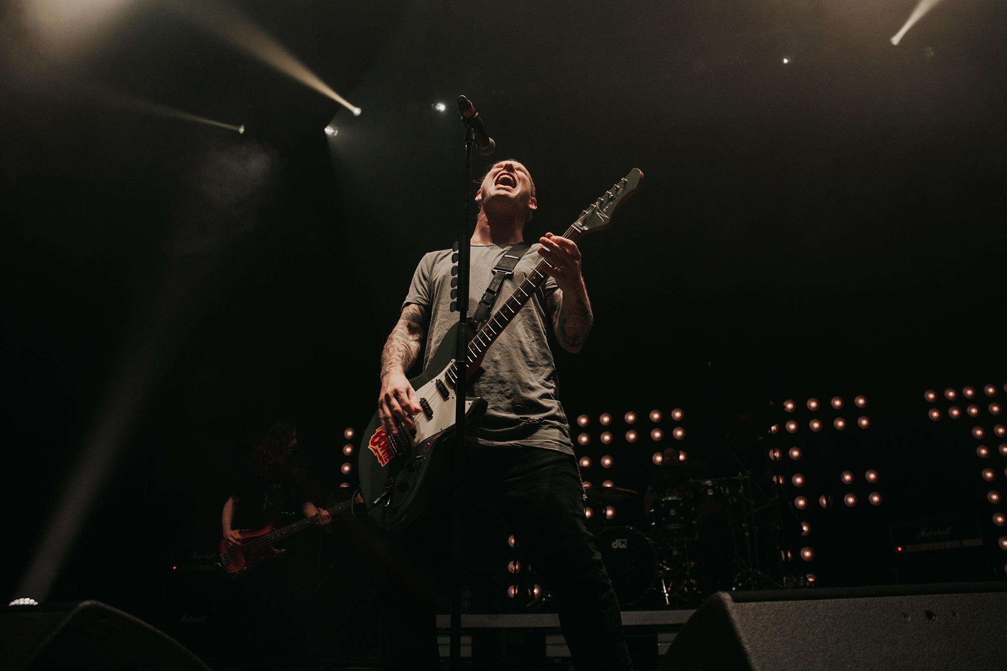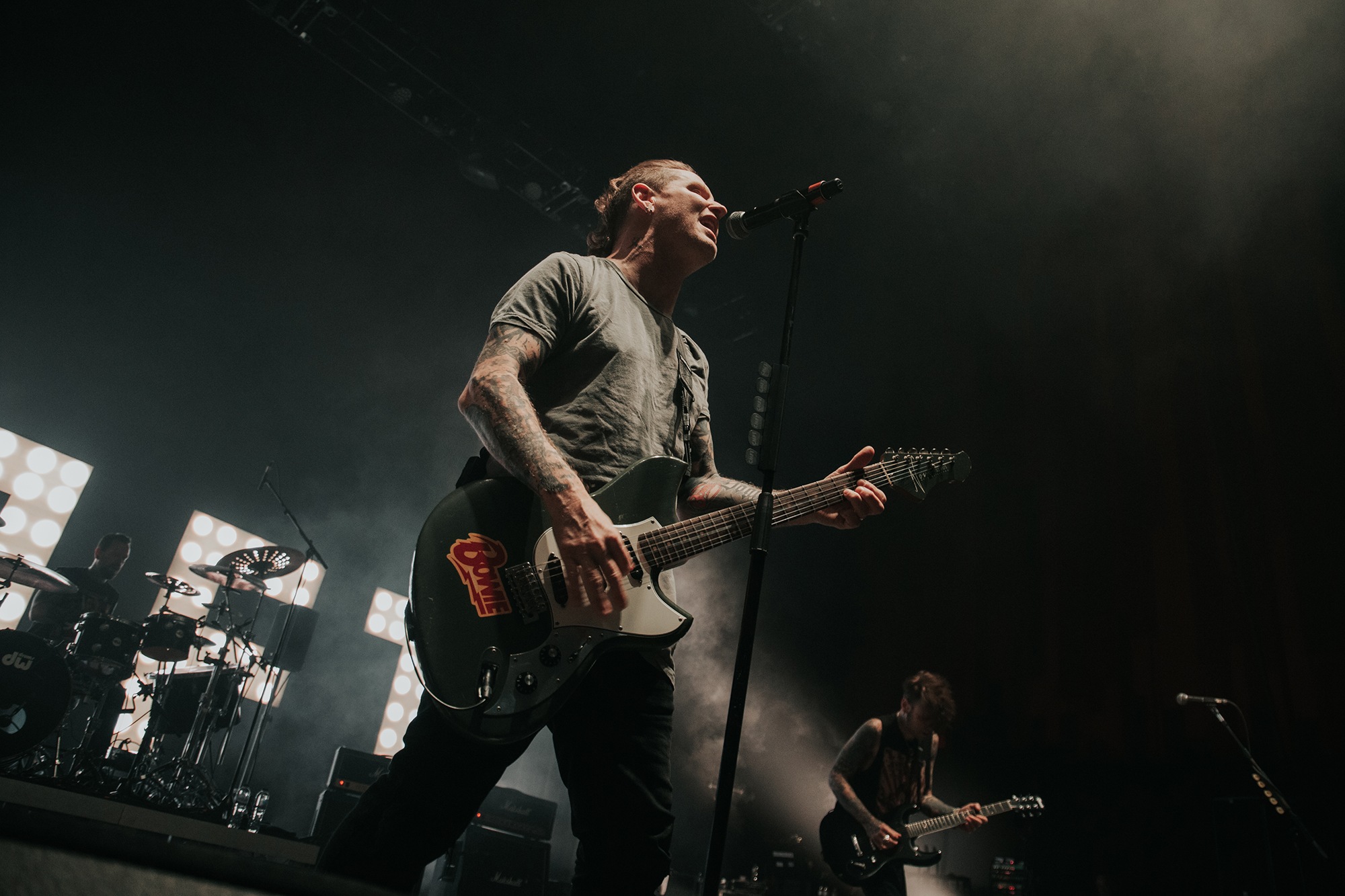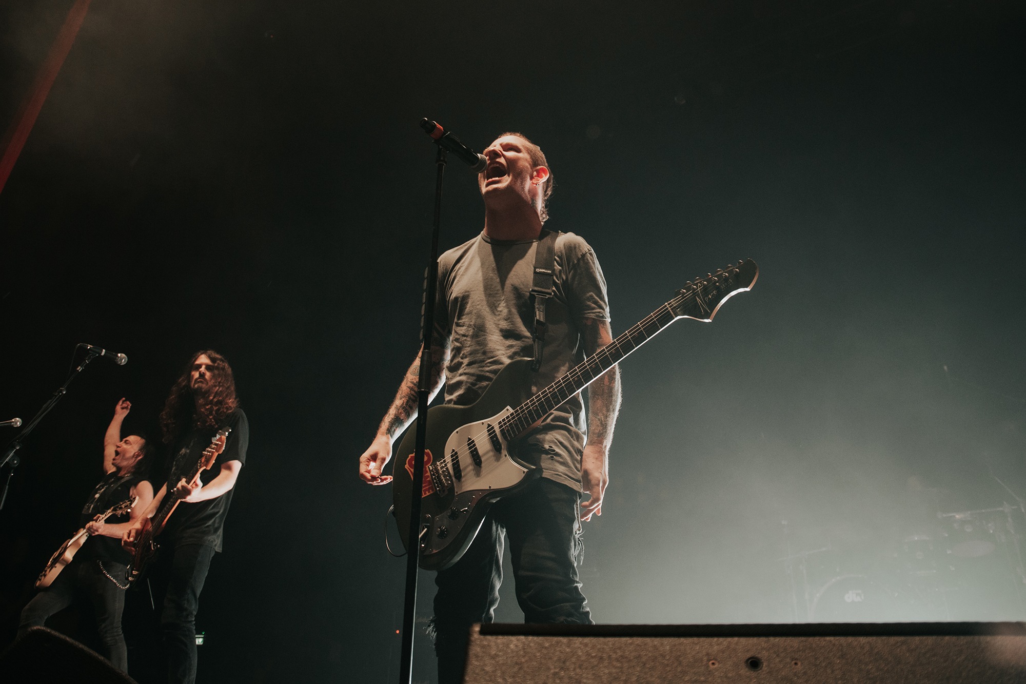 Though he may be somewhat tethered to the spot by a microphone, he uses his spare time to skulk around the stage as he plays and shout encouragement at the audience that aren’t moving anywhere near enough. In a change of pace from the fast tempo of much of his discography, Taylor pulls up a stool to sing the few ballads in his set – but not before a short rendition of the Spongebob Squarepants theme tune. It’s at this point that he finally satisfies the SLIPKNOT fans in the audience and plays an acoustic rendition of Snuff, arguably one of the more emotional and moving of their songs. In a complete 180 in mood, he throws the stool away and ditches the guitar so he can move around the stage, all while singing STONE SOUR’s Absolute Zero, which the audience are very much on board with. Taylor encourages a singalong, and the audience are more than happy to oblige, the entire arena echoing with the instantly recognisable vocal hook.