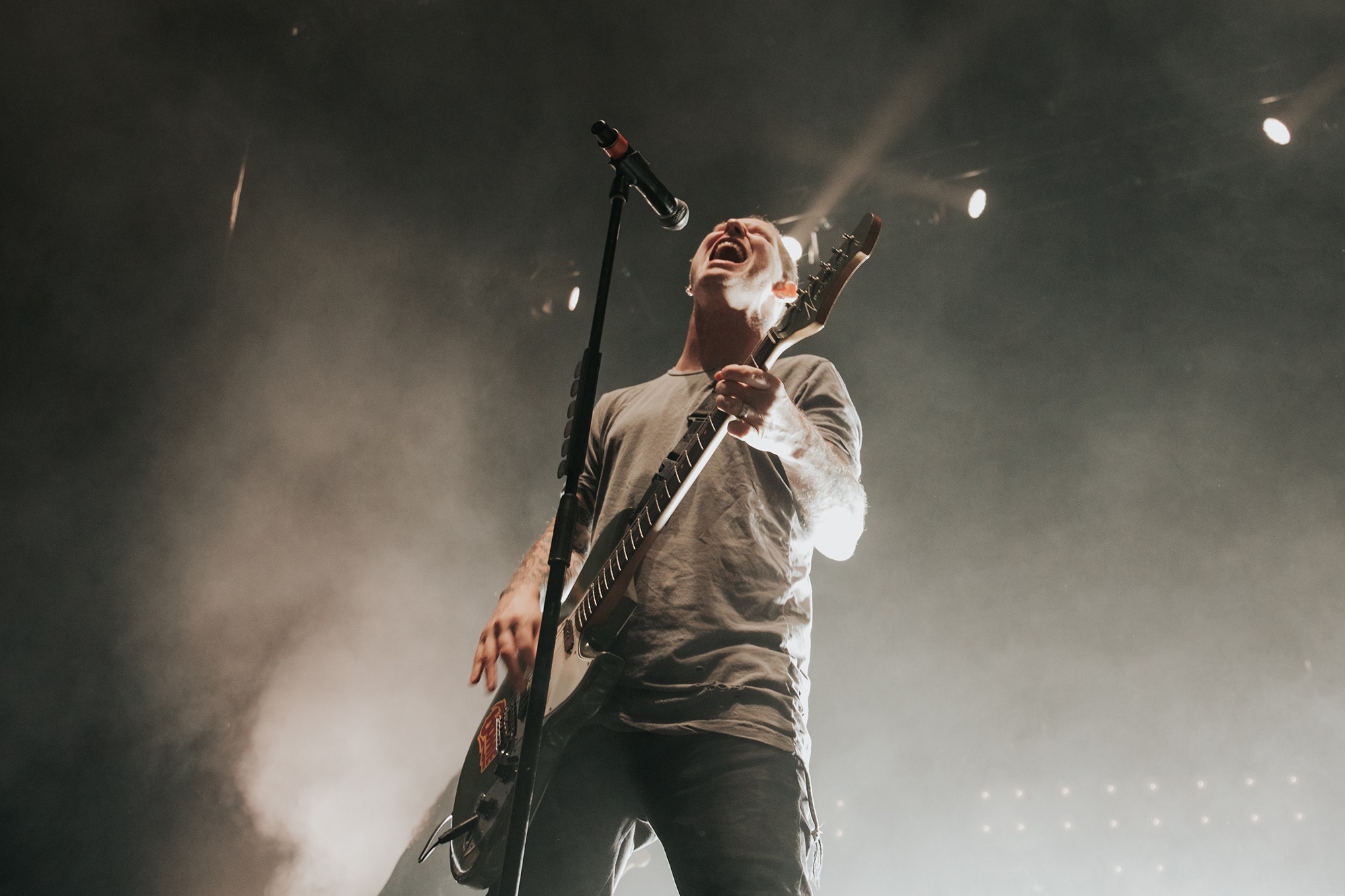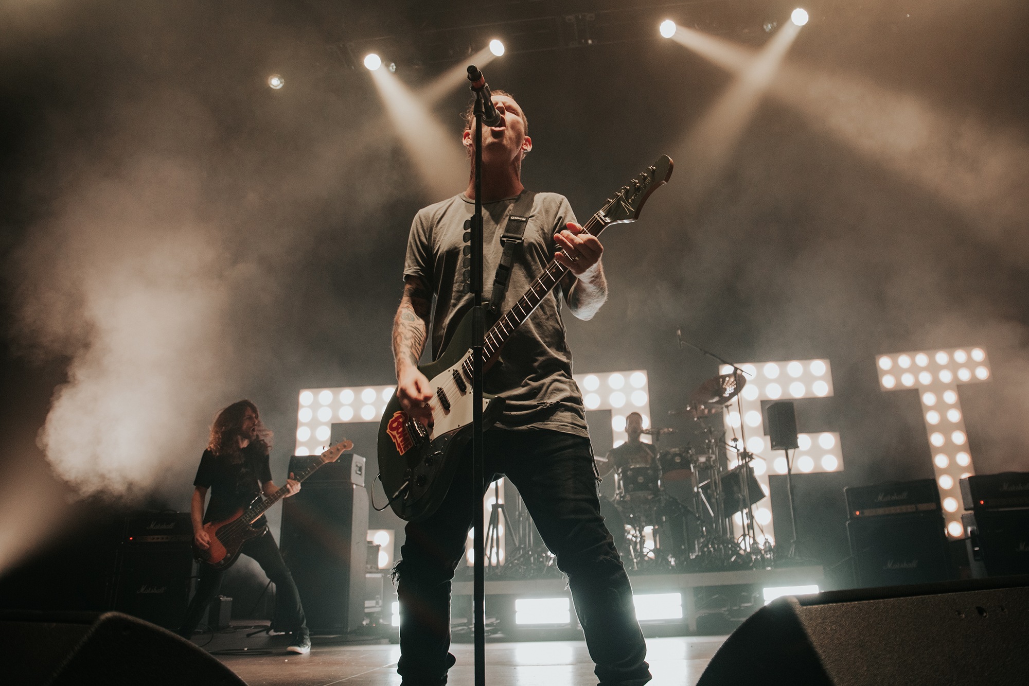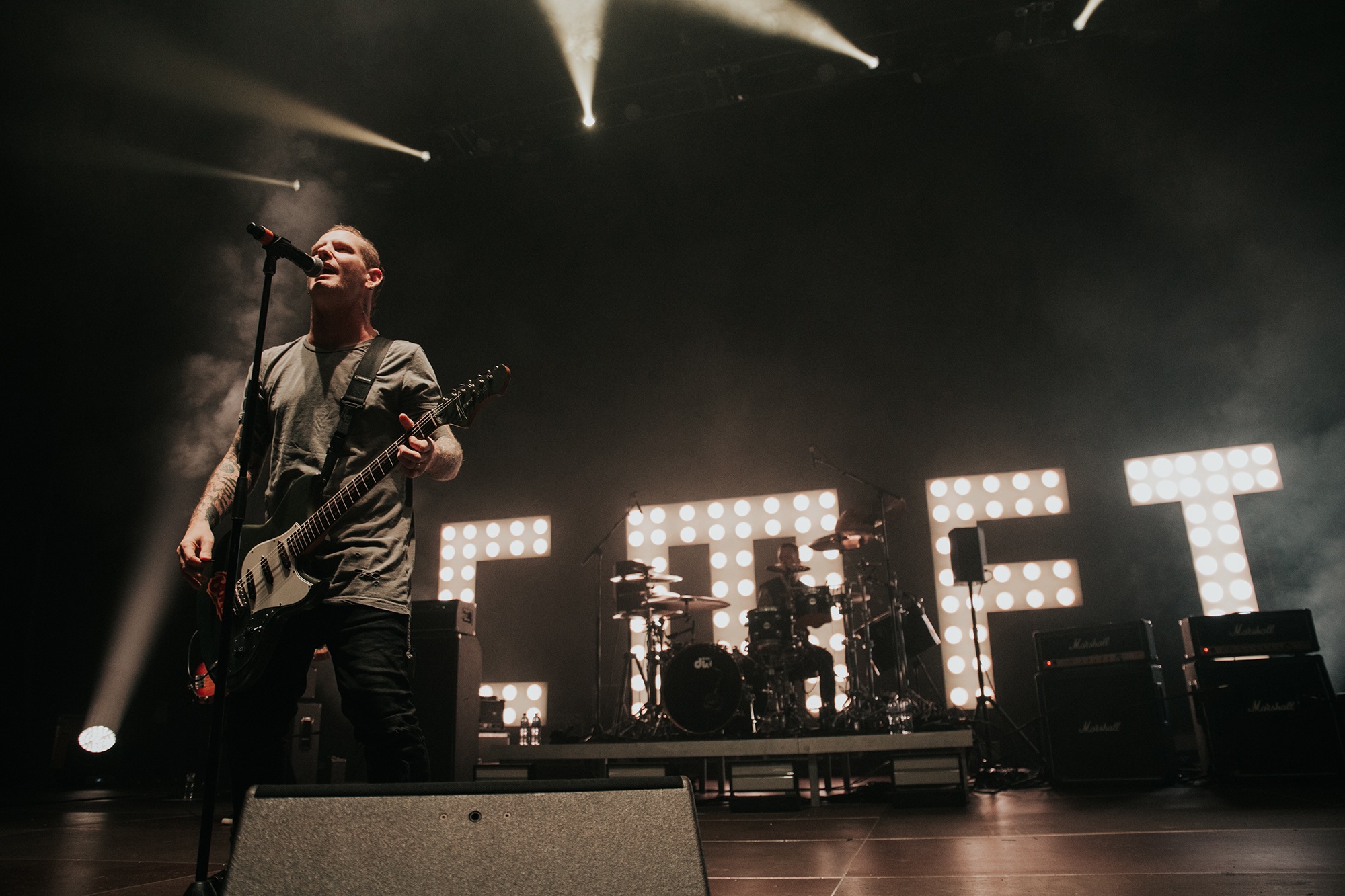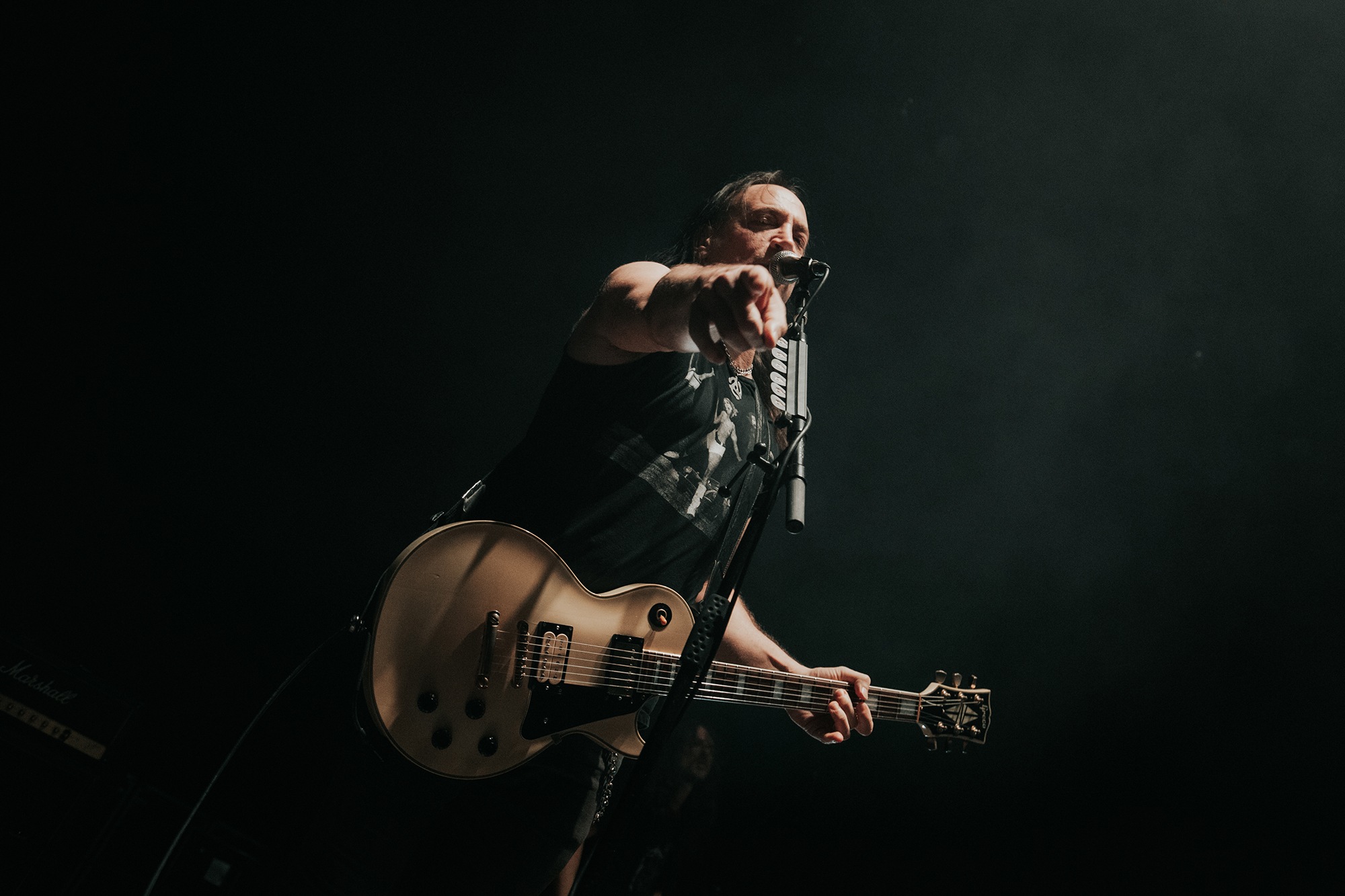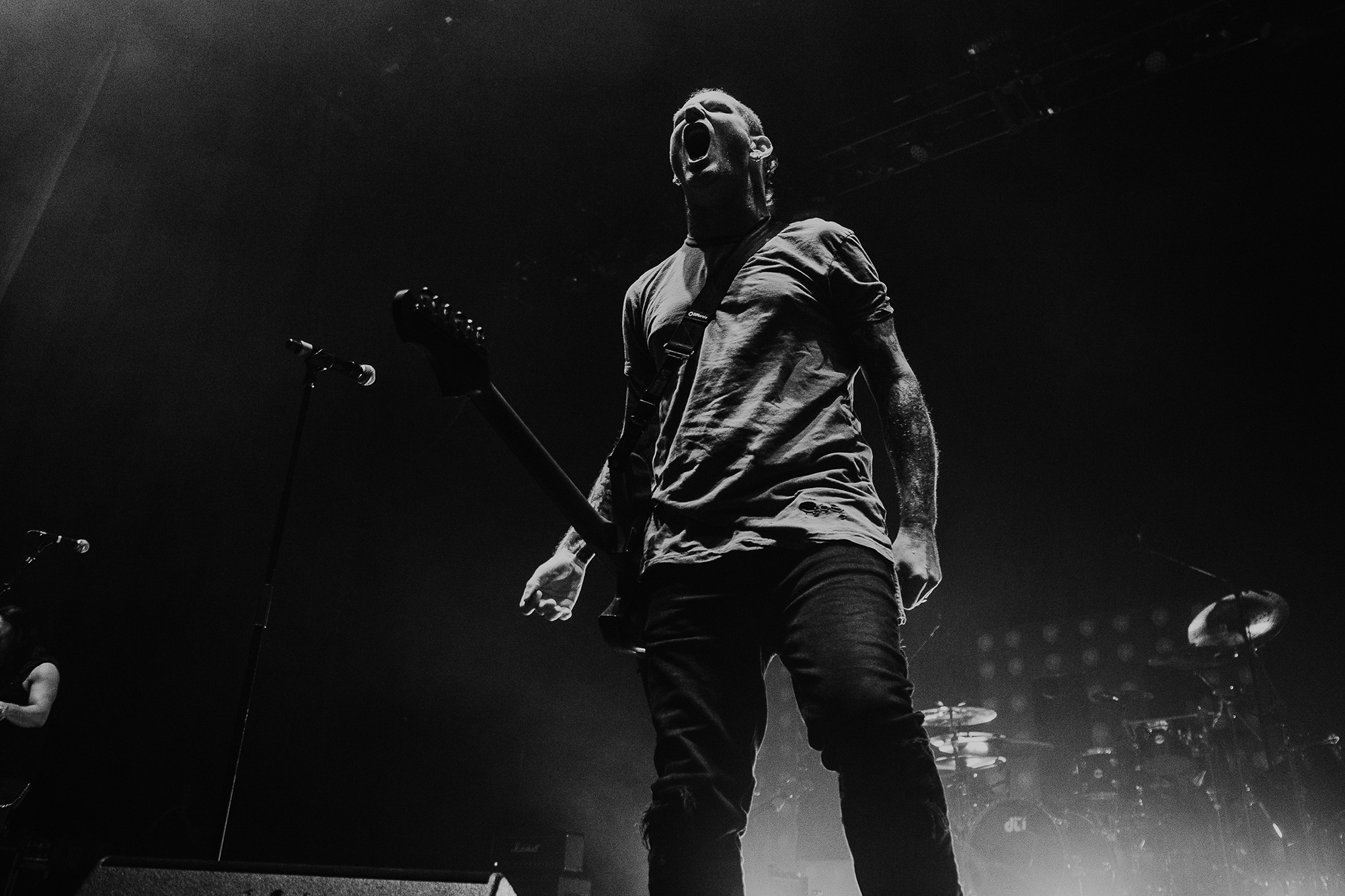 Though he may be somewhat tethered to the spot by a microphone, he uses his spare time to skulk around the stage as he plays and shout encouragement at the audience that aren’t moving anywhere near enough. In a change of pace from the fast tempo of much of his discography, Taylor pulls up a stool to sing the few ballads in his set – but not before a short rendition of the Spongebob Squarepants theme tune. It’s at this point that he finally satisfies the SLIPKNOT fans in the audience and plays an acoustic rendition of Snuff, arguably one of the more emotional and moving of their songs. In a complete 180 in mood, he throws the stool away and ditches the guitar so he can move around the stage, all while singing STONE SOUR’s Absolute Zero, which the audience are very much on board with. Taylor encourages a singalong, and the audience are more than happy to oblige, the entire arena echoing with the instantly recognisable vocal hook.