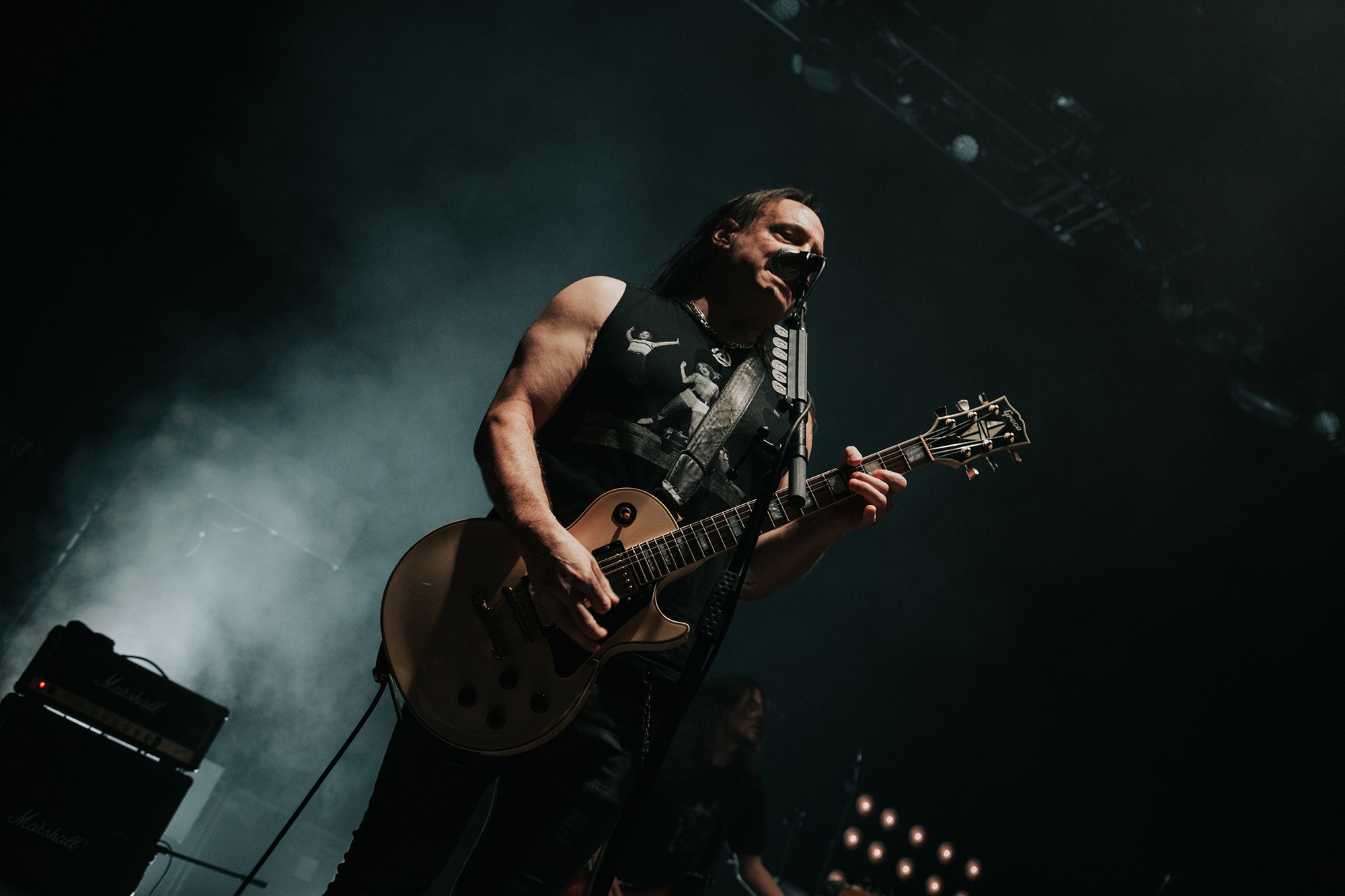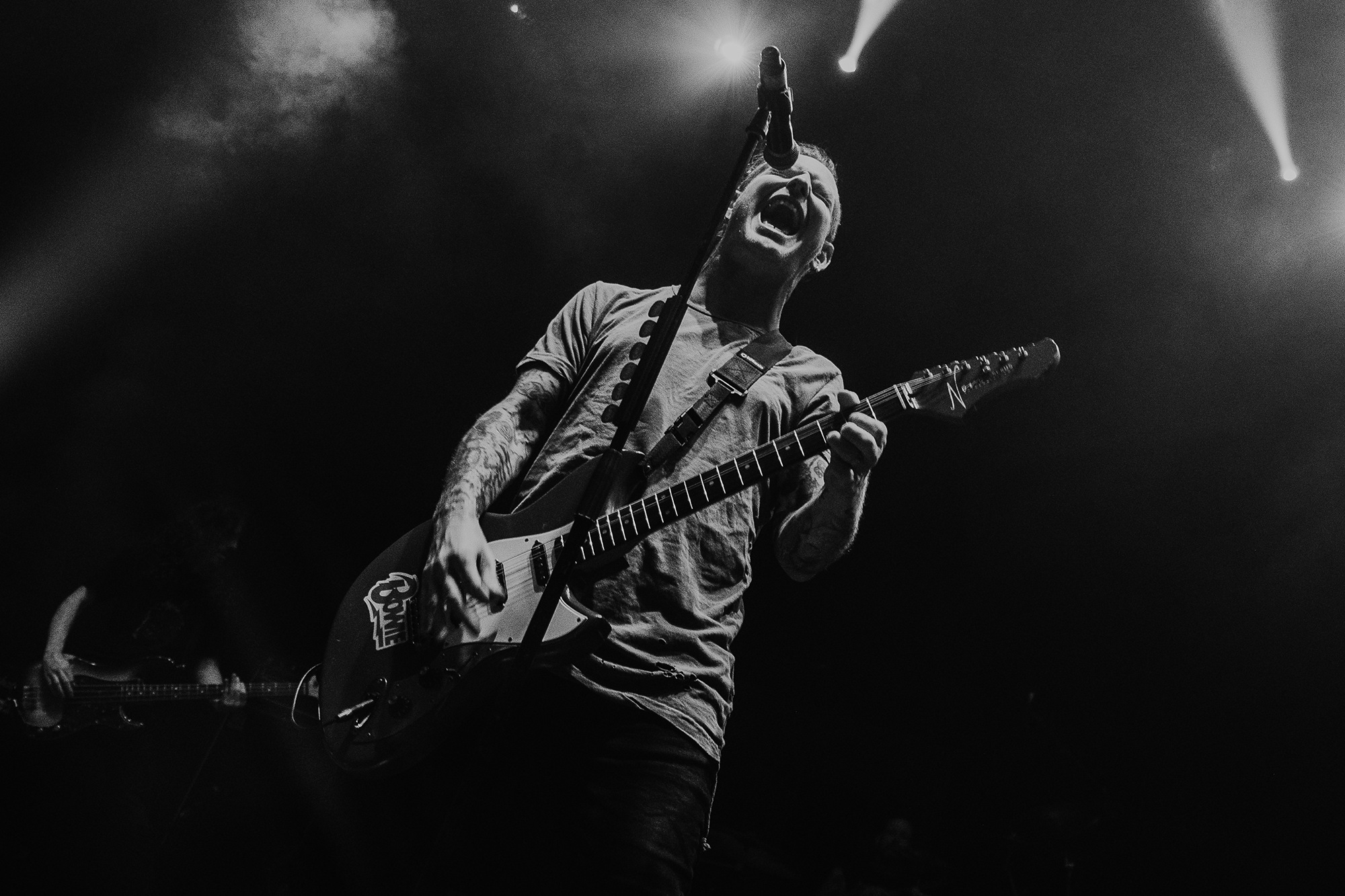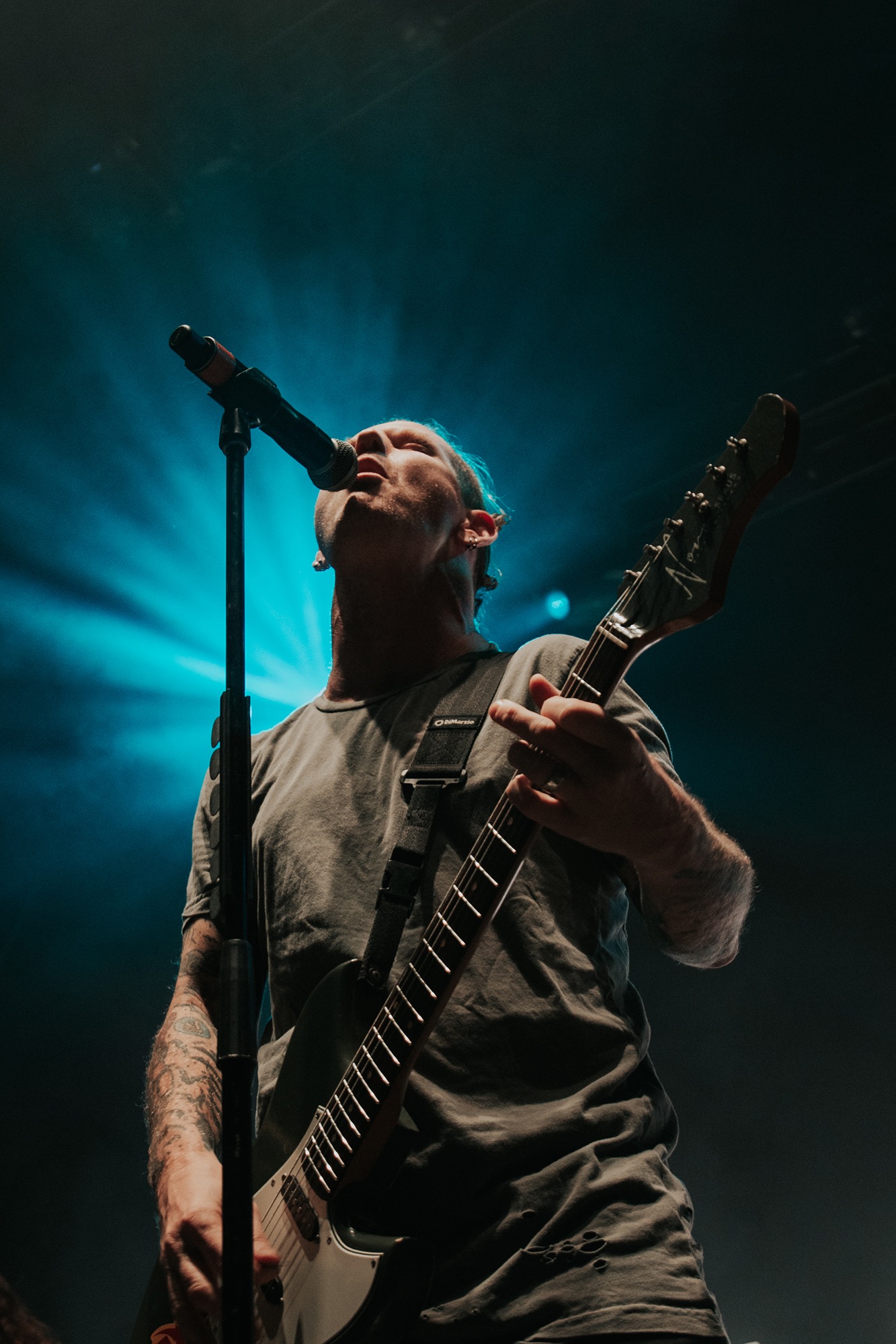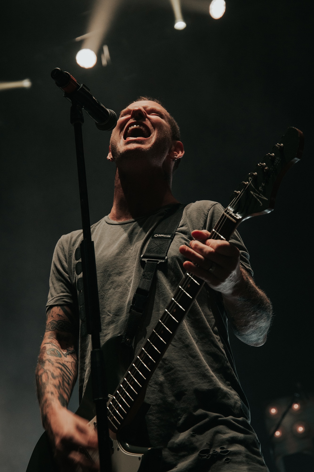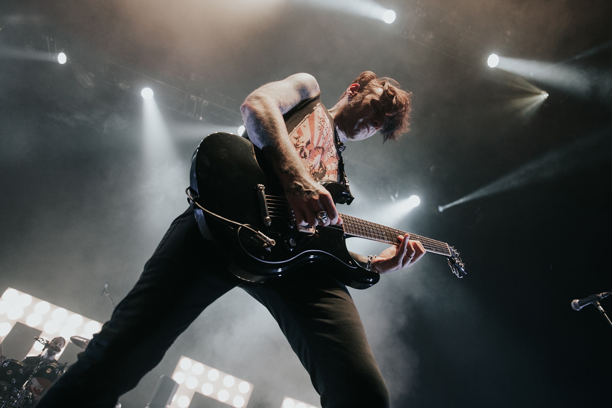Though he may be somewhat tethered to the spot by a microphone, he uses his spare time to skulk around the stage as he plays and shout encouragement at the audience that aren’t moving anywhere near enough. In a change of pace from the fast tempo of much of his discography, Taylor pulls up a stool to sing the few ballads in his set – but not before a short rendition of the Spongebob Squarepants theme tune. It’s at this point that he finally satisfies the SLIPKNOT fans in the audience and plays an acoustic rendition of Snuff, arguably one of the more emotional and moving of their songs. In a complete 180 in mood, he throws the stool away and ditches the guitar so he can move around the stage, all while singing STONE SOUR’s Absolute Zero, which the audience are very much on board with. Taylor encourages a singalong, and the audience are more than happy to oblige, the entire arena echoing with the instantly recognisable vocal hook.