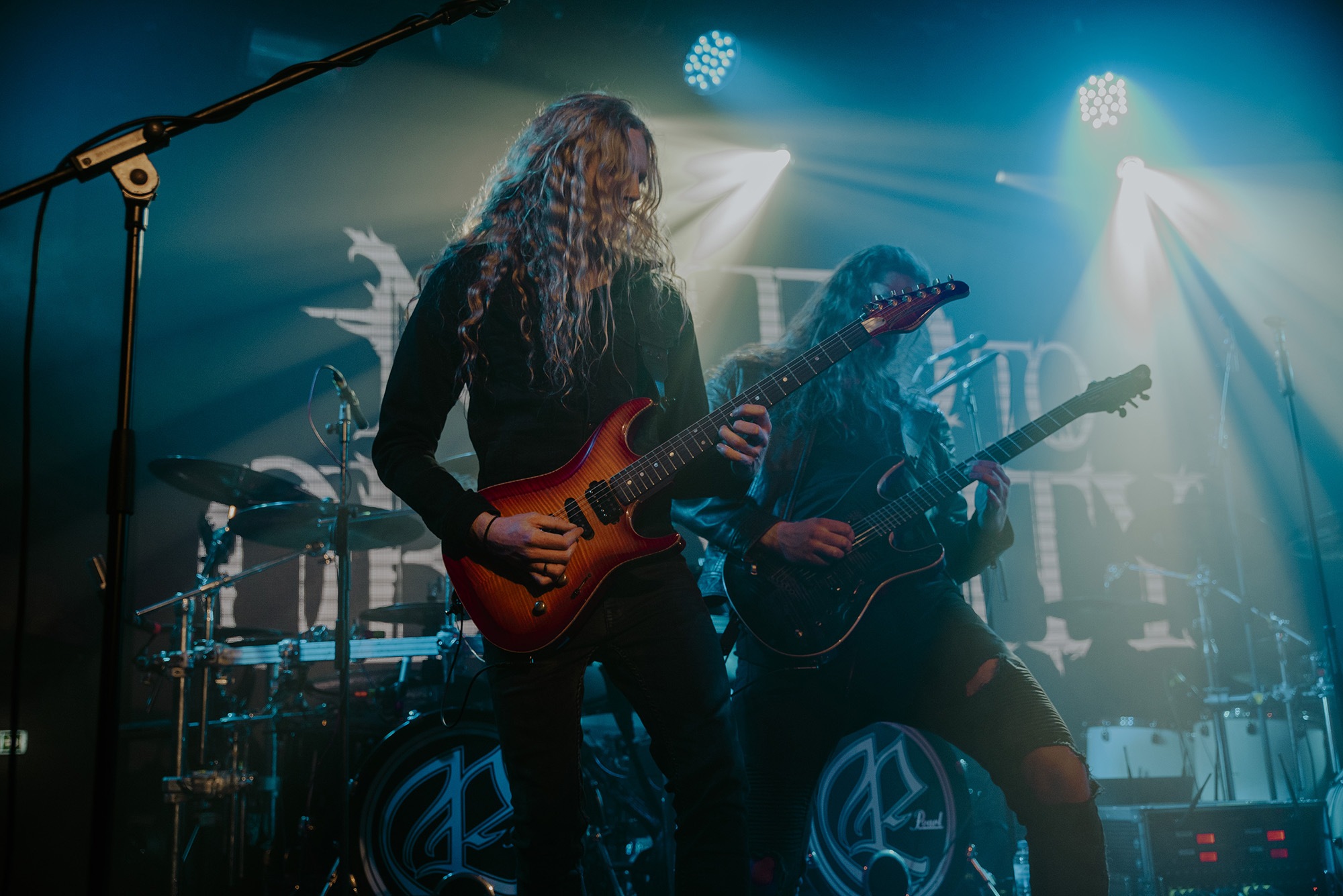 To call ENSIFERUM‘s backdrop colourful would do them a disservice; red, blue and gold shine from behind like stained glass as the band tear through their set of folky power metal. The problem with them, though, is that for all the folky, fist-pumping energy their songs should possess, it’s woefully lacking and the songs all blend together. It’s due perhaps in part to a muddy mix that neuters a lot of the punch their music should pack. The drums sound triggered, the bass drum being the principal offender, often threatening to drown out the already quiet guitars. In contrast, their keyboard player and clean singer, Pekka Montin, is not only overly loud but often sounds off-key which makes for uncomfortable listening. While there’s certainly an audience for them – as the energetic, clapping and shouting front rows show – they fall far short of the mark this evening.